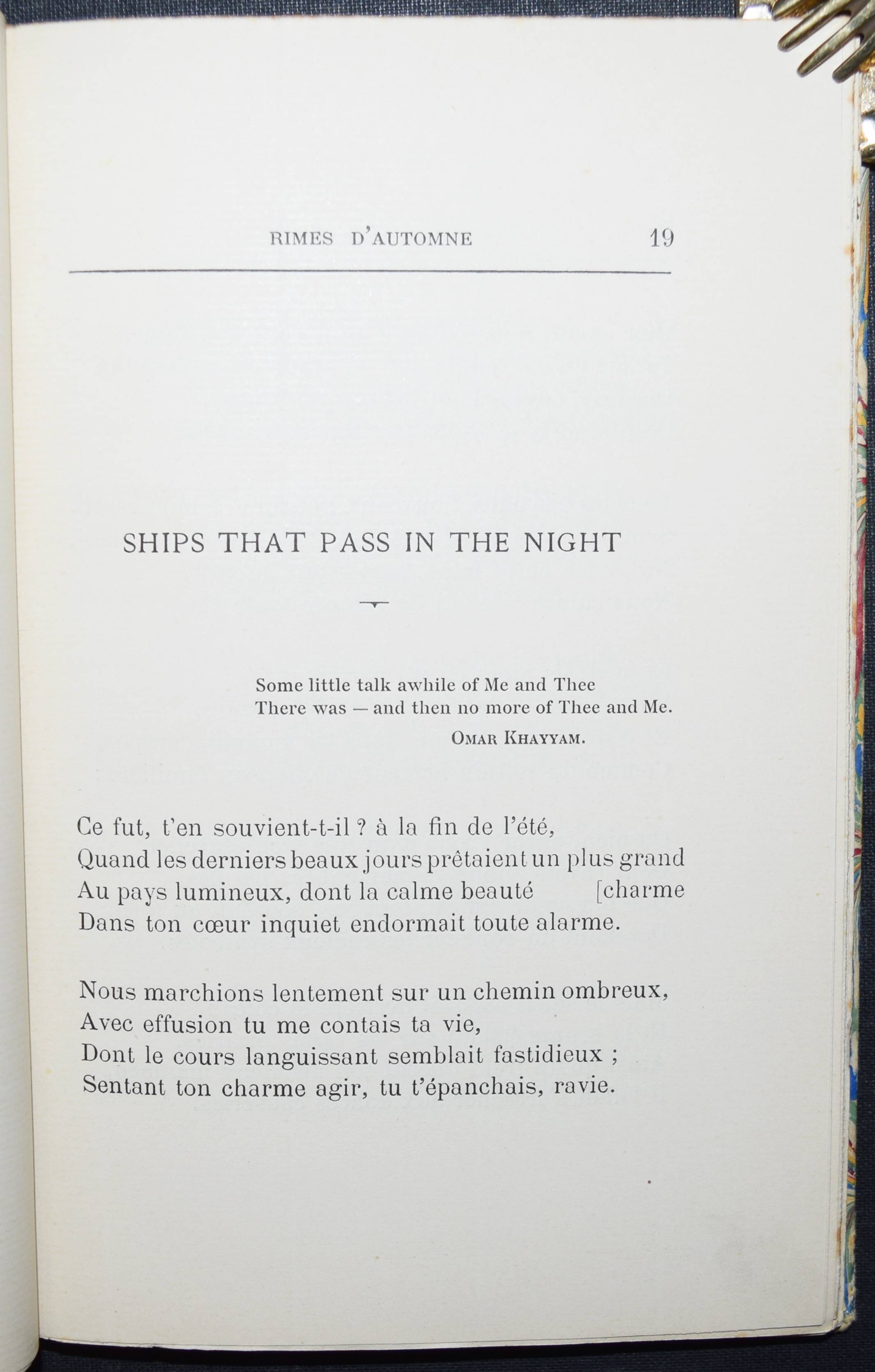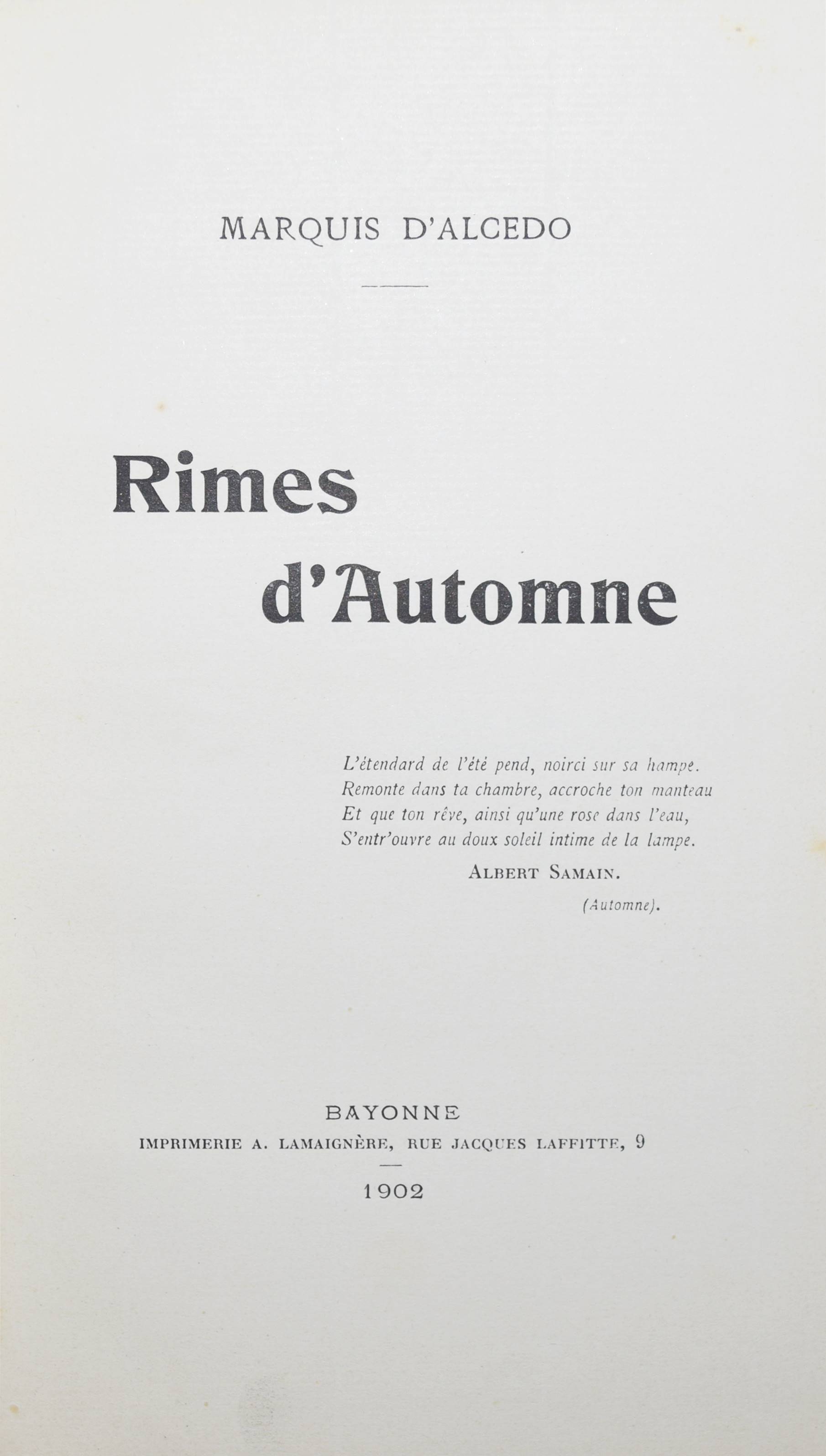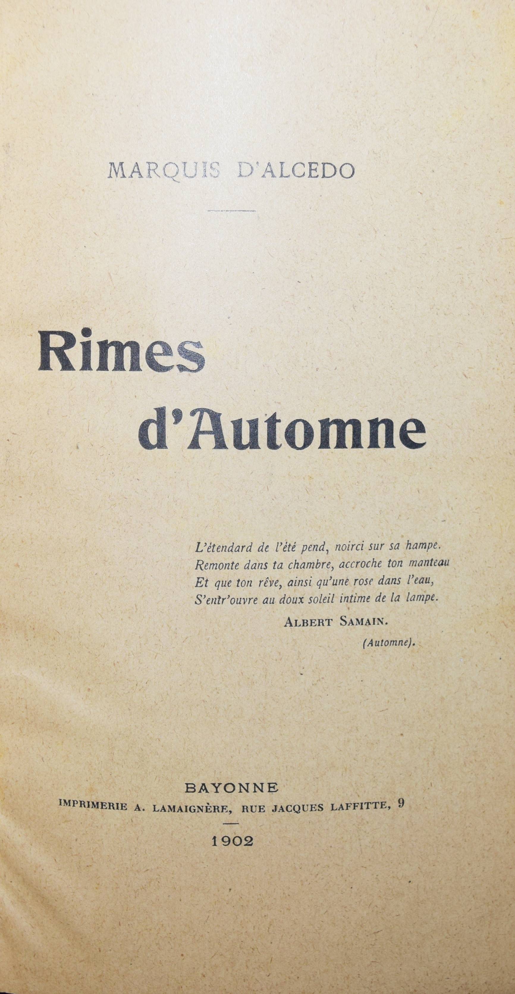 Alcedo, Marquis de (d. i. Alfons XIII. von Spanien). Rimes d’Automne. Bayonne, Imprimerie A. Lamaignère 1902. 8°. 146 S. Hln. mit goldgepr. Deckeltitel u. marm. Deckelbezug. Erste und einzige Ausgabe mit eigenhändiger Widmung für die Marquise de Lubersac von dem jungen Marquis d’Alcedo, der später als Alfons XIII. den spanischen Thron bestieg. – Gutes Exemplar aus der Schlossbibliothek Chateau de Maucreaux (Wappen-Exlibris). Vorsätze u. Schnitt etwas stockfl.