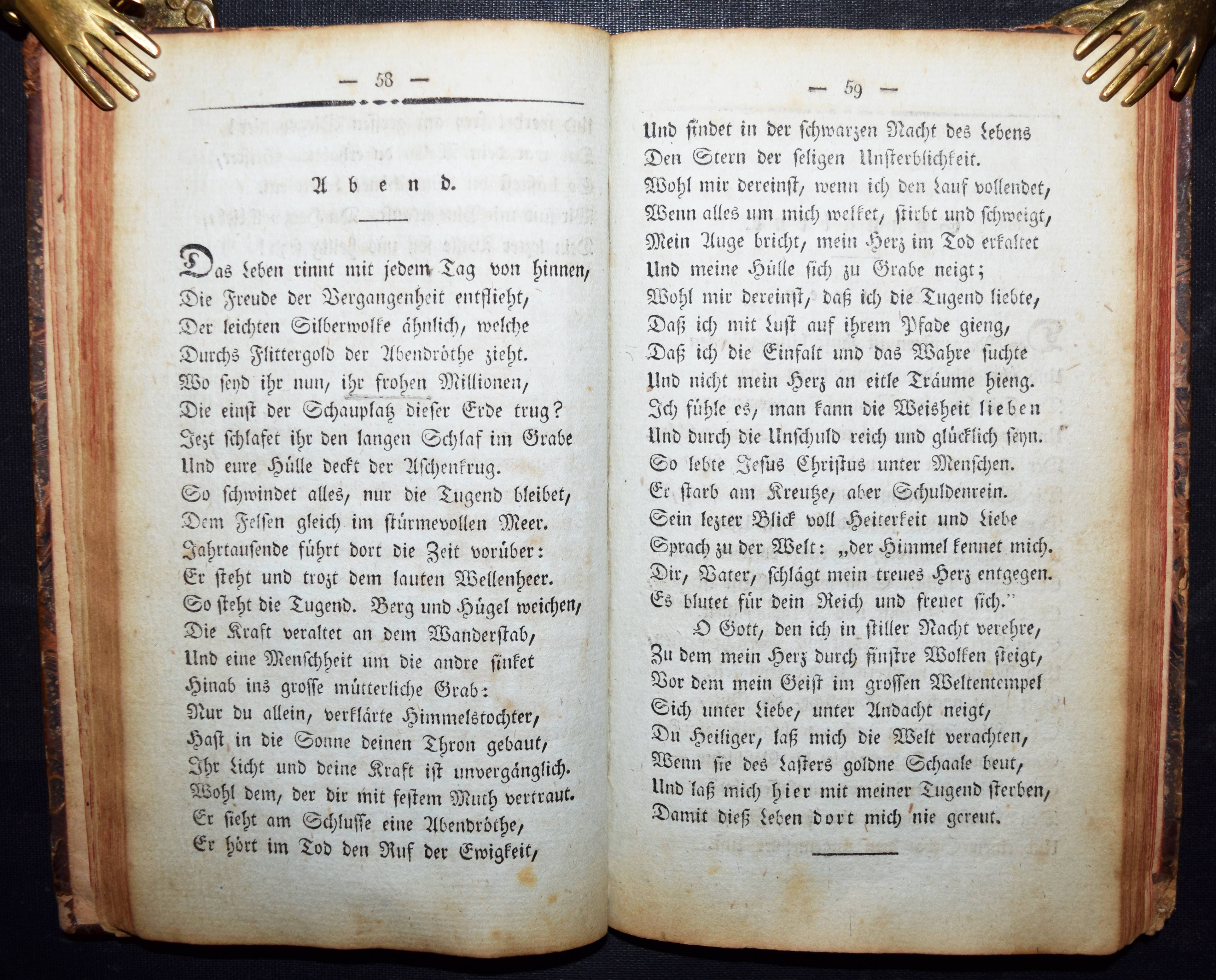 Witschel, Johann Heinrich Wilhelm. Morgen- und Abendopfer in Gesängen. Zweyte um die hälfte vermehrte Ausgabe. Wien, Bauer 1807. 8°. 252 S. Hldr. d. Zt. mit goldgepr. Rückensch. u. Linienverg. ADB XLIII, 569. – Durch vorliegendes Werk wurde J. H. W. Witschel (1769-1847) „zu einem der bekanntesten deutschen Schriftsteller in allen Classen, nicht nur des protestantischen Volkes. Dieses Buch ist neben Zschokke’s ‚Stunden der Andacht‘ ohne Frage das verbreiteste Andachtsbuch in der Zeit des Rationalismus gewesen“ (C. Bertheau in ADB). – Einband stärker berieben u. bestossen, geringf. stockfl., sonst gut erhalten.