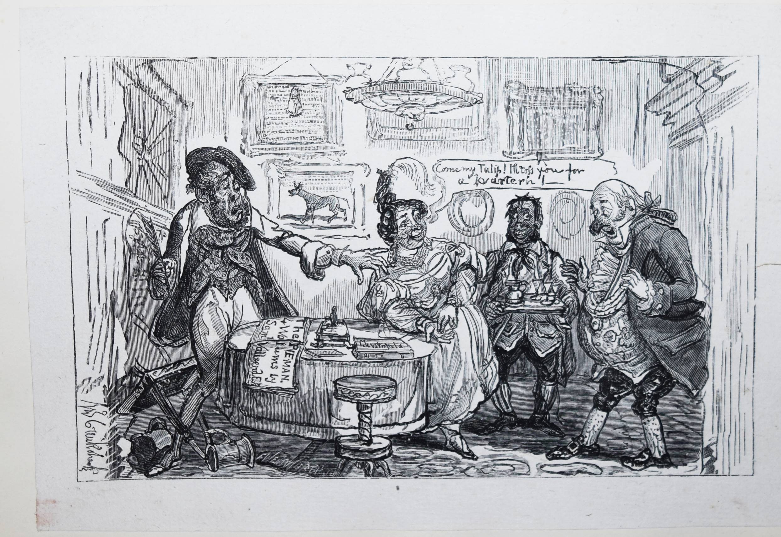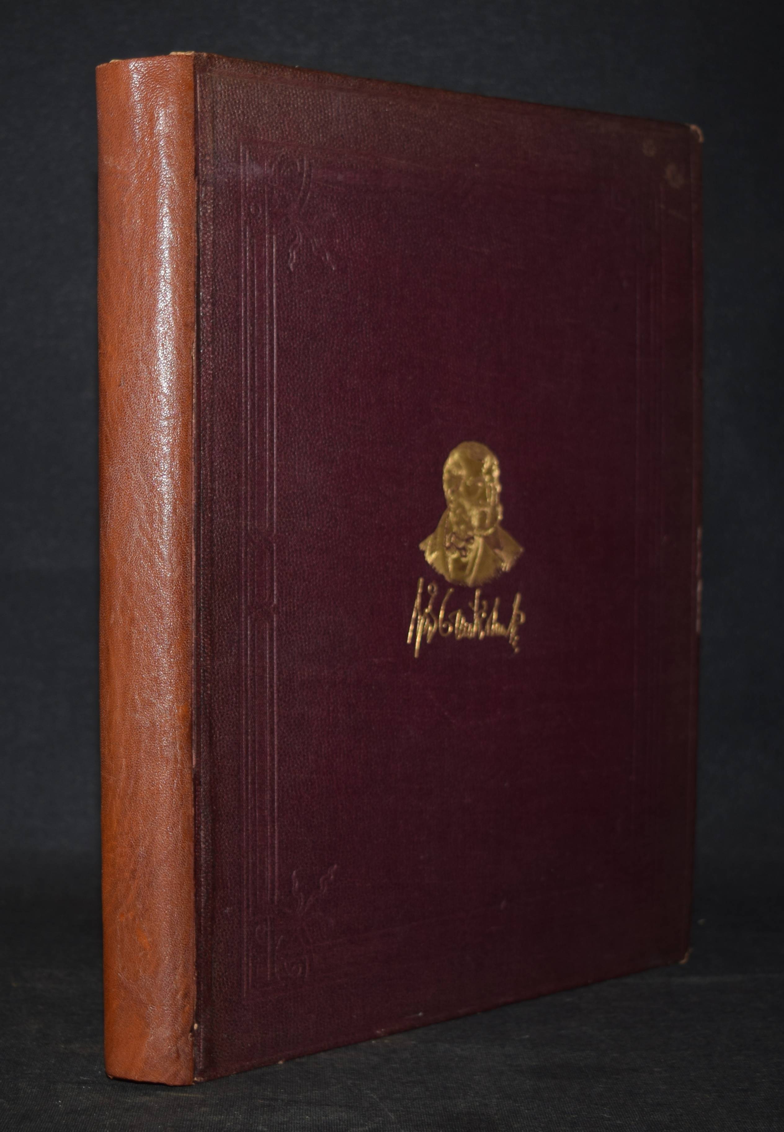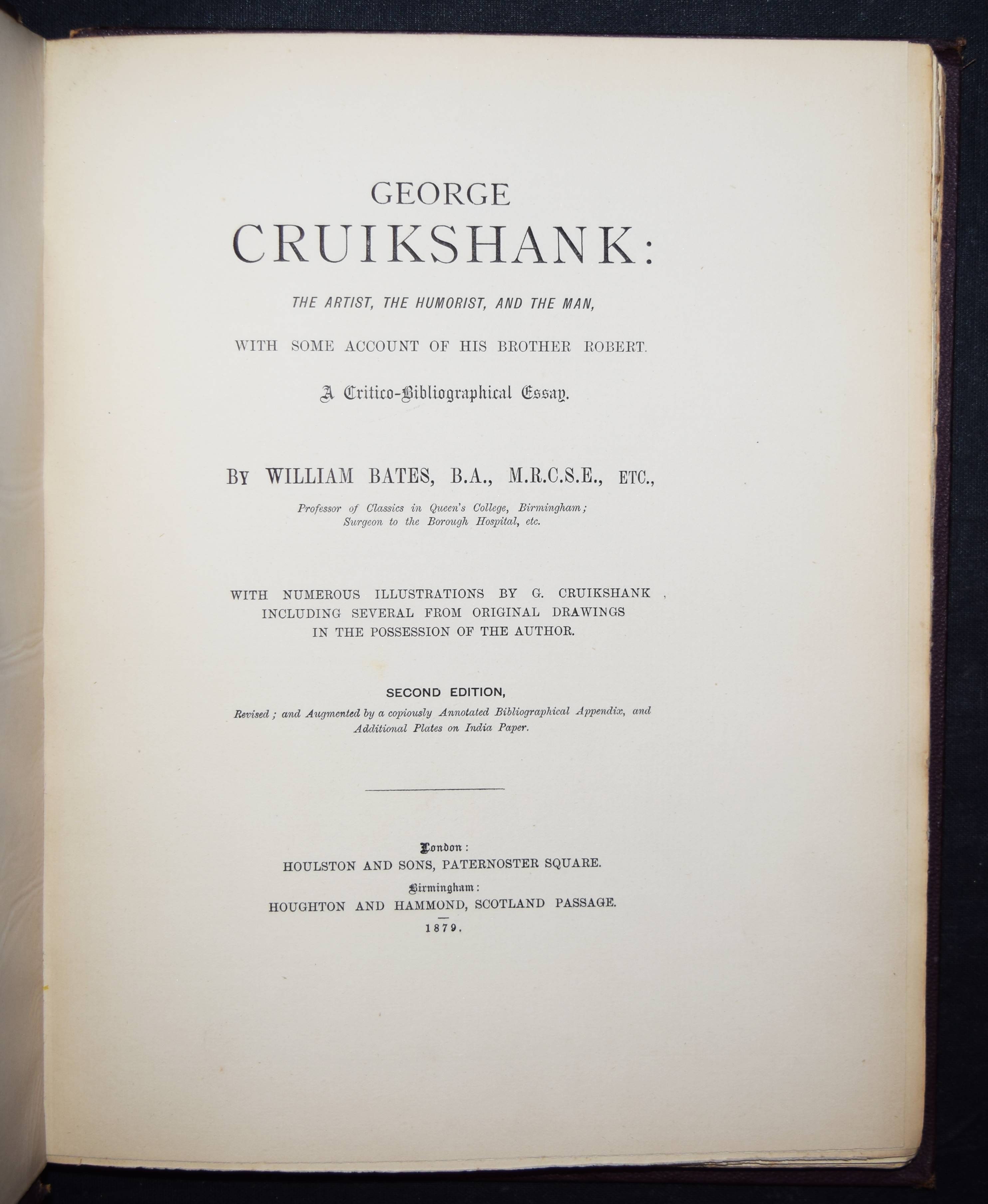 Cruikshank – Bates, William. George Cruikshank. The artist, the humourist, and the man, with some account of his brother Robert. A critico-bibliographical essay. 2. Edition. Revised and augmented by acopiously annotated bibliographical appendix. London, Birmingham, Houghton and Hammond 1879. 4°. Gestoch. Frontispiz, 94 S. mit zahlr. teils mont. Abb. OLdr. mit goldgepr. Deckeltitel u. goldgepr. Deckelillustration. Rücken mit Leder fachgerecht erneuert, wenige Seiten geringf. stockfl.u. im Rand angestaubt, gutes Exemplar.