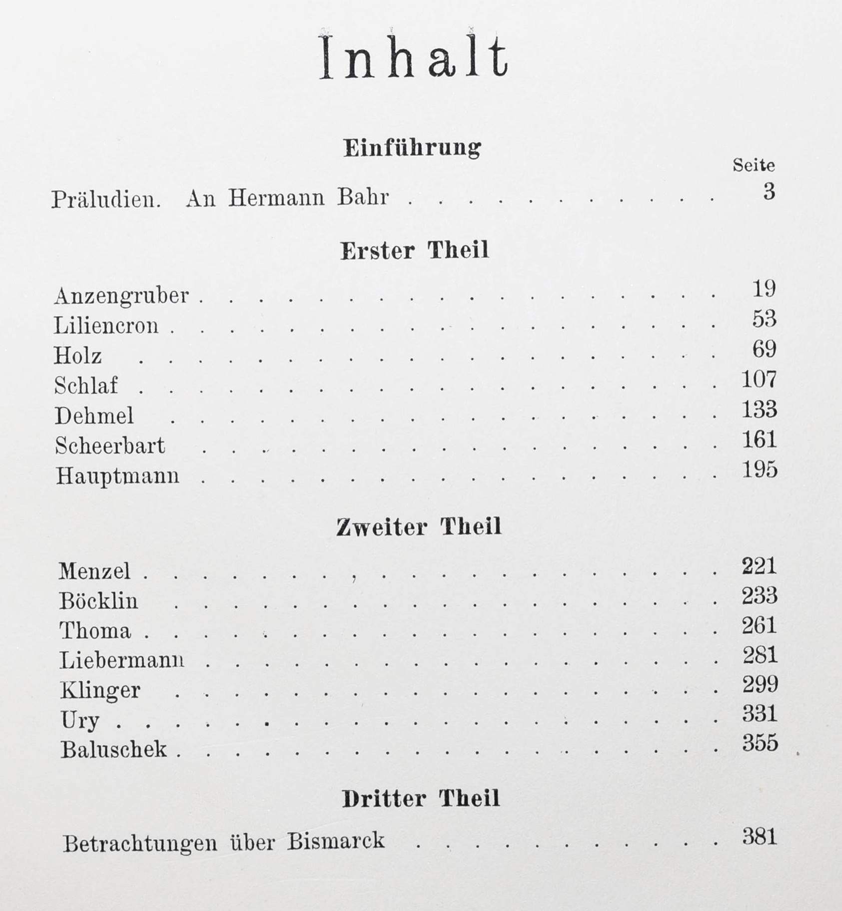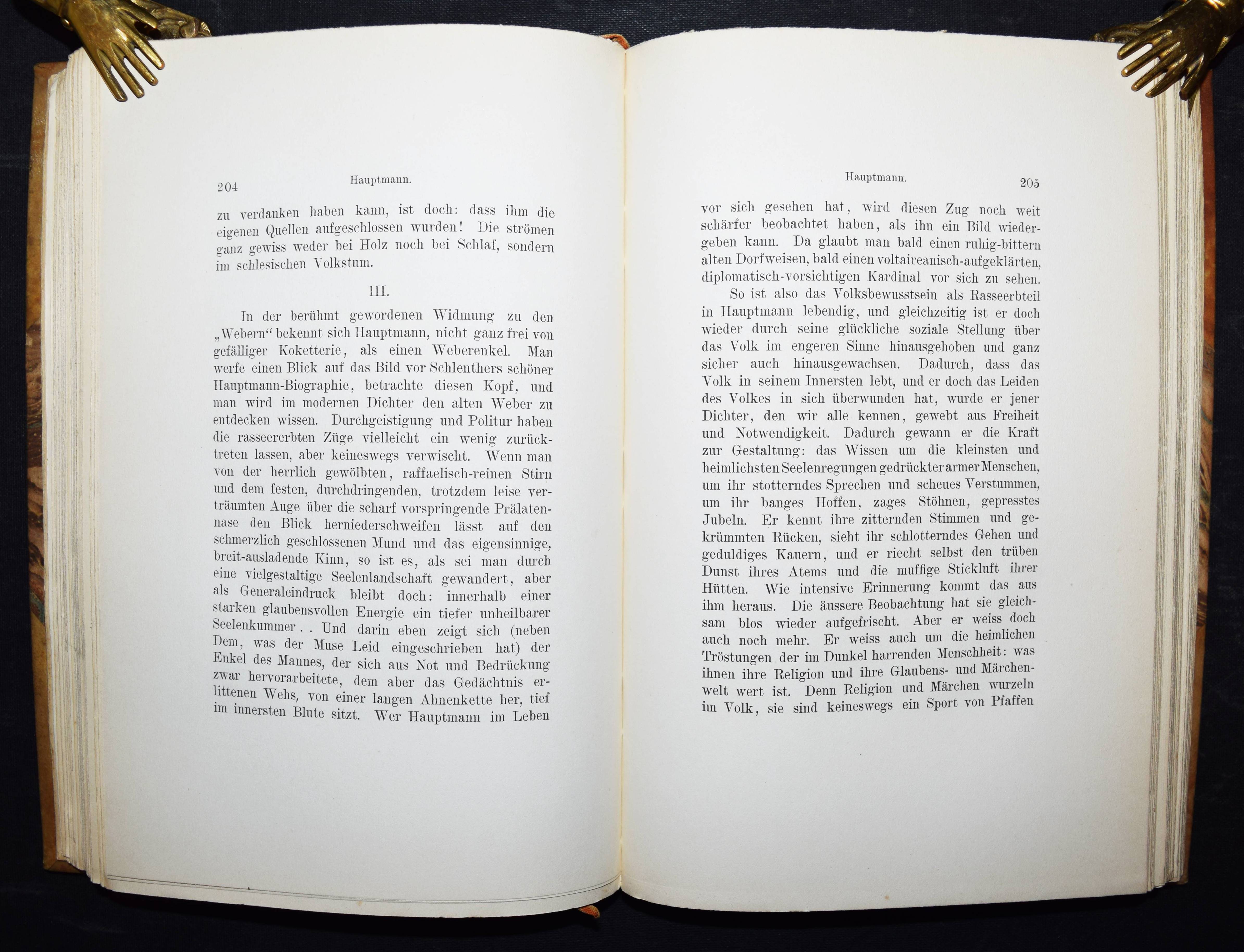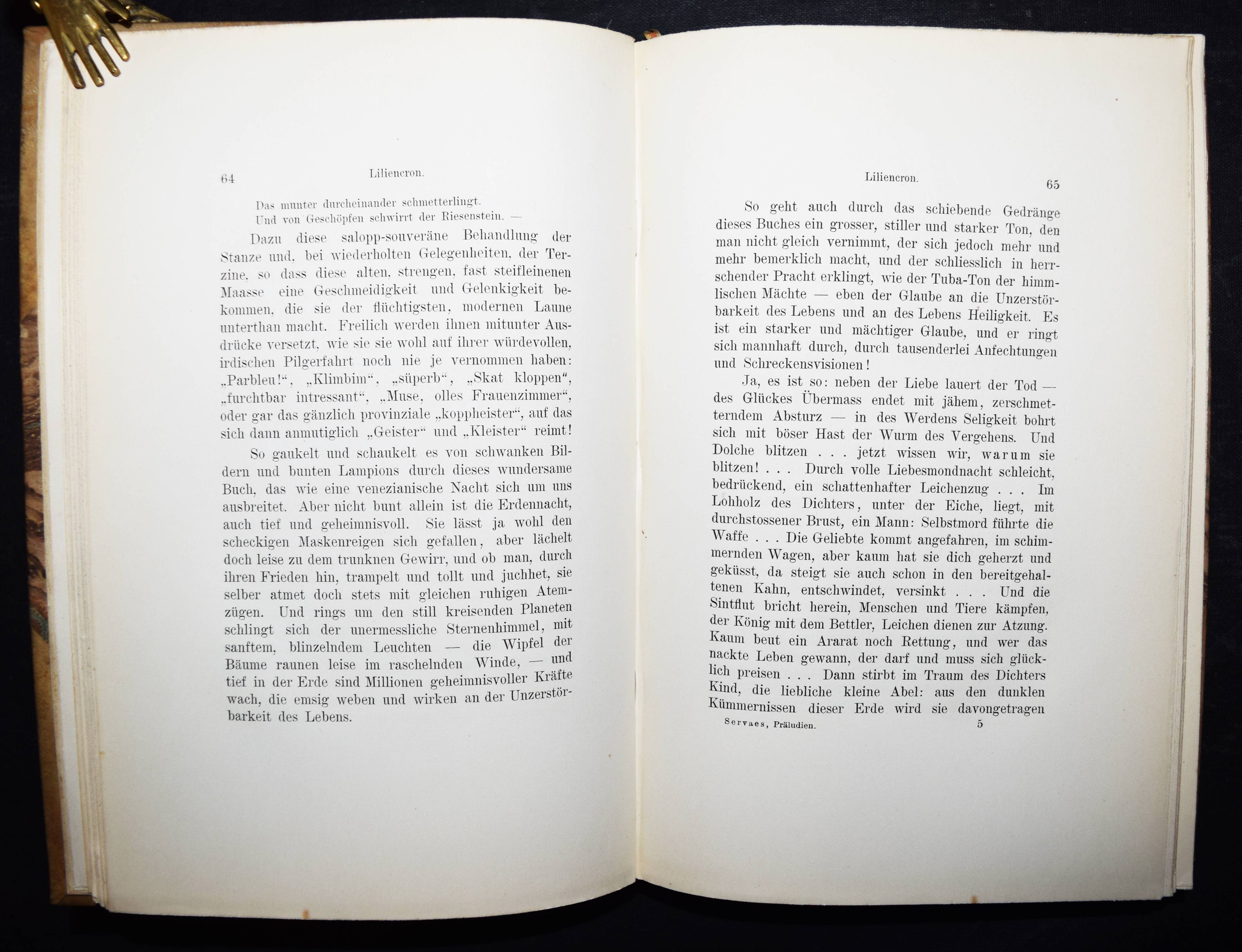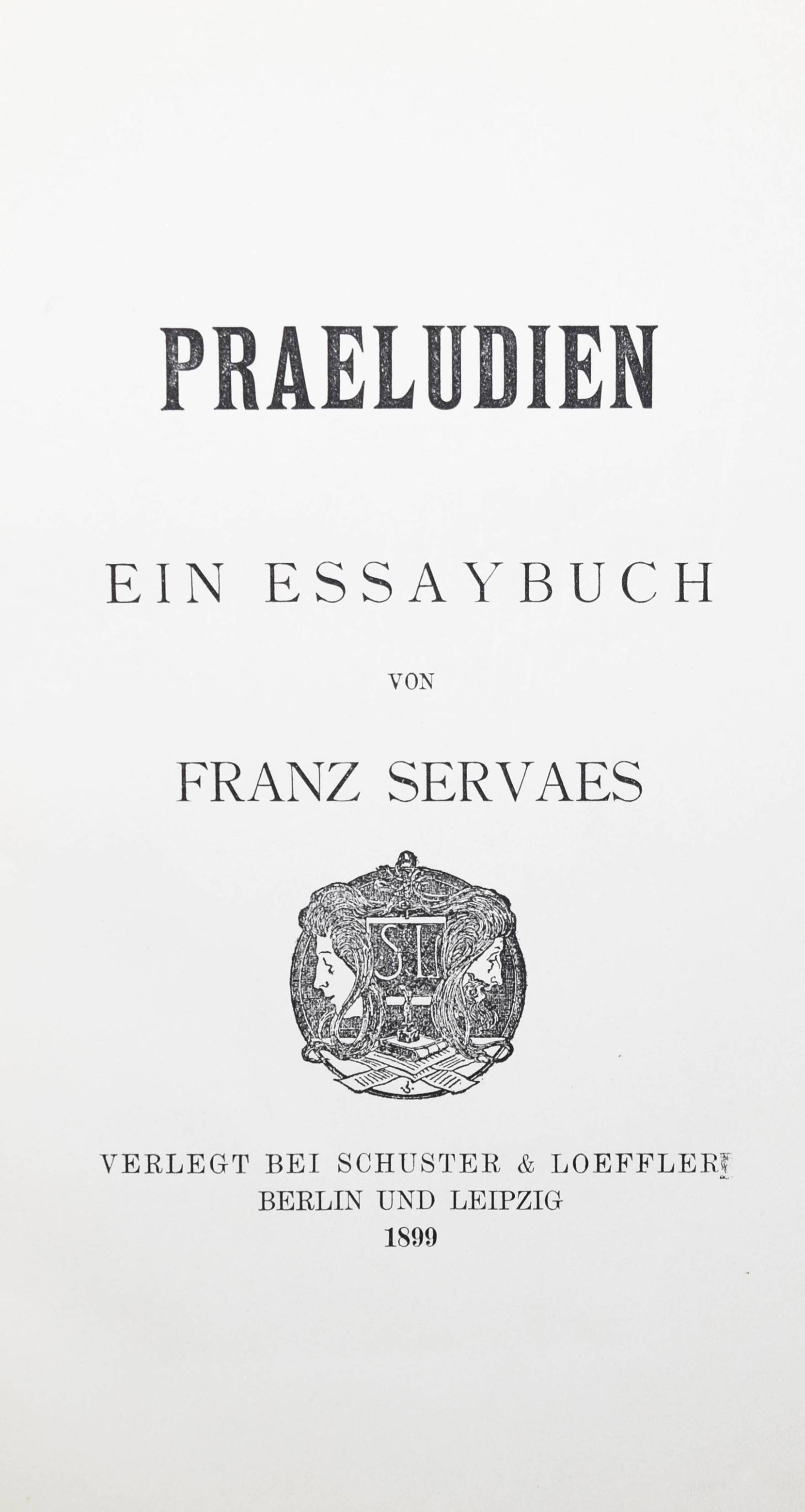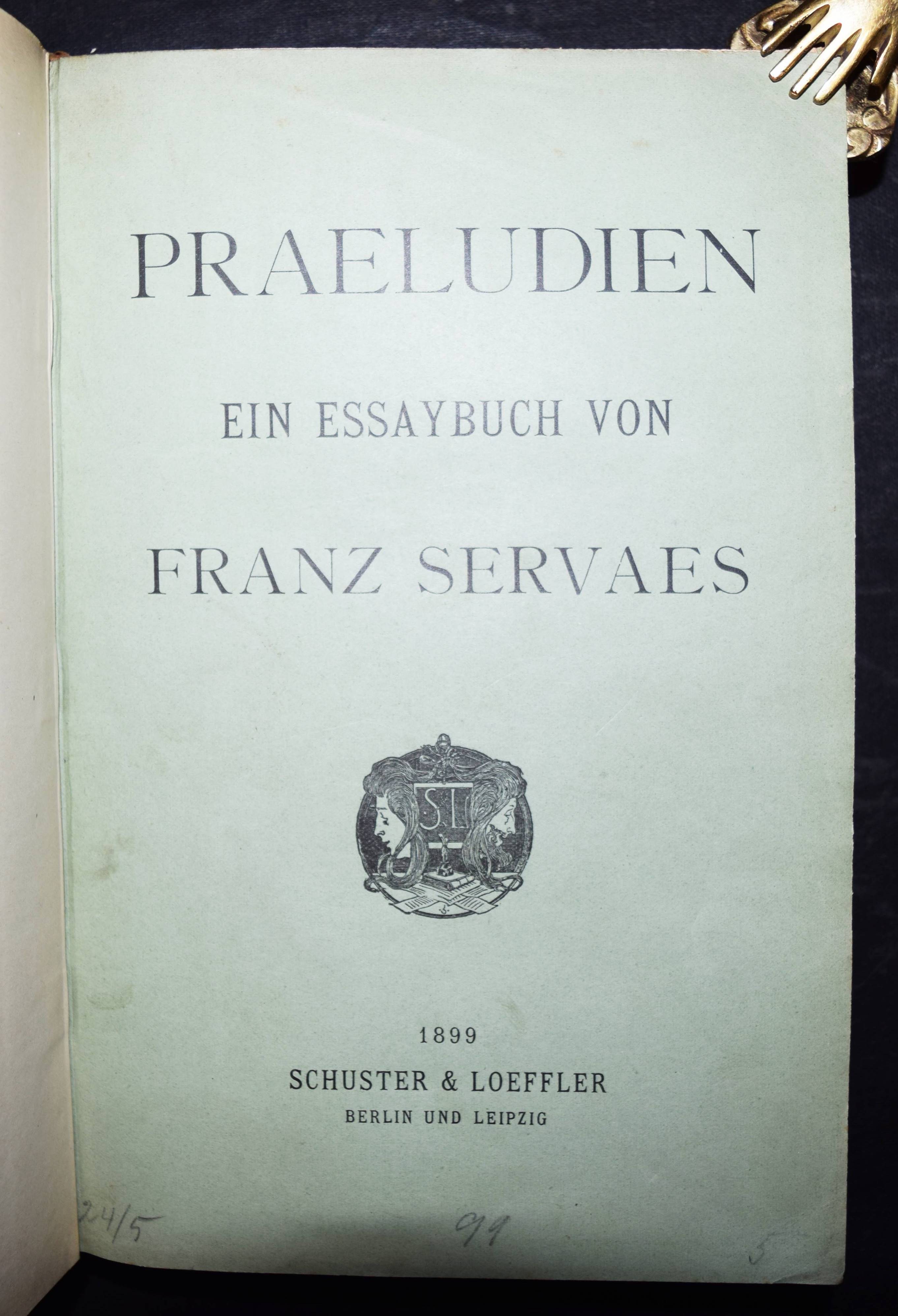 Servaes, Franz. Praeludien. Ein Essaybuch. Berlin, Leipzig, Schuster & Loeffler 1899. Gr.-8°. VI, 1 Bl., 414 S., 1 Bl. Hprgt. d. Zeit mit goldgepr. Rückentitel, reicher floraler Rückenverg. u. marm. Deckelbezug. – (Orig.-Umschlag eingebunden). Erste Ausgabe. – Schönes, dekorativ gebundenes Exemplar.