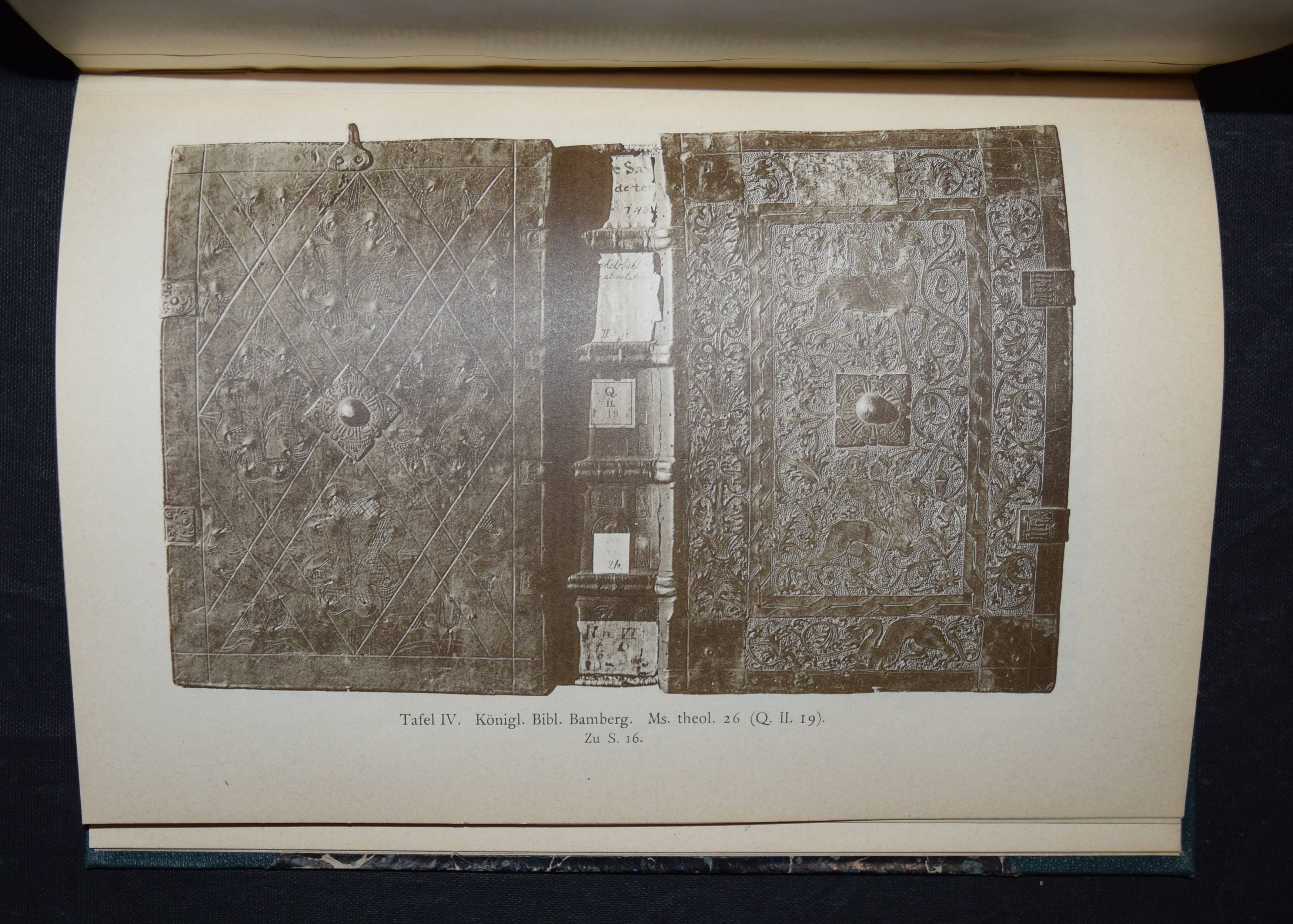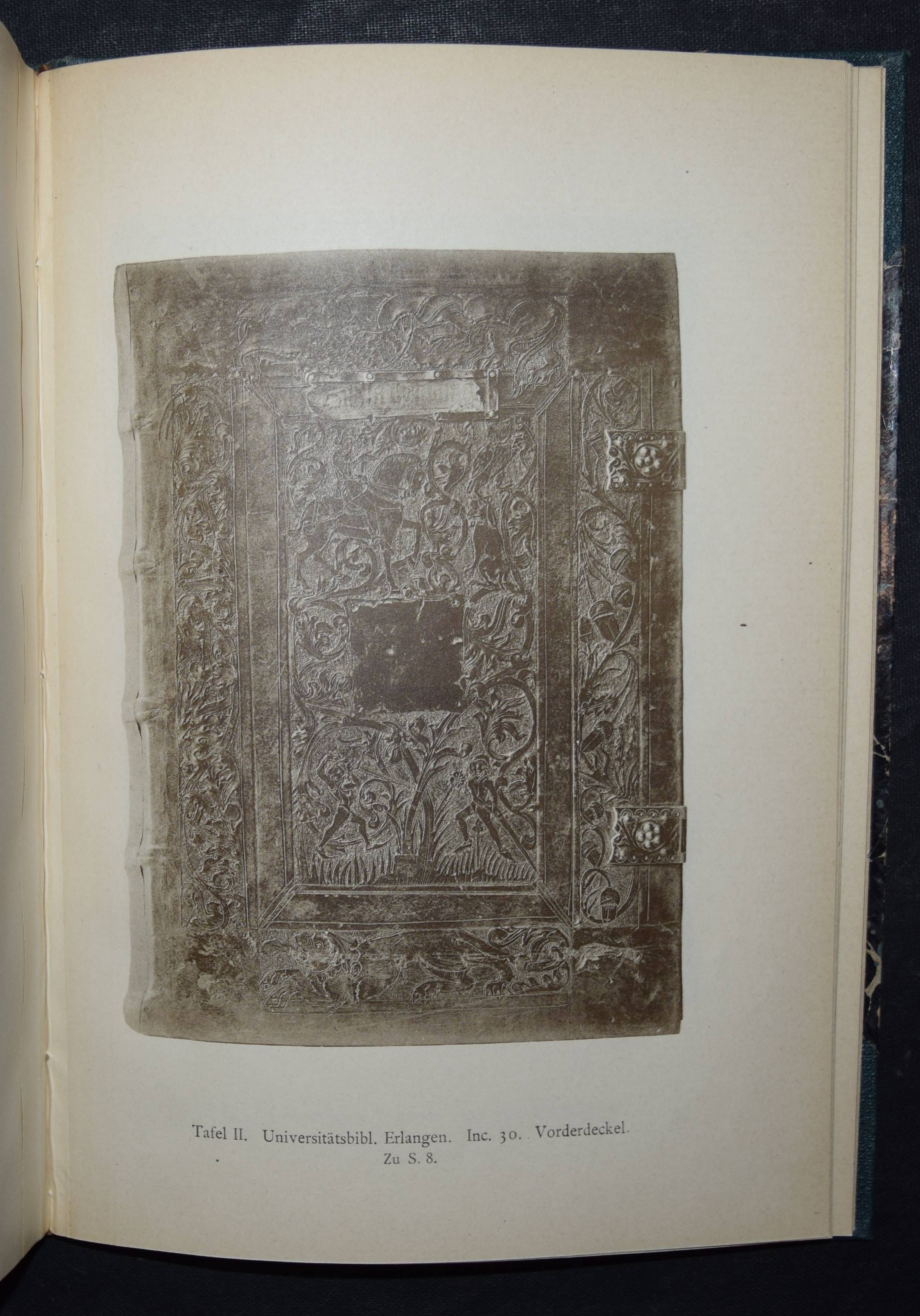 Mitius, Otto. Fränkische Lederschnittbände des XV. Jahrhunderts. Ein buchgeschichtlichtlicher Versuch. Leipzig, Haupt 1909. 8°. VIII, 44 S., XIII Bl. mit 13 Tafeln. Hln. der Zeit mit goldgepr. Rückentitel. – Original-Umschlag eingebunden. (Sammlung bibliothekswissenschaftlicher Arbeiten, Band 28). Sehr gutes Exemplar.