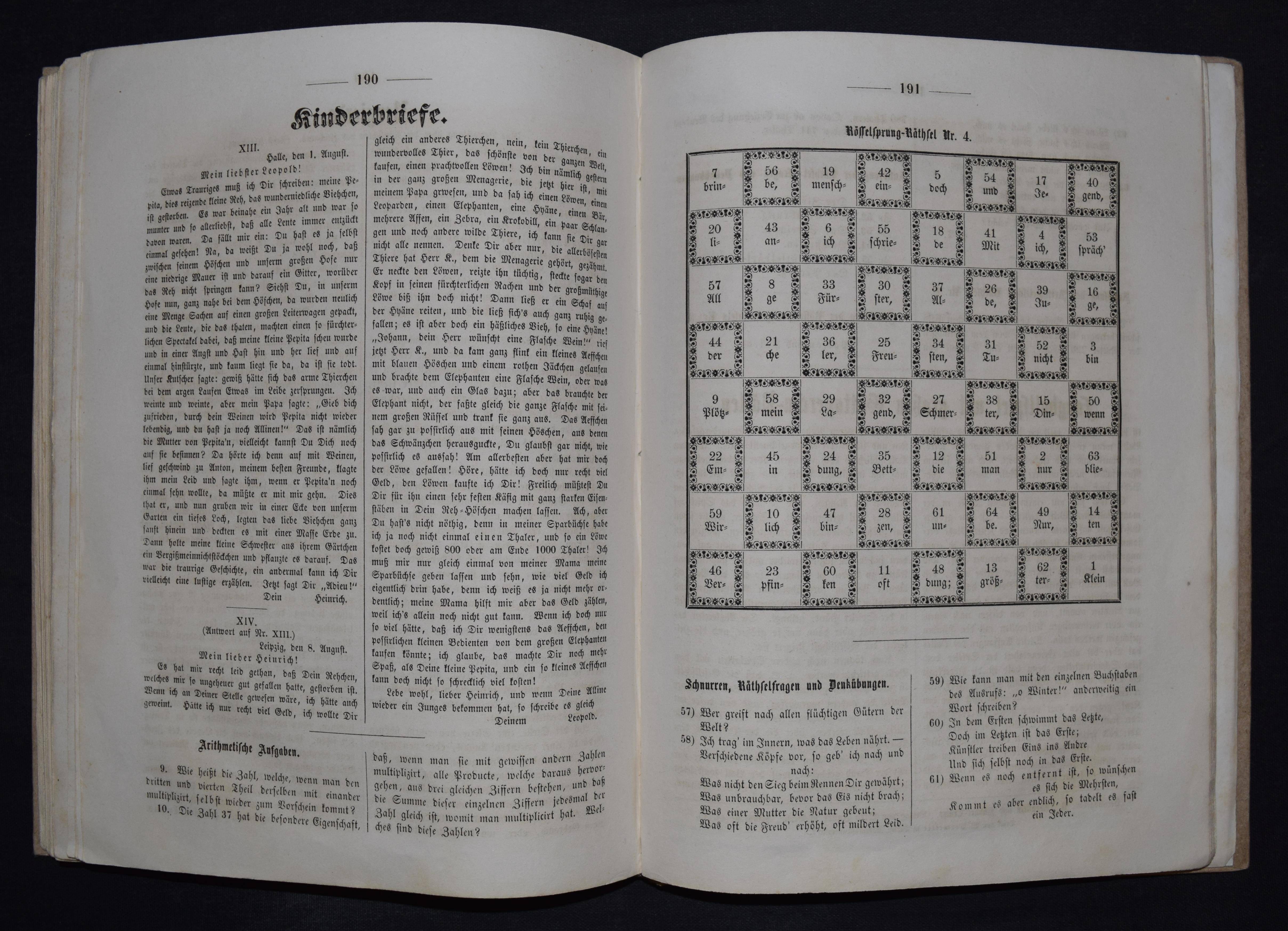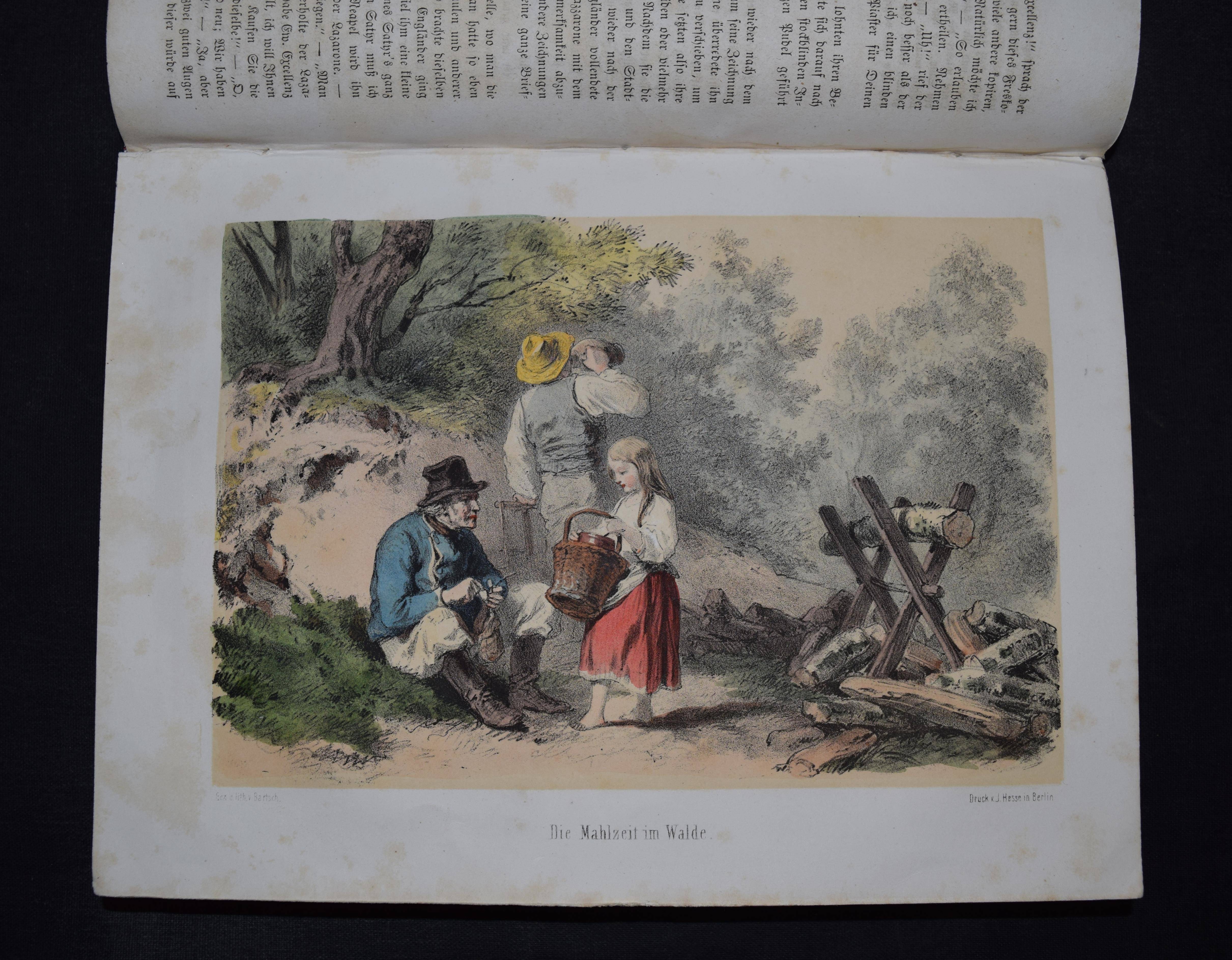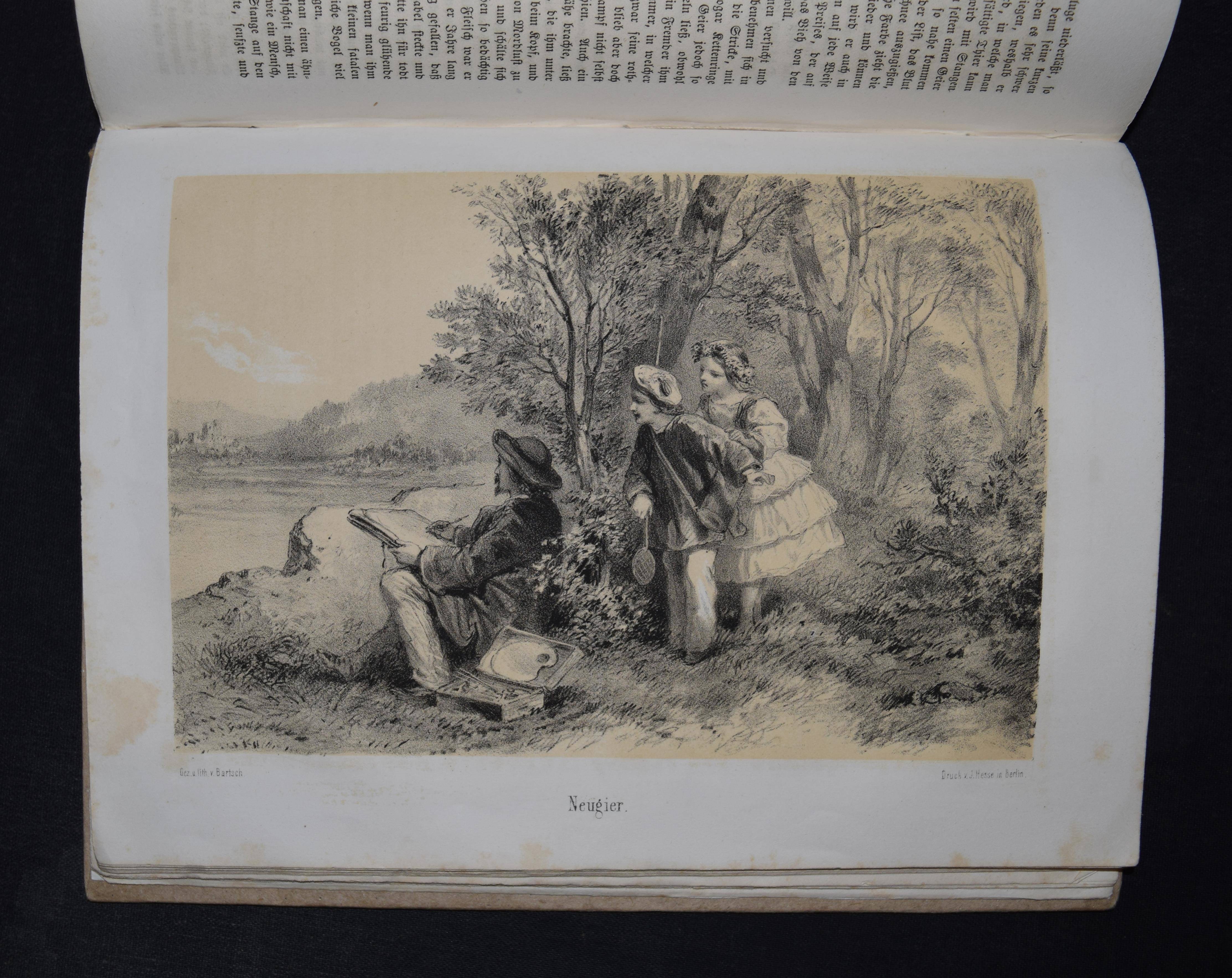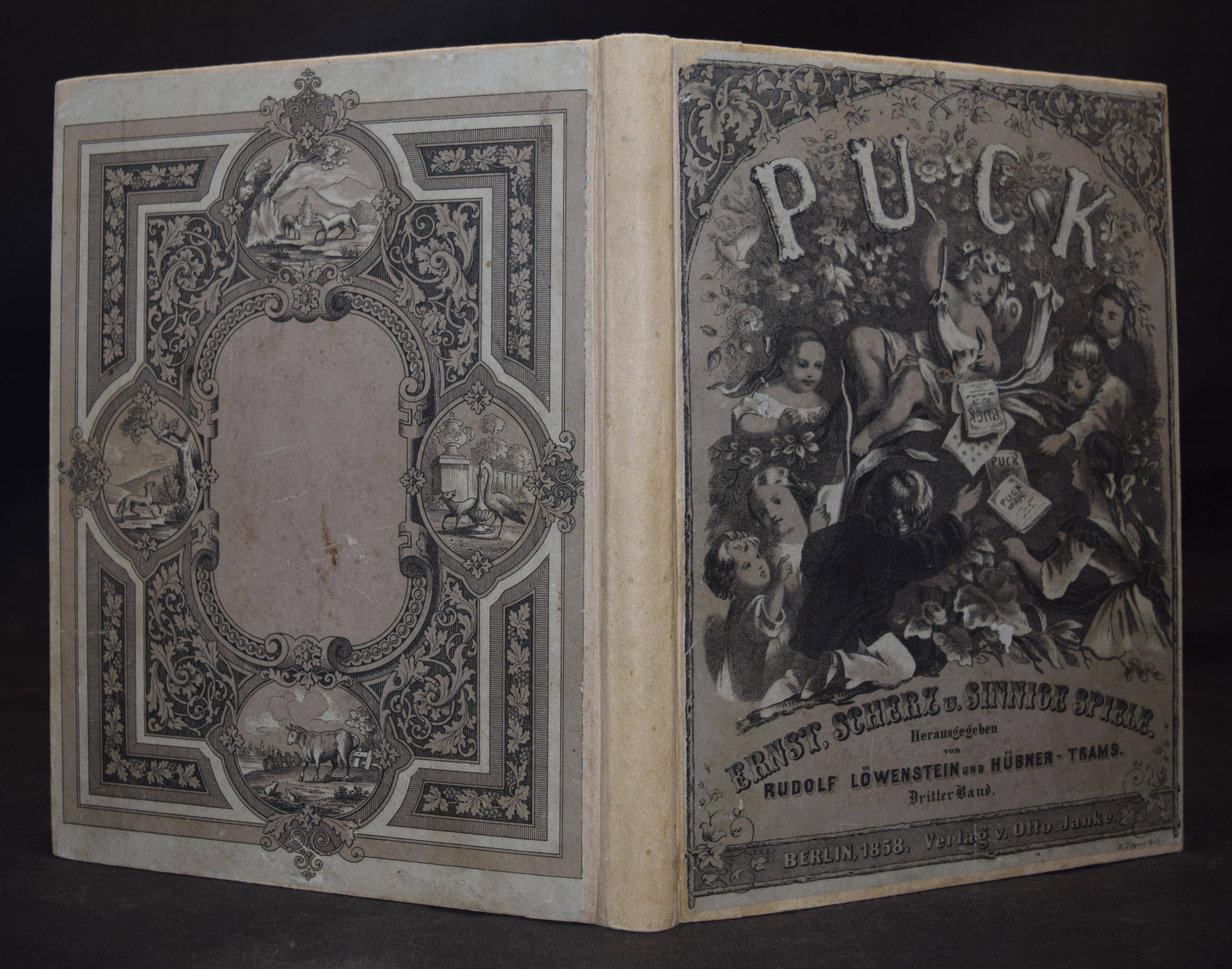 Löwenstein, Rudolf und Hübner-Trams (Hrsg.). Puck. Ernst, Scherz und sinnige Spiele der Jugend. Dritter Jahrgang. Berlin, Janke 1858. Gr.-8°. (2) Bl., 220 S., 1 Bl. mit 7 (3 handkol.) lithogr. Tafeln mit Tonplatte von Gustav Bartsch, zahlr. Holzschnitt-Illustrationen von L. Löffler u.a., 1 doppels. Musikbeilage. Moderner Pbd. mit mont. illustr. Orig.-Umschlag. Rümann 965. – Dritter und letzter Jahrgang des seltenen schön ausgestatteten Jugendjahrbuchs. – Auf dem Titelblatt sind 8 Tafeln angegeben, jedoch laut dem Inhaltsverzeichnis sind es nur 7. – Einband fachgerecht erneuert, wie oft ohne die 3 gefalt. Spielbogen, sonst gutes Exemplar.