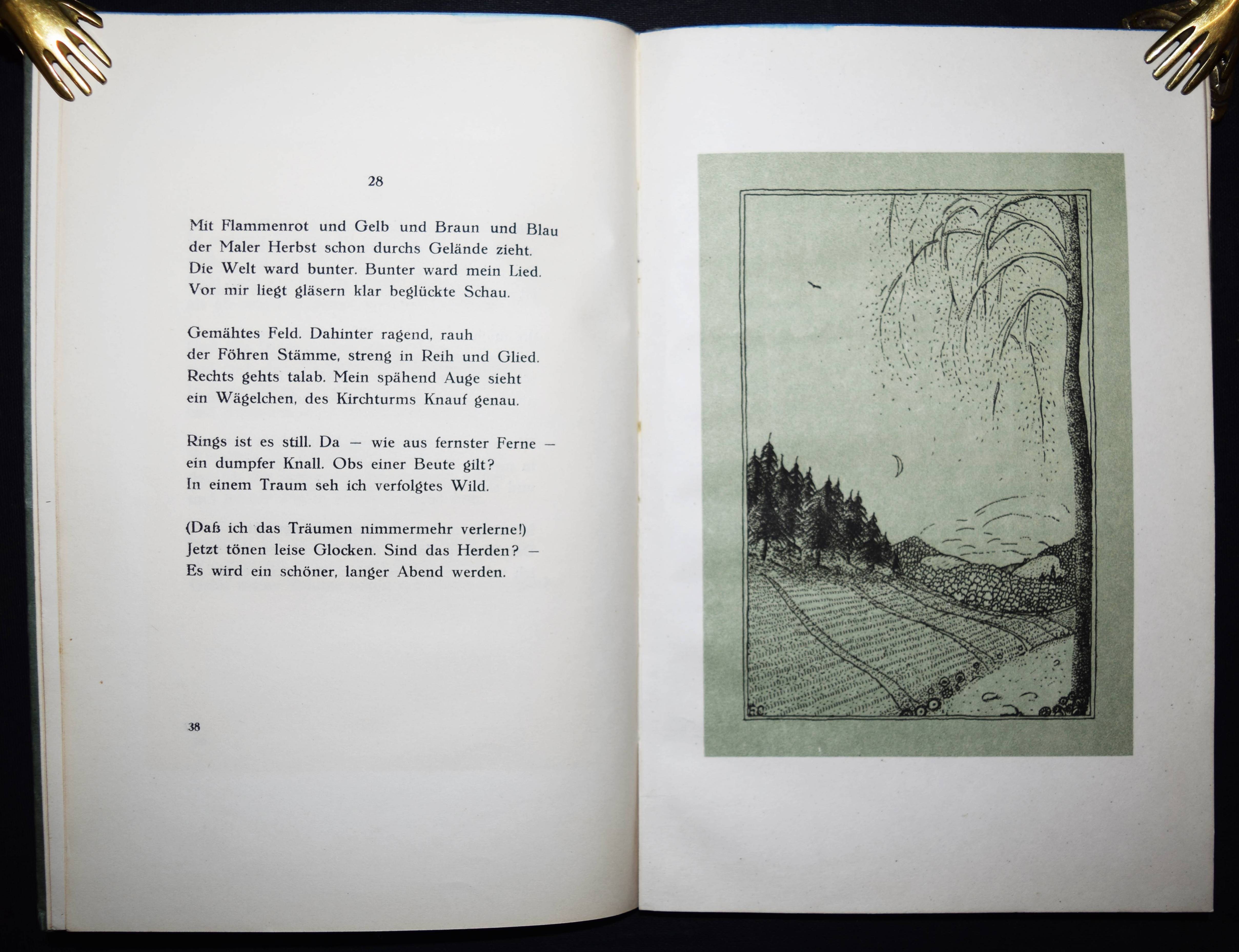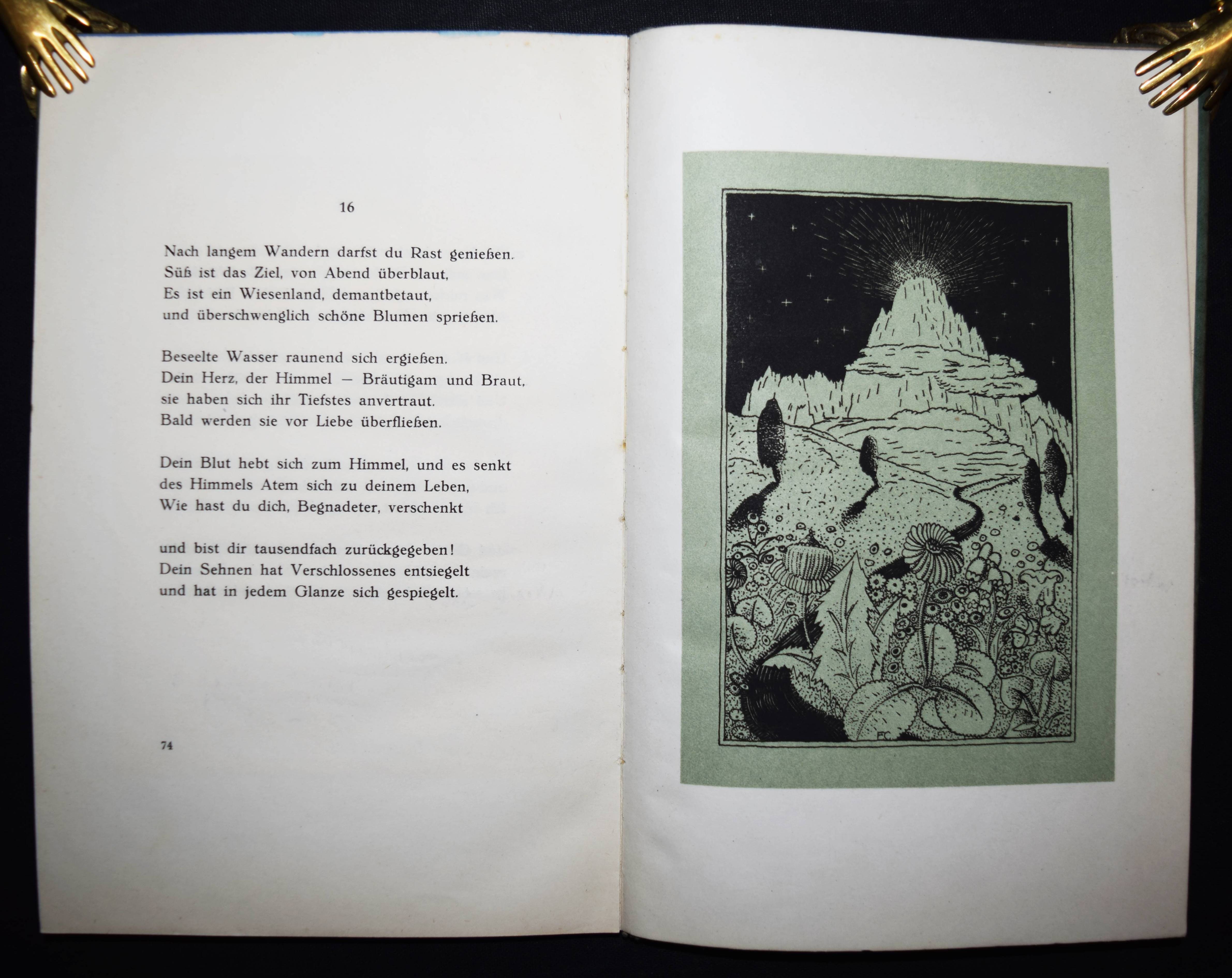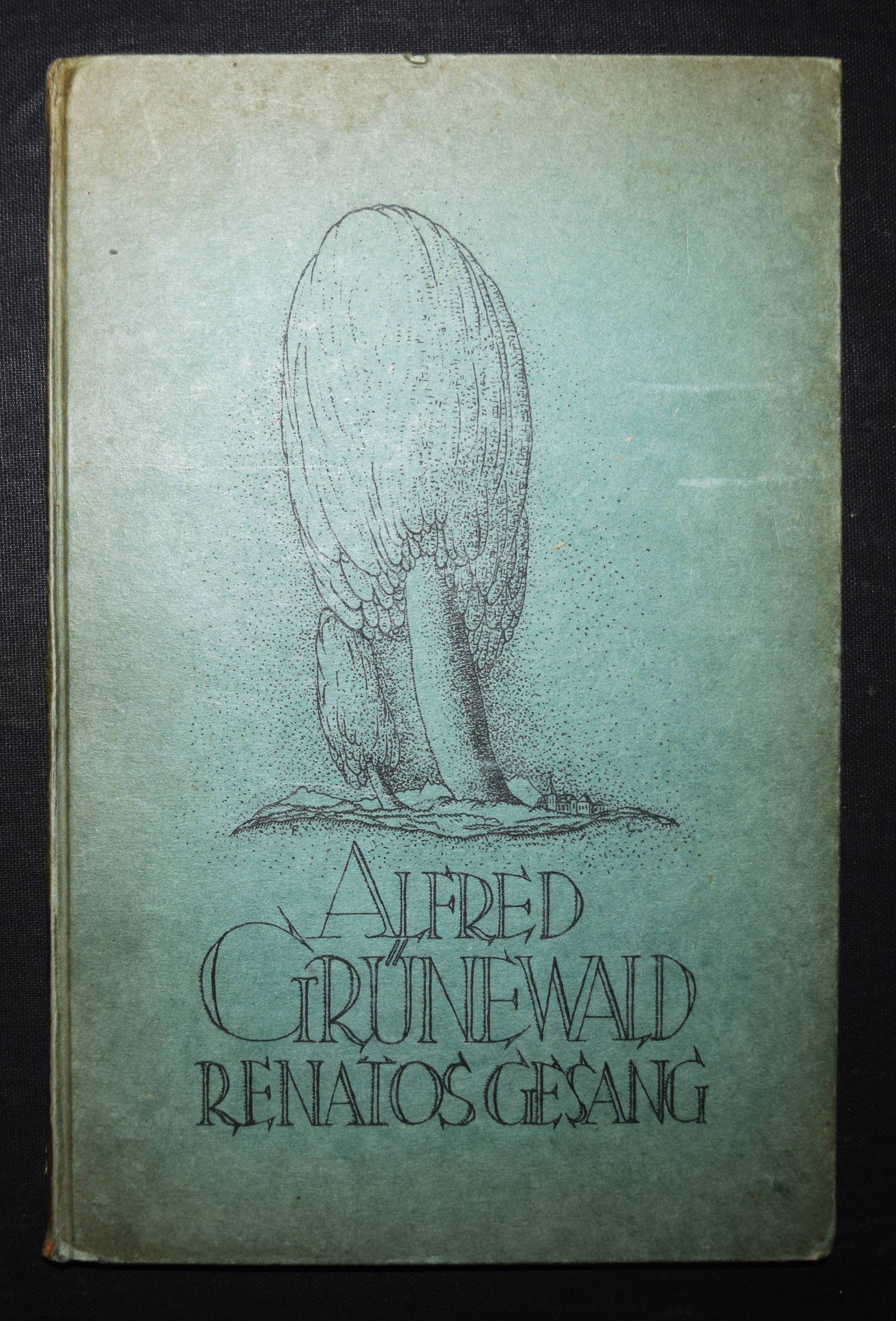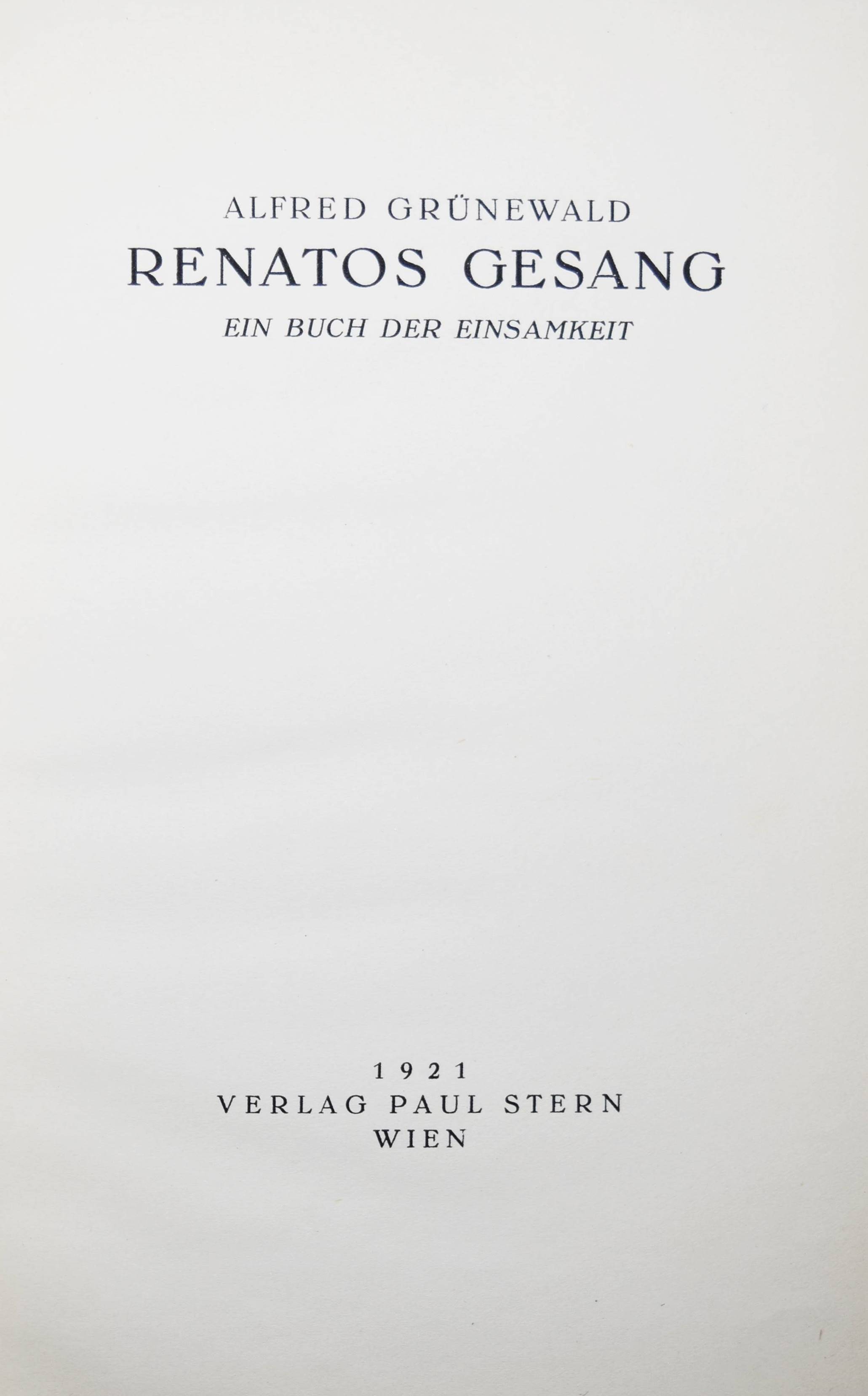 Grünewald, Alfred. Renatos Gesang. Ein Buch der Einsamkeit. Wien, Verlag Paul Stern (1921). 8°. 77 S. mit 4 lithograph. Illustrationen von Fritz Czuczka. Illustr. OPbd. Erste Ausgabe. – Kapitale etwas berieben, gutes Exemplar.