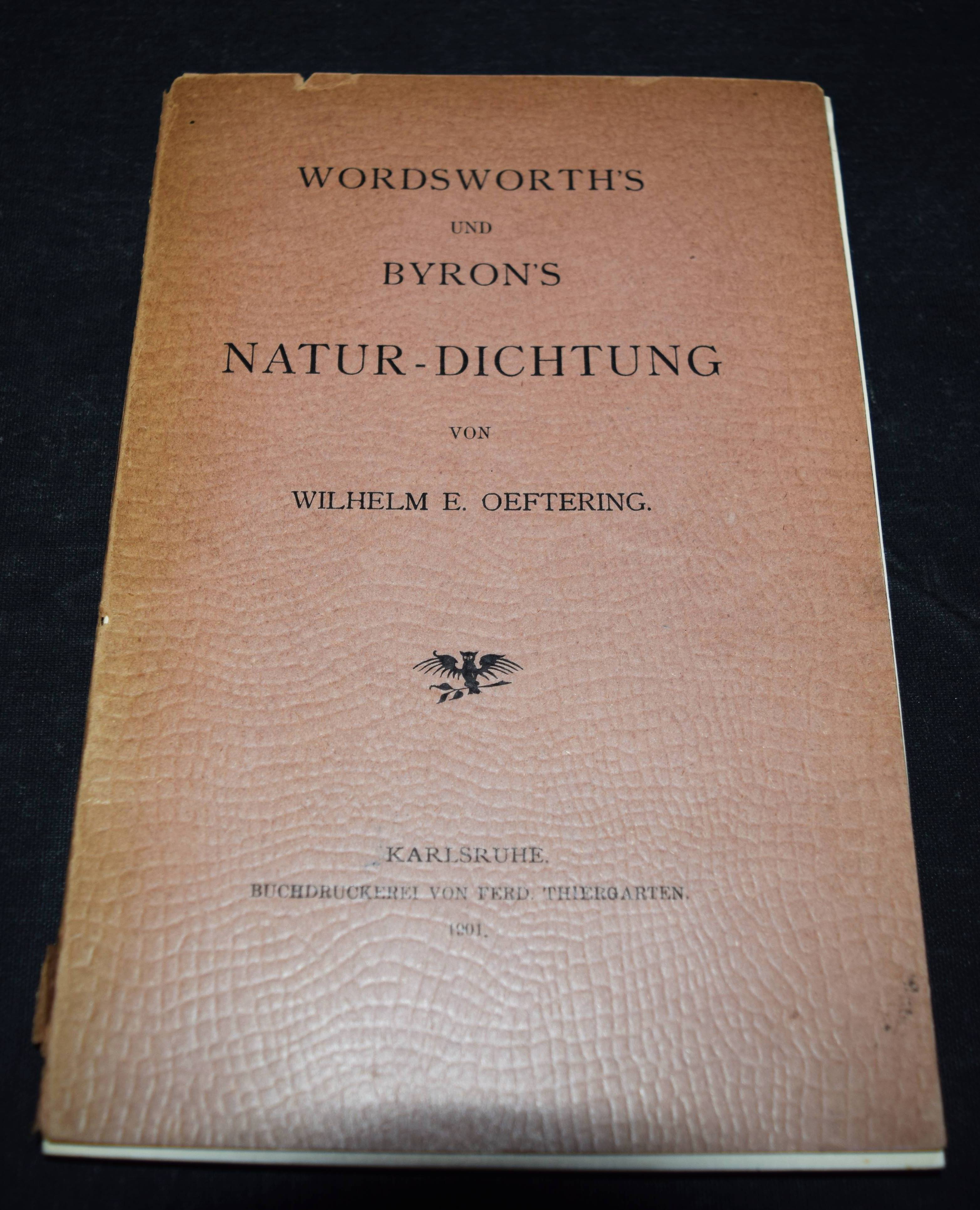 Oeftering, Wilhelm E(ngelbert). Wordsworth’s und Byron’s Natur-Dichtung. Karlsruhe, F. Thiergarten 1901. 8“. 198 S. OKart.. Umschlag vom Buchblock abgelöst und mit kleineren Läsuren, Block selbst fest, sonst sauberes Exemplar.