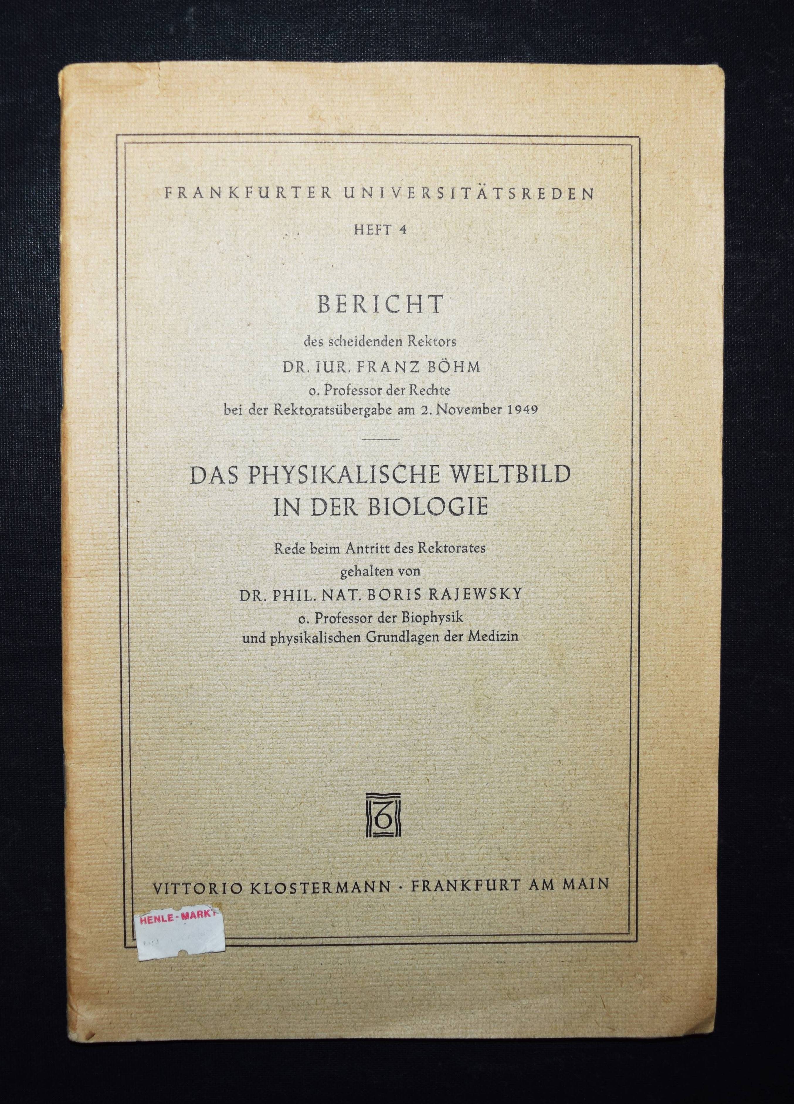 Böhm, Franz. Bericht des scheidenden Rektors Franz Böhm bei der Rektoratsübergabe am 2. November 1949. Das physikalische Weltbild in der Biologie. Rede…gehalten von Boris Rajewsky. Frankfurt am M., Klostermann 1952. 46 S. Obr. (Frankfurter Universitätsreden, Heft 4). Papierbedingt gebräunt, Umschlag u. die ersten 8 Blatt mit kleiner Läsur im oberen Rand., sonst gut erhalten.