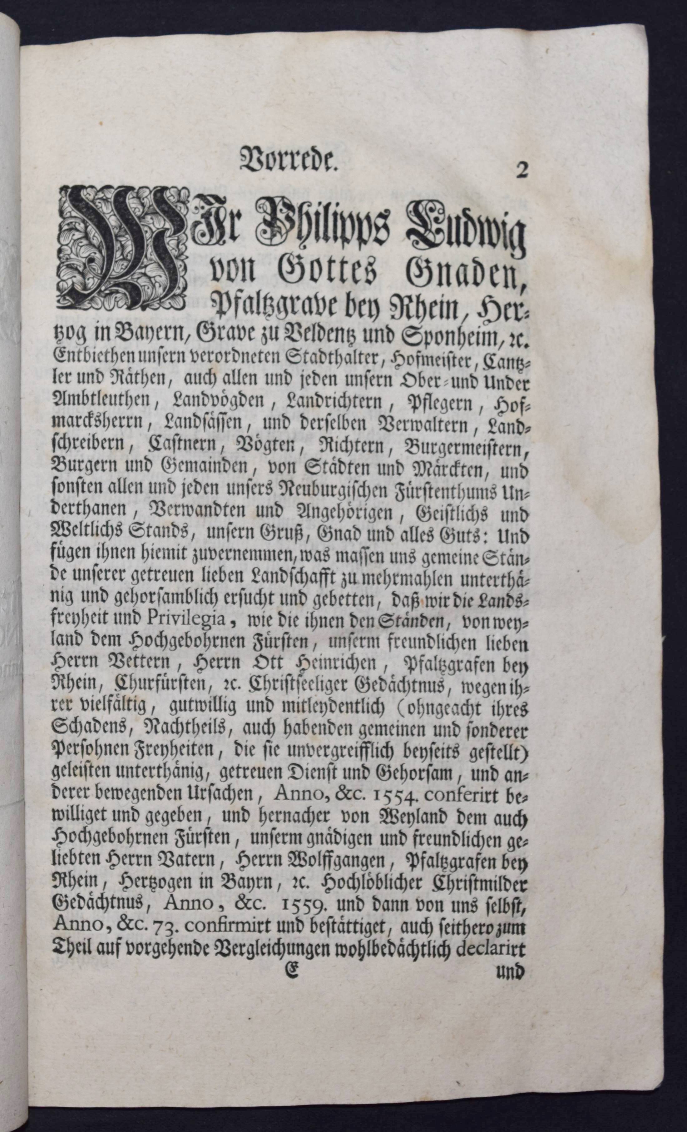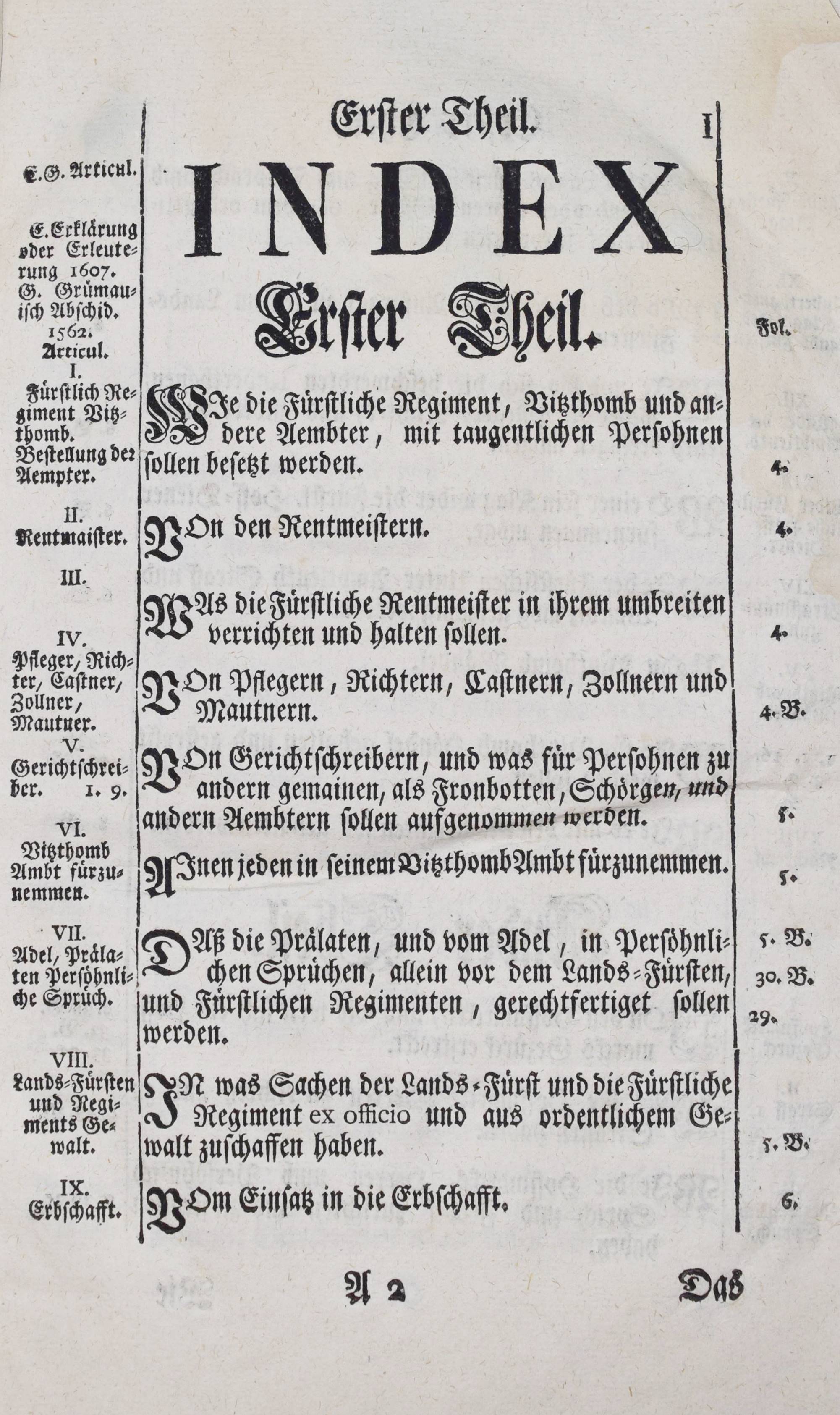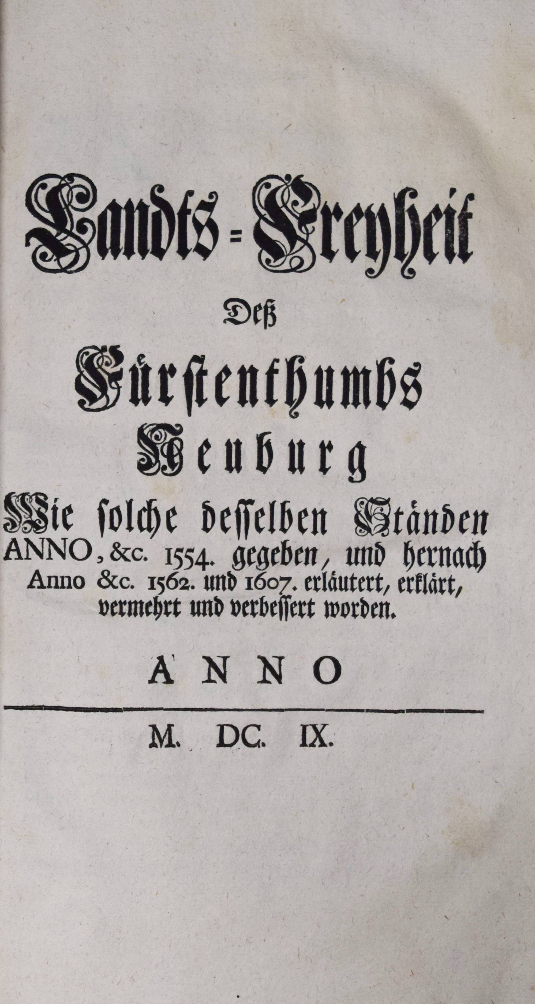 Summarischer Index Ueber die Landts-Freyheit. Gedruckt zu Neuburg an der Donau, durch Lorentz Danhauser. Anno M.DC.XXIII. Anjetzo aber wieder neu aufgelegt und gedruckt. Neuburg an der Donau, Sillmann 1765. 4°. [1] Bl., 11, 43 S. Kart. d. Zt. Umschlag etwas berieben und fleckig, stellenweise mit leichten Feuchtigkeitsspuren, sonst gut erhalten.