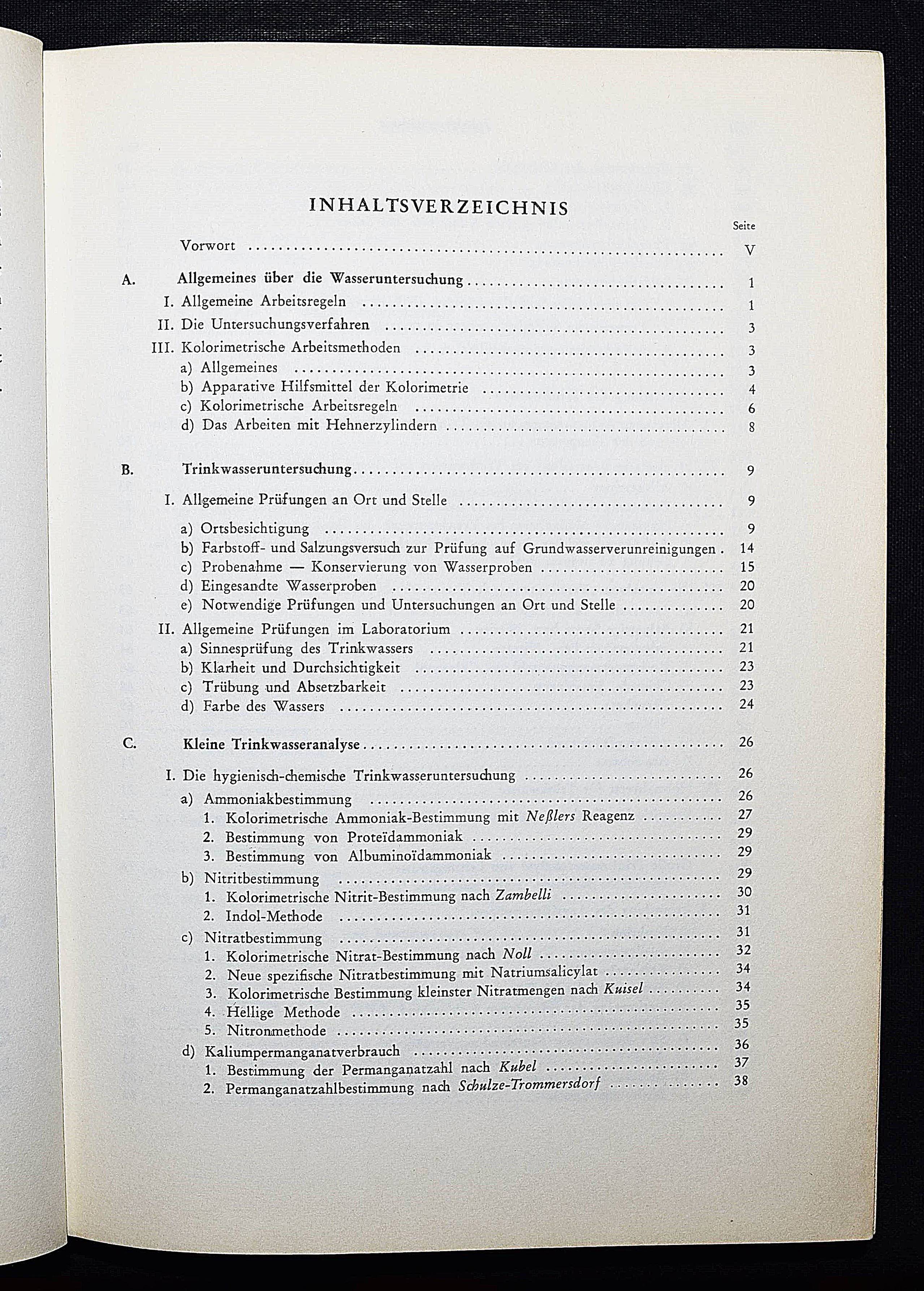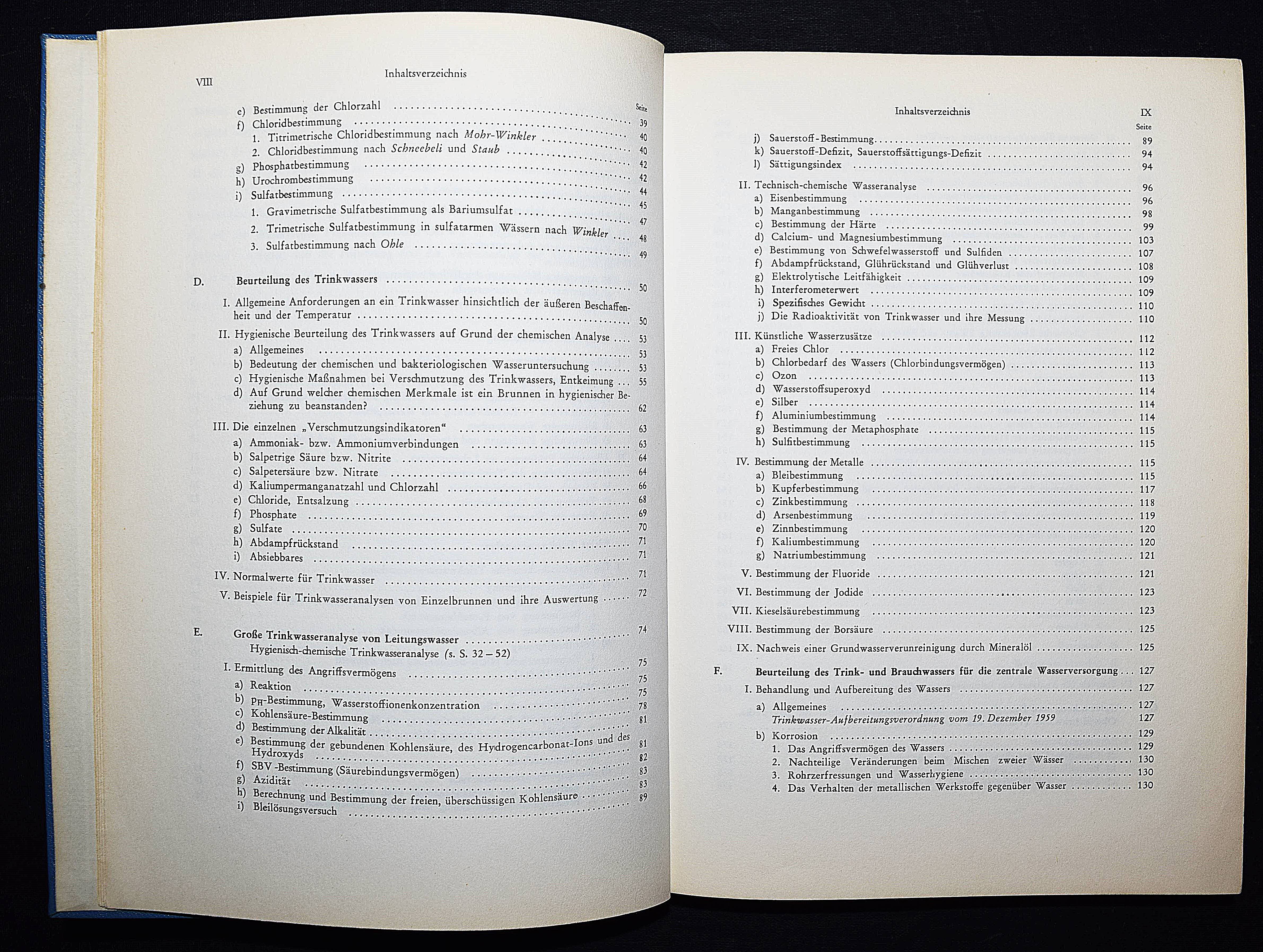 Höll, Karl. Untersuchung, Beurteilung, Aufbereitung von Wasser. Chemische Untersuchung von Trinkwasser, Flußwasser, Schwimmbadwasser, Brauchwasser, Kesselspeisewasser, Wasser für Bauzwecke, Brauwasser, Abwasser und Vorflut; nebst Erläuterungen über Mineralwasser und Heilwasser. 3., völlig neubearb. u. erw. Aufl. Berlin, De Gruyter 1960. Gr.-8°. XI, 235 S. OPbd. Sehr gutes Exemplar.