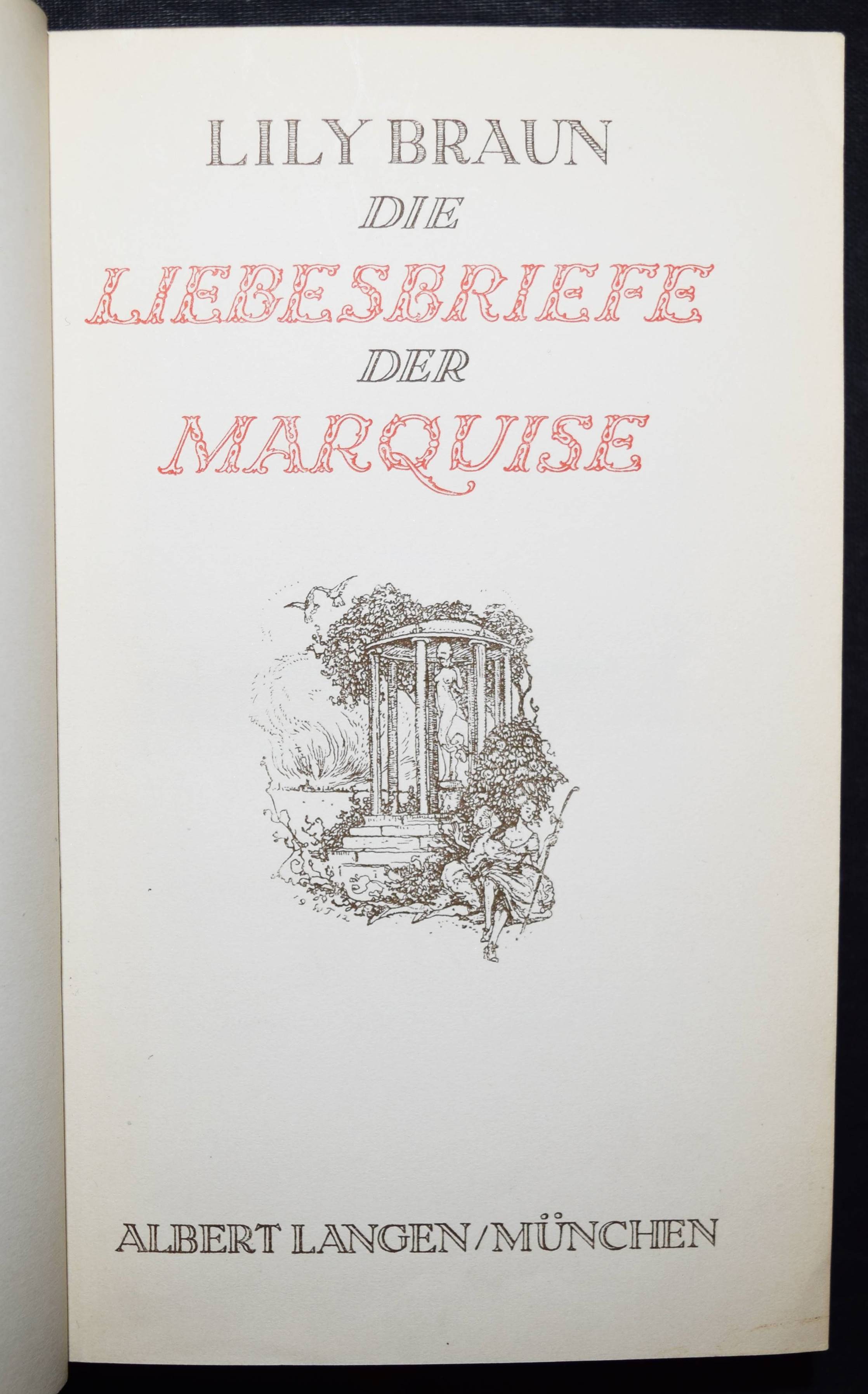 Braun, Lily. Die Liebesbriefe der Marquise. München, Langen (1912). 8°. XII, 466 S. OHprgt. mit goldgepr. Rückentitel u. dez. Rückenverg. Schönes Exemplar im dekorativen Halbpergamenteinband.