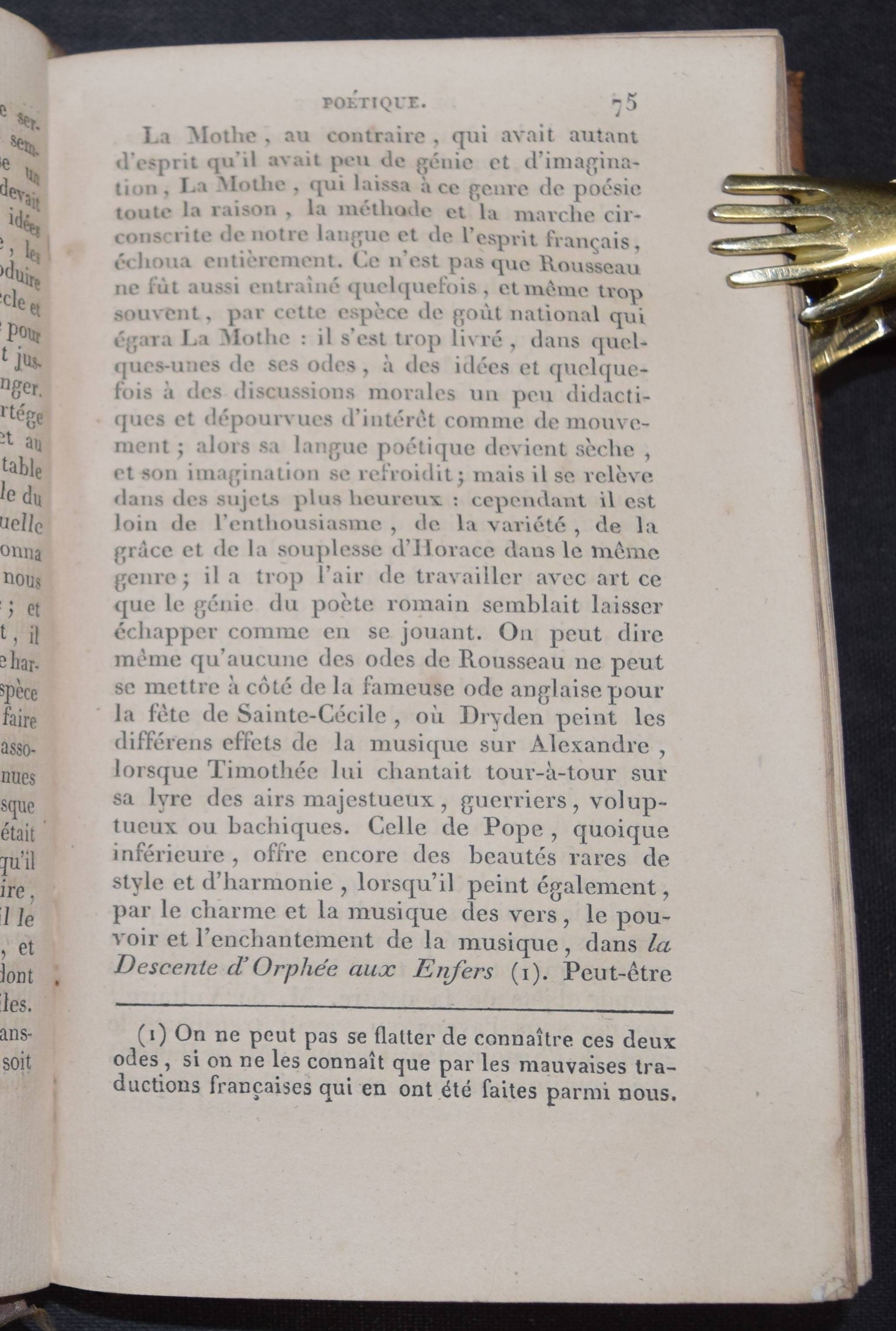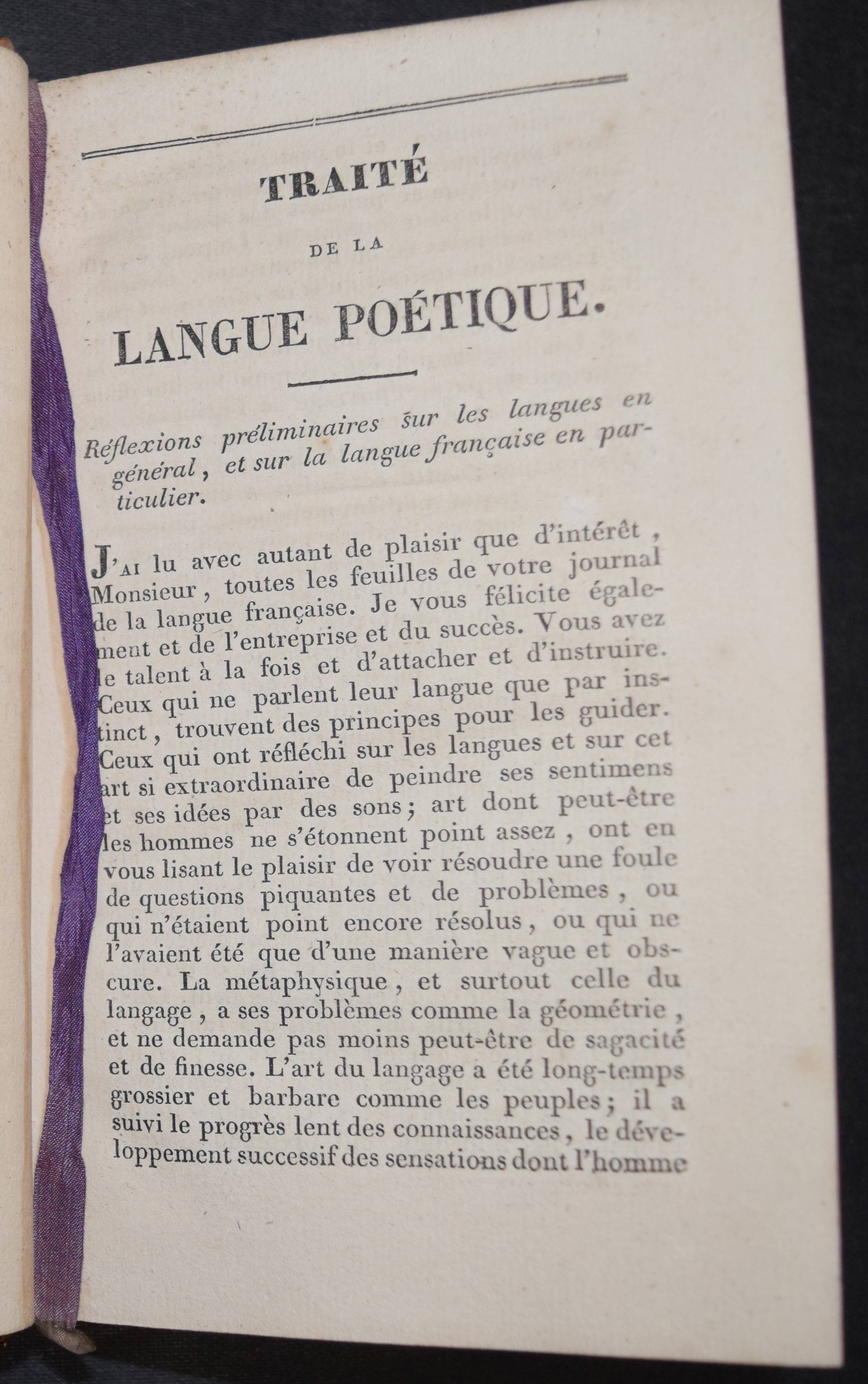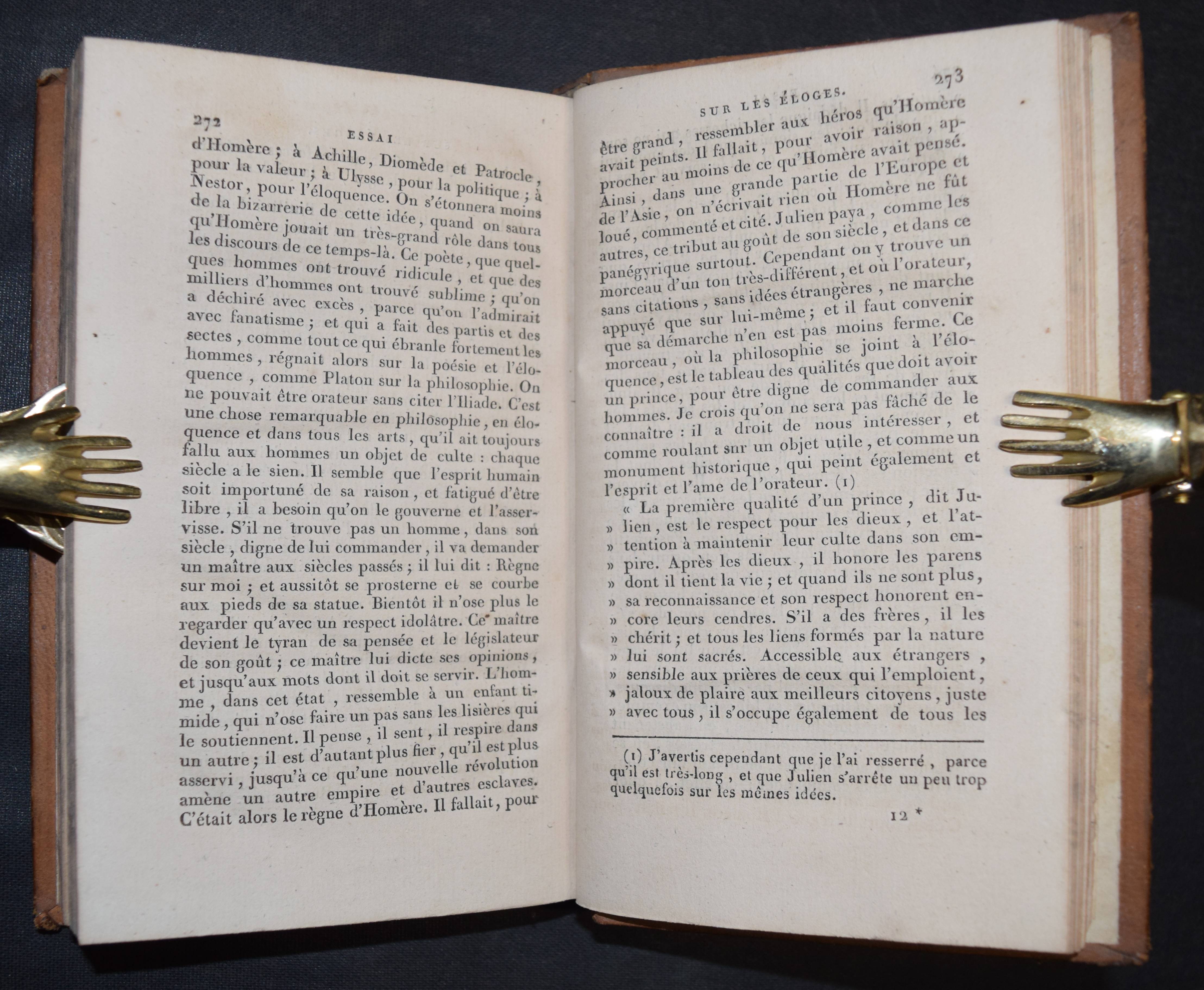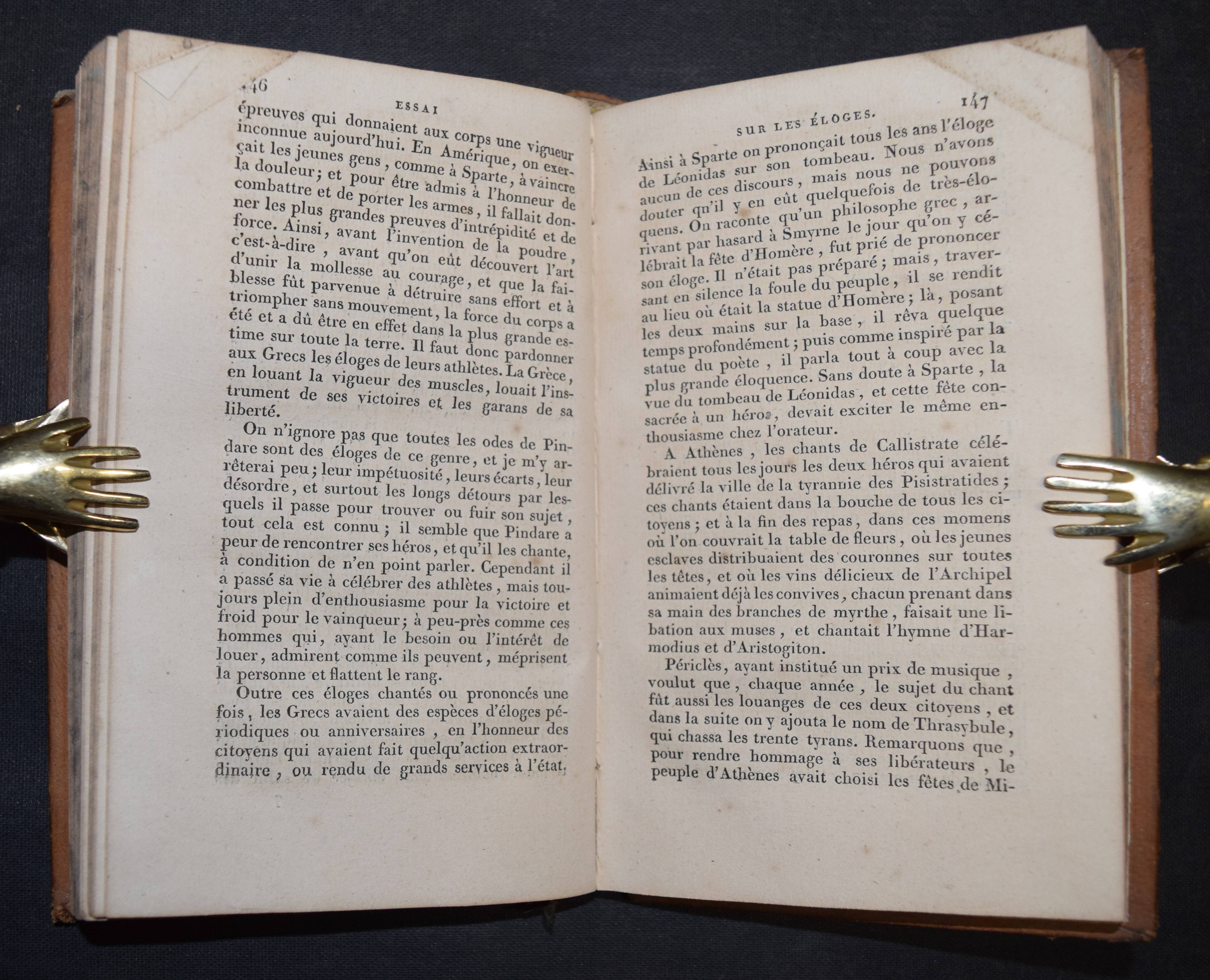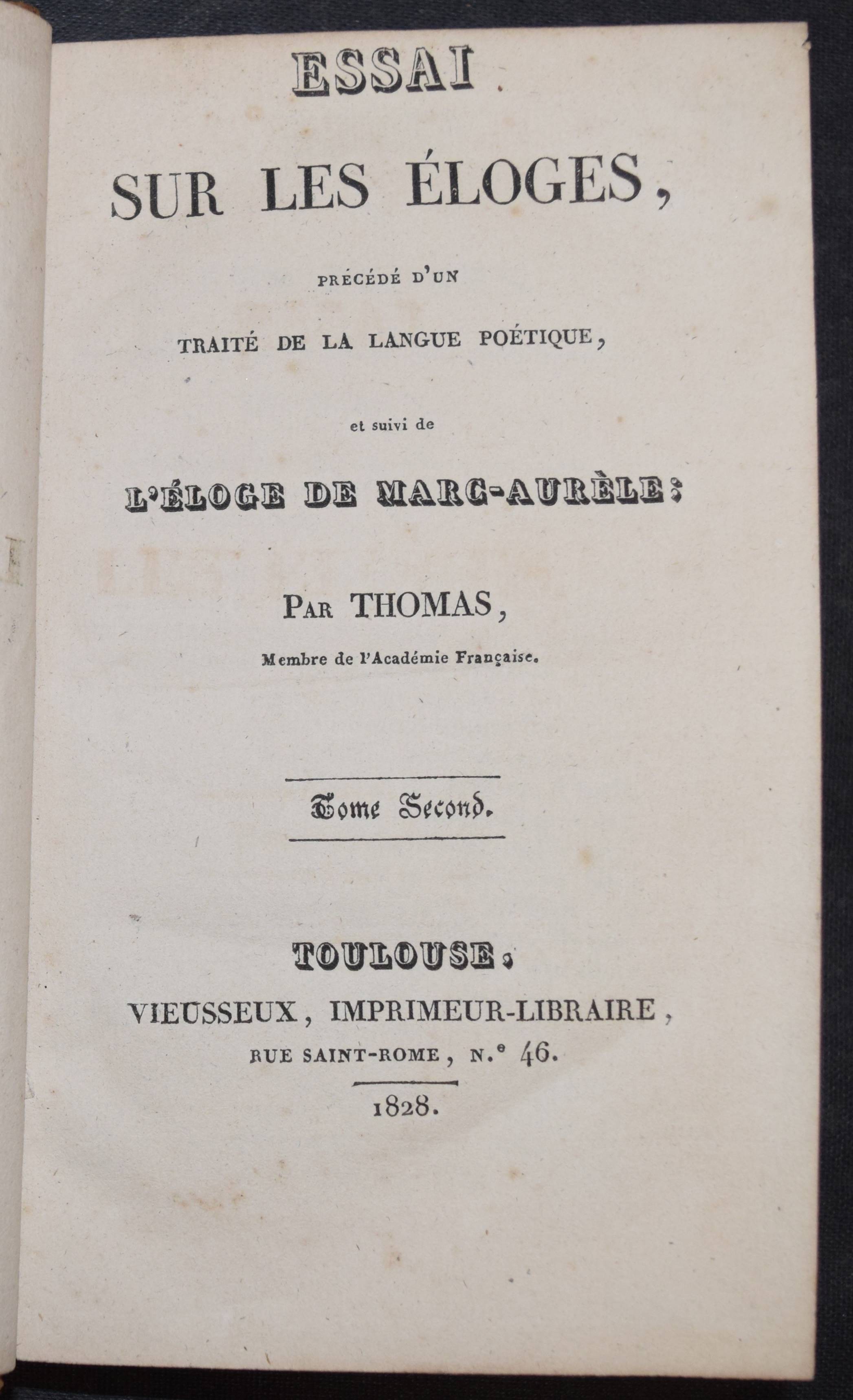Thomas, (Antoine Léonard). Essai sur les éloges, précédé d’un traité de la langue poétique, et suivi de l’éloge de Marc Aurèle. 2 tomes. Toulouse, Vieusseux 1828. Kl.-8°. 2 Bl., 296 S.; 2 Bl., 303 S. Ldr. d. Zt. mit jeweils 2 goldgepr. Rückenschildern, Rückenverg. u. goldgepr. Deckelvignetten. Zuerst um 1760 erschiene Geschichte der Lobreden. 1775 erschien eine deutsche Übersetzung mit dem Titel „Versuch über die Lobschriften, Lobreden und Lobgedichte“ in Frankfurt an der Oder. – Rücken von Band I berieben u. minimaler Fehlstelle am Fuß, sonst sehr gut erhaltenes dekorativ gebundenes Exemplar aus einem Klosterseminar in Toulouse mit goldgepr. Wappen auf den Vorderdeckeln.