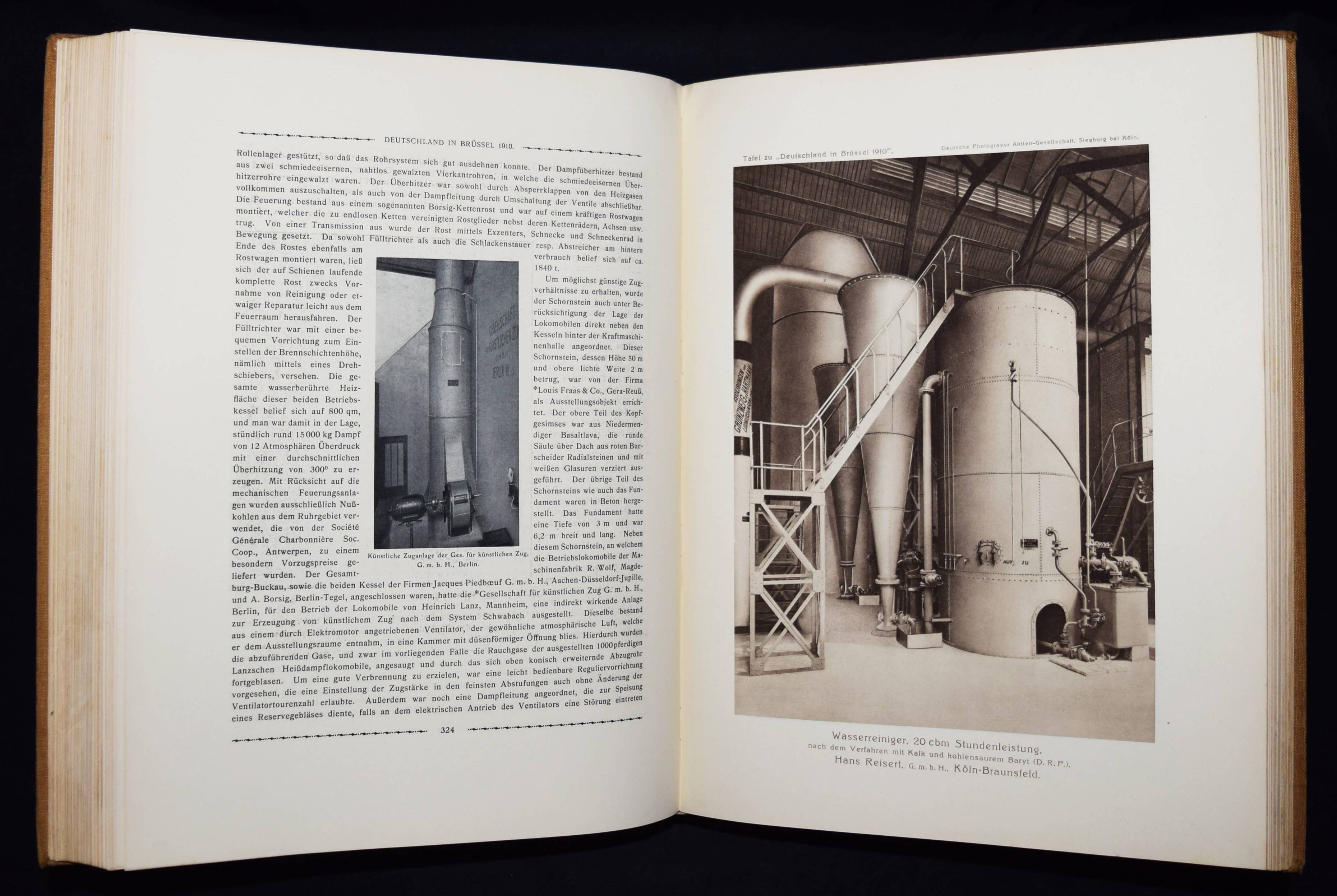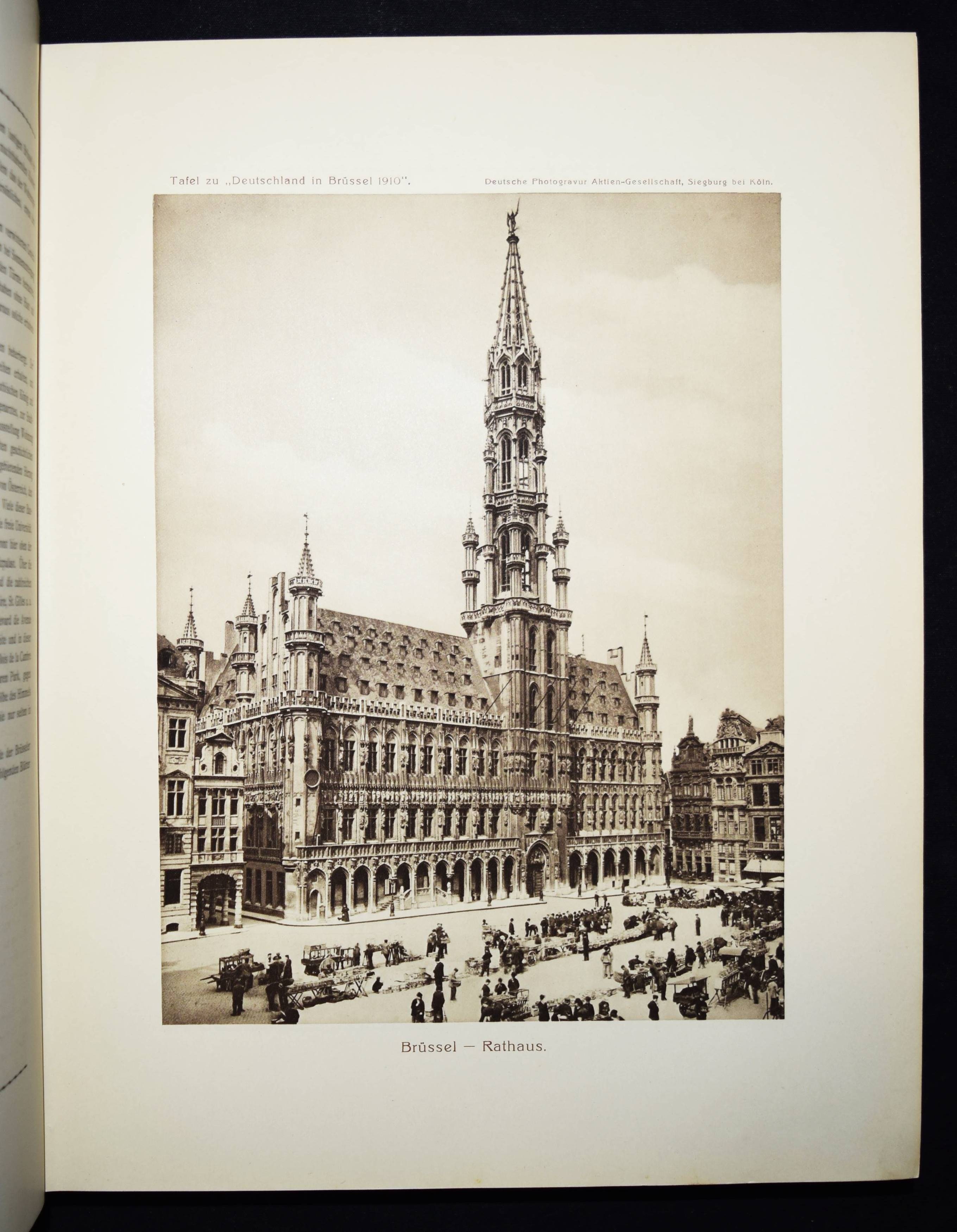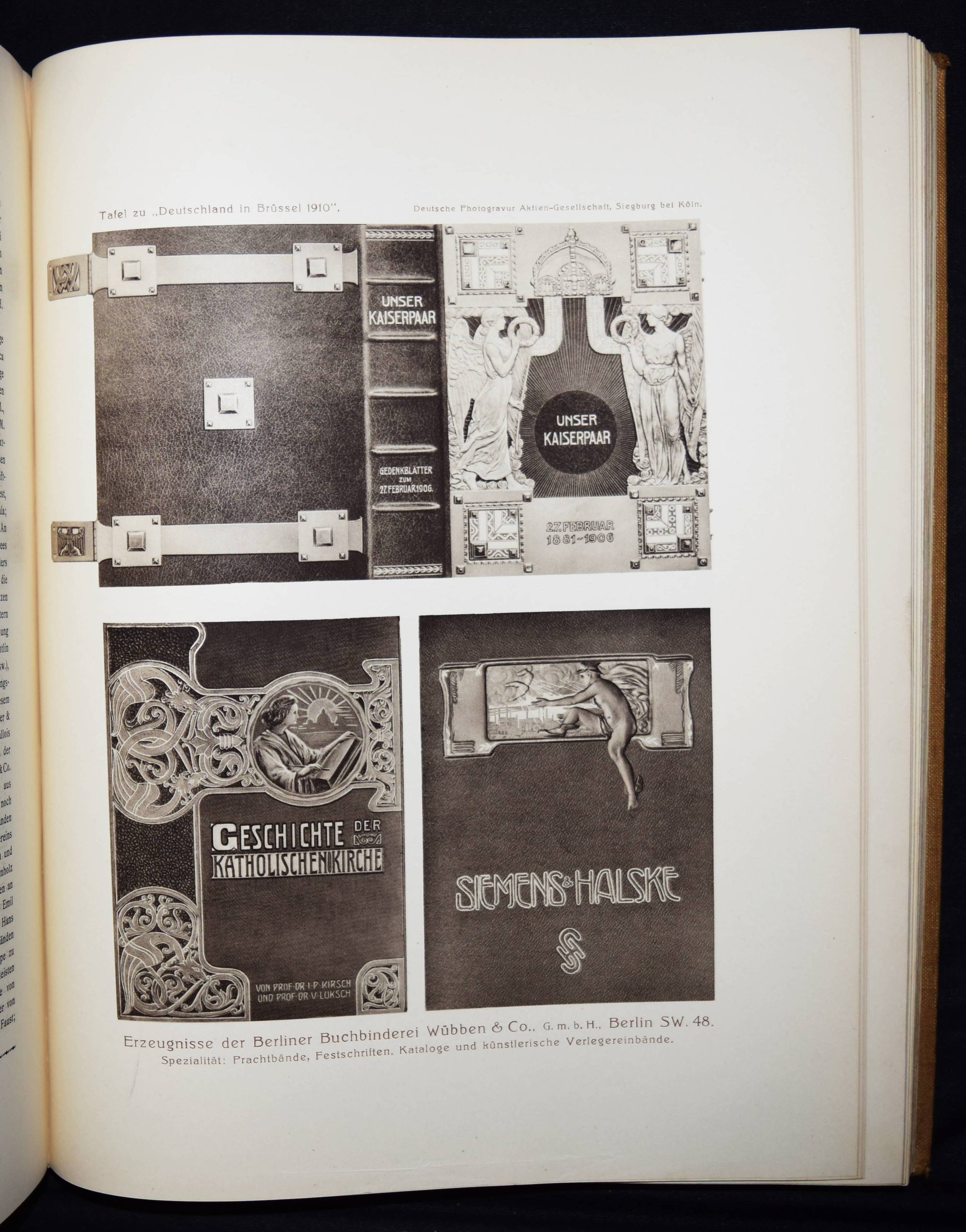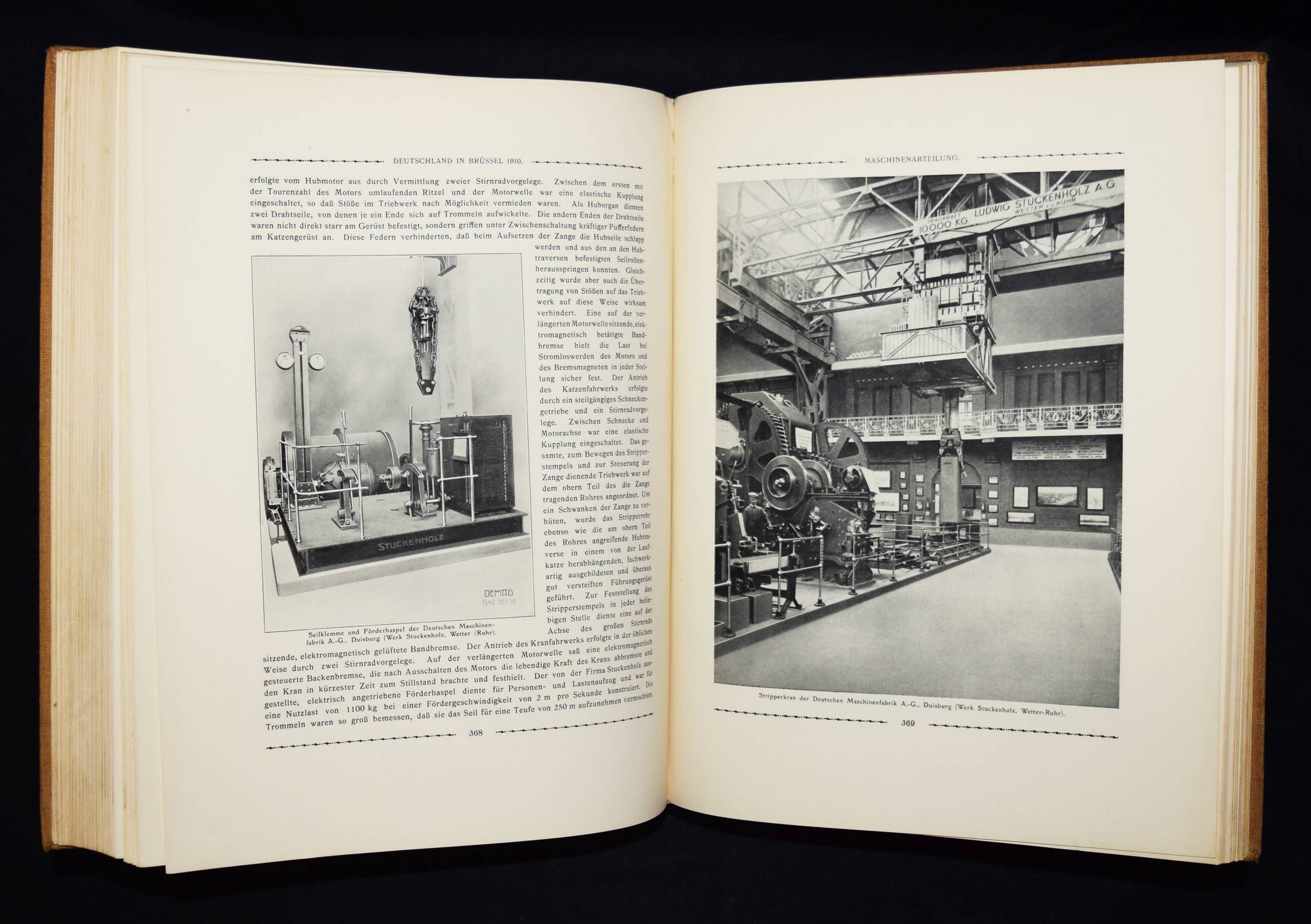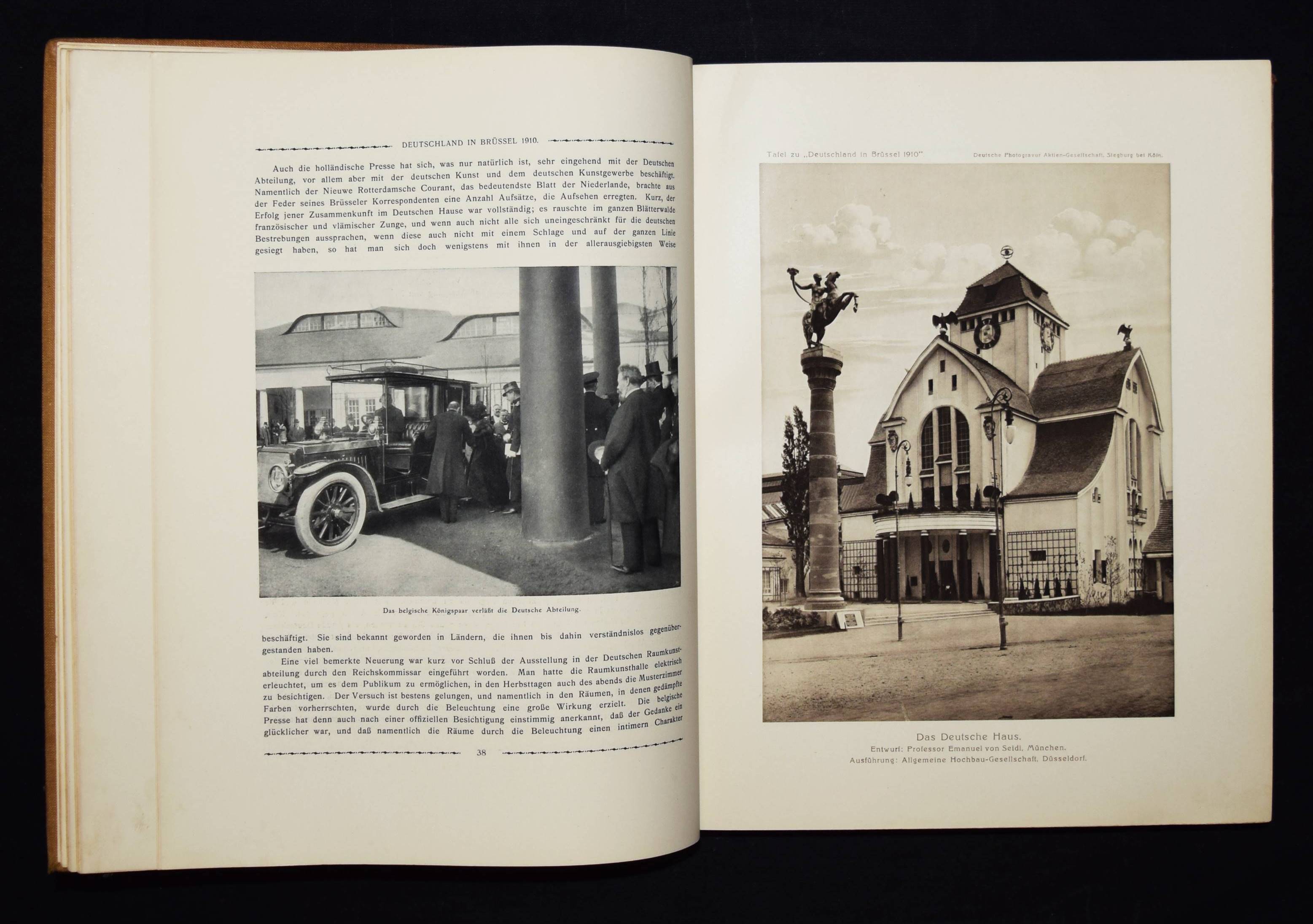 Stoffers, Gottfried. Deutschland in Brüssel 1910. Die Deutsche Abteilung der Weltausstellung. Auf Grund des vom Reichskommisar und vom Präsidenten des Deutschen Komitees zur Verfügung gestellten Materials sowie die Unterstützung zahlreicher Mitarbeiter herausgegeben von Gottfried Stoffers, Leiter des Literarischen Bureaus des Reichskommissars. (Exposition universelle et internationale 1910 Brussels, Belgium). Köln, M. Dumont Schauberg 1910. 4°. [8], 439, [1], 27, [1] S. mit 56 Tafeln, zahlr. Abb. u. 1 gefalt. Plan. Farbig illustr. OLn. Seltene oppulente ausgestattete Festschrift. – Einband geringf. angestaubt, gutes Exemplar.