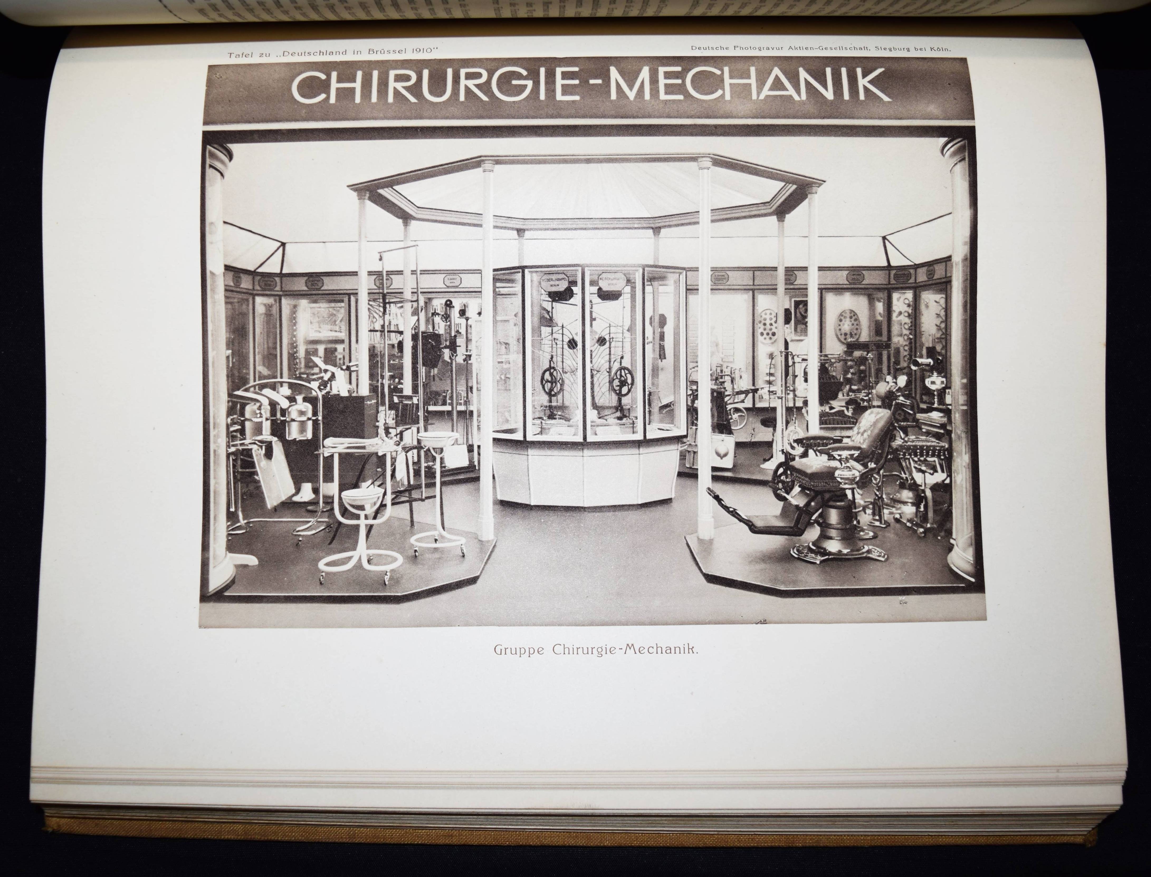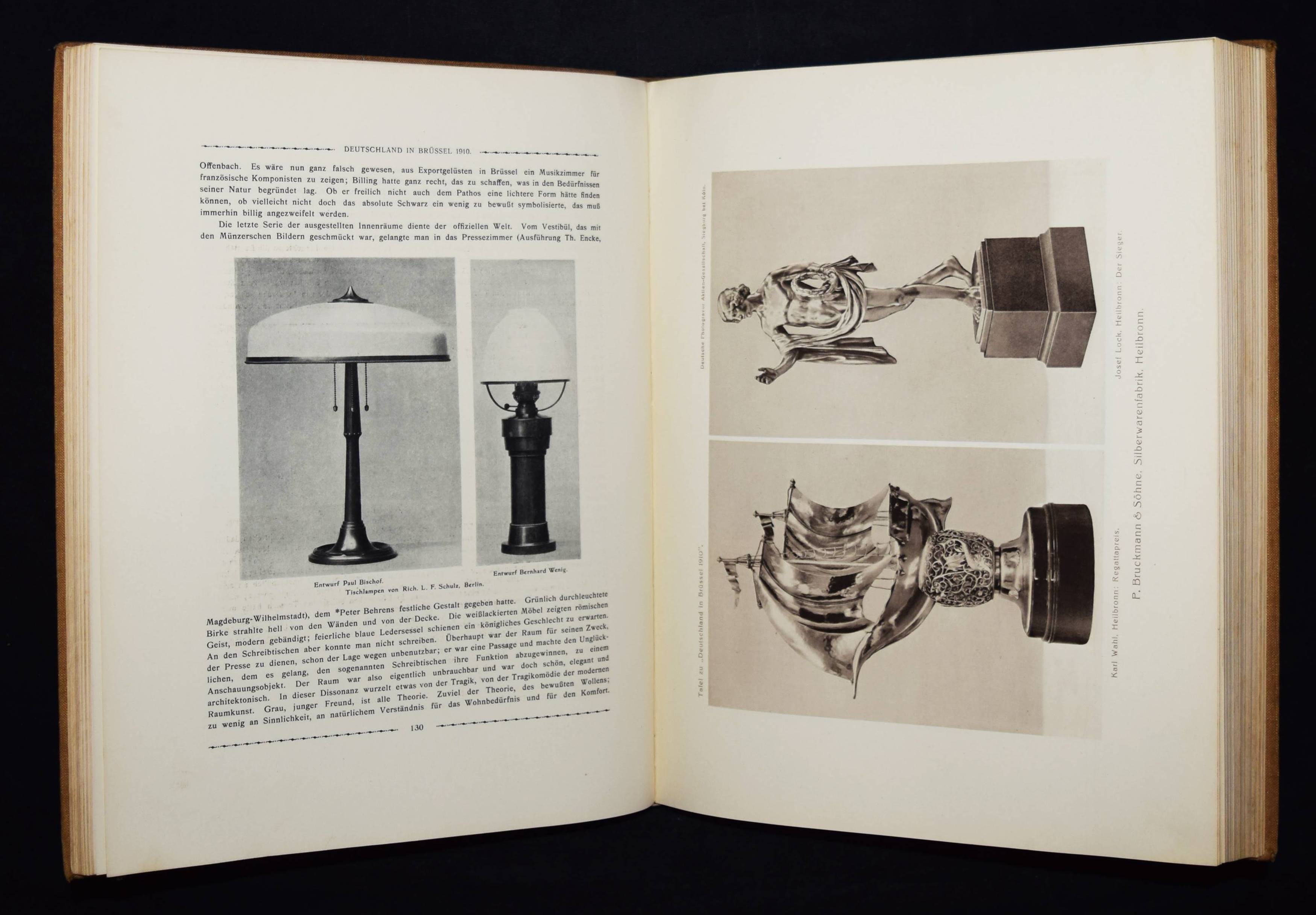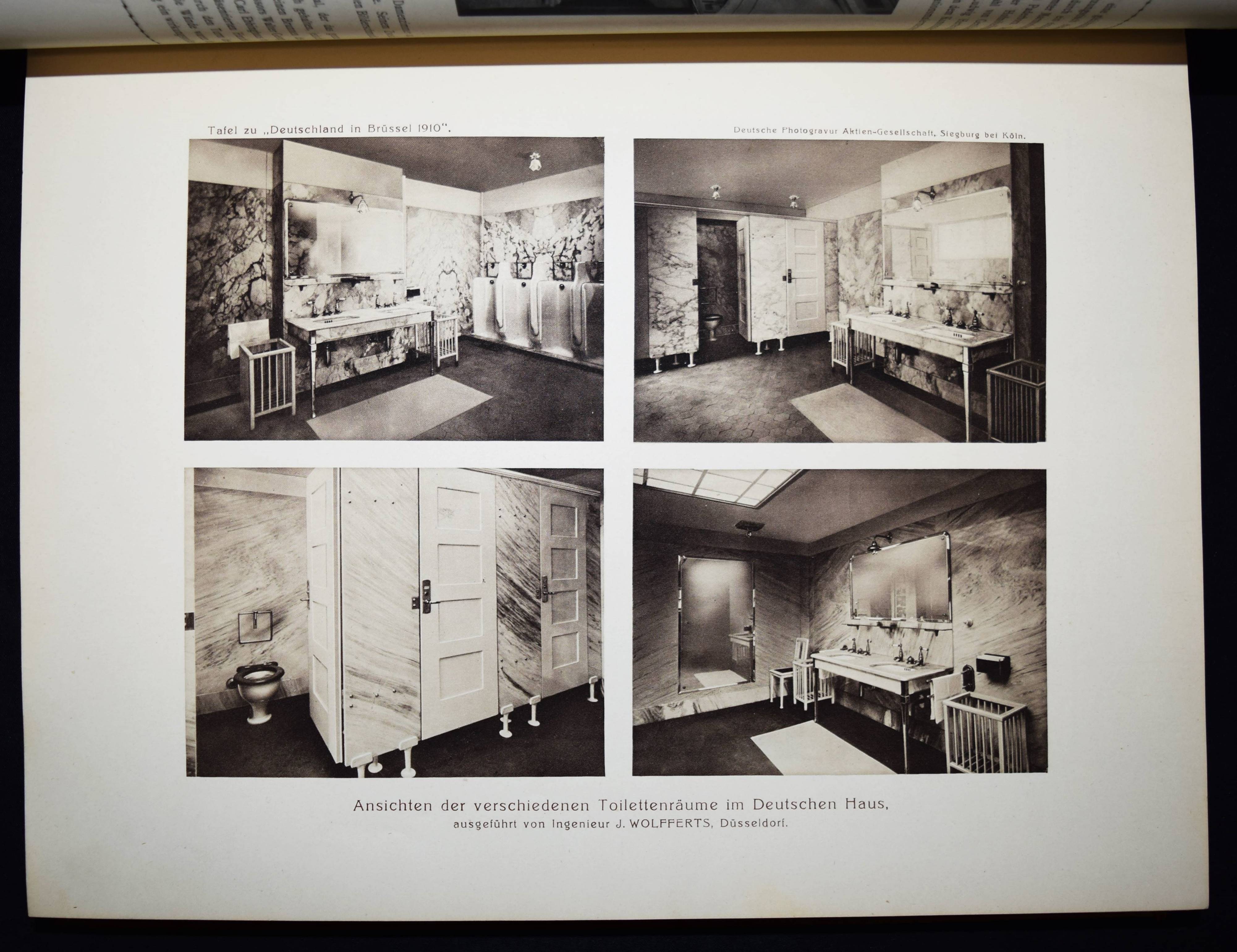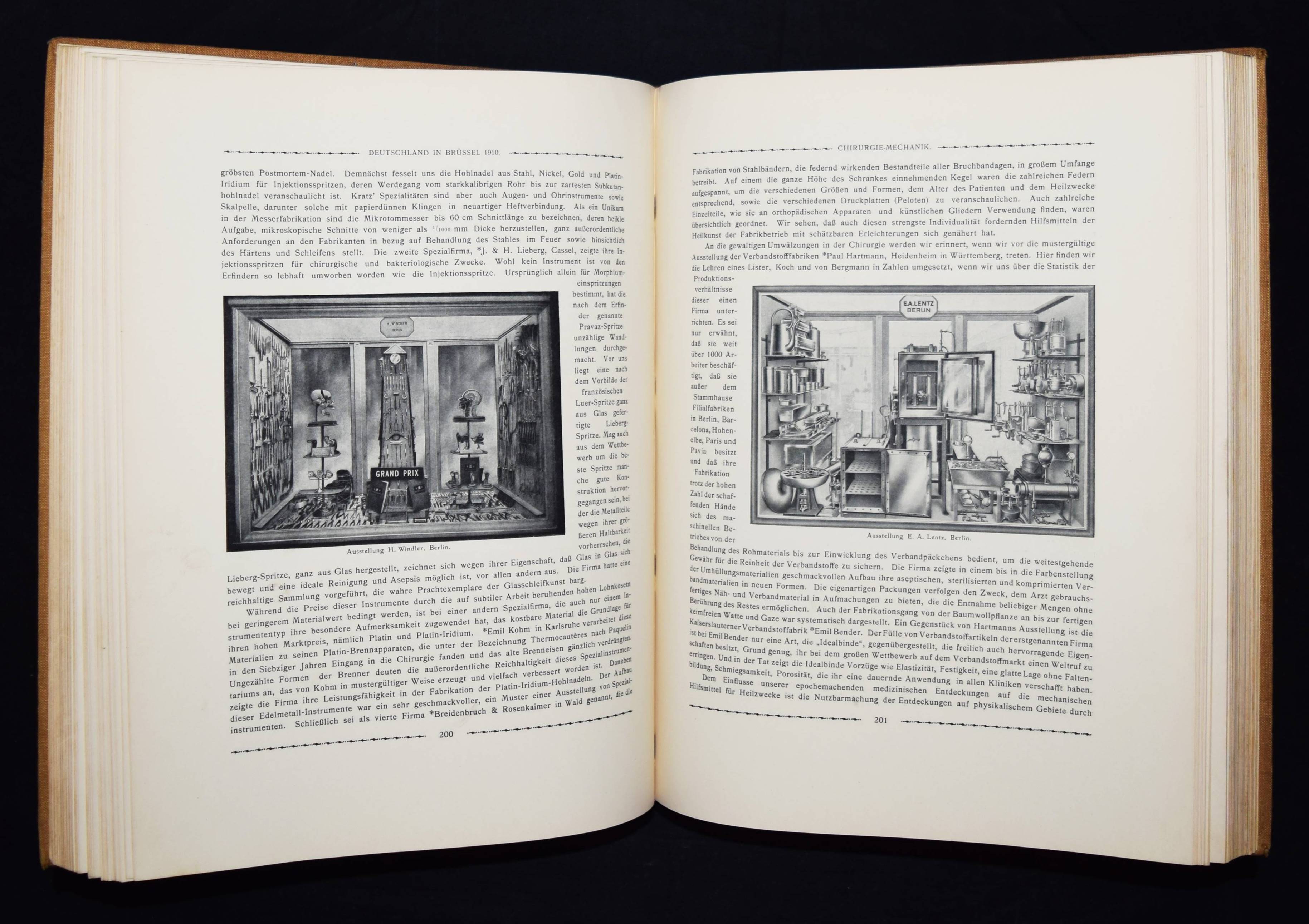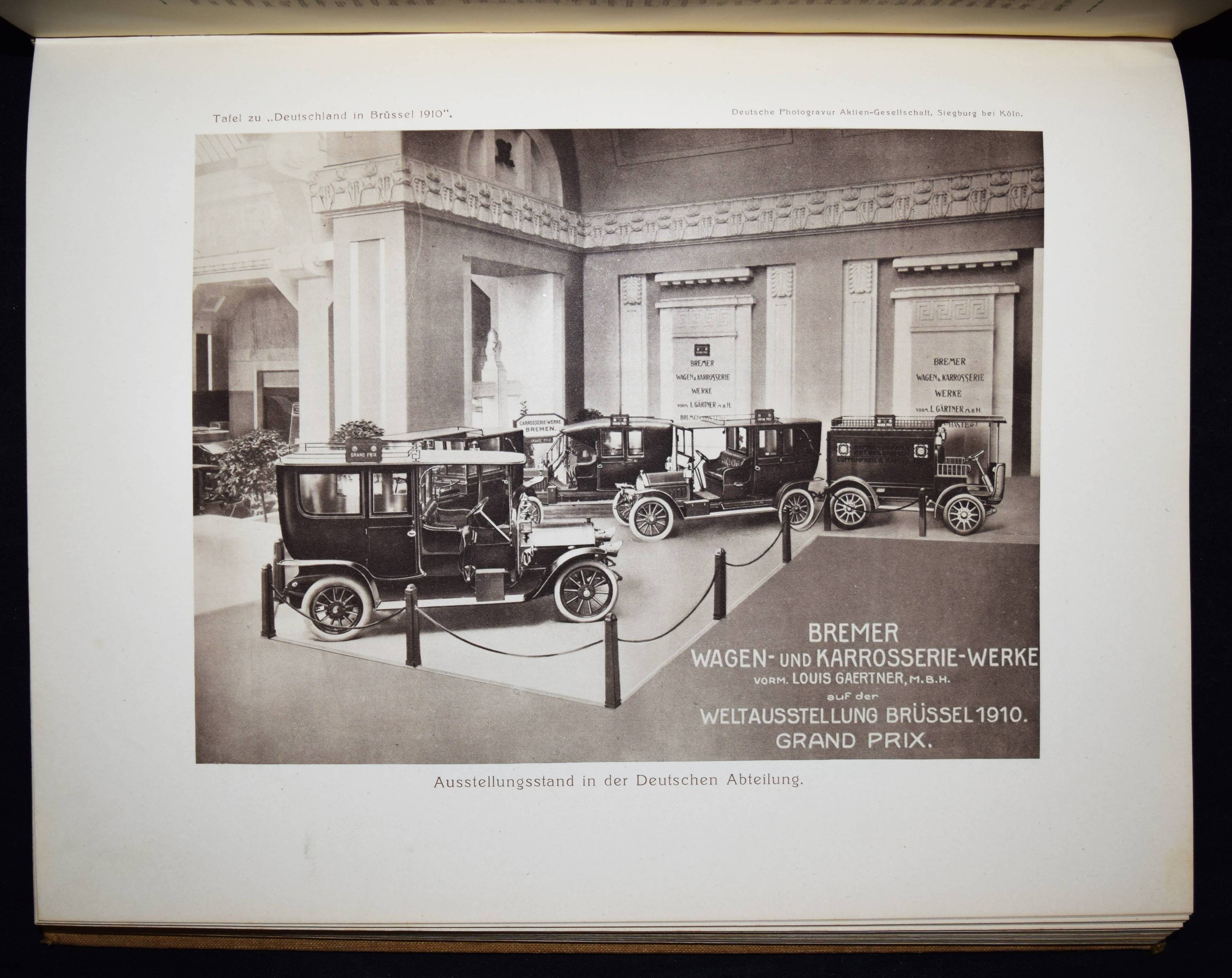 Stoffers, Gottfried. Deutschland in Brüssel 1910. Die Deutsche Abteilung der Weltausstellung. Auf Grund des vom Reichskommisar und vom Präsidenten des Deutschen Komitees zur Verfügung gestellten Materials sowie die Unterstützung zahlreicher Mitarbeiter herausgegeben von Gottfried Stoffers, Leiter des Literarischen Bureaus des Reichskommissars. (Exposition universelle et internationale 1910 Brussels, Belgium). Köln, M. Dumont Schauberg 1910. 4°. [8], 439, [1], 27, [1] S. mit 56 Tafeln, zahlr. Abb. u. 1 gefalt. Plan. Farbig illustr. OLn. Seltene oppulente ausgestattete Festschrift. – Einband geringf. angestaubt, gutes Exemplar.