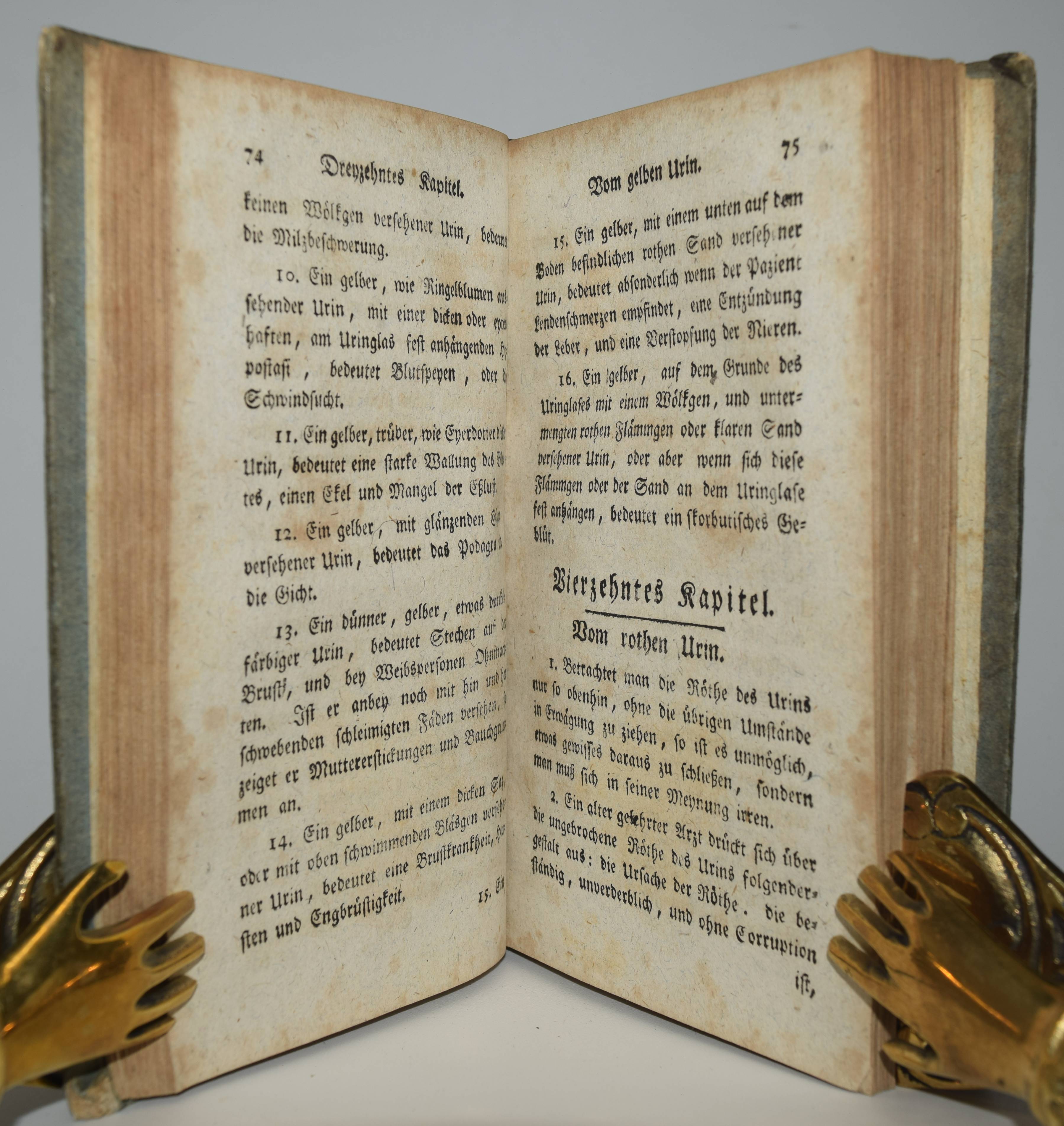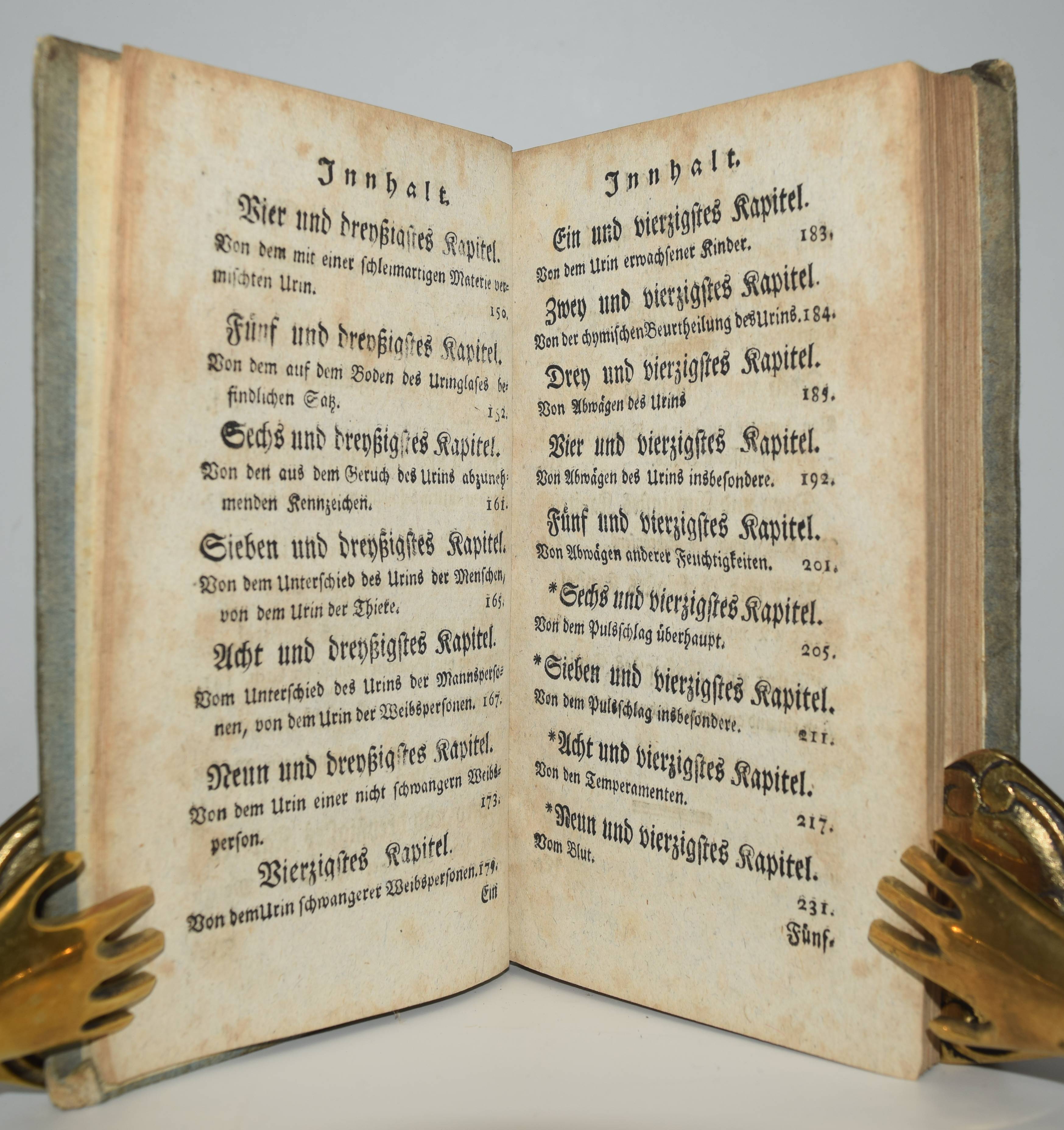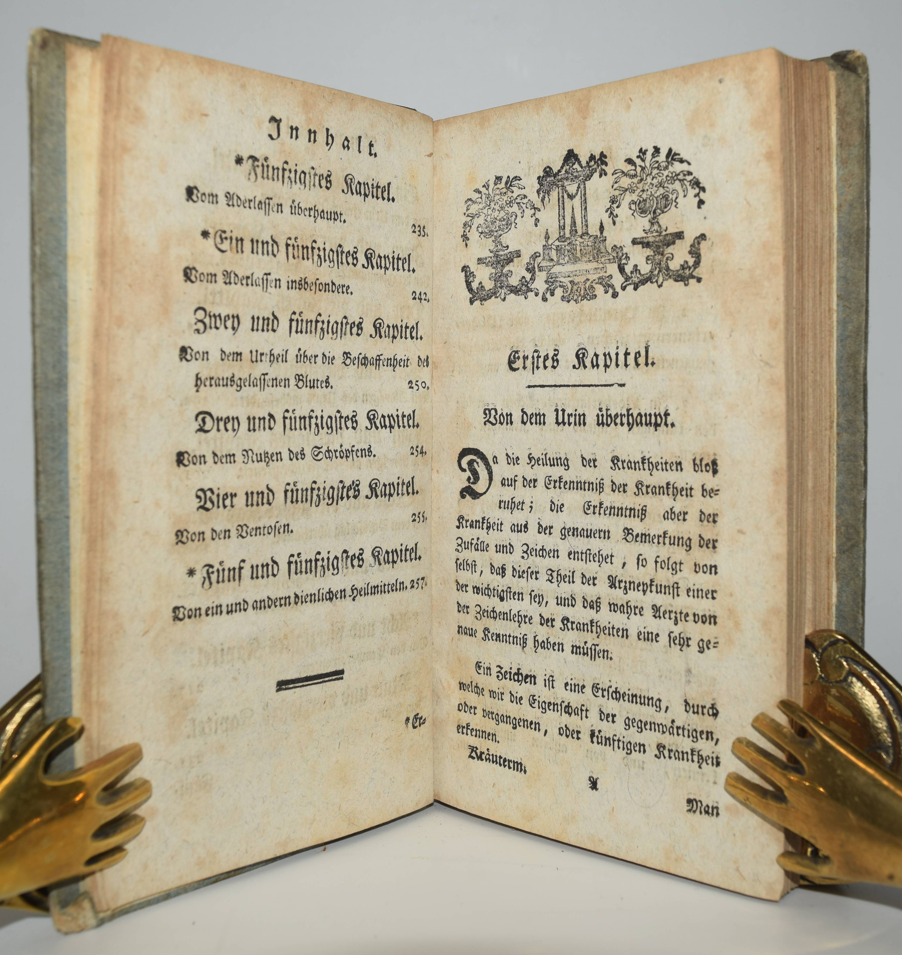 Kräutermann, D. Valentini (d. i. Christoph v. Hellwig). Lehre von den untrüglichen Kennzeichen des Urins, des Pulses, der Temperamenten und des Blutes. Mit Anmerkungen versehen, und durchgehends verbessert von Johann Gottfried Essich. Augsburg, Wolff 1788. 8°. [8] Bl., 280 S. Pbd. d. Zeit mit goldgepr. Rückensch. Hirsch/Hüb. III, 149. Wellcome II, 205. Nicht bei Engelmann, Lesky, Osler u. Waller. – Erste Ausgabe. – Der Thüringer Mediziner Christoph v. Hellwig (1633-1721) brachte zahlreiche medizinische Schriften heraus und gilt durch einen Aufsatz in der „Frauenzimmer-Apotheke“ im Jahre 1700 als Erfinder der Zahnbürste, indem er diese neue Methode der Zahnreinigung gegenüber bisher üblichen, wie dem Kauen von Sägespänen oder dem Putzen mit Lappen, hervorhebt. Unter dem Namen Valentin Kräutermann und anderen Pseudonymen veröffentlichte er über 240 Druckschriften, von denen viele noch nach seinem Leben aufgelegt wurden. – Einband etwas berieben, St. a. V., durchgehend etwas braunfleckig, gutes Exemplar.