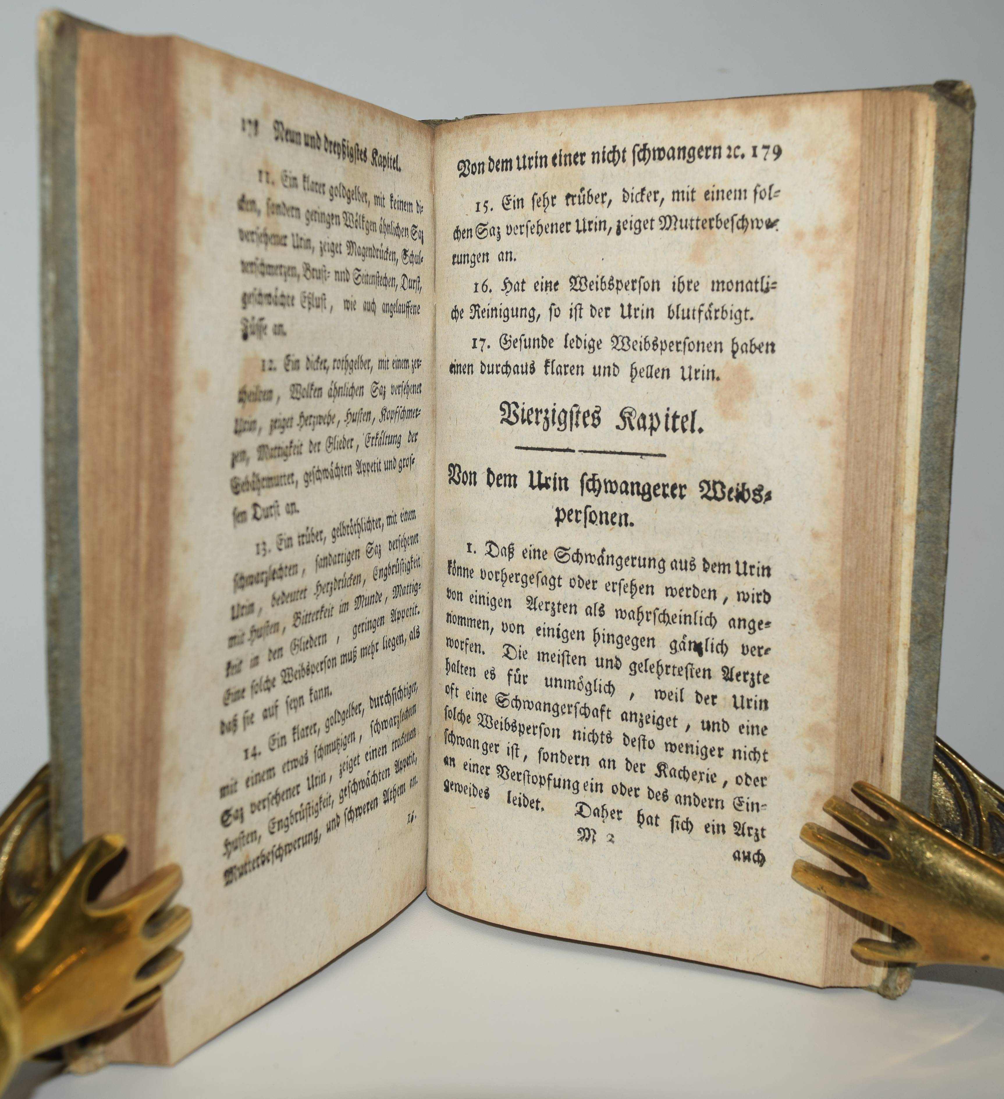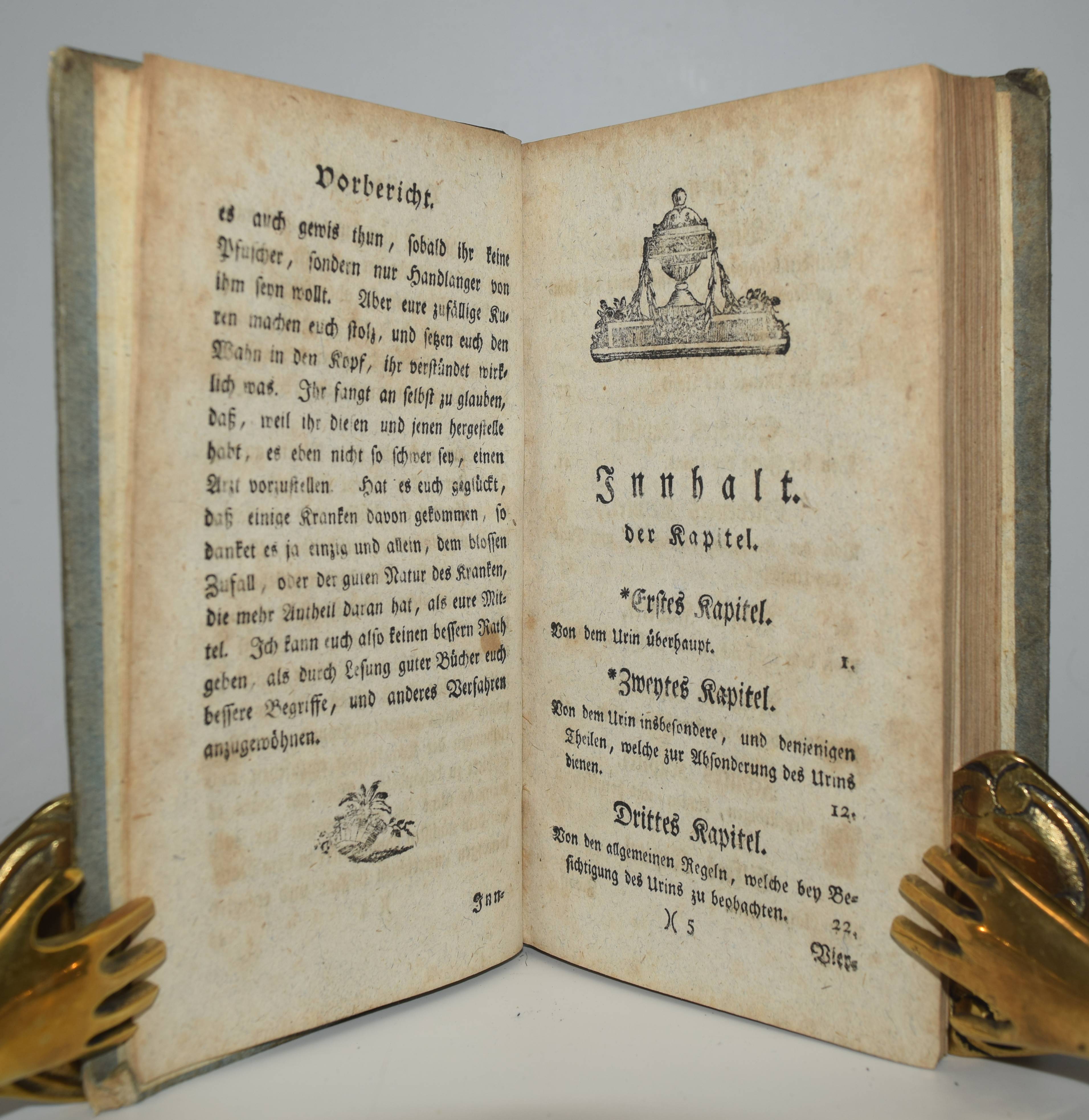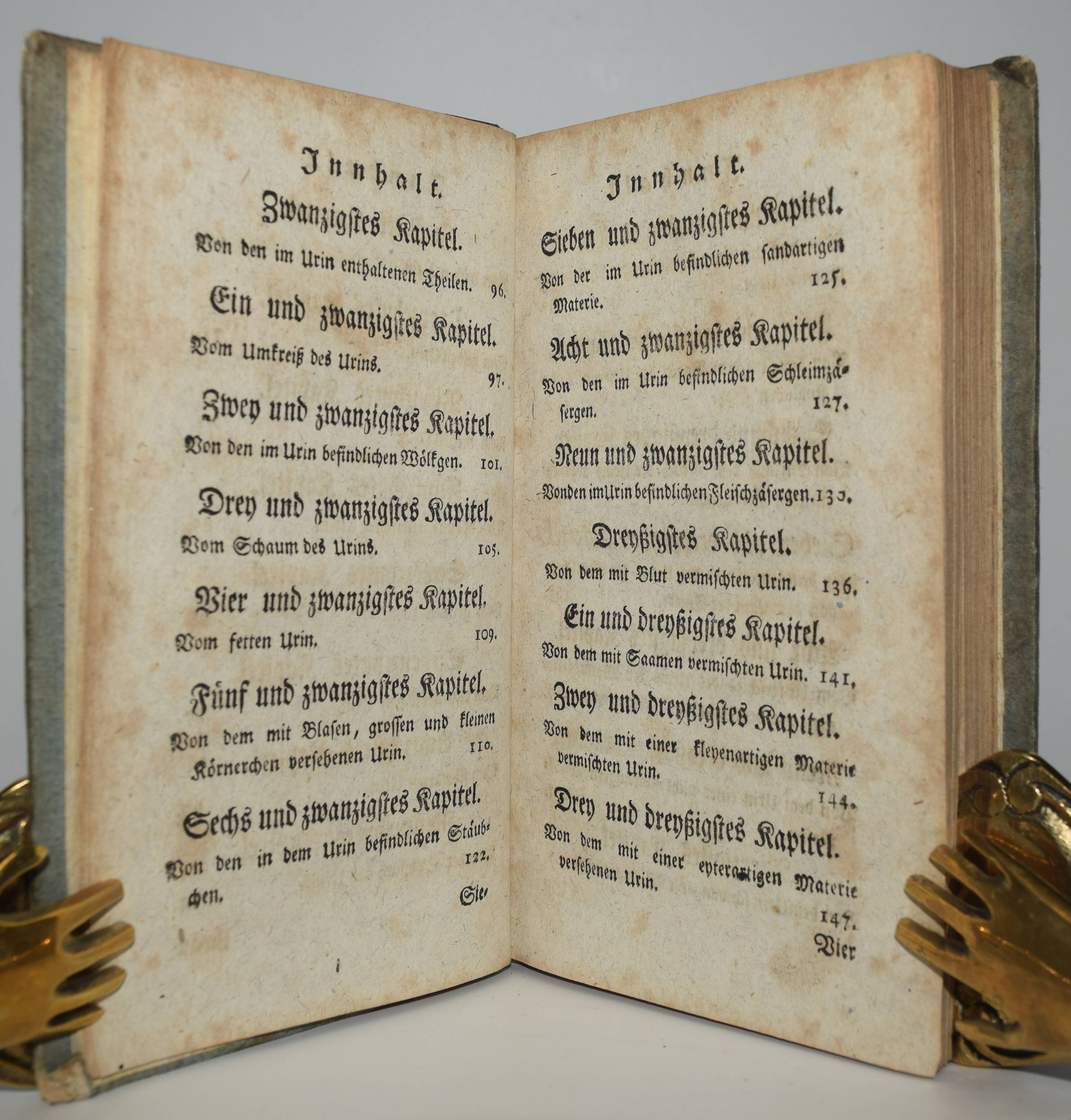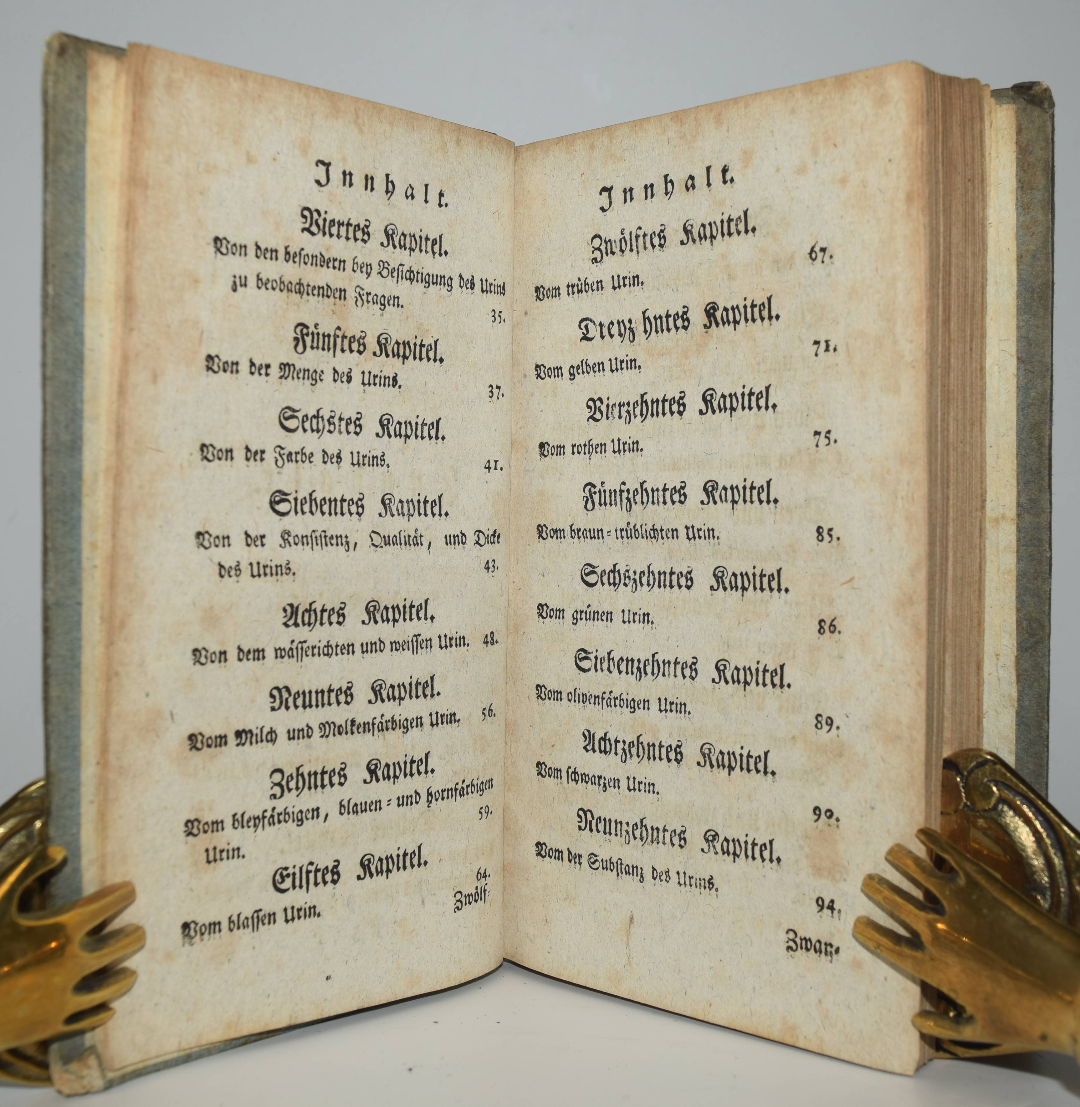 Kräutermann, D. Valentini (d. i. Christoph v. Hellwig). Lehre von den untrüglichen Kennzeichen des Urins, des Pulses, der Temperamenten und des Blutes. Mit Anmerkungen versehen, und durchgehends verbessert von Johann Gottfried Essich. Augsburg, Wolff 1788. 8°. [8] Bl., 280 S. Pbd. d. Zeit mit goldgepr. Rückensch. Hirsch/Hüb. III, 149. Wellcome II, 205. Nicht bei Engelmann, Lesky, Osler u. Waller. – Erste Ausgabe. – Der Thüringer Mediziner Christoph v. Hellwig (1633-1721) brachte zahlreiche medizinische Schriften heraus und gilt durch einen Aufsatz in der „Frauenzimmer-Apotheke“ im Jahre 1700 als Erfinder der Zahnbürste, indem er diese neue Methode der Zahnreinigung gegenüber bisher üblichen, wie dem Kauen von Sägespänen oder dem Putzen mit Lappen, hervorhebt. Unter dem Namen Valentin Kräutermann und anderen Pseudonymen veröffentlichte er über 240 Druckschriften, von denen viele noch nach seinem Leben aufgelegt wurden. – Einband etwas berieben, St. a. V., durchgehend etwas braunfleckig, gutes Exemplar.