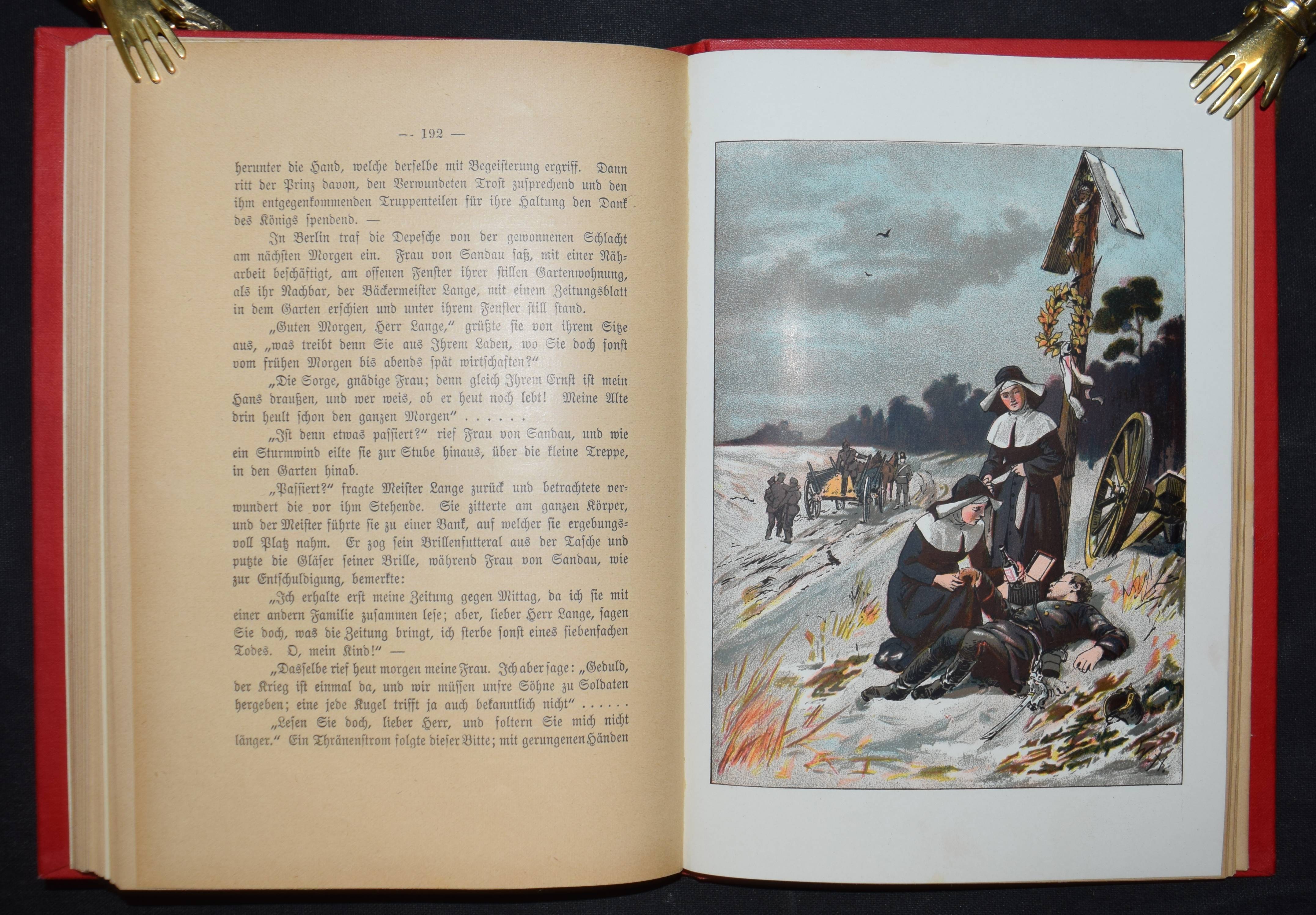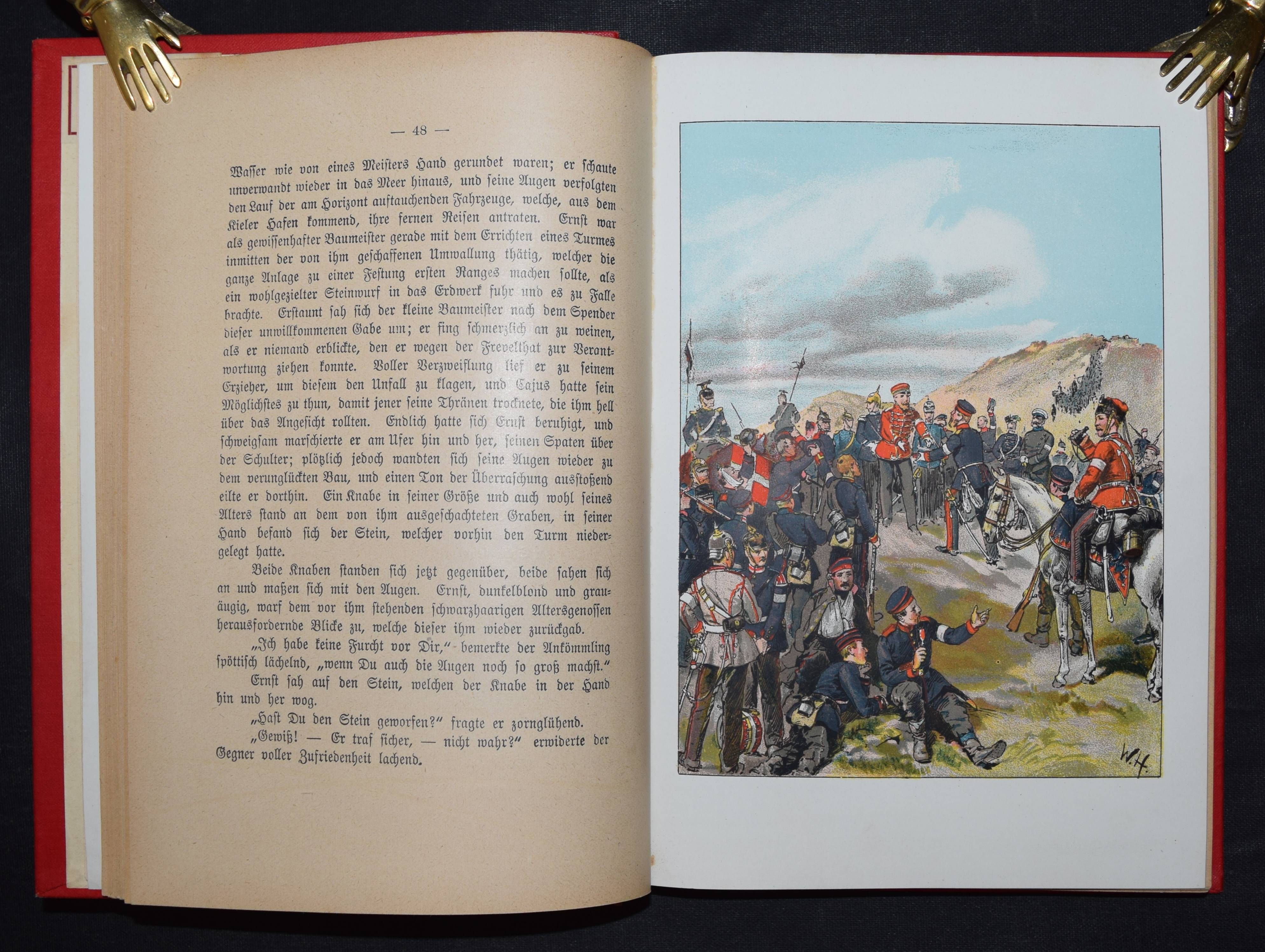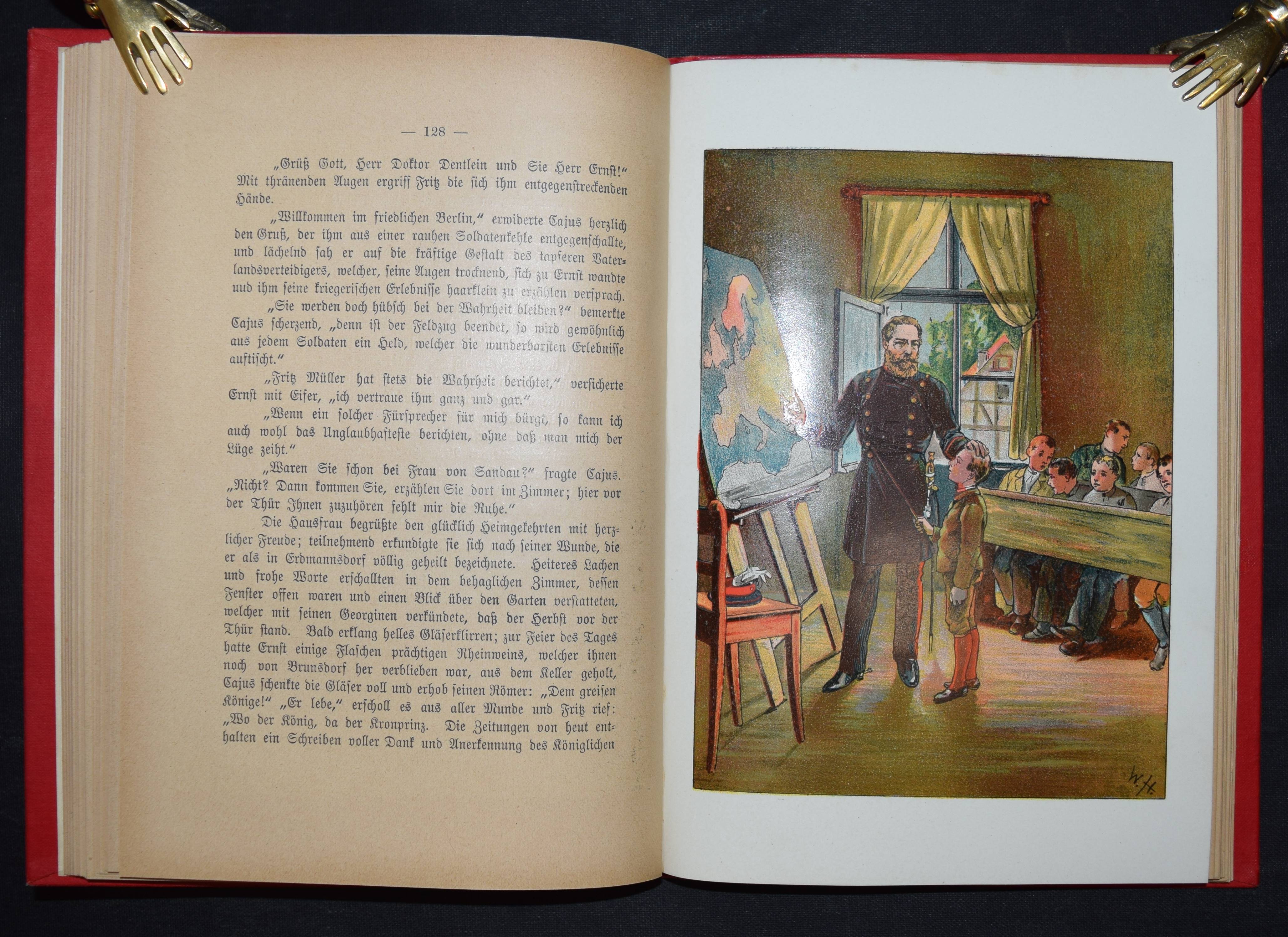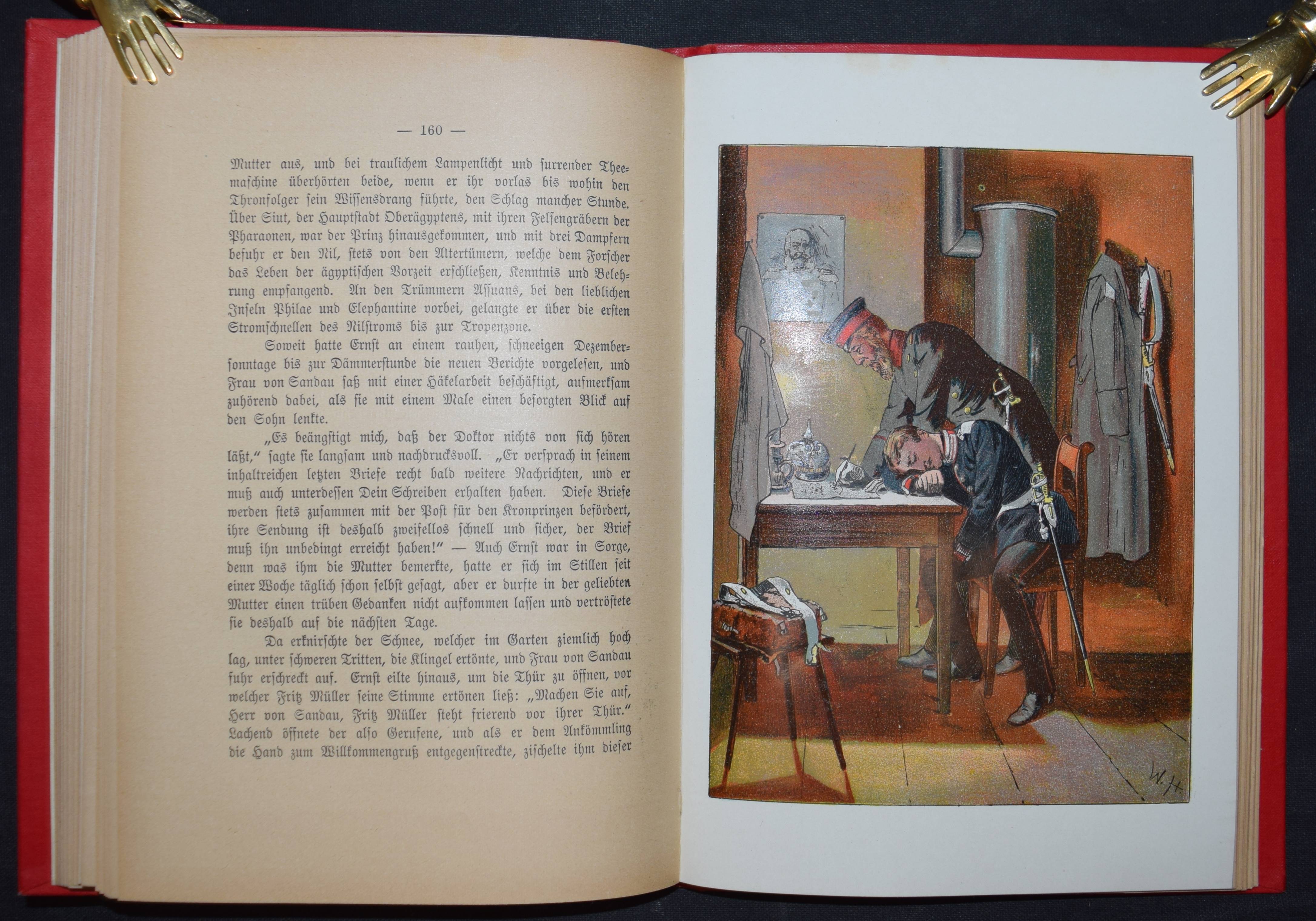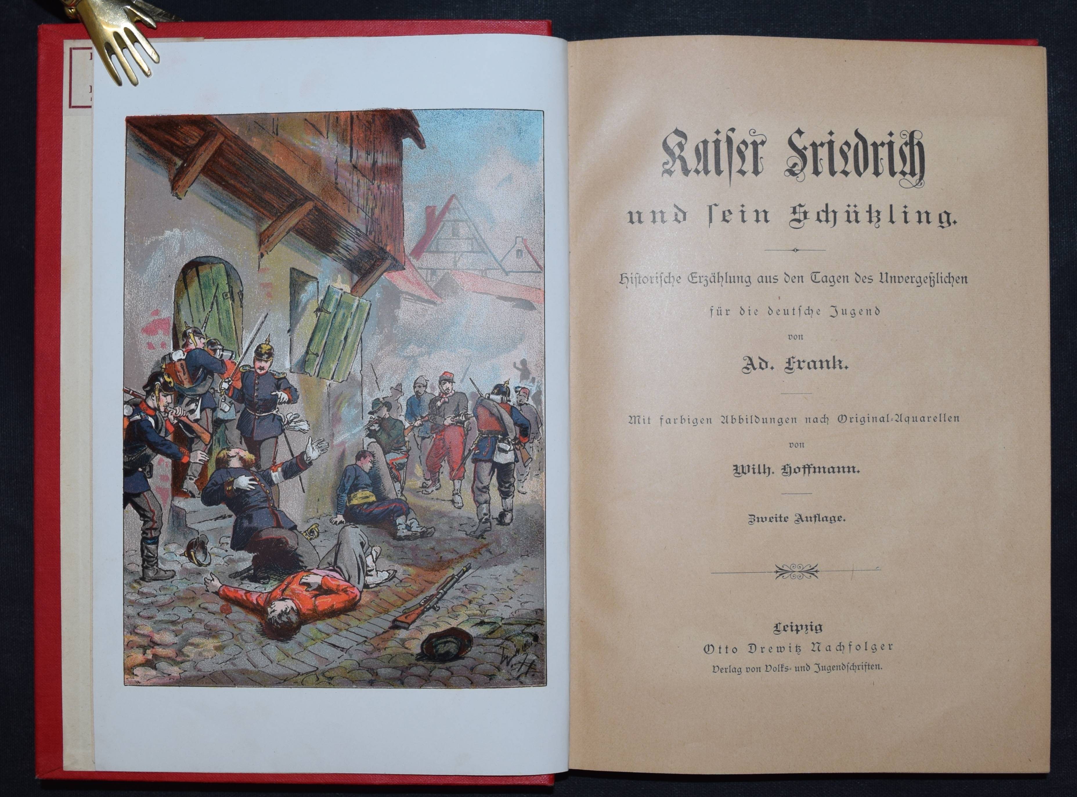 Frank, Ad(olf). Kaiser Friedrich und sein Schützling. Historische Erzählung aus den Tagen des Unvergesslichen für die deutsche Jugend. 2. Aufl.. Leipzig, Drewitz o. J. (um 1895). 8°. 243 S. mit 5 chromolithograph. Tafeln von Wilh(elm) Hoffmann. Farbig illustr. OLn. Vgl. Wegehaupt II, 918 (EA von 1893). – Sehr gutes Exemplar.