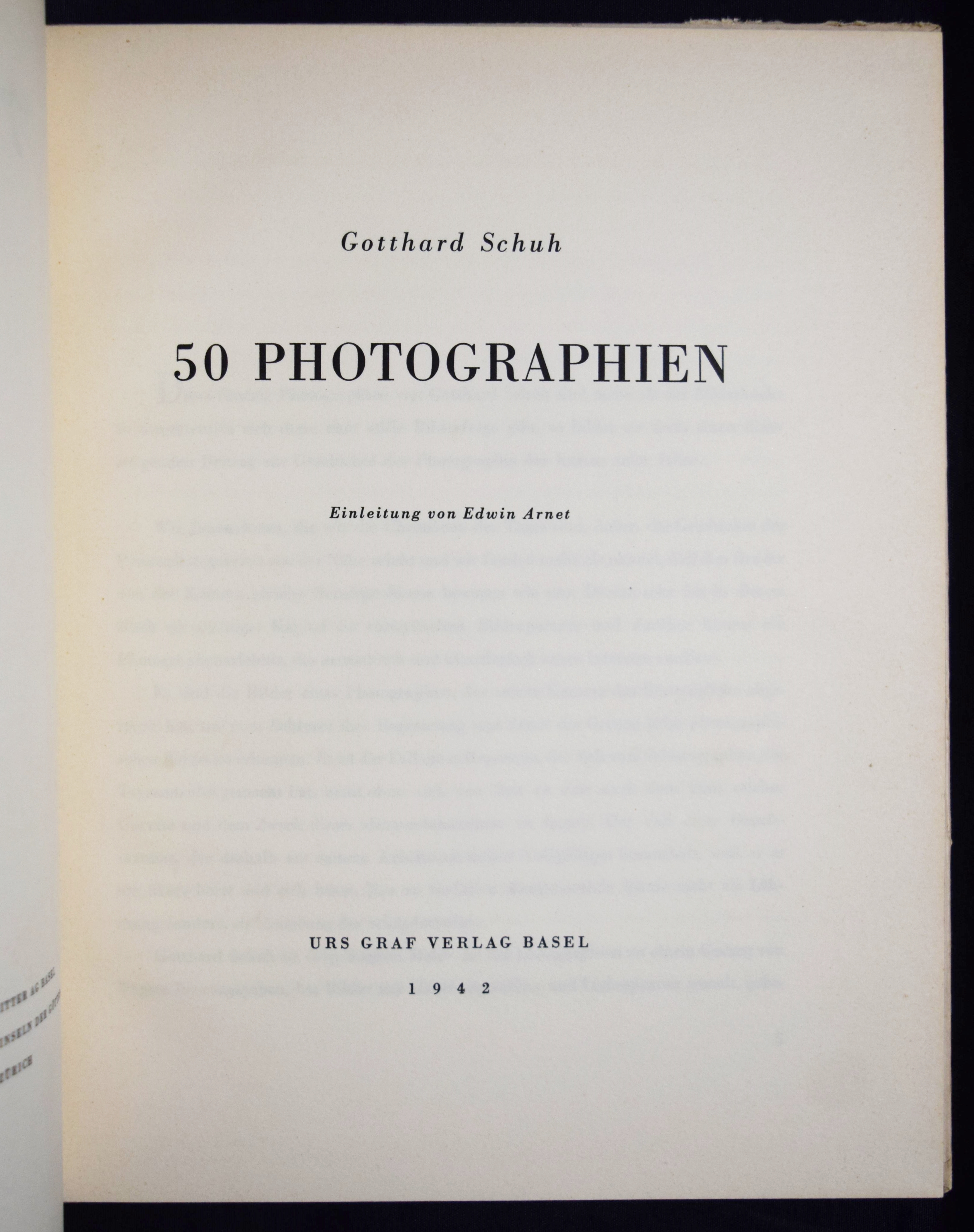 Schuh, Gotthard. 50 Photographien. Einleitung von Edwin Arnet. Basel, Urs Graf Verlag 1942. 4°. 64 S., [2] Bl. mit 50 Abb. auf Tafeln. OHln. Heidtmann 10750. Schweizer Fotobücher 122 ff. – Erste Ausgabe. – „Die Wahl und Zusammenstellung der Fotografien ergibt alles andere als „Best of…“, vielmehr entsteht ein Gesamtbild, das einerseits von wechselnden Stimmungen, intensiv gelebten Augenblicken, tief empfundener Schönheit, andererseits auch von Verletzlichkeit und Tristesse, von Angst und Melancholie geprägt ist. Diese poetischen Qualitäten sind es, die einen einflussreichen zeitgenössischen Rezensenten zu dem Schluss bringen es handle sich um das „ausserordentlichste Photobuch […], welches die Schweiz bis heute hervorgebracht hat“.“ (P. Pfrunder in Schweizer Photobücher). – Einband and den Rändern etwas gebräunt, sonst gutes sauberes Exemplar.