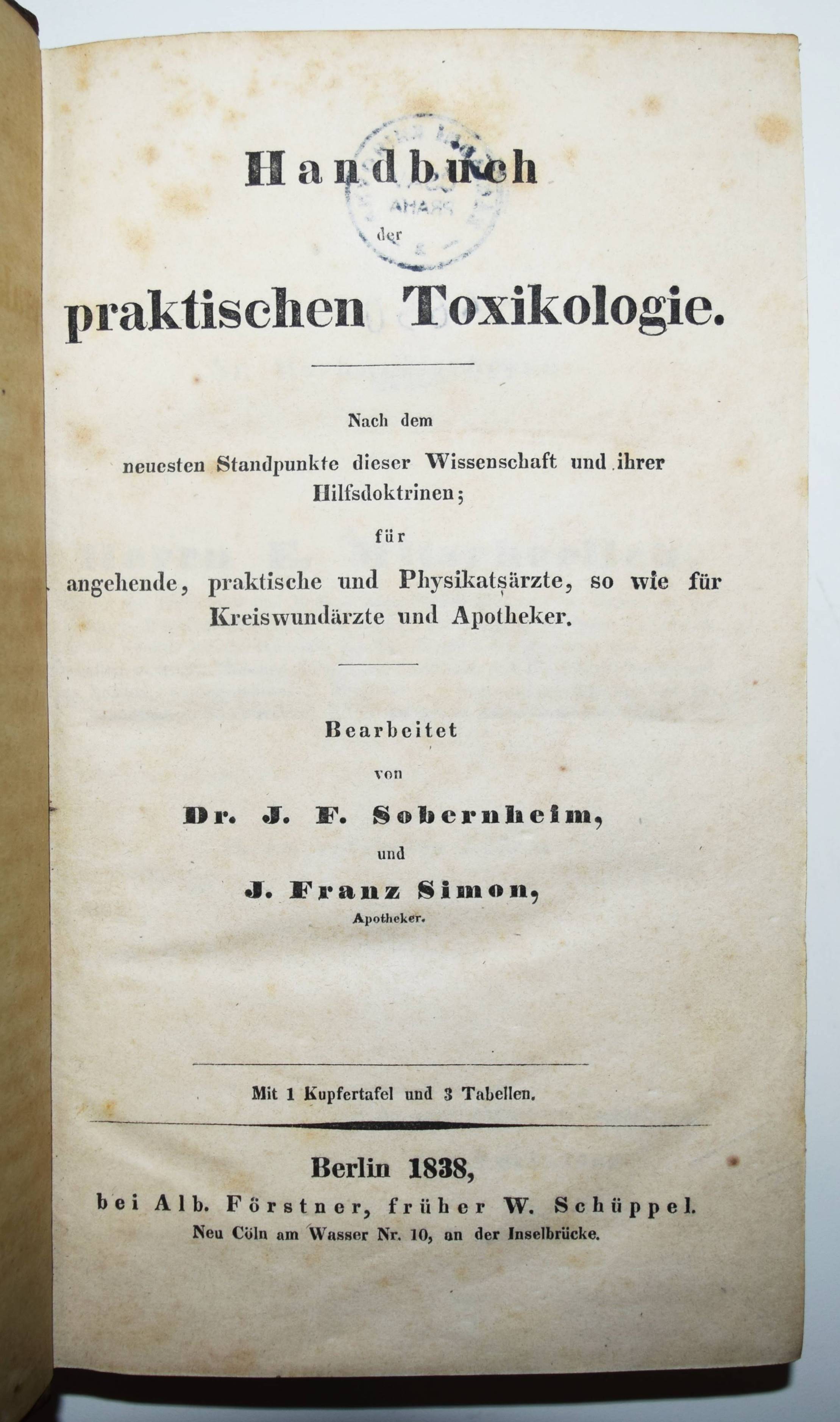 Sobernheim, J(oseph) F(riedrich) u. J. Franz Simon. Handbuch der praktischen Toxikologie. Nach dem neuesten Standpunkte dieser Wissenschaft und ihrer Hilfsdoktrinen; für angehende, praktische und Physikatsärzte, so wie für Kreiswundärzte und Apotheker. Berlin, bei Alb. Förstner, früher W. Schüppel 1838. 8°. XVIII, 734 S. mit 1 gefalt. Kupfertafel u. 3 gefalt. Tabellen. Hldr. d. Zeit mit goldgepr. Rückensch. u. Rückenverg. Erste Ausgabe. – Rückenverg. etwas abgerieben, Exlibris, stellenw. teils stärker braunfl., gutes Exemplar.