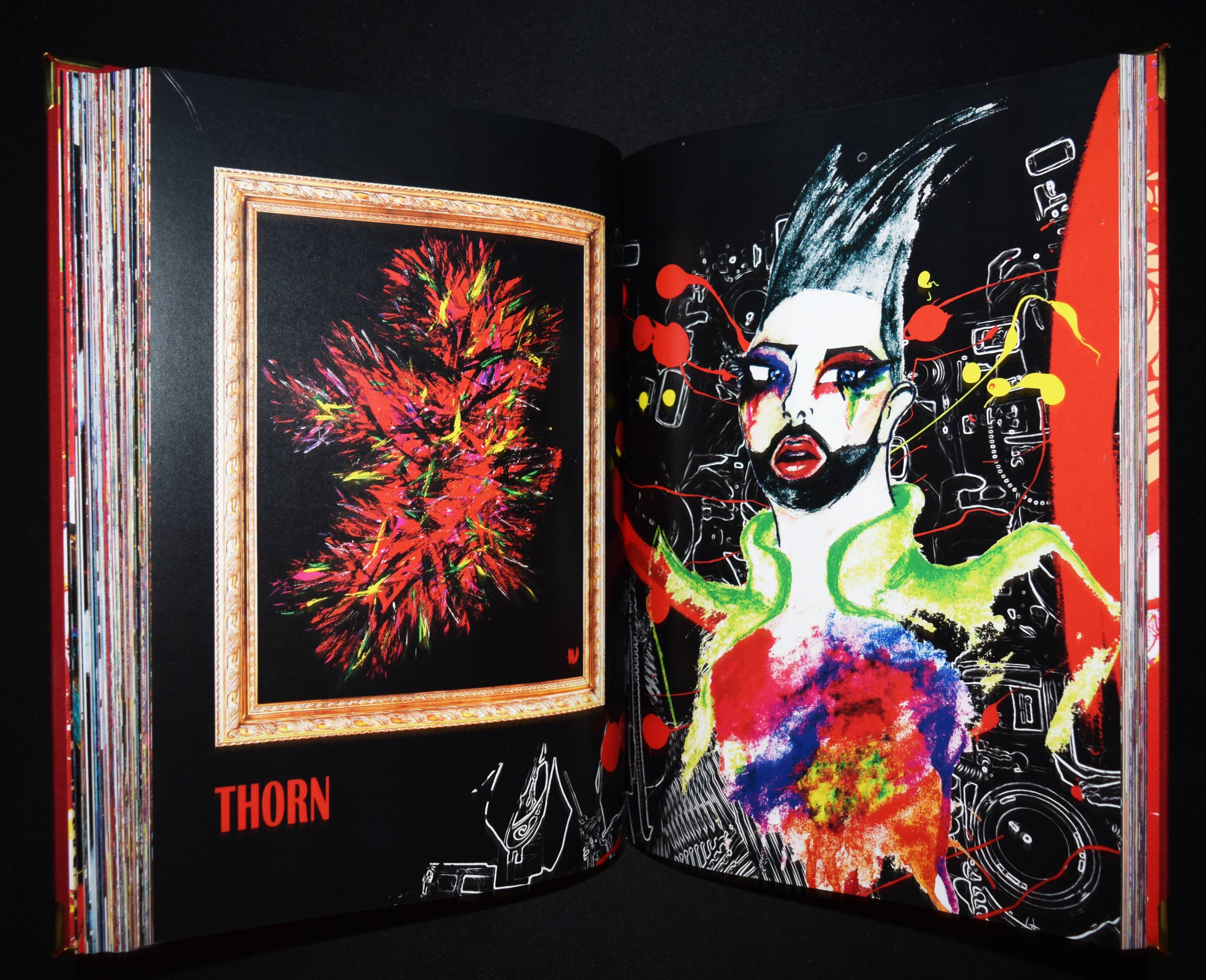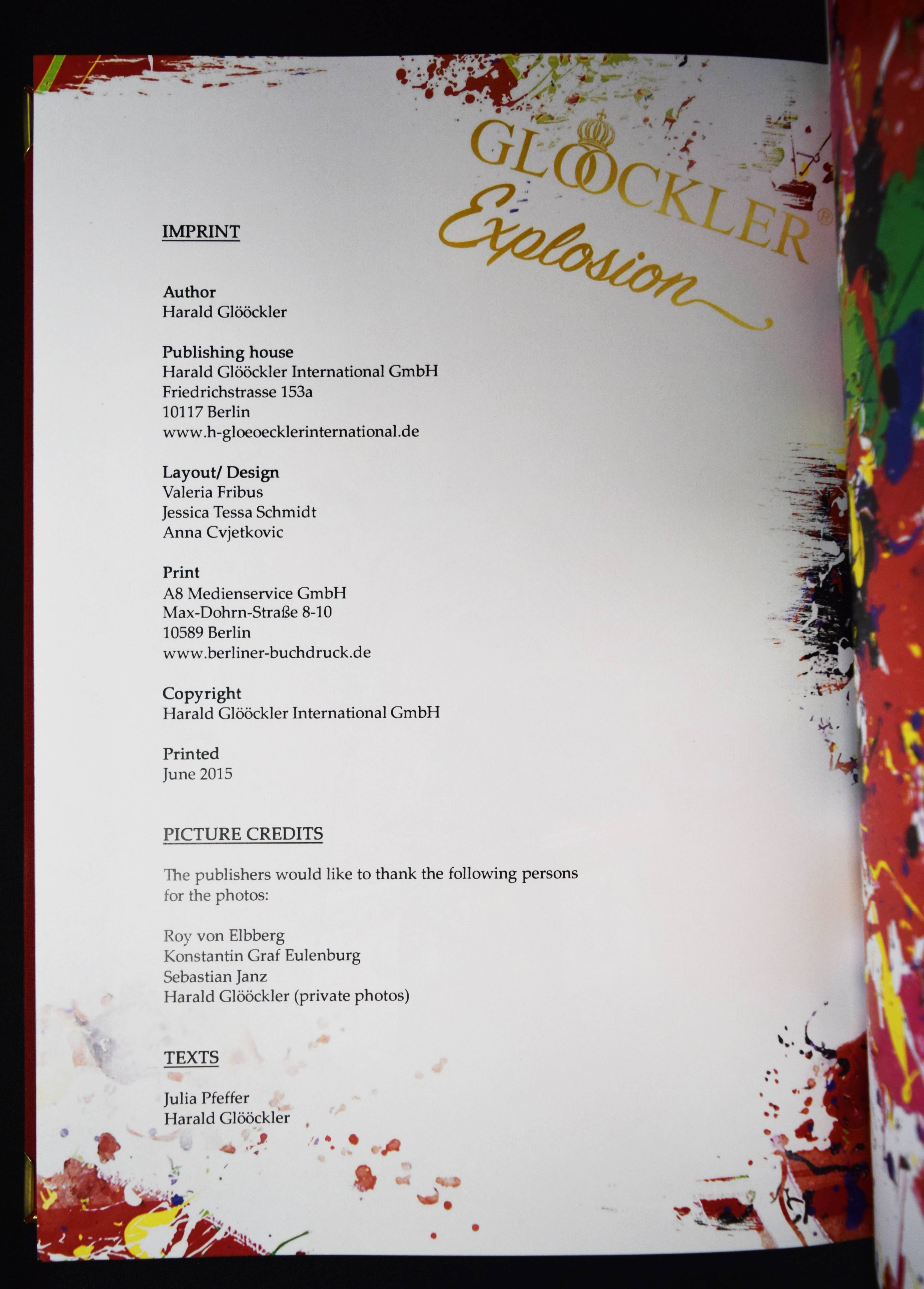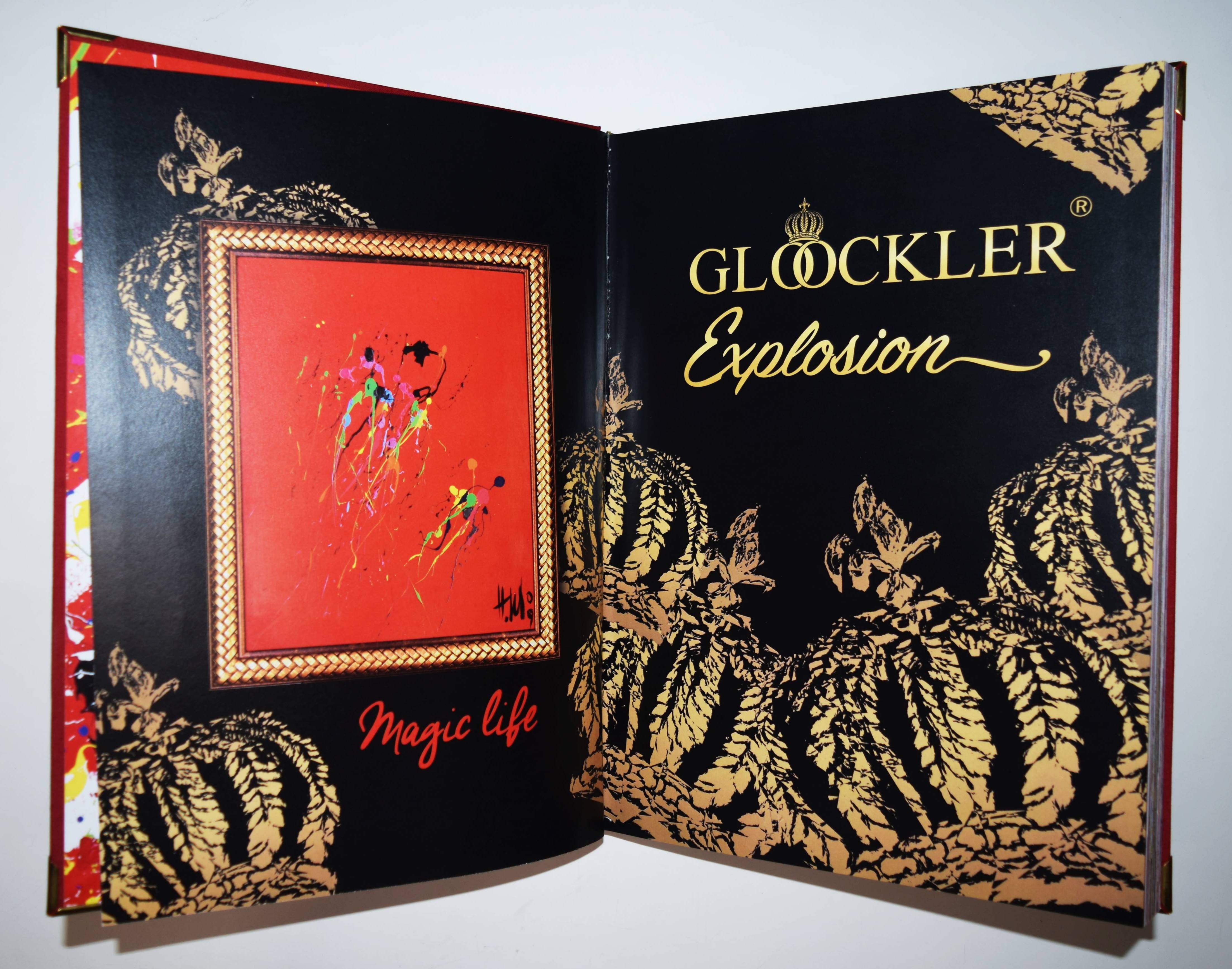 Glööckler, Harald. Explosion. Berlin, Selbstverlag 2015. Gr.-4° (33 x 24 cm). Ca. [280] unbez. S. mit farb. Abb nach Photographien von Roy v. Elbberg, Konstantin Graf Eulenberg, Frank Altmann, Sebstian Janz u. H. Glööckler. Roter Orig.-Ln. mit goldgepr. Deckeltitel u. Deckelvignette sowie Messing-Beschlägen an den Ecken in farbig illustr. Orig.-Pappschuber. Erste Ausgabe der seltenen Luxusedition. – Mit Beiträgen von Julia Pfeiffer „Kunstbericht über die Meisterwerke“ und Helge Joachim Bathelt „Laudatio auf die Meisterwerke“. – Tadellos.