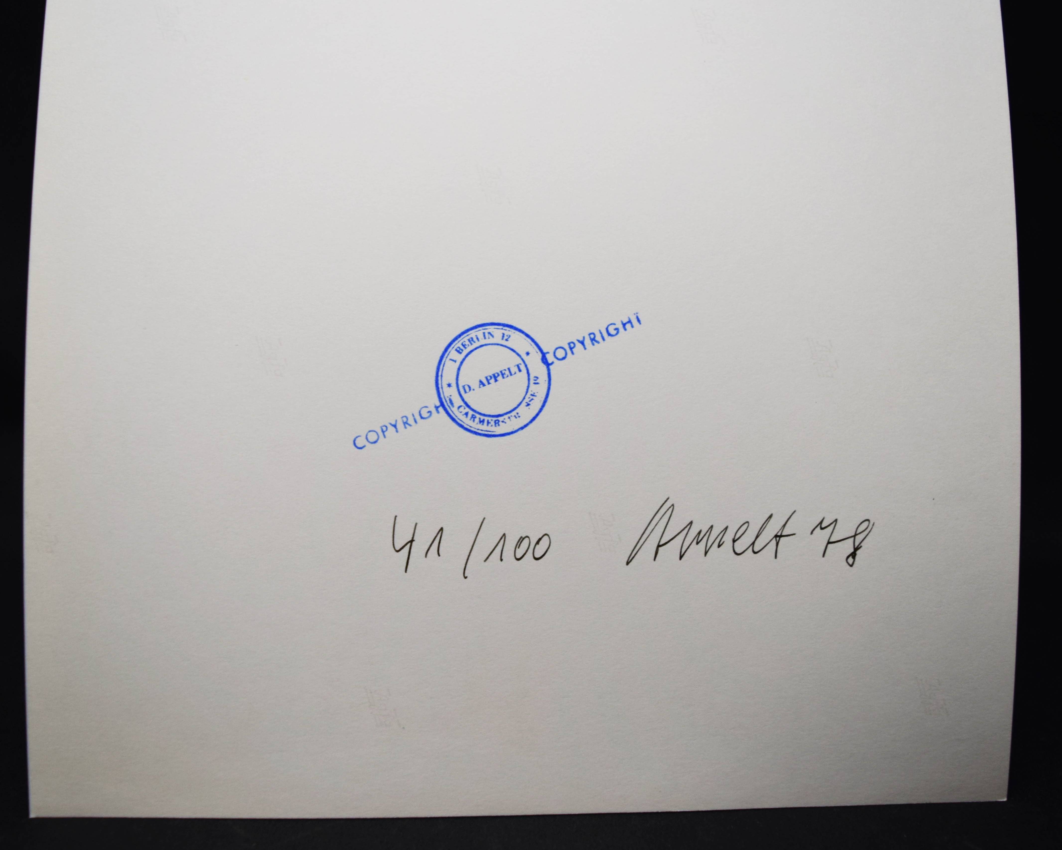 Appelt, Dieter. Erinnerungsspur – Statische Vibration. Berlin, Nicolai 1979. Quer-4°. 50 S. mit 36 Tafeln u. 1 signierten Orig.-Photographie (Silbergelatine, 30,5 x 24 cm.). Illustr. OKart. Auer 621. – Eines von 100 nummerierten und von Appelt signierten Exemplaren der Vorzugsausgabe mit der lose beiligenden Orig.-Photographie (abbgebildet auf S. 13), ebenfalls signiert (Gesamtauflage: 1100). – Mit Aufnahmen aus den Jahren 1977 bis 1979 und Texten von Günther Gercken und Eberhard Roters. – Der Photo-, Film-, Objekt- und Aktionskünstler D. Appelt (geb. 1935 in Niemegk/Brandenburg) wurde 1999 mit der David-Octavius-Hill Medaille der Deutschen Fotografischen Gesellschaft und 2005 mit dem Knight Purchase Prize for Photographic Media des Akron Art Museum, Ohio, USA ausgezeichnet. – Tadellos.