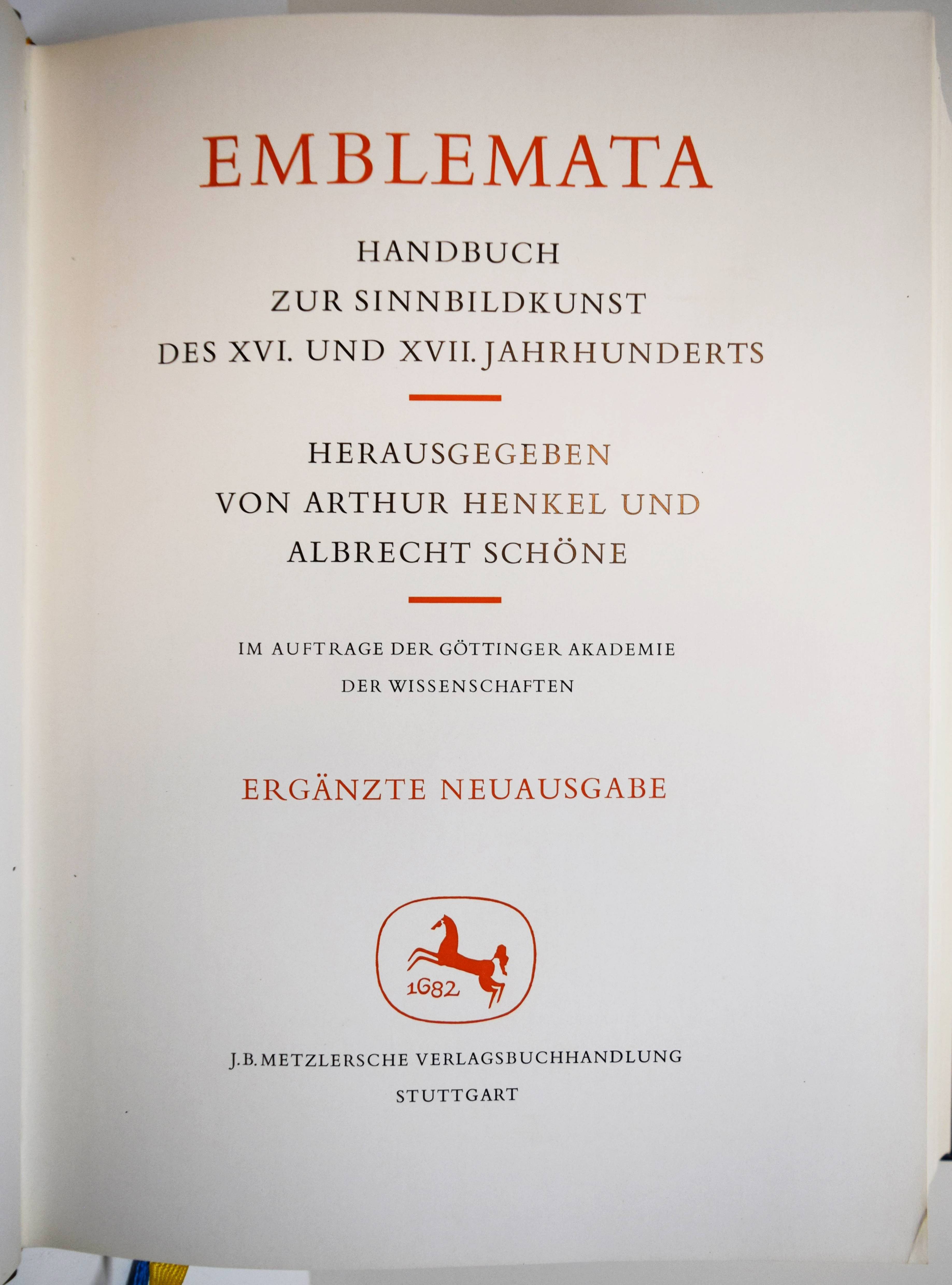 Henkel, Arthur u. Albrecht Schöne (Hg.). Emblemata. Handbuch zur Sinnbildkunst des XVI. und XVII. Jahrhunderts. Ergänzte Neuausgabe. Stuttgart, Metzler 1976. Gr.-4°. CCXVII S., 2196 Sp. mit zahlr. Abb. Orig.-Halblederband mit goldgepr. Rückentitel. Vorsätze mit einigen privaten Eintragungen, gutes Exemplar der schönen Halbleder-Ausgabe.