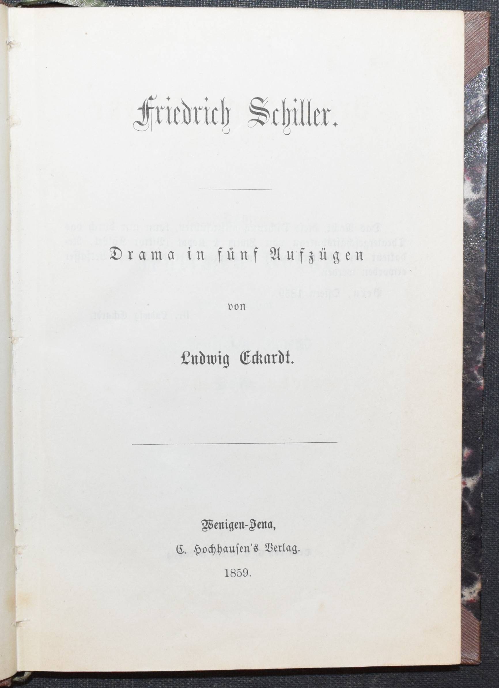 Eckardt, Ludwig. Friedrich Schiller. Drama in fünf Aufzügen. Wenigen-Jena, Hochhausen 1859. Klein 8°. 182 S. Hln. d. Zt. (Dramatische Werke, II. Band). Erste Ausgabe. – Gutes Exemplar.