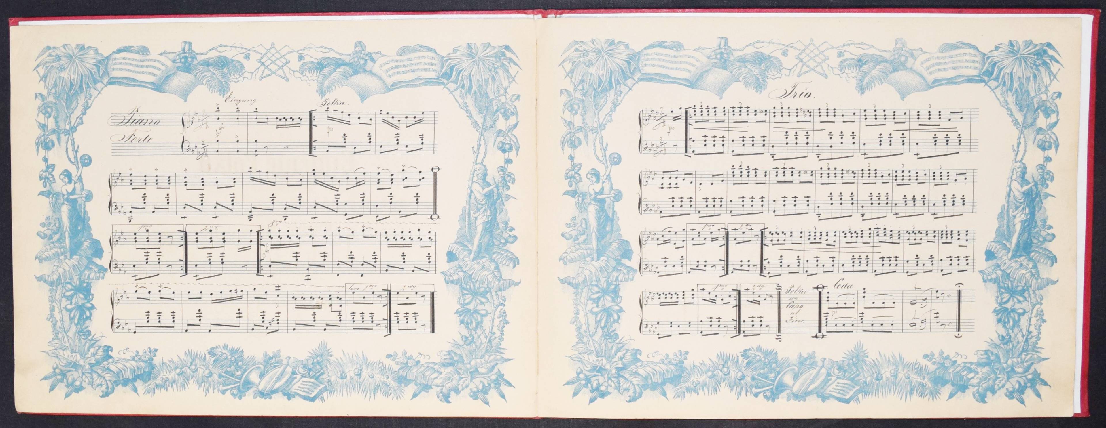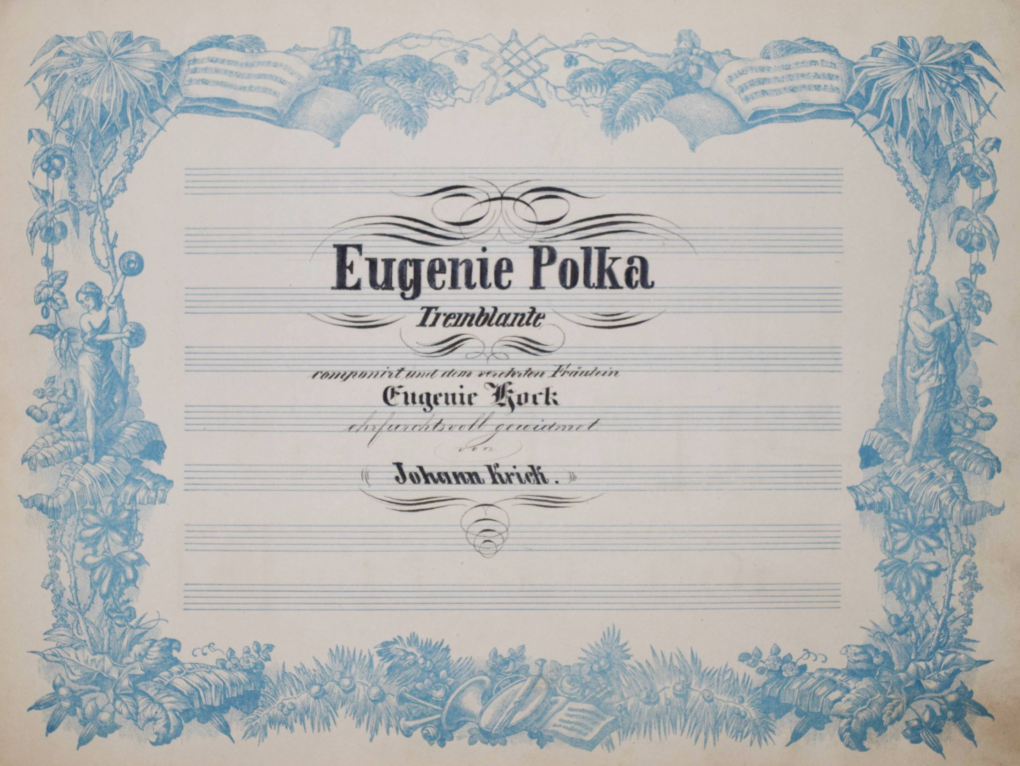 Krick, Johann. Eugenie Polka. Tremblante componirt und dem verehrten Fräulein Eugenie Kock ehrfurchtsvoll gewidmet. Deutsche Handschrift auf Papier. Wien ? um 1840. Quer-Gr.-8°. 2 Bl. schwarze Tinte auf lithogr. Notenpapier, jede Seite mit illustr. lithogr. Schmuckrahmen in Blau. Weinroter Ln. d. Zt. mit goldgepr. Deckeltitel u. Ornamentrahmen, Seidenmoiréevorsätze. Sorgfältig ausgeführte Gelegenheits-Komposition. – Bei Johann Krick handelt es sich eventuell um einen Wiener Textil-Fabrikanten. – Sehr gut erhalten.