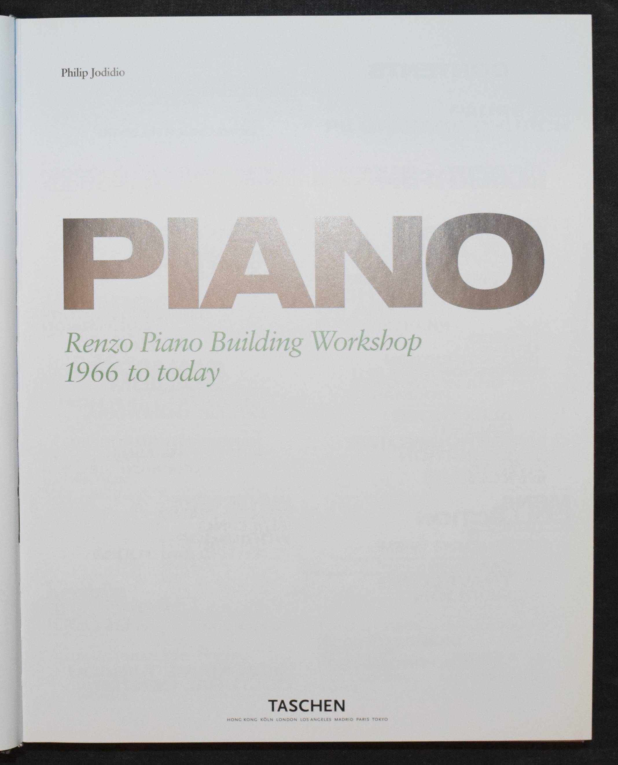 Jodidio, Philip / Jodidio, Philip (Herausgeber). Piano. Renzo Piano Building Workshop 1966 to Today. 1., Aufl.. Köln, u.a., TASCHEN 2008-10-15. 4°. 528 S. mit zahlr. farb. Abb. OPbd. mit OU. (RL). Neuwertiges Exemplar.
