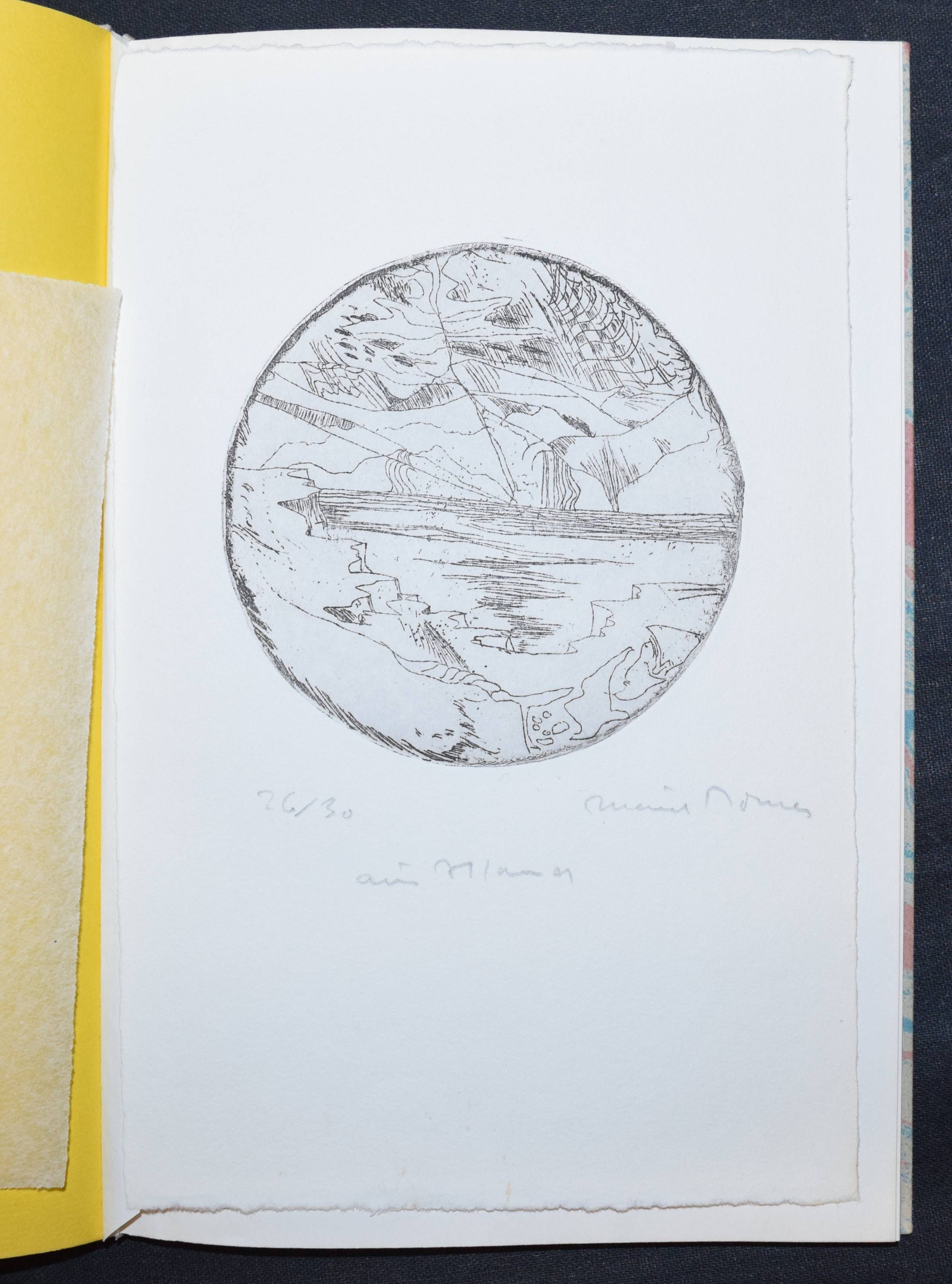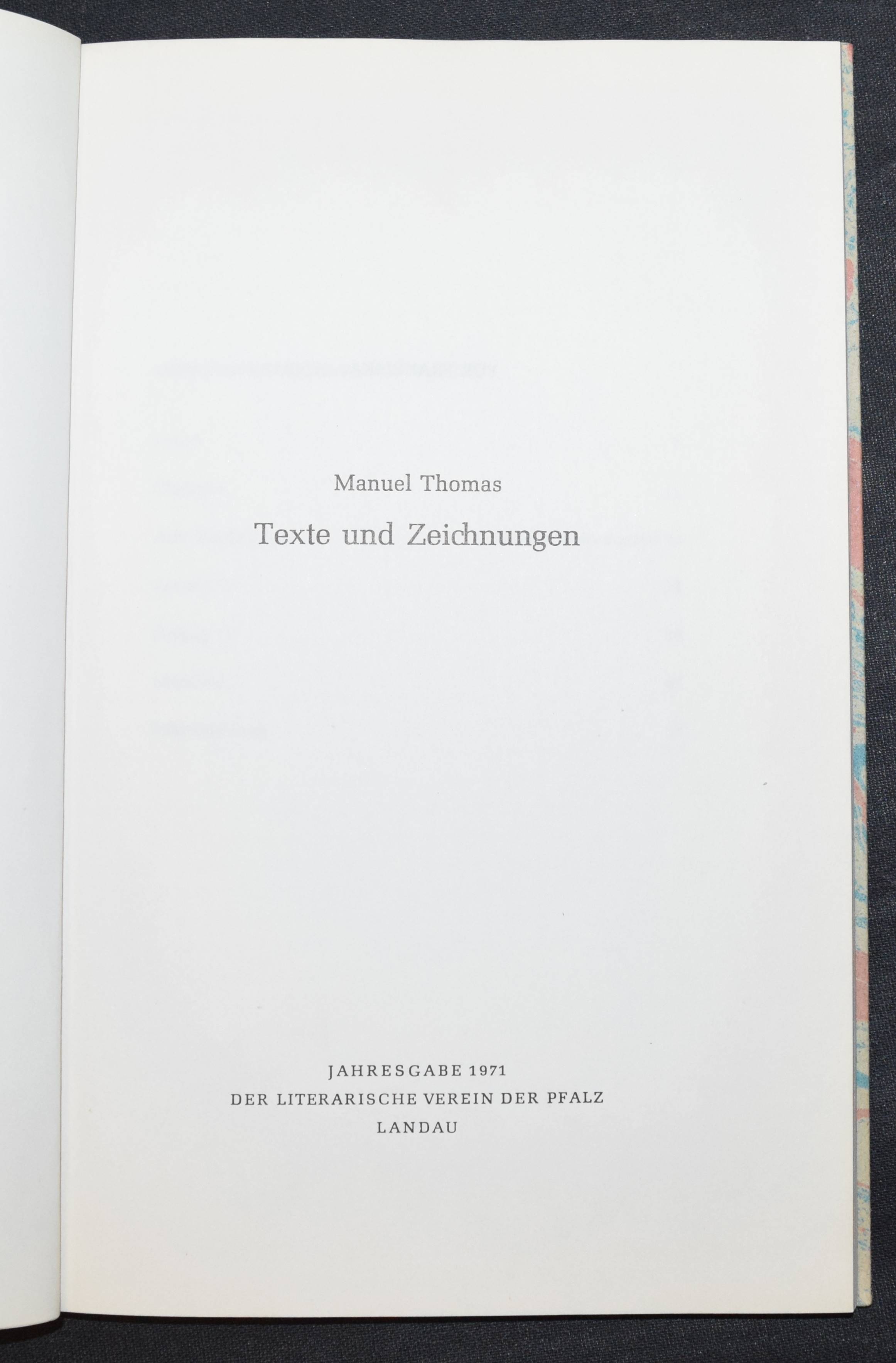 Thomas, Manuel. Texte und Zeichnungen. Landau, Literarischer Verein der Pfalz 1971. Gr.-8°. 63 S. mit Illustrationen des Verfassers u. 1 sign. u. num. Originalradierung. OPbd. (Jahresgabe / Literarischer Verein der Pfalz Nr. 26/30, 1971). Eines von 30 num. u. siginierten Exemplaren. – Mit eigenhändiger Widmung von Manuel Thomas und einer handschriftlich nummerierten und signierten Originalradierung. – Sehr gutes Exemplar.