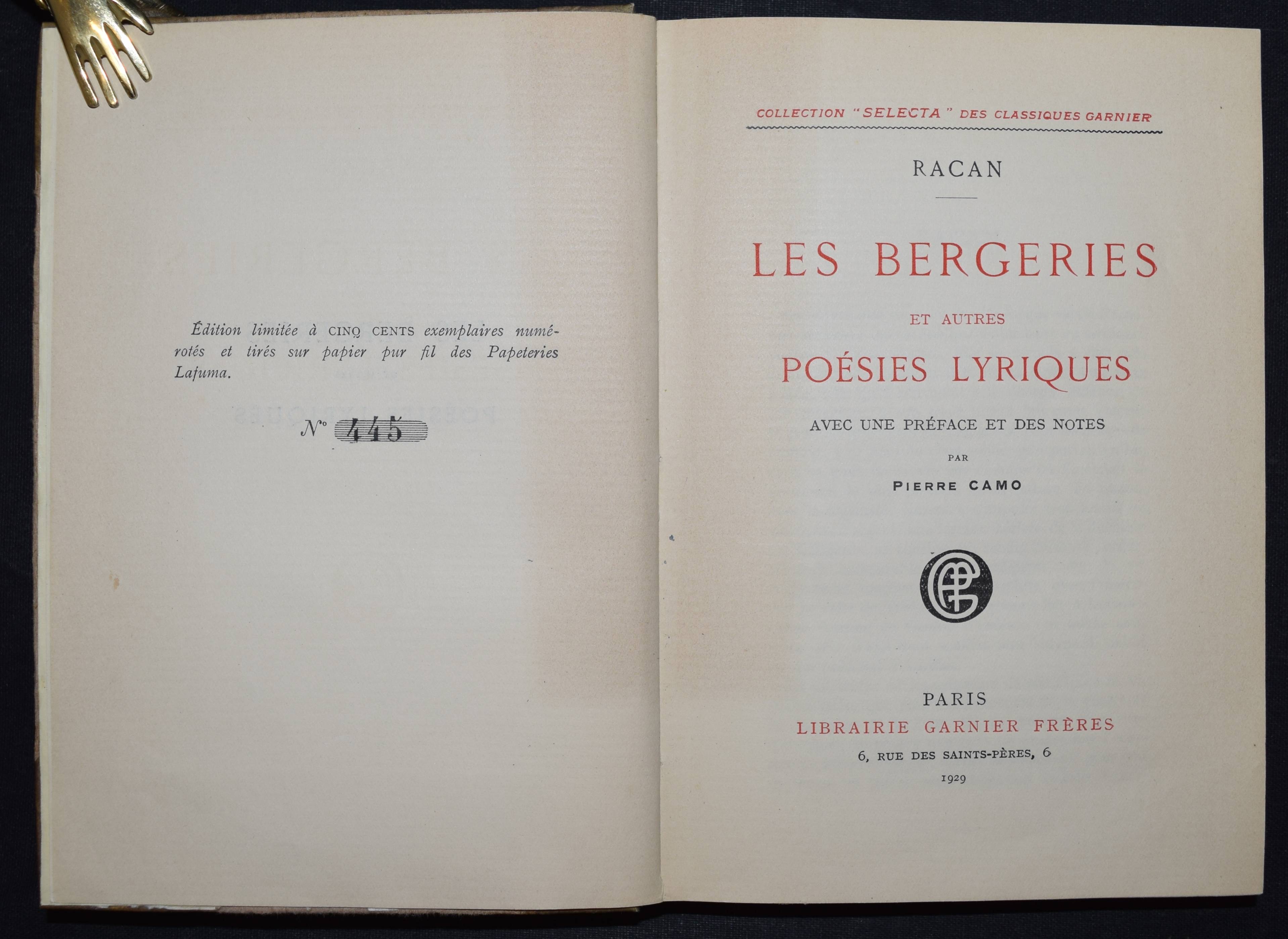 Racan, (Honorat de Bueil). Les bergeries et autres poésies lyriques. Avec une préface et des notes par Pierre Camo. Paris, Garnier frères 1929. 8°. XXIX, [1] p., 2 l., [3]-257 p., 1 l. Hprgt. d. Zt. (Collection „Selecta“ des Classiques Garnier). „Édition limtée à cinq cents exemplaires numérotés et tirés sur papier pur fil des Papeteries Lafuma.“ – Bon état.