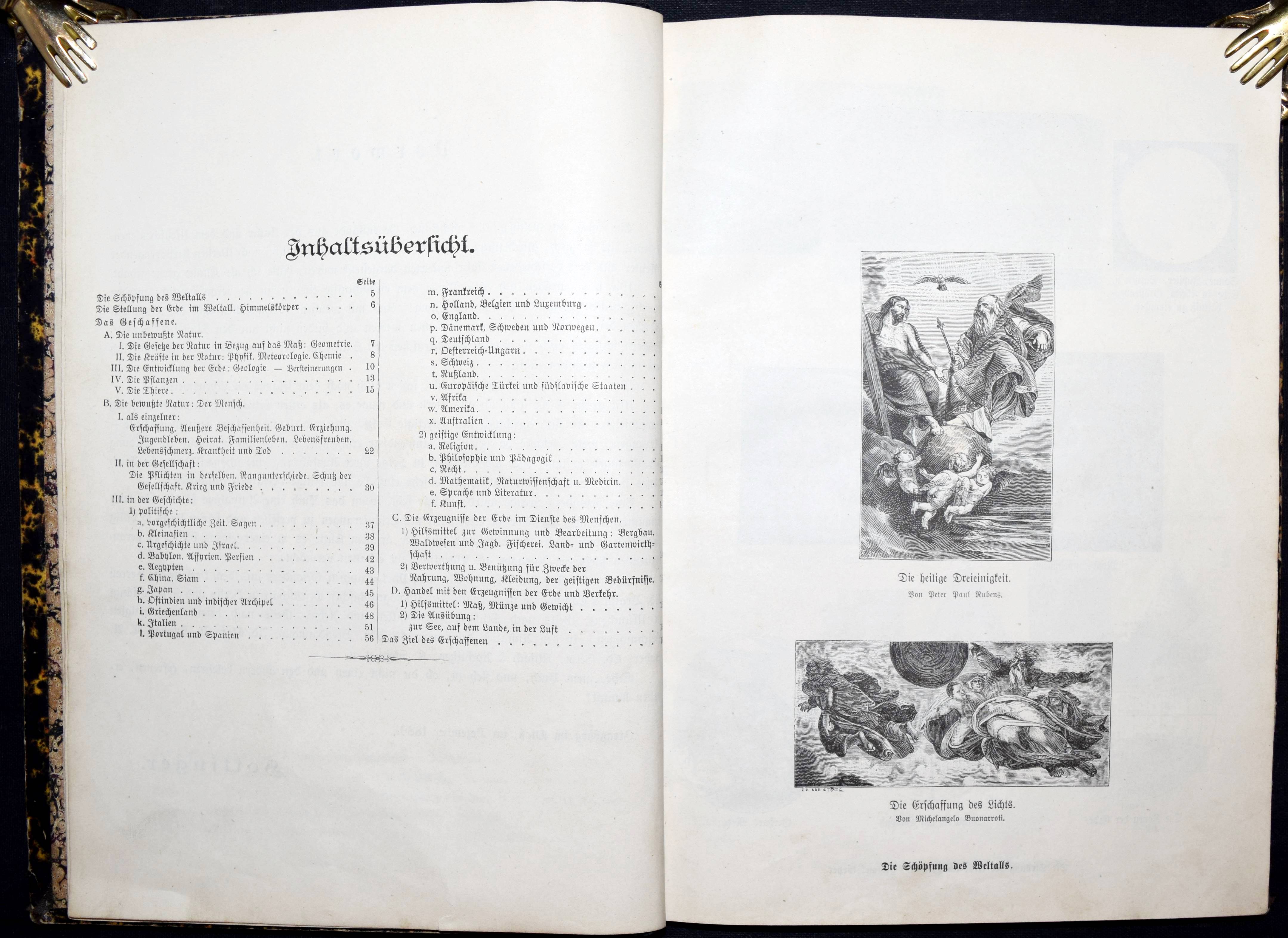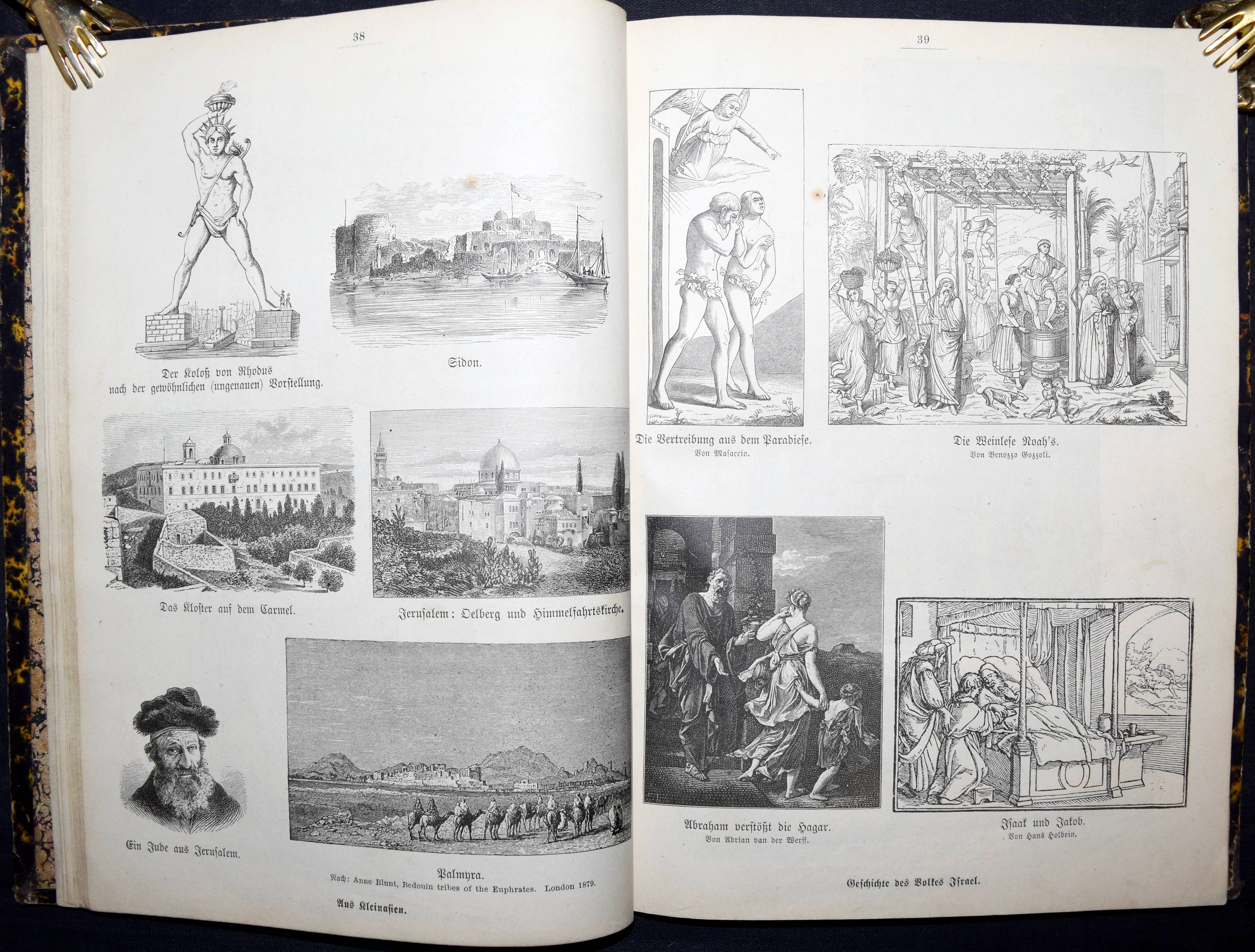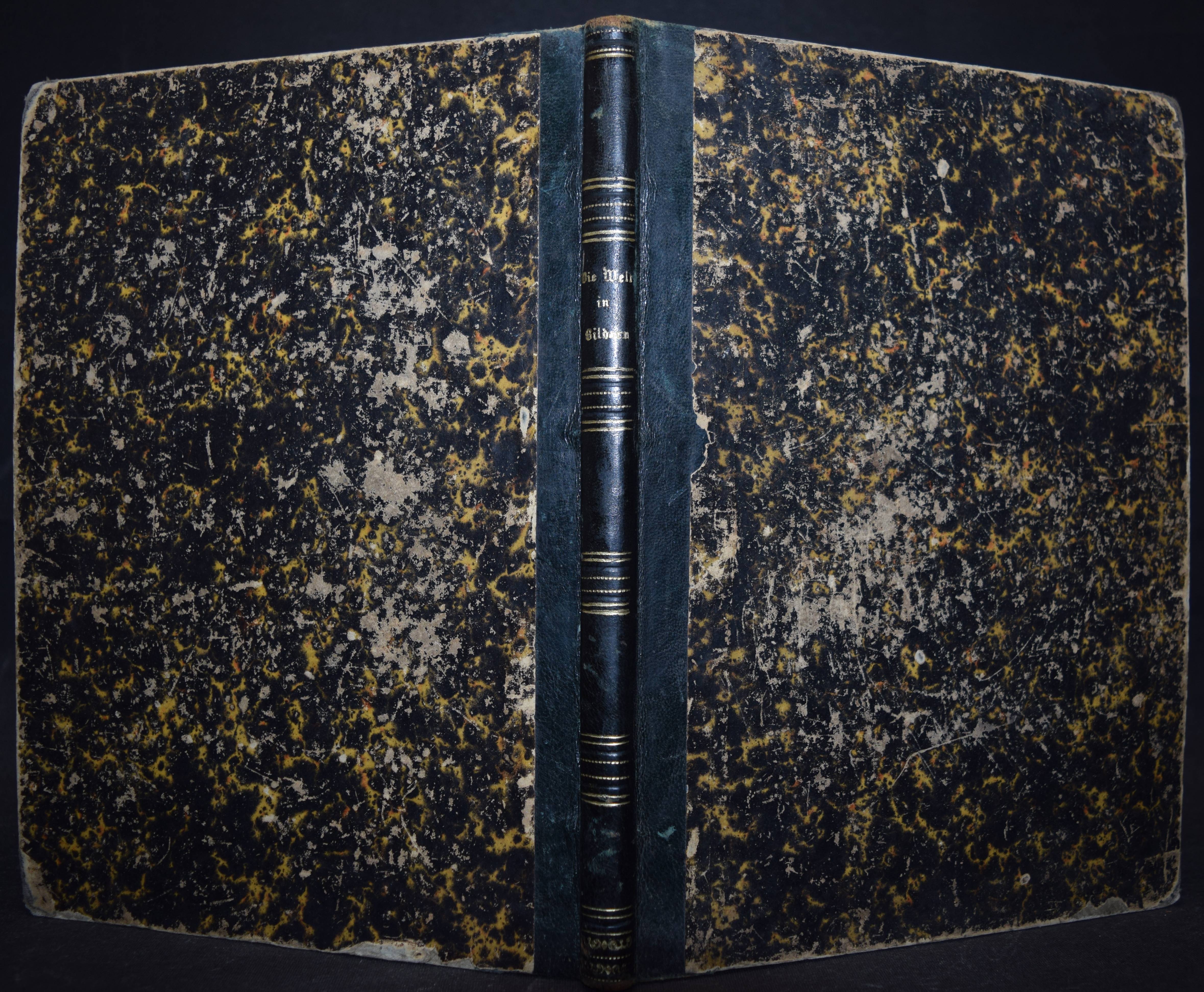 Orbis pictus – Hottinger, Chr(istlieb) G(otthold) (Hrsg.). Die Welt in Bildern. (Orbis pictus). Für Schul- und Unterrichtszwecke. Berlin u. Straßburg, Selbstverlag 1881. 4°. 200 S. mit zahlr. Holzschnitten. Hldr. d. Zt. mit goldgepr. Rückentitel u. Linienverg. Doderer-Müller 413 (gibt 160 S. an). Klotz 2930/2. LKJ II, 615. Pilz S. 387. Seebaß II, 1420 (″Sehr reichhaltig“). Wegehaupt II, 1654. – Erste Ausgabe. – „154 Seiten mit neugefertigten Holzschnitten „nach Werken hervorragender Meister aus den verschiedenen Jahrhunderten.“ – Die „wichtigsten Gegenstände aus der Natur und dem Menschenleben“ werden durch kurz erläuterte Bilder in systematischer Anordnung dargestellt. Dazu 20 Seiten Erläuterungen zur Welt in Bildern in lexikalischer Form“ (H. Wegehaupt). – Mit Ansichten aus aller Welt, ferner Porträts von Philosophen, Gelehrten, Dichtern, Staatsmännern, Musikern und Künstlern. Außerdem mit Darstellungen von Gebäuden, Denkmälern, Maschinen u.a. – Deckel u. Kanten etwas berieben, geringf. fingerfl., gutes Exemplar.