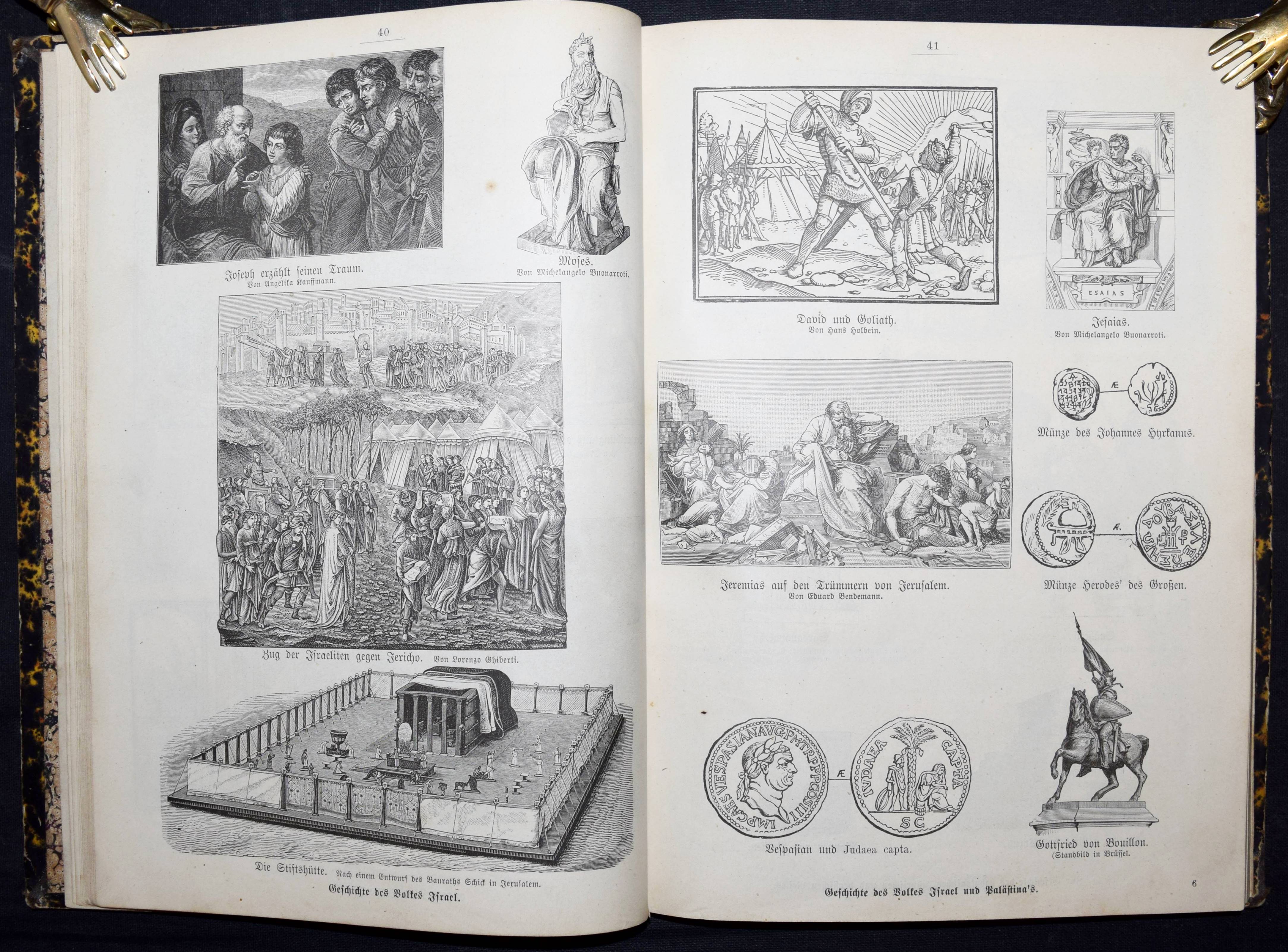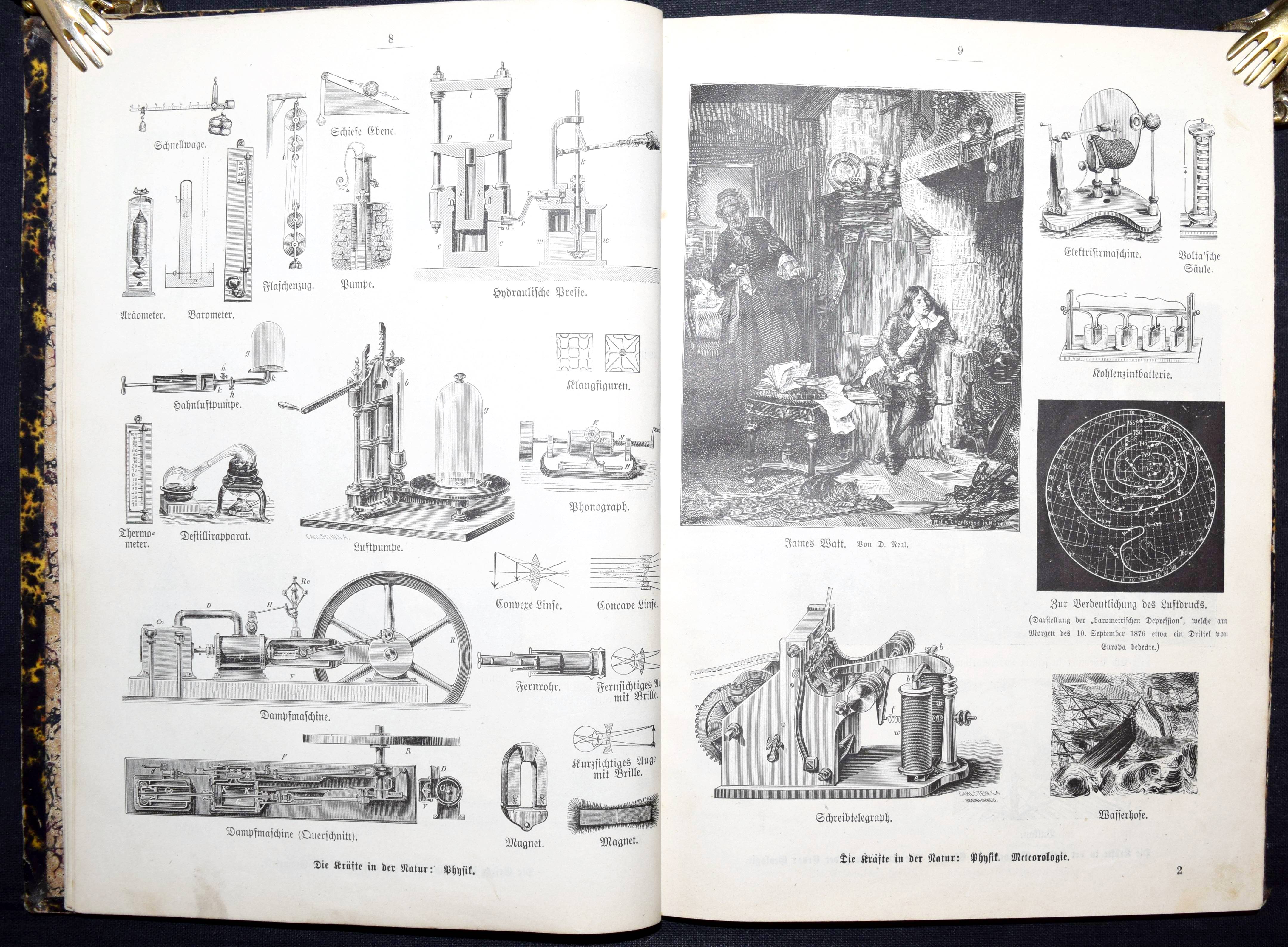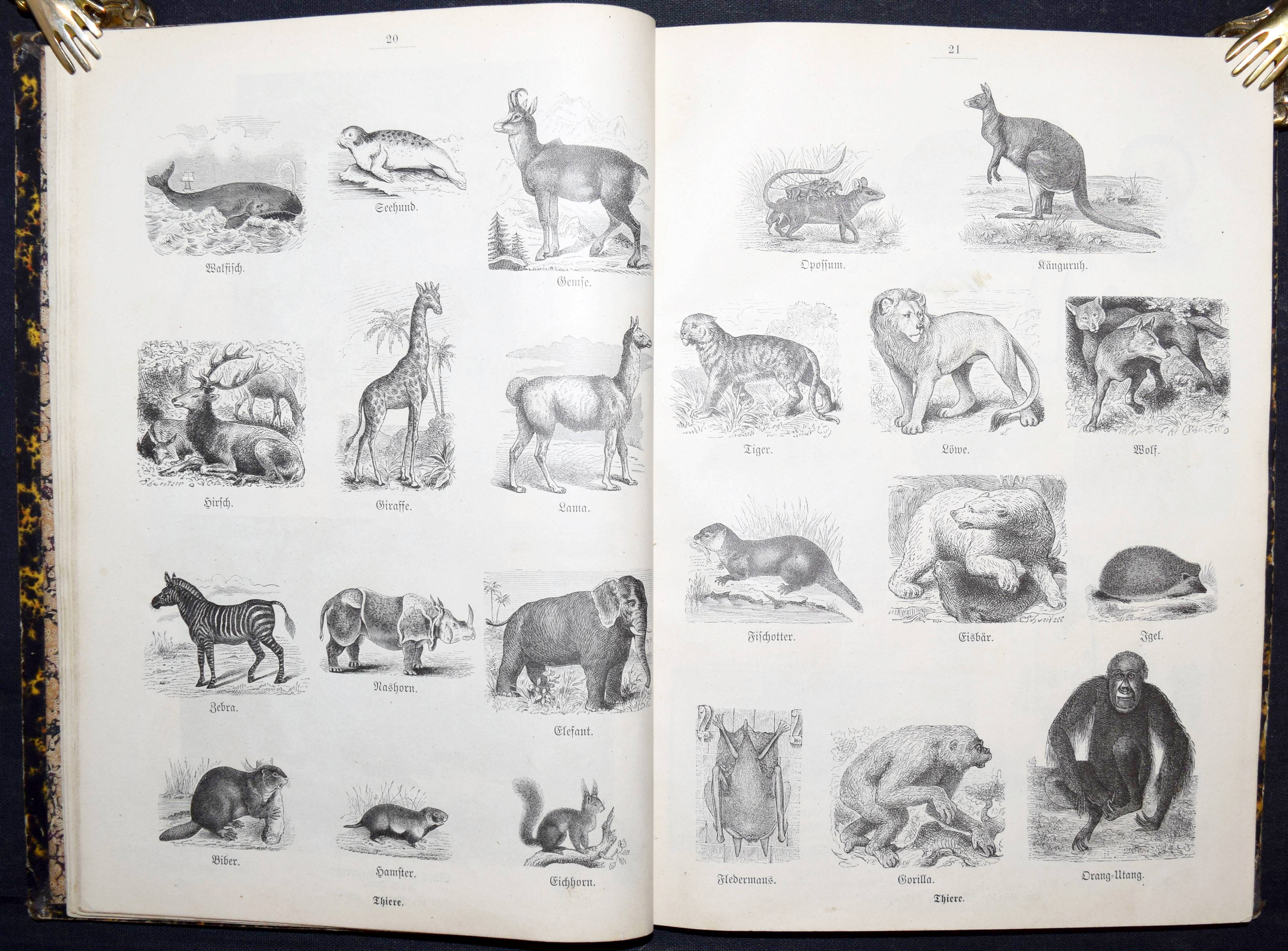 Orbis pictus – Hottinger, Chr(istlieb) G(otthold) (Hrsg.). Die Welt in Bildern. (Orbis pictus). Für Schul- und Unterrichtszwecke. Berlin u. Straßburg, Selbstverlag 1881. 4°. 200 S. mit zahlr. Holzschnitten. Hldr. d. Zt. mit goldgepr. Rückentitel u. Linienverg. Doderer-Müller 413 (gibt 160 S. an). Klotz 2930/2. LKJ II, 615. Pilz S. 387. Seebaß II, 1420 (″Sehr reichhaltig“). Wegehaupt II, 1654. – Erste Ausgabe. – „154 Seiten mit neugefertigten Holzschnitten „nach Werken hervorragender Meister aus den verschiedenen Jahrhunderten.“ – Die „wichtigsten Gegenstände aus der Natur und dem Menschenleben“ werden durch kurz erläuterte Bilder in systematischer Anordnung dargestellt. Dazu 20 Seiten Erläuterungen zur Welt in Bildern in lexikalischer Form“ (H. Wegehaupt). – Mit Ansichten aus aller Welt, ferner Porträts von Philosophen, Gelehrten, Dichtern, Staatsmännern, Musikern und Künstlern. Außerdem mit Darstellungen von Gebäuden, Denkmälern, Maschinen u.a. – Deckel u. Kanten etwas berieben, geringf. fingerfl., gutes Exemplar.