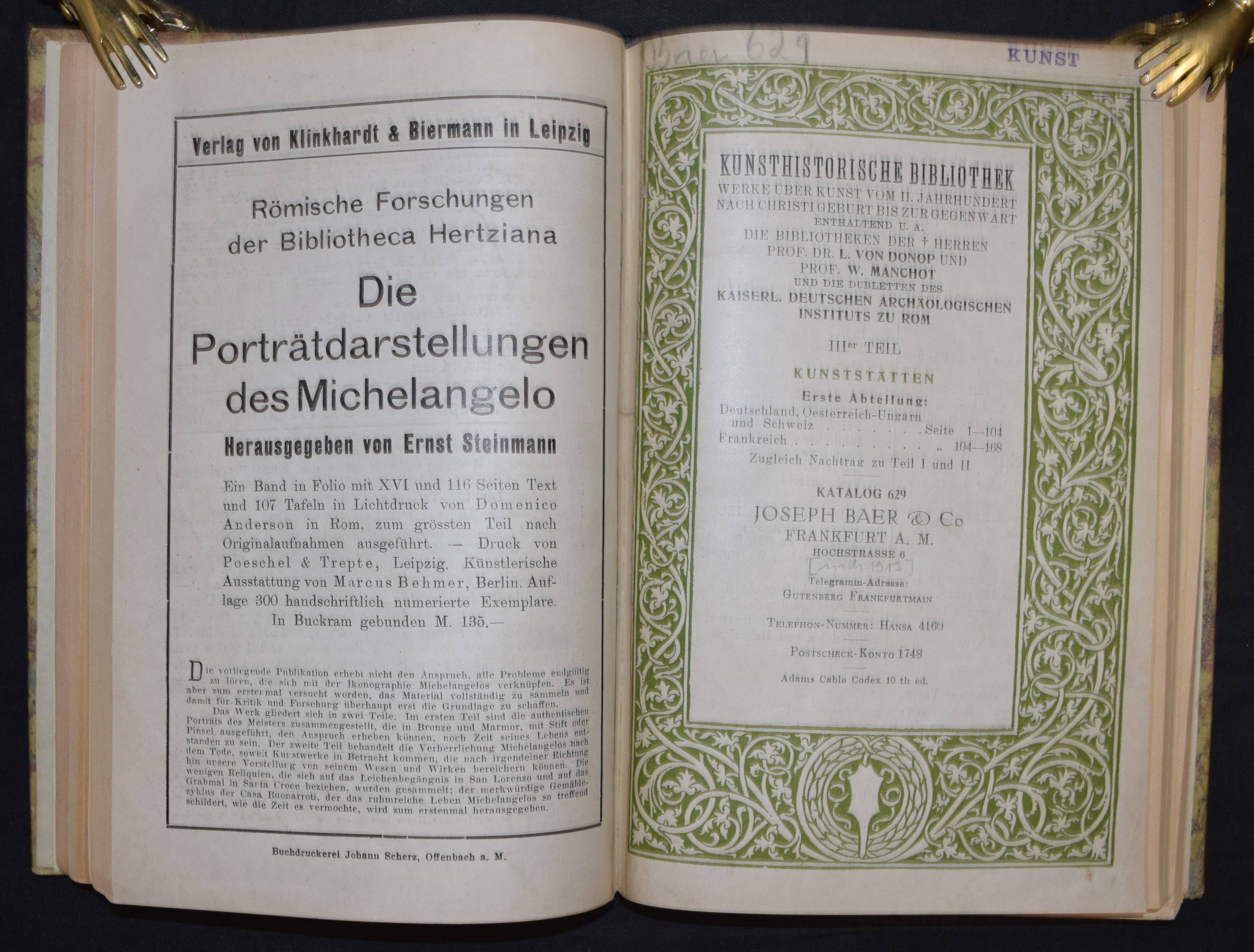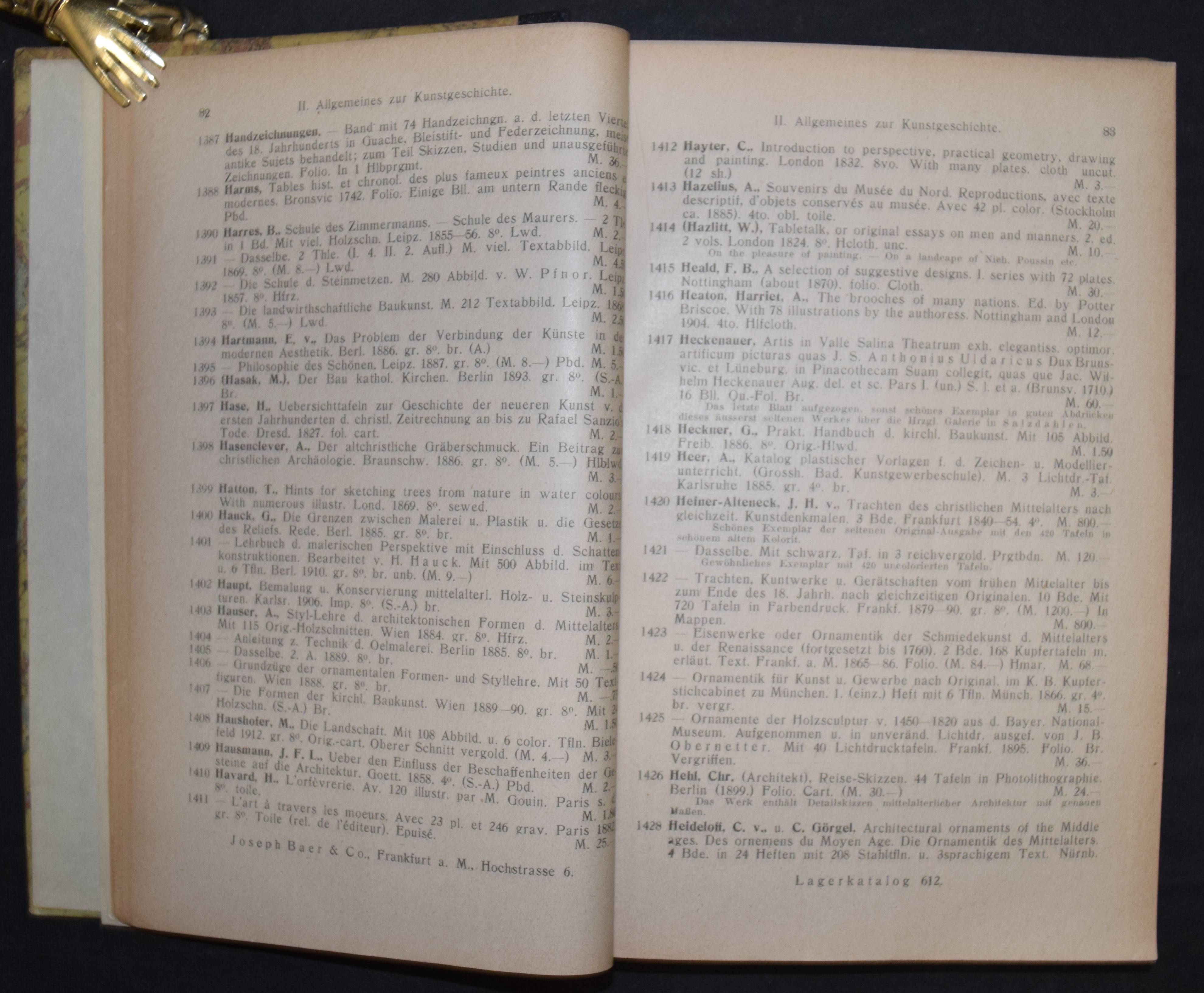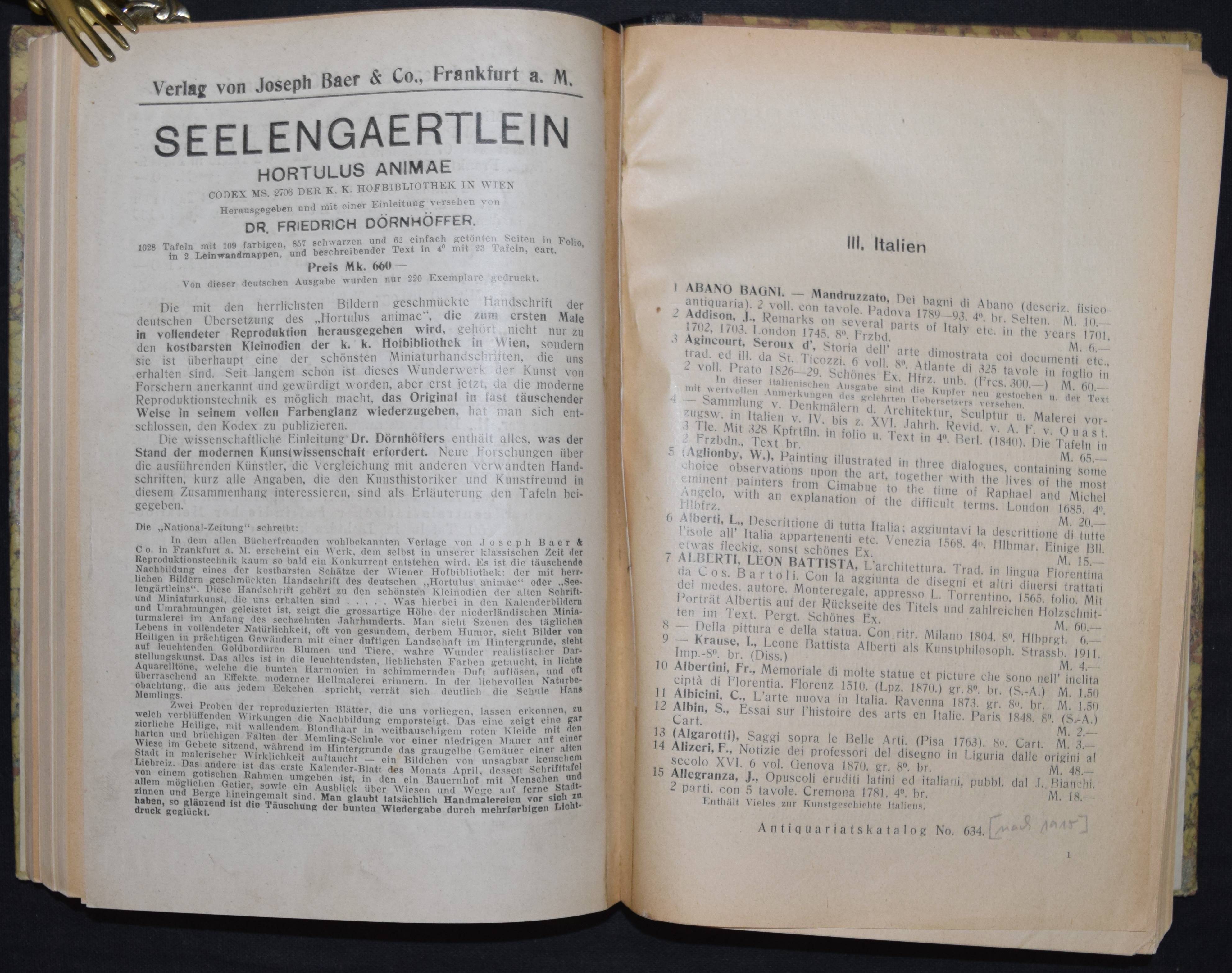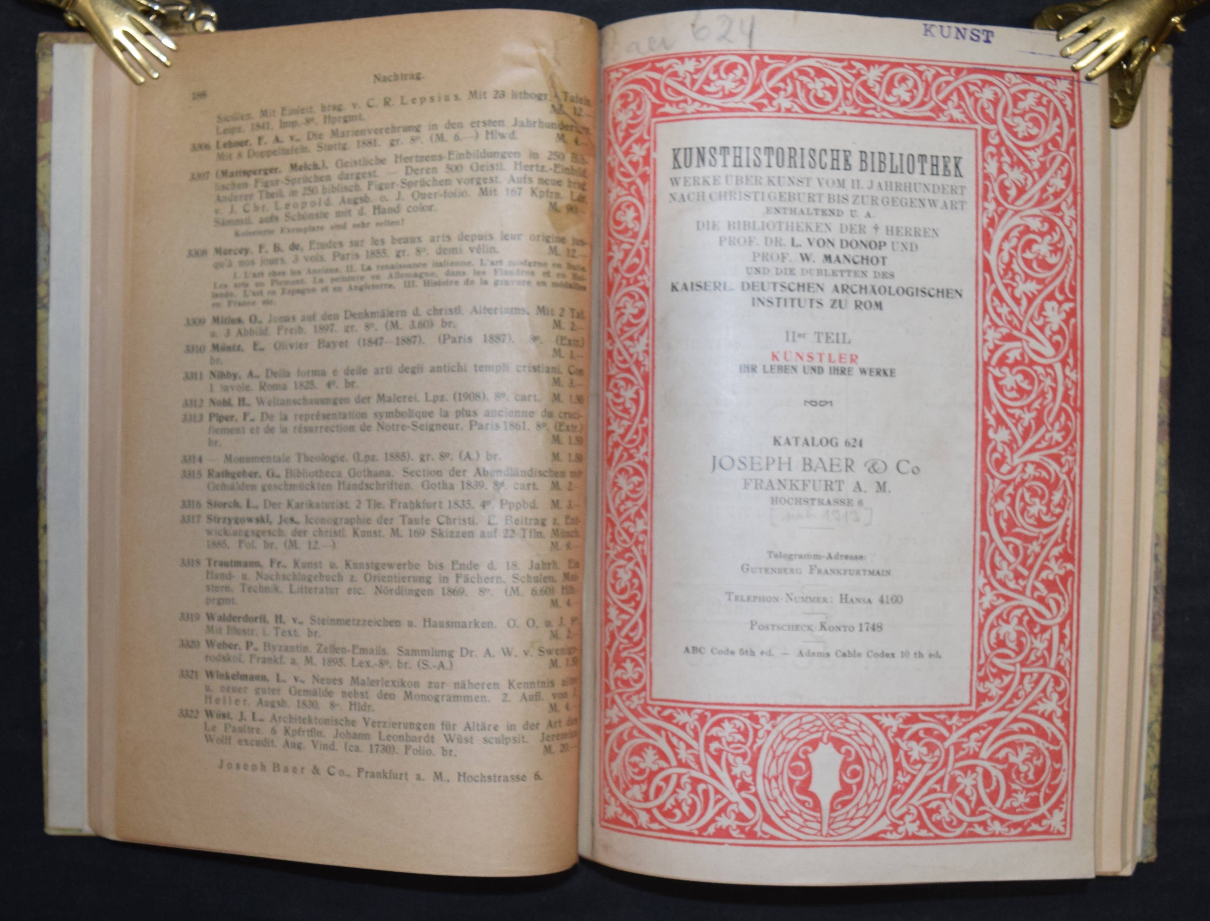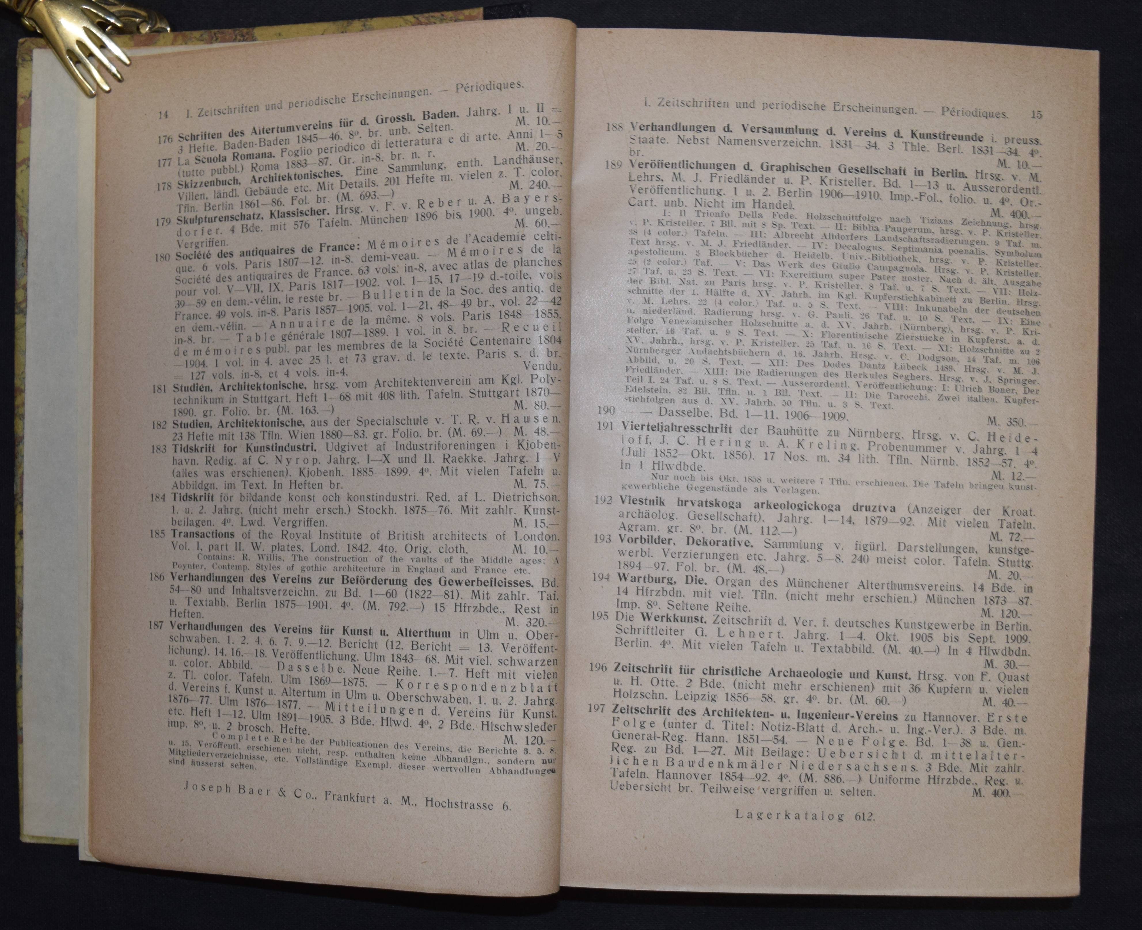 Baer, Joseph Kunsthistorische Bibliothek. Werke über Kunst vom 11. Jahrhundert n. Christi bis zur Gegenwart enthaltend u.a. die Bibliotheken der Herren Prof. Dr. L. von Donop und Prof. W. Machot und die Dubletten des Kaiserl. Deutschen Archäologischen Instituts zu Rom. I.-IV. Teil. Kunststätten: Italien, Spanien u. Portugal. Katalog 612-634. 4 Teile in 1 Band. Frankfurt a.M., J. Baer & Co. o. J. [1912-1914]. 8°. Hln. d. Zt. mit mont. OU. Bis 1916 erschienen noch ein 5. u. 6. Teil. – Gutes Exemplar des wichtigen Antiquariatskatalogs.