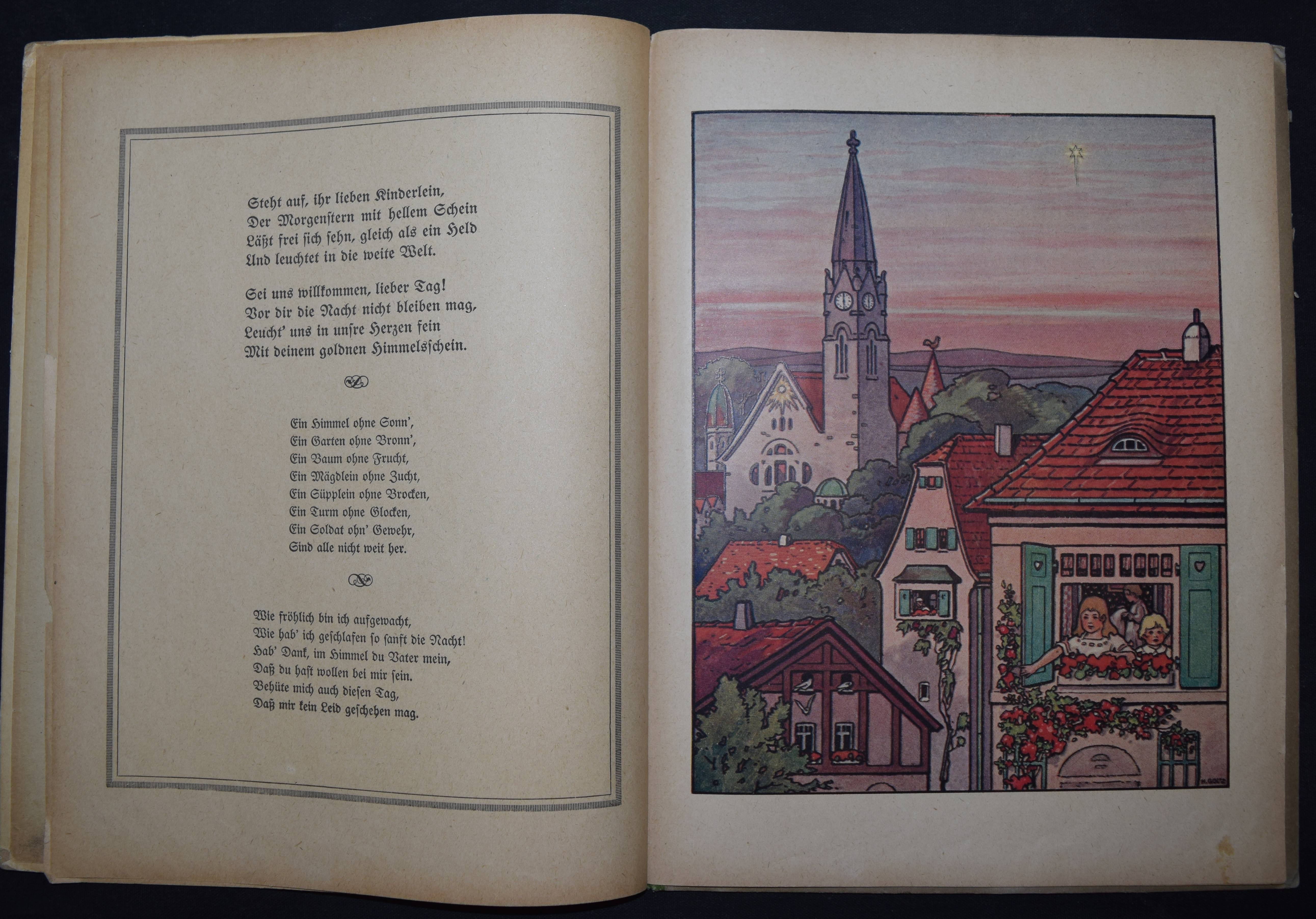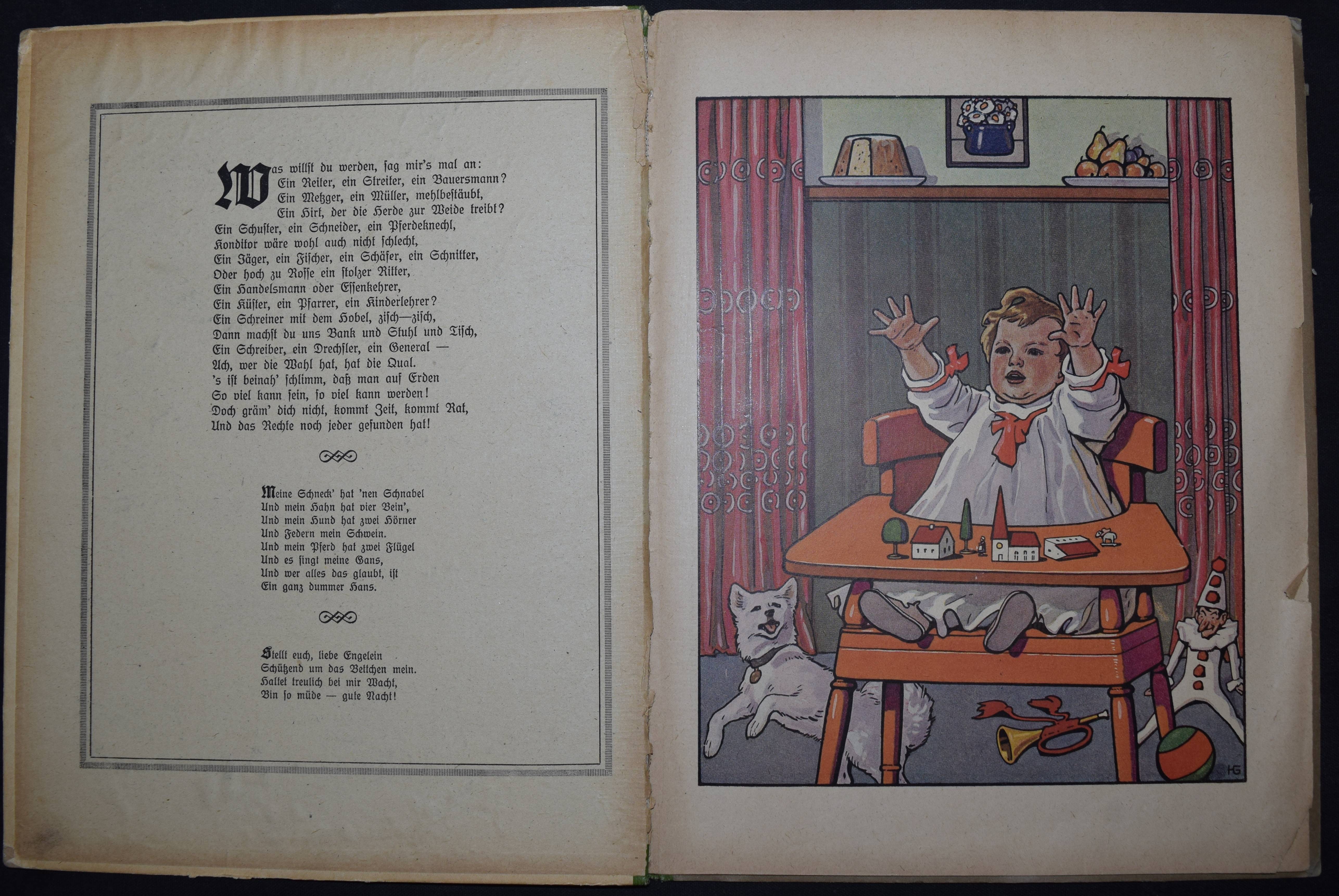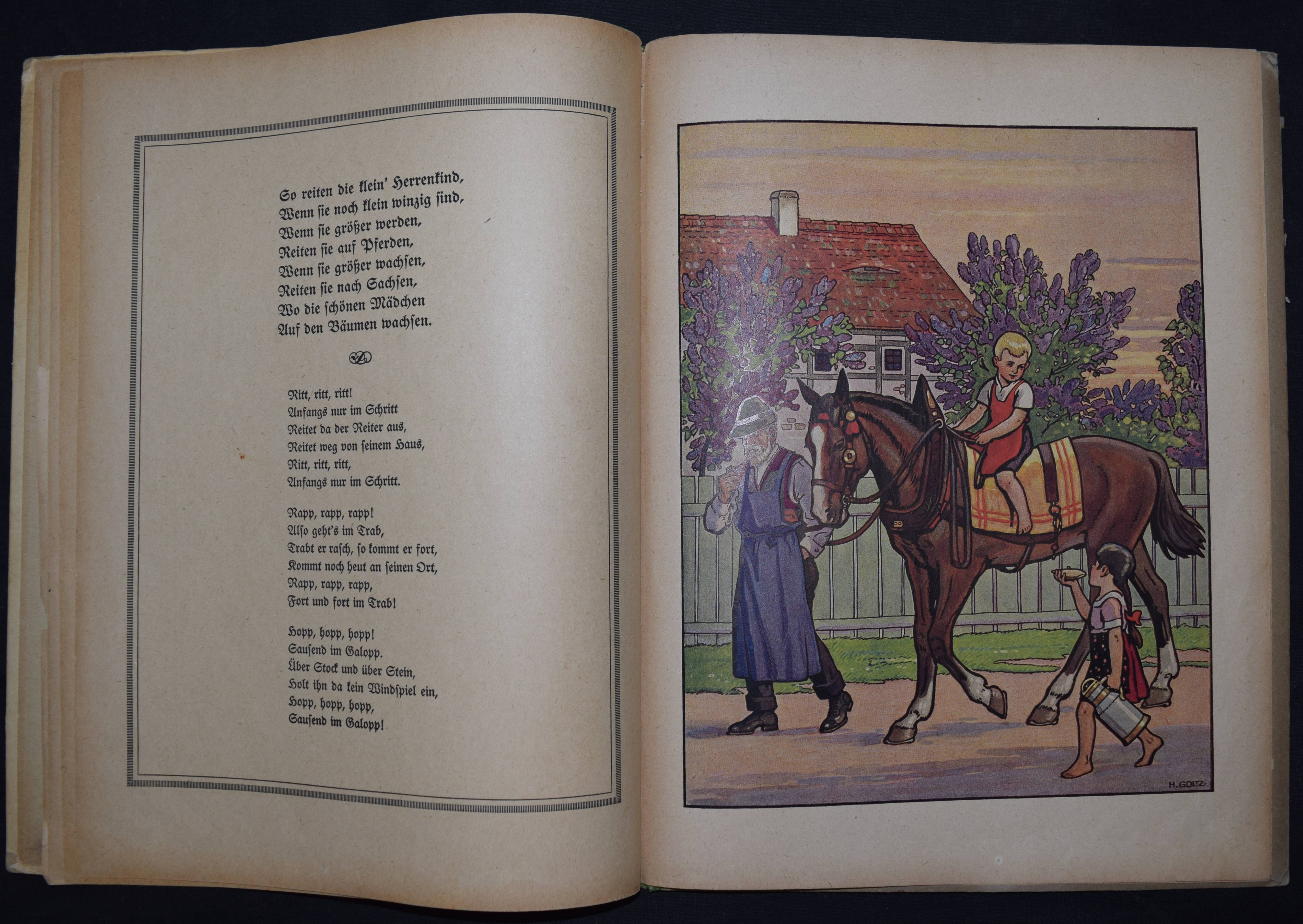 Goltz, Heinrich. „O sieh, o schau!“ Ein Bilderbuch. (Deckeltitel). Leipzig u. Berlin, Anton & Co. o.J. (um 1915). 4°. [16] S. mit 7 ganzs. farbigen Illustrationen. Farbig illustr. OHln. Seltenes Bilderbuch mit zeittypischen Illustrationen zu kleinen Erzählungen und Versen. – Einband etwas berieben, Deckel angestaubt u. fleckig, papierbedingt gebräunt, sonst gut erhalten.