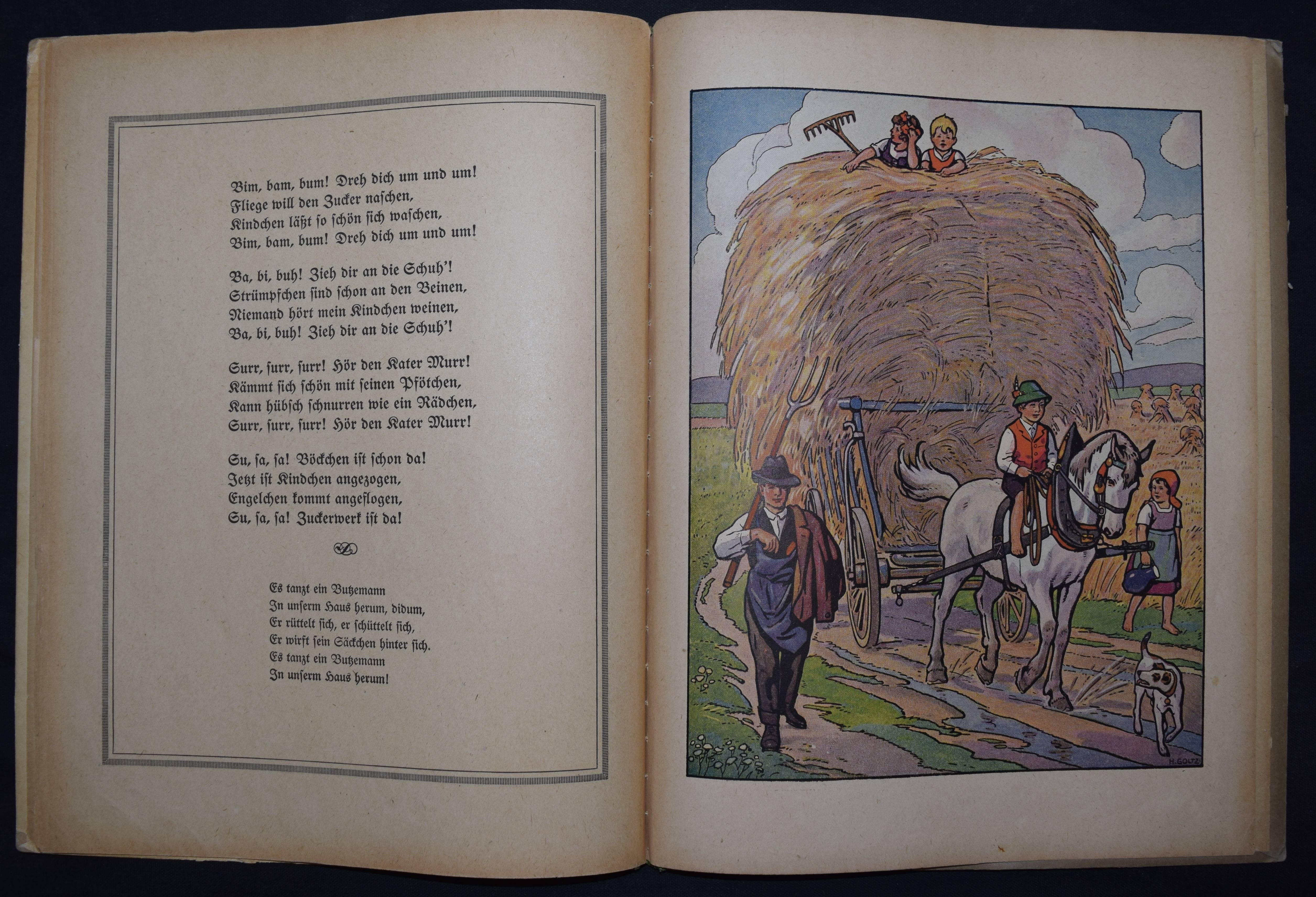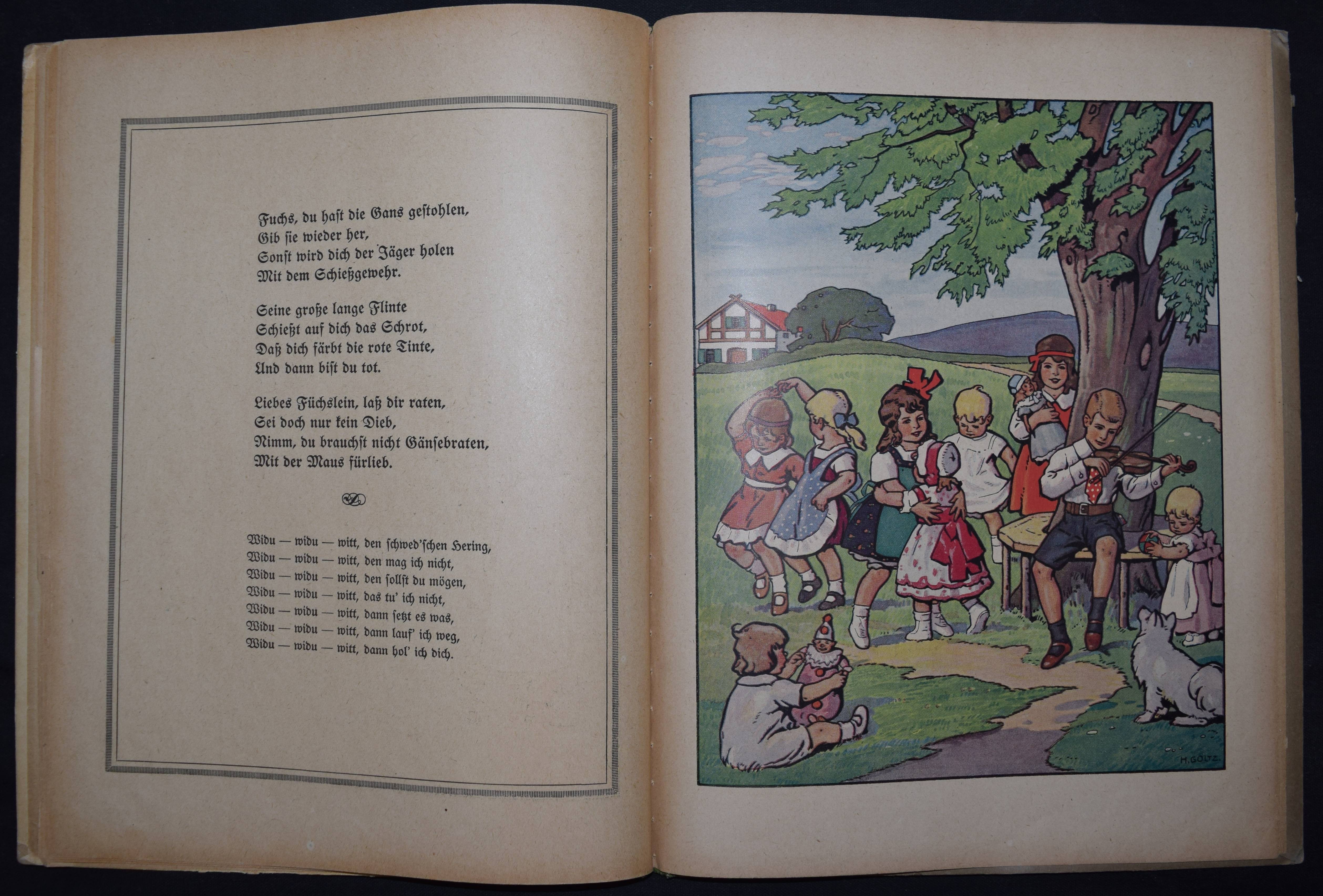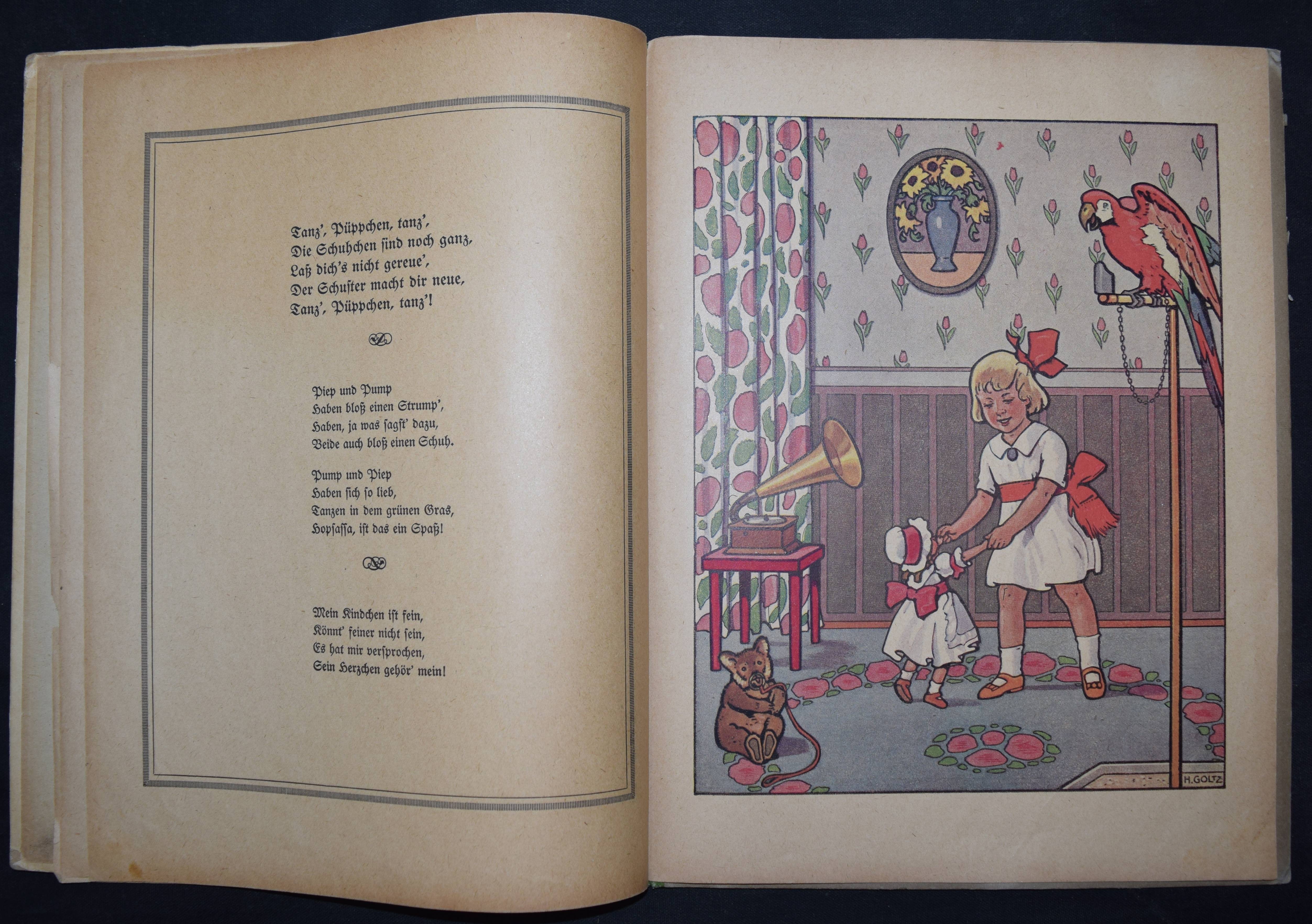 Goltz, Heinrich. „O sieh, o schau!“ Ein Bilderbuch. (Deckeltitel). Leipzig u. Berlin, Anton & Co. o.J. (um 1915). 4°. [16] S. mit 7 ganzs. farbigen Illustrationen. Farbig illustr. OHln. Seltenes Bilderbuch mit zeittypischen Illustrationen zu kleinen Erzählungen und Versen. – Einband etwas berieben, Deckel angestaubt u. fleckig, papierbedingt gebräunt, sonst gut erhalten.