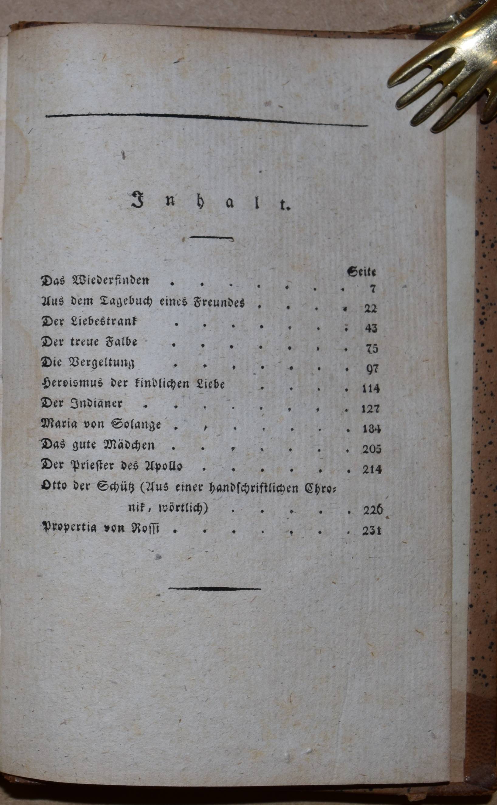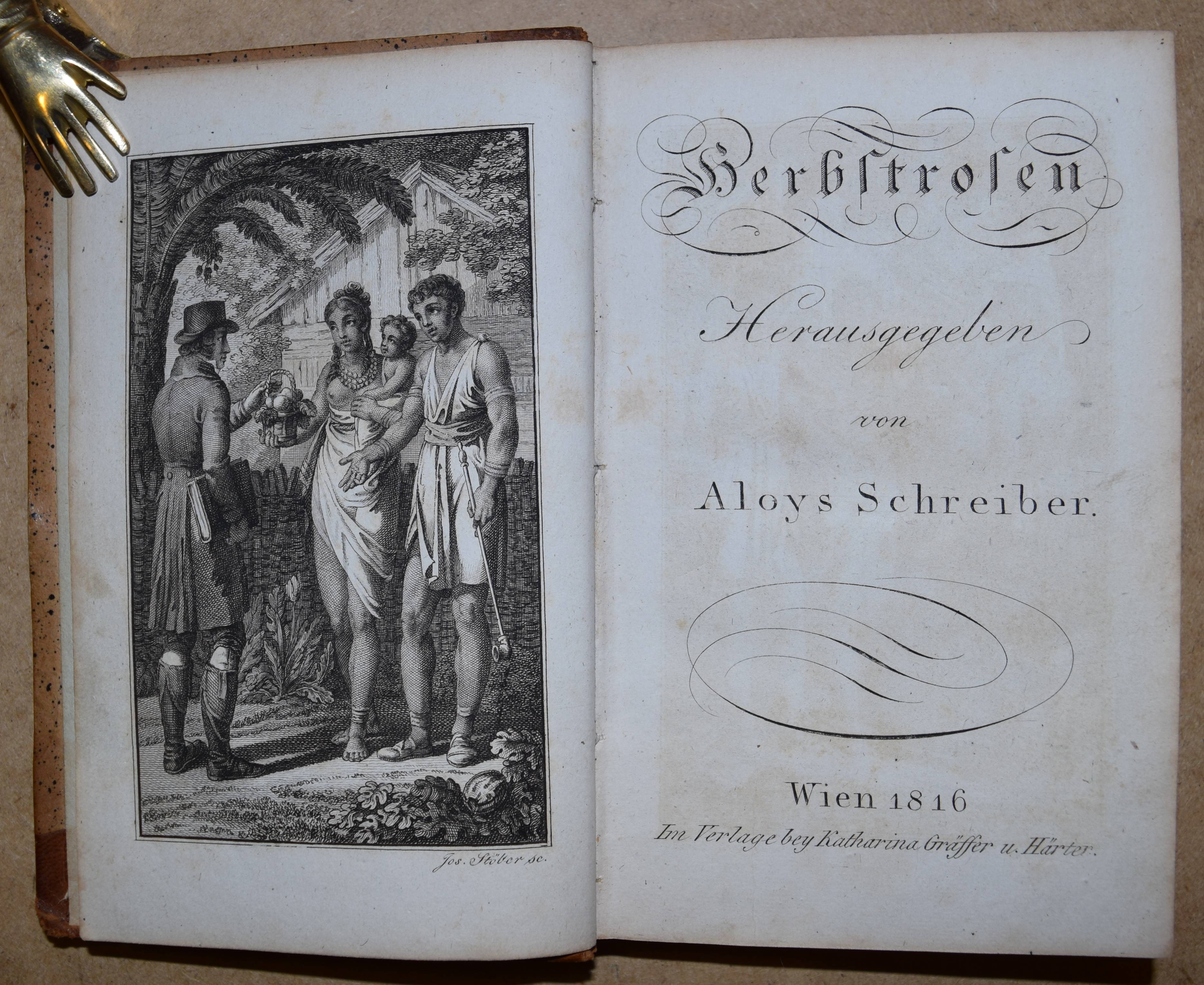Schreiber, Alois (Wilhelm). Herbstrosen. Wien, Gräffer u. Härter 1816. Kl.-8°. 238 S., 1 Bl. mit gestoch. Frontisp. von Jos(ef) Stöber. Hldr. d. Zt. mit goldgepr. Rückenschild u. Linienverg. Goed. X, 175. – Erschien zuerst 1815 bei Marx in Karlsruhe. – Der badische Historiker A. W. Schreiber (1763-1841) war Professor der Aesthetik an der Universität Heidelberg und wurde „1813… zum Hofhistoriographen ernannt, in Karlsruhe, wo seine Vorlesungen über Geschichte, Aesthetik und Kunstgeschichte von den gebildeten Kreisen der Einwohnerschaft eifrig besucht wurden“ (F. v. Weech in ADB XXXII, 471). – Schönes Exemplar.