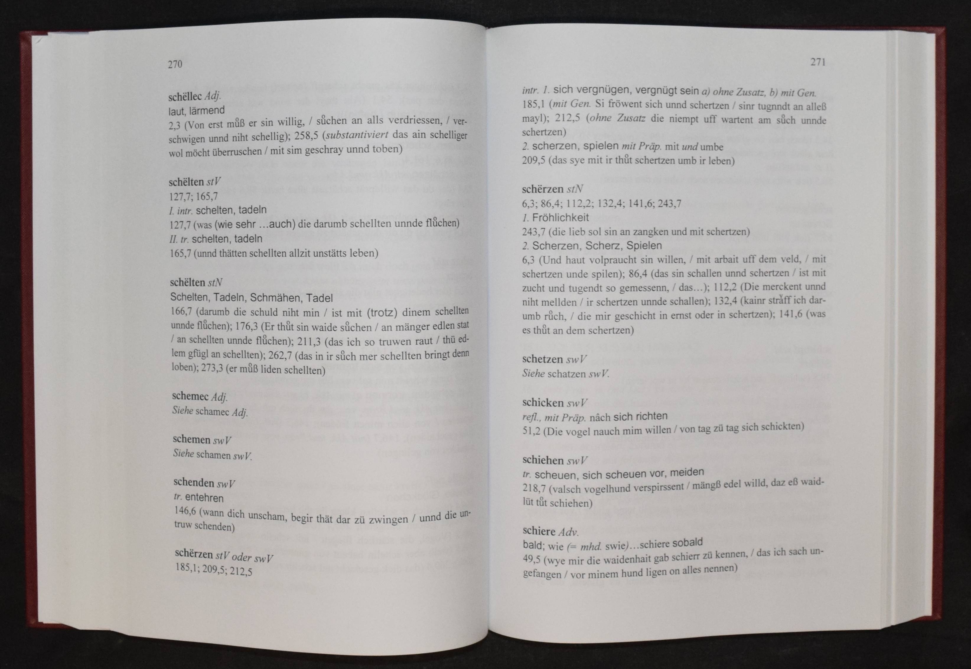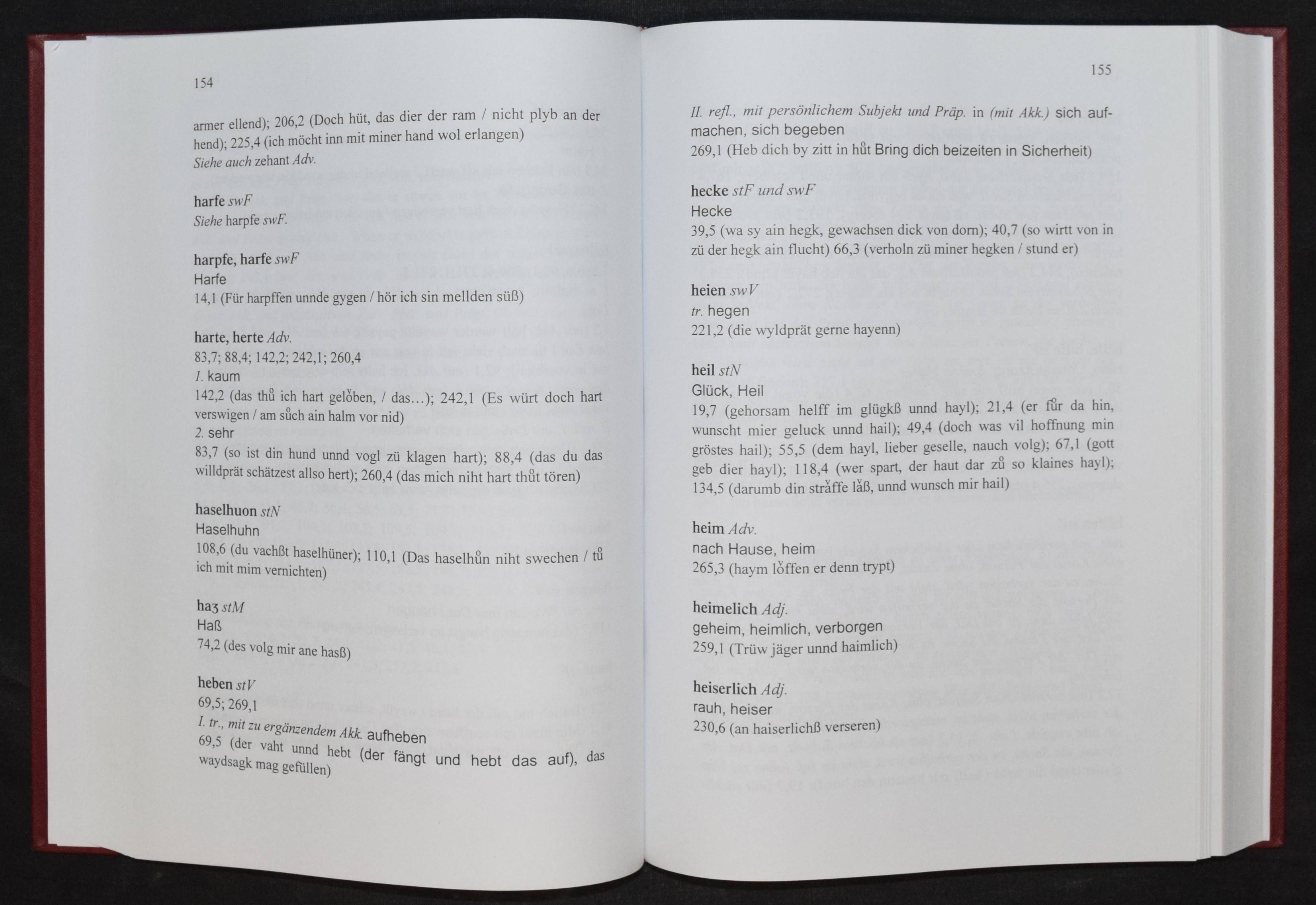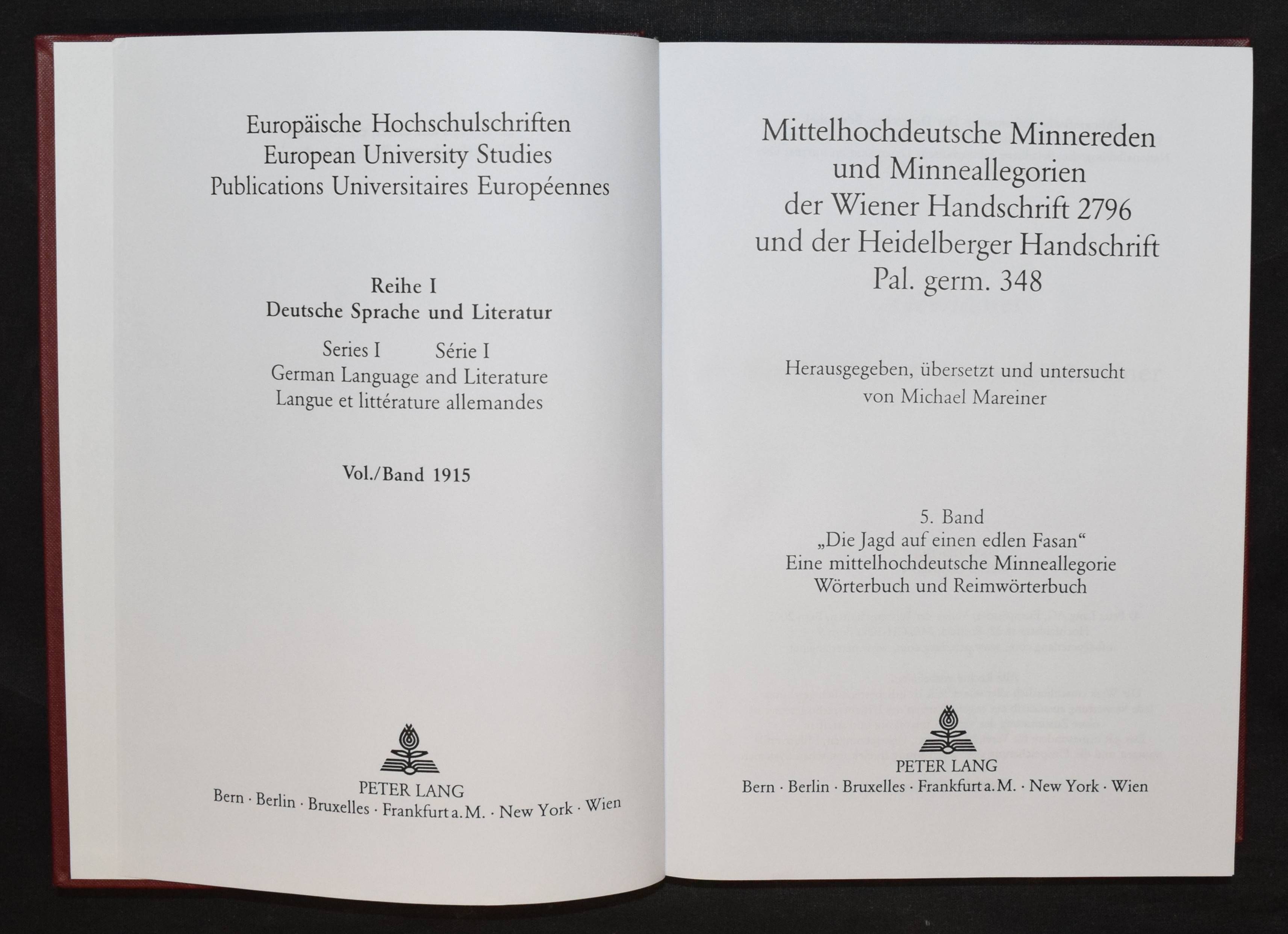 Mareiner, Michael (Hrsg.). Mittelhochdeutsche Minnereden und Minneallegorien der Wiener Handschrift 2796 und der Heidelberger Handschrift Pal. germ. 348. 5. Band „Die Jagd auf einen edlen Fasan“. Eine mittelhochdeutsche Minneallegorie. Wörterbuch und Reimwörterbuch. Bern, Frankfurt am Main, New York, Paris, Lang 2005. 4°. 558 S., 1 Bl. OLn. mit goldgepr. Rückentitel. (Europäische Hochschulschriften, Reihe 1, Deutsche Sprache und Literatur = Langue et littérature allemandes = German language and literature, Vol./Band 1915). Sehr gutes Exemplar.