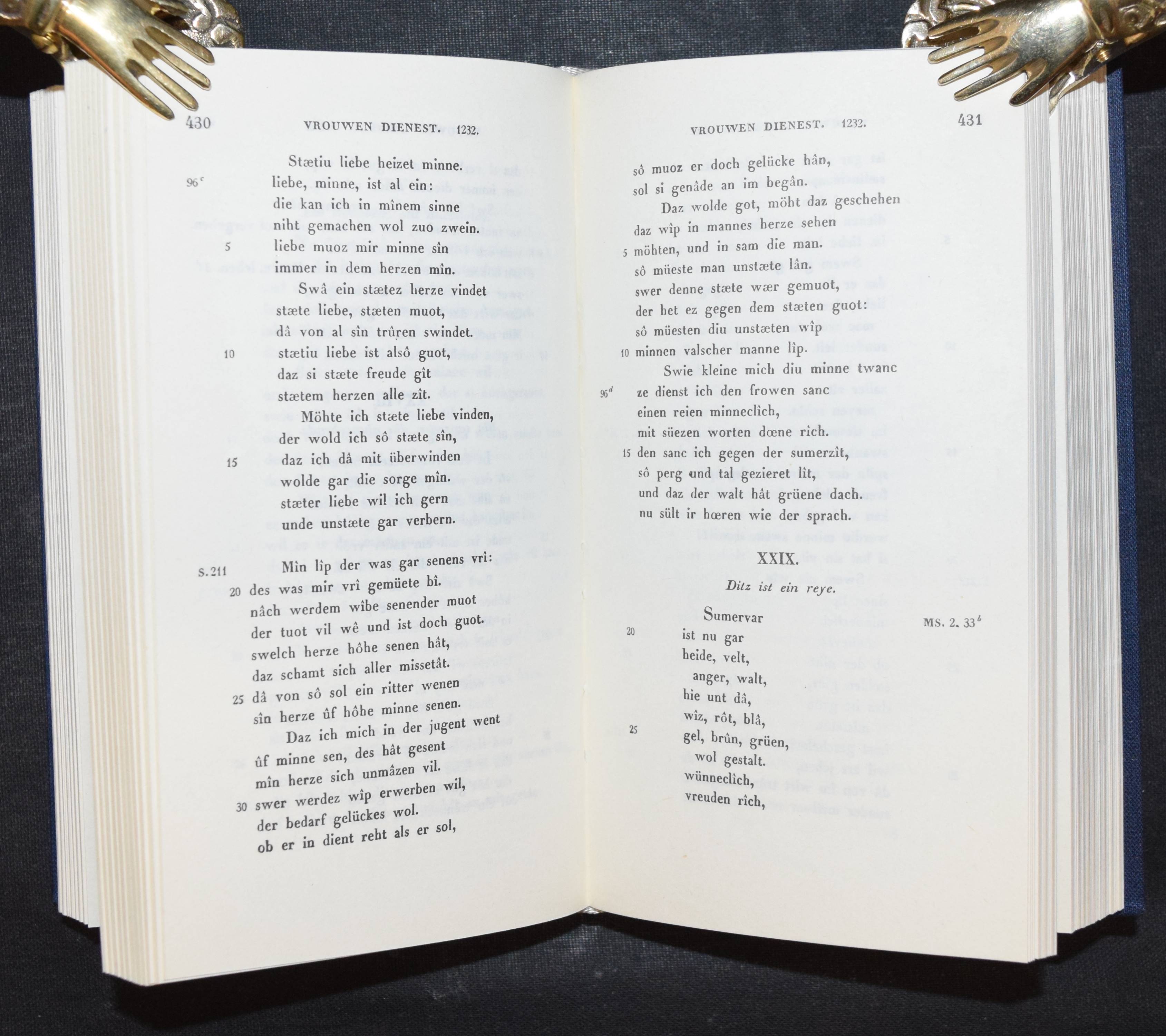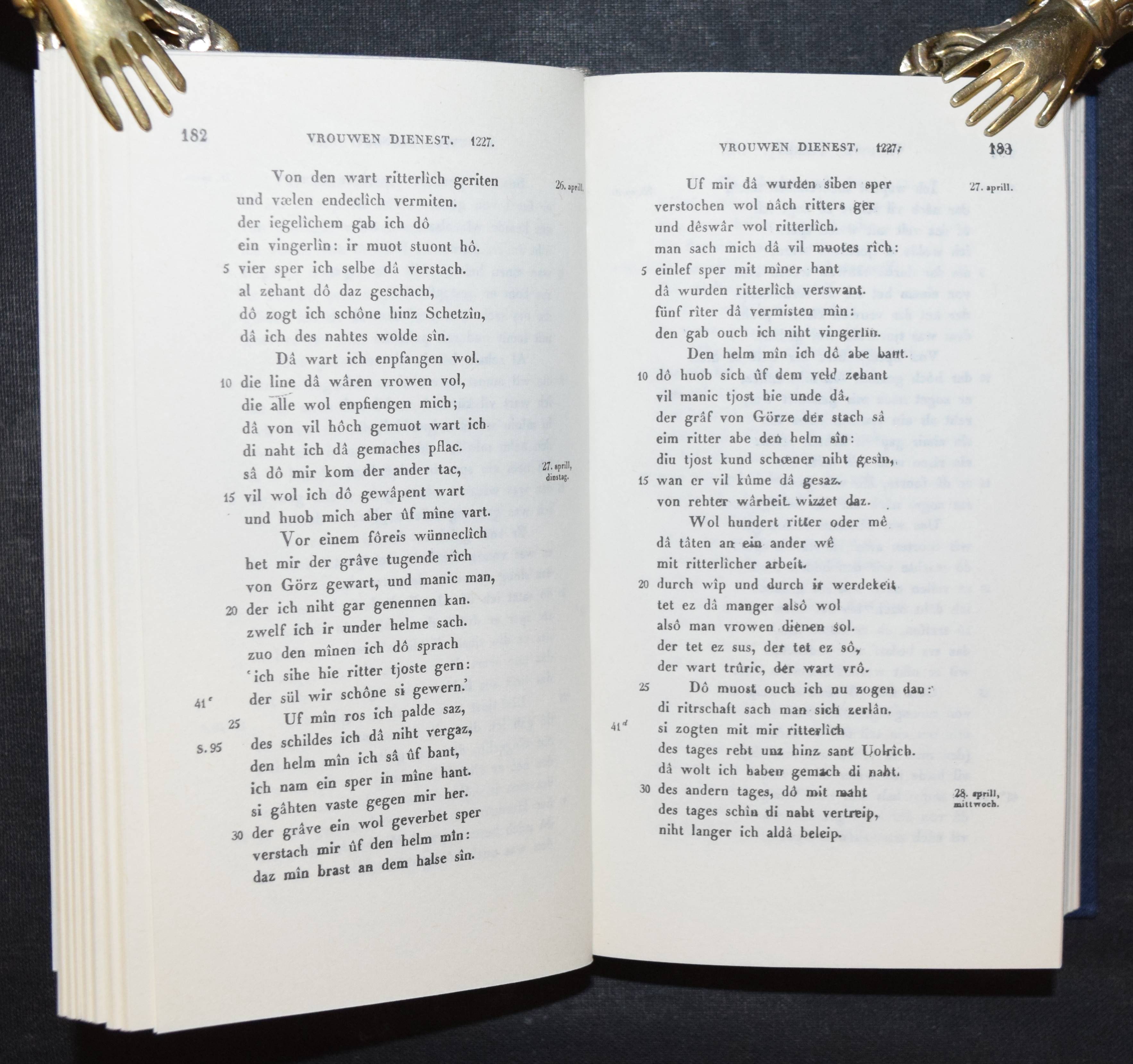 Lichtenstein, Ulrich v. Mit Anmerkungen von Theodor v. Karajan. Herausgegeben von Karl (Georg) Lachmann. (Nachdruck der Ausgabe Berlin 1841). Hildesheim, Olms 1974. 8°. 4 Bl., 728 S., 1 Bl. OLn. mit goldgepr. Rücken- u. Deckeltitel. Sehr gutes Exemplar.