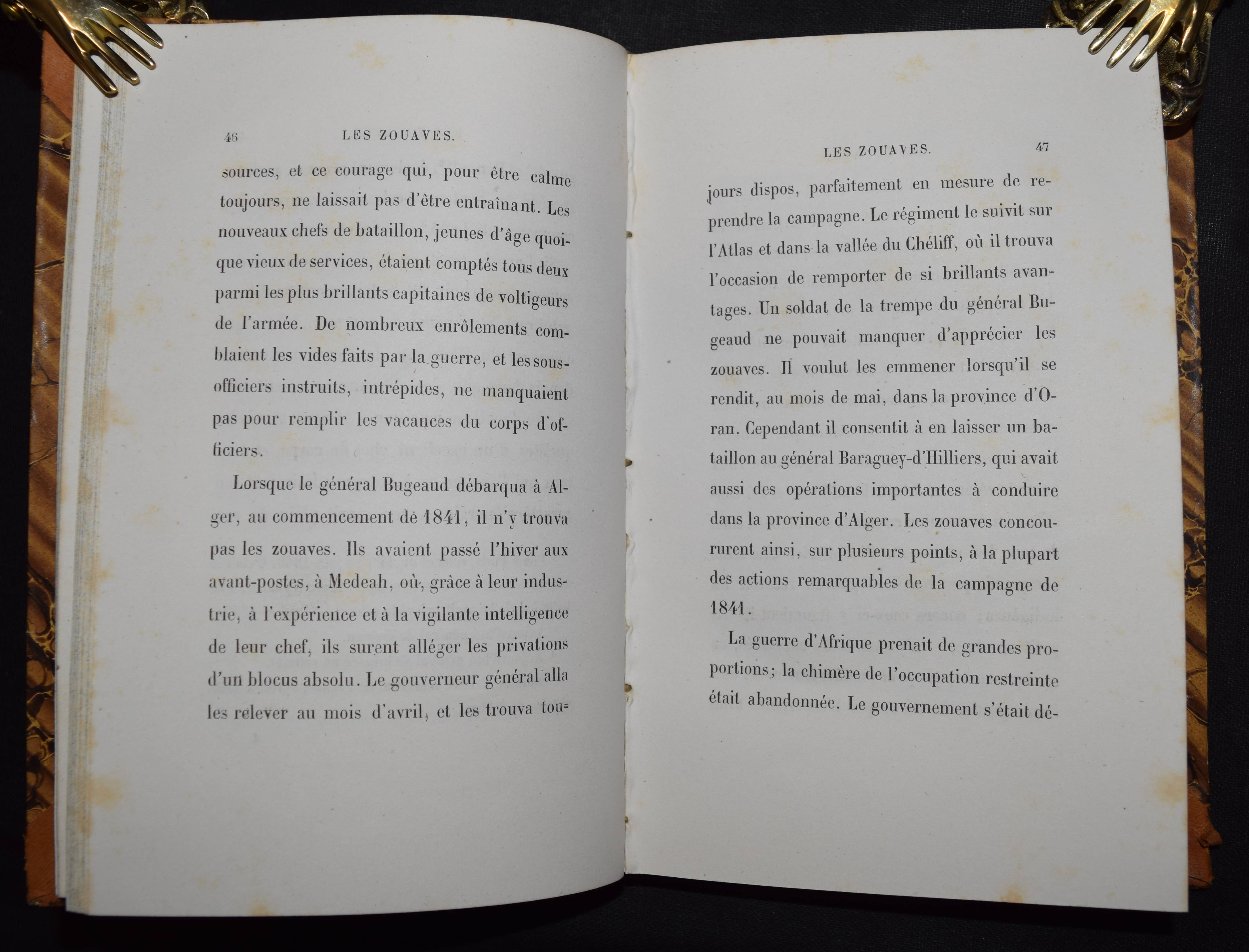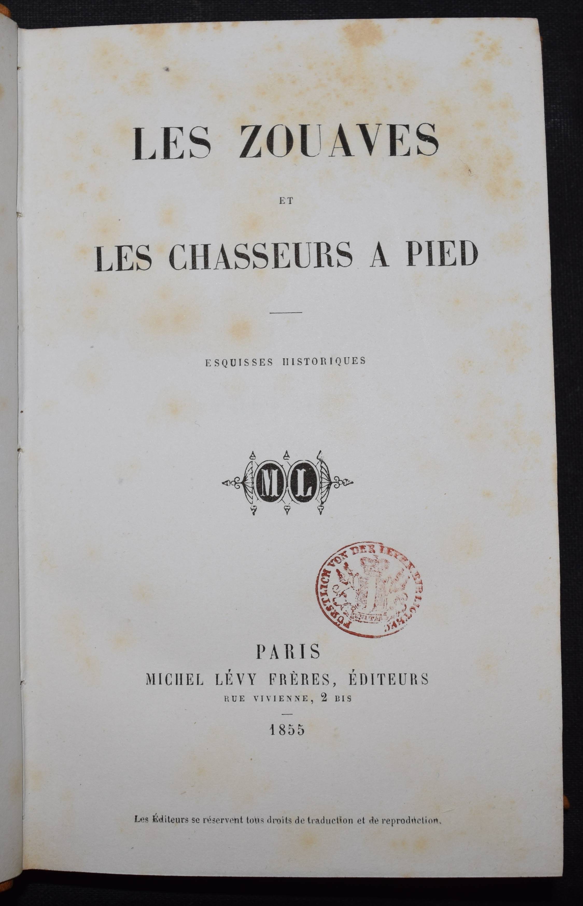 (Orléans, duc d’Aumale, Henri-Eugène-Philippe-Emmanuel de). Les zouaves et les chasseurs à pied. Esquisses historiques. Paris, Michel Lévy Freres 1855. 8°. 177 S., 1 Bl. Hldr. d. Zt. mit goldgepr. Rückentitel u. Rückenverg. (Bibliotheque contemporaine. 2e serie). Erste Ausgabe dieser Sammlung von Artikeln aus der „Revue des deux Mondes“. – Vereinzelt leicht stockfl., schönes dekorativ gebundenes Exemplar aus der Schloßbibliothek von der Leyen in Zweibrücken.
