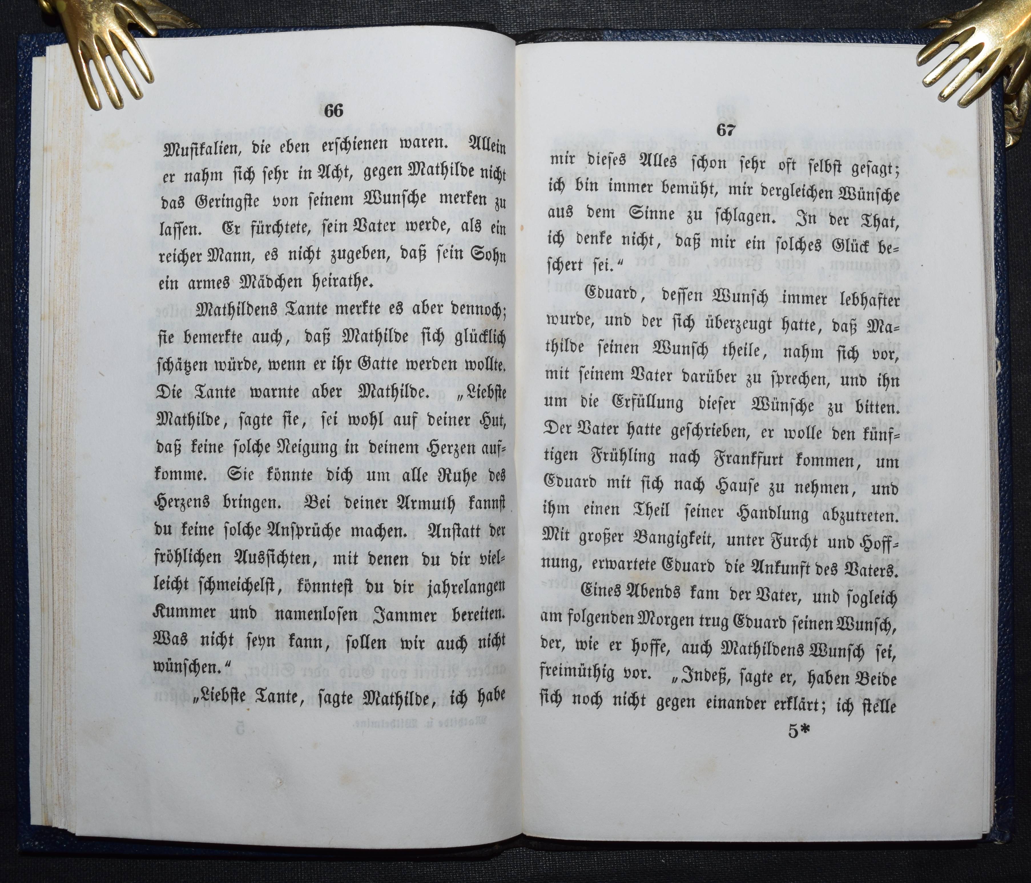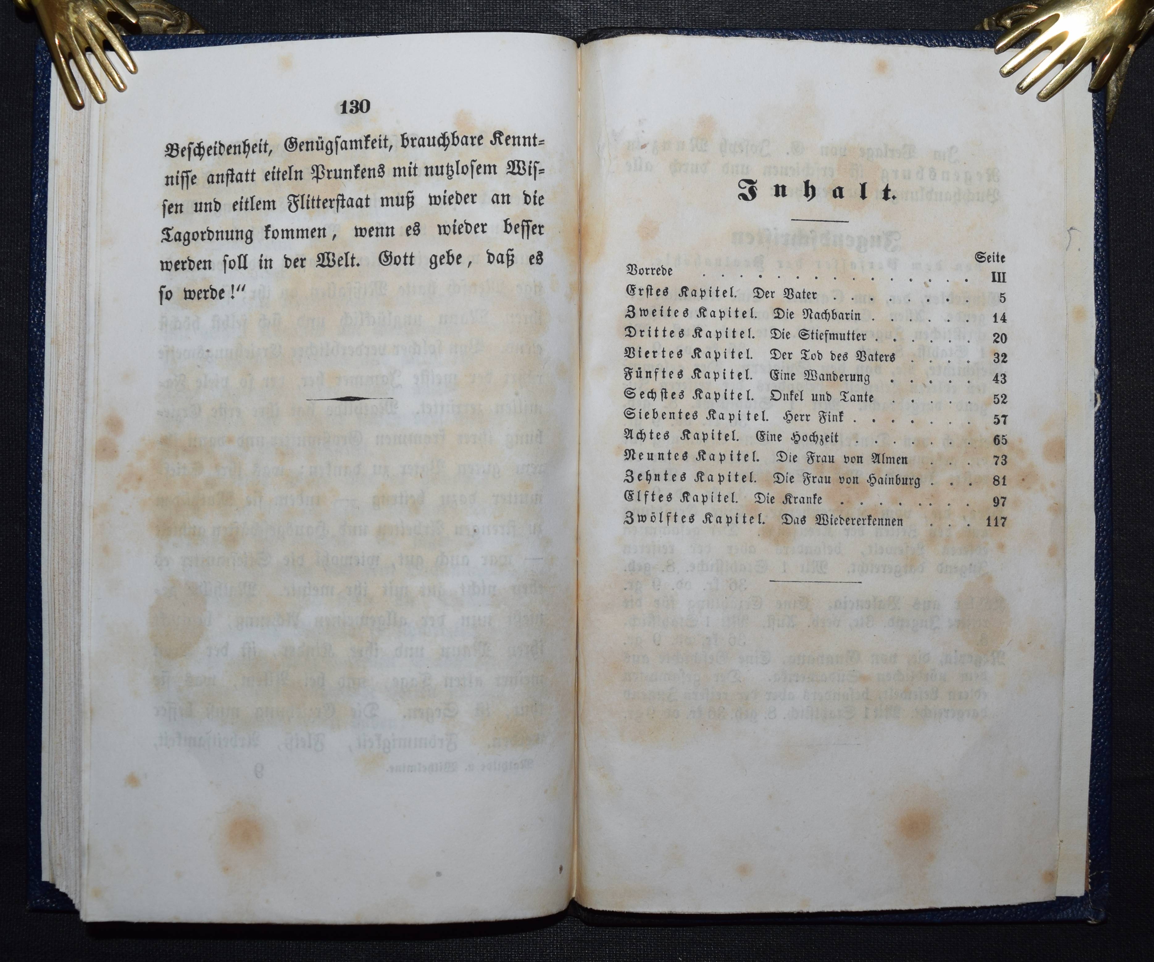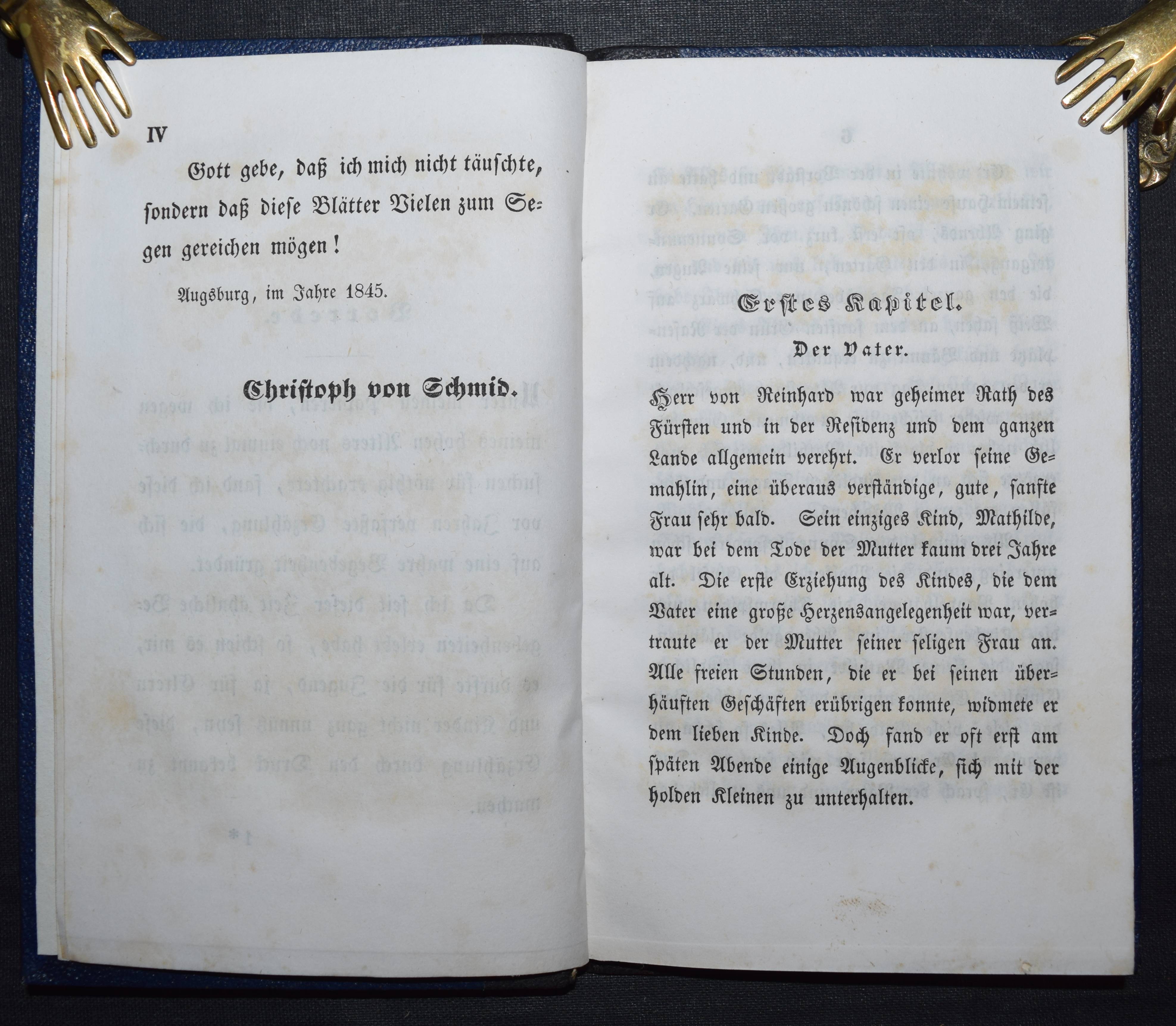 Schmid, Christoph v. Mathilde und Wilhelmine. Die ungleichen Schwestern. Eine Erzählunh von dem Verfasser der Ostereier. Regensburg, Manz 1846. 8°. 2 Bl., 130 S., 1 Bl. mit einem gestoch. Frontispiz. Hldr. d. Z. mit goldgepr. Rückentitel u. Rückenverg. Klotz 6345/645. – Erste Ausgabe. – Die ersten Blatt geringf., die letzten etwas stärker stockfl., sonst gutes Exemplar.
