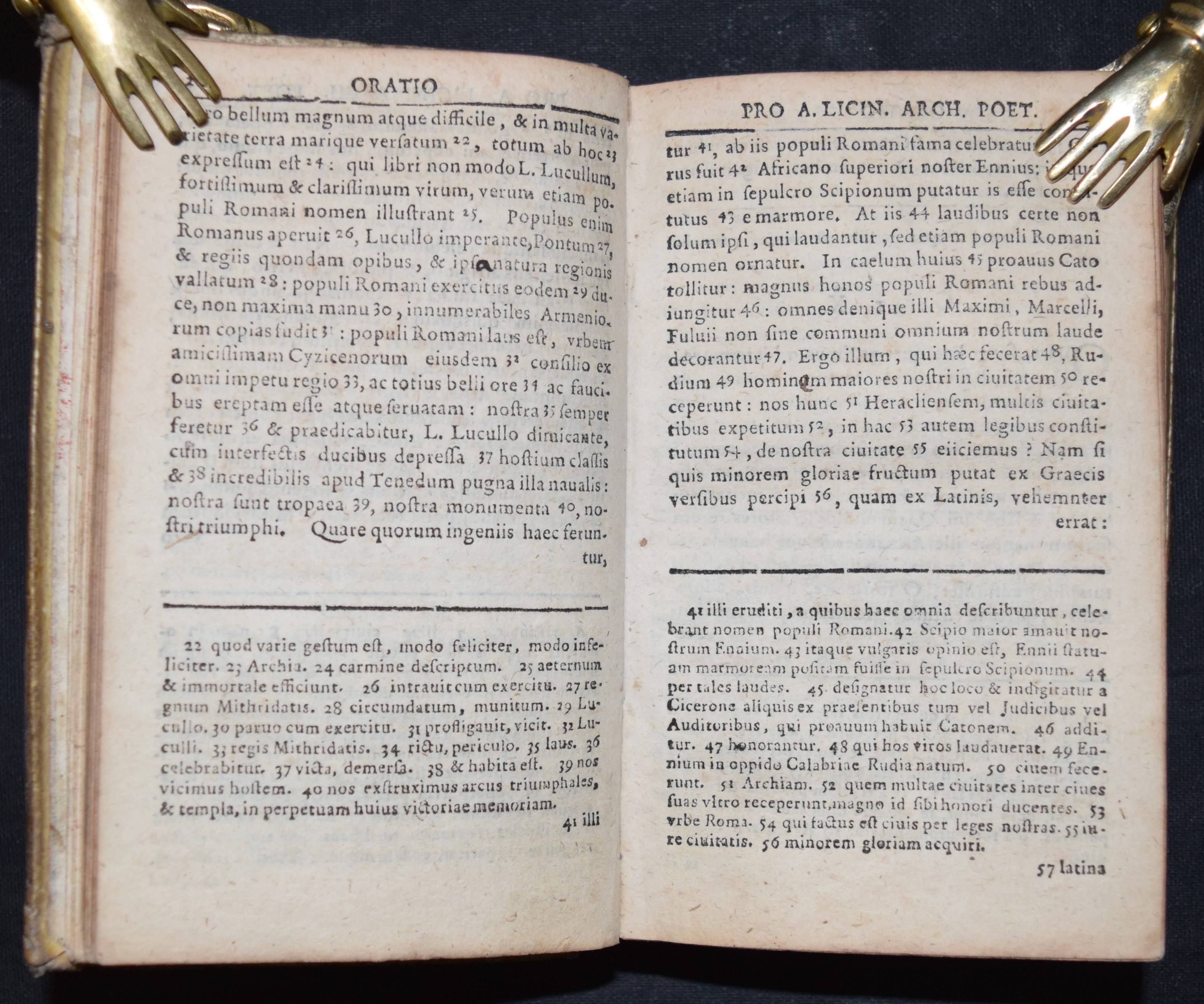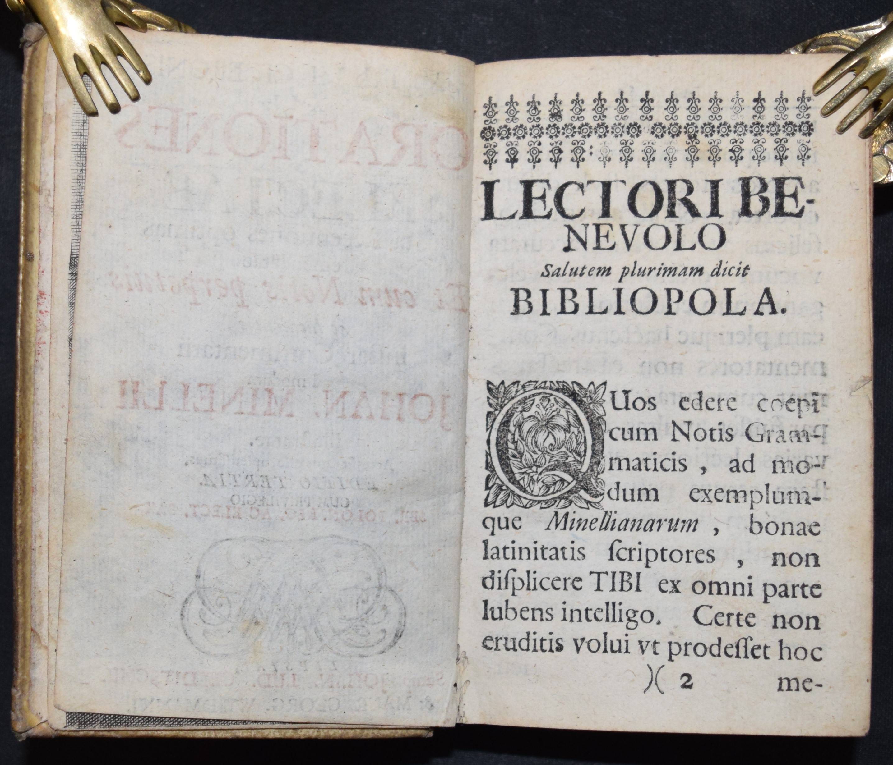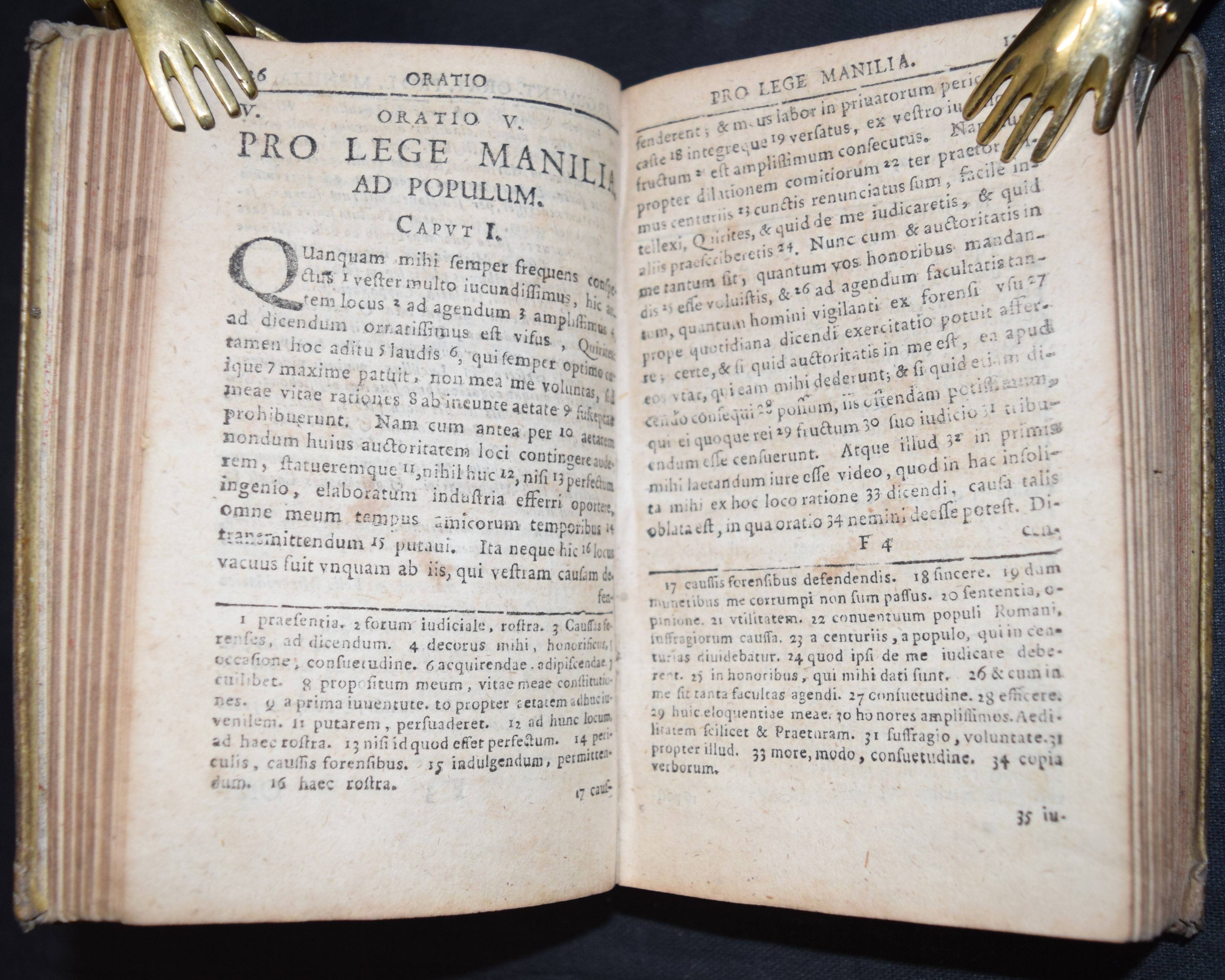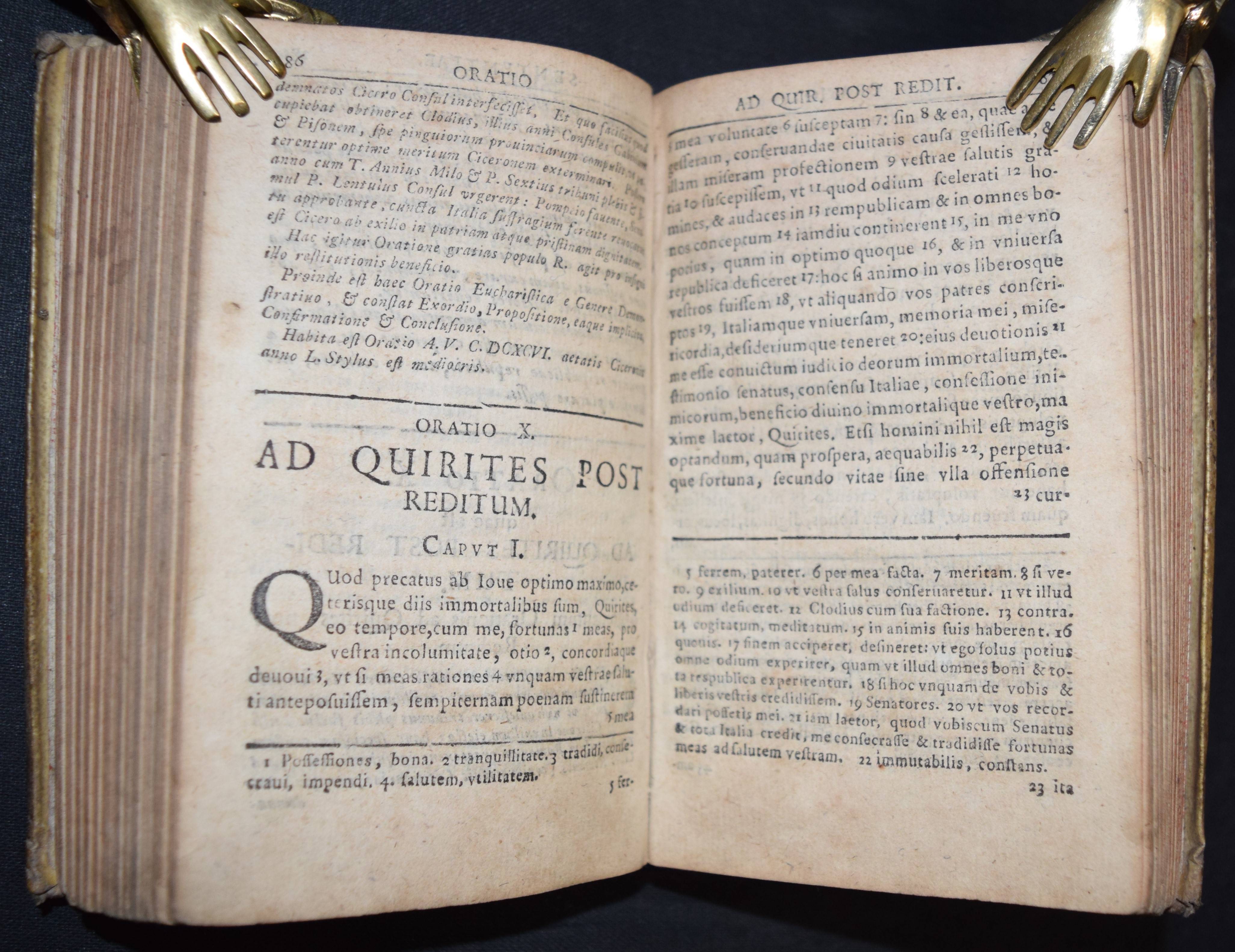 Cicero, Marcus Tullius. Orationes Selectae. Iuxta Recensiones optimas emendatae Et cum Notis perpetuis ac luculentis instar Commentarii ad modum Johan. Minellii (Jan Minell) illustratae. Editio tertia. Leipzig, Gleditsch u. Weidmann (1711). 12°. Gestoch. Frontispiz, Titel in Rot u. Schwarz, [4] Bl., 432 S., [40] S. Prgt. d. Zt. VD18 12759058. – Frühe Ausgabe dieser kommentierten Bearbeitung duch den niederländischen Philologen J. Minell (1625-1683). – Einband angestaubt, Rücken am Fuß mit größerer Fehlstelle, sonst gutes sauberes Exemplar.