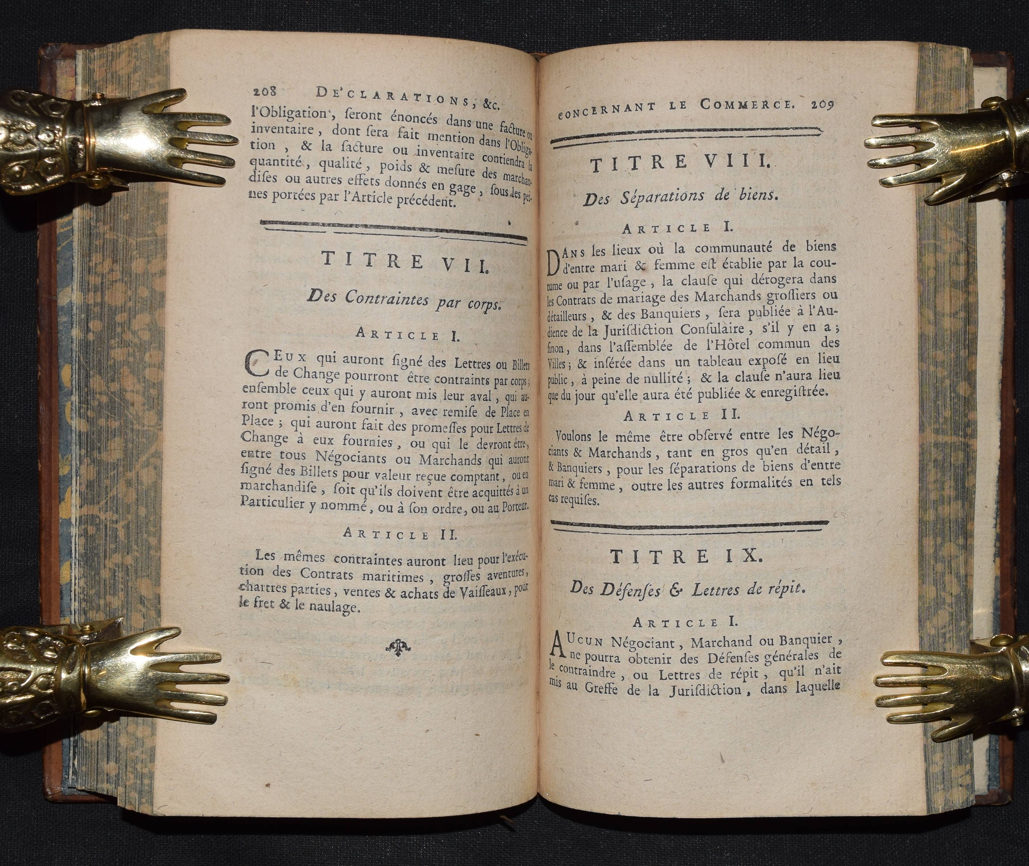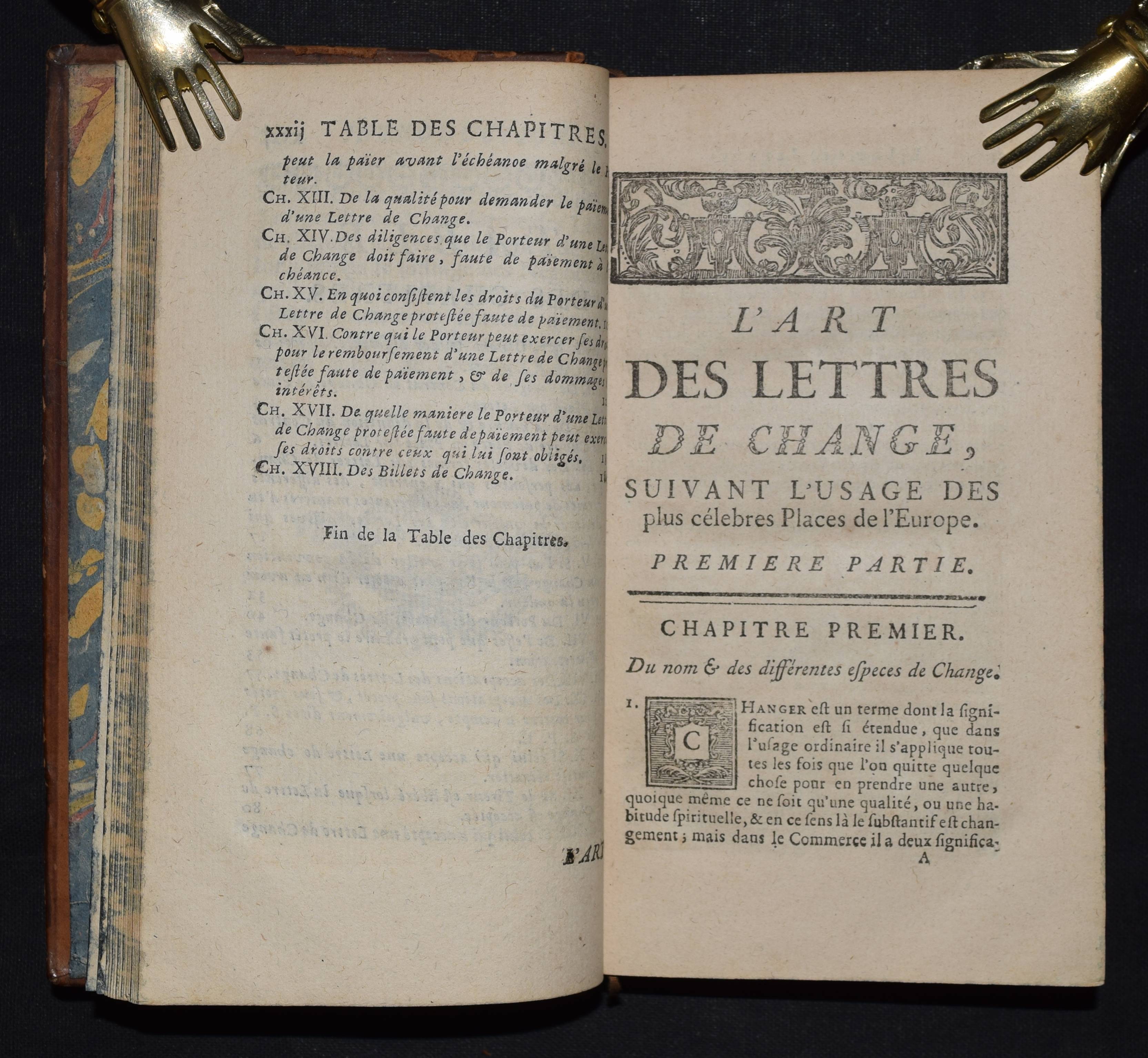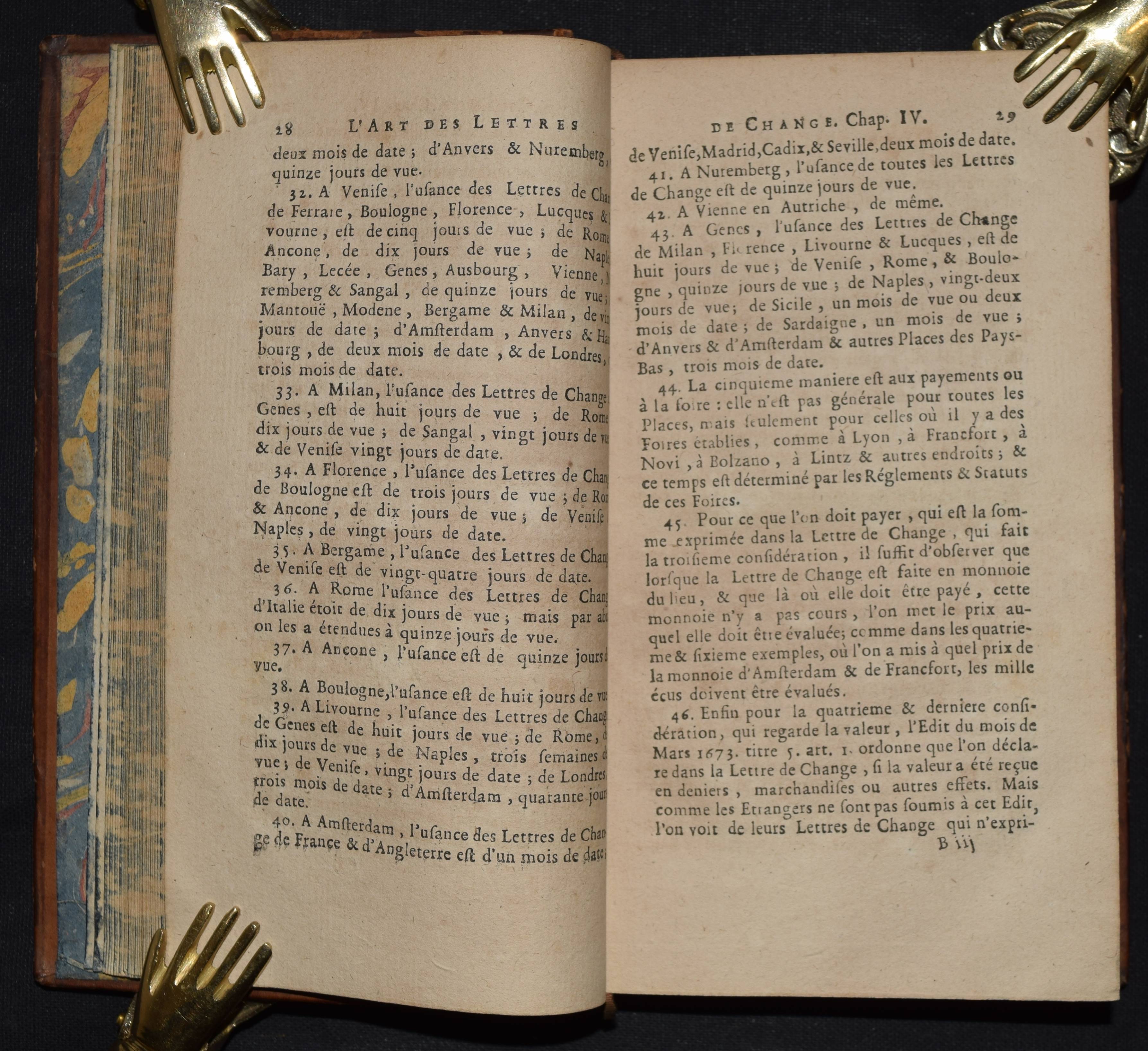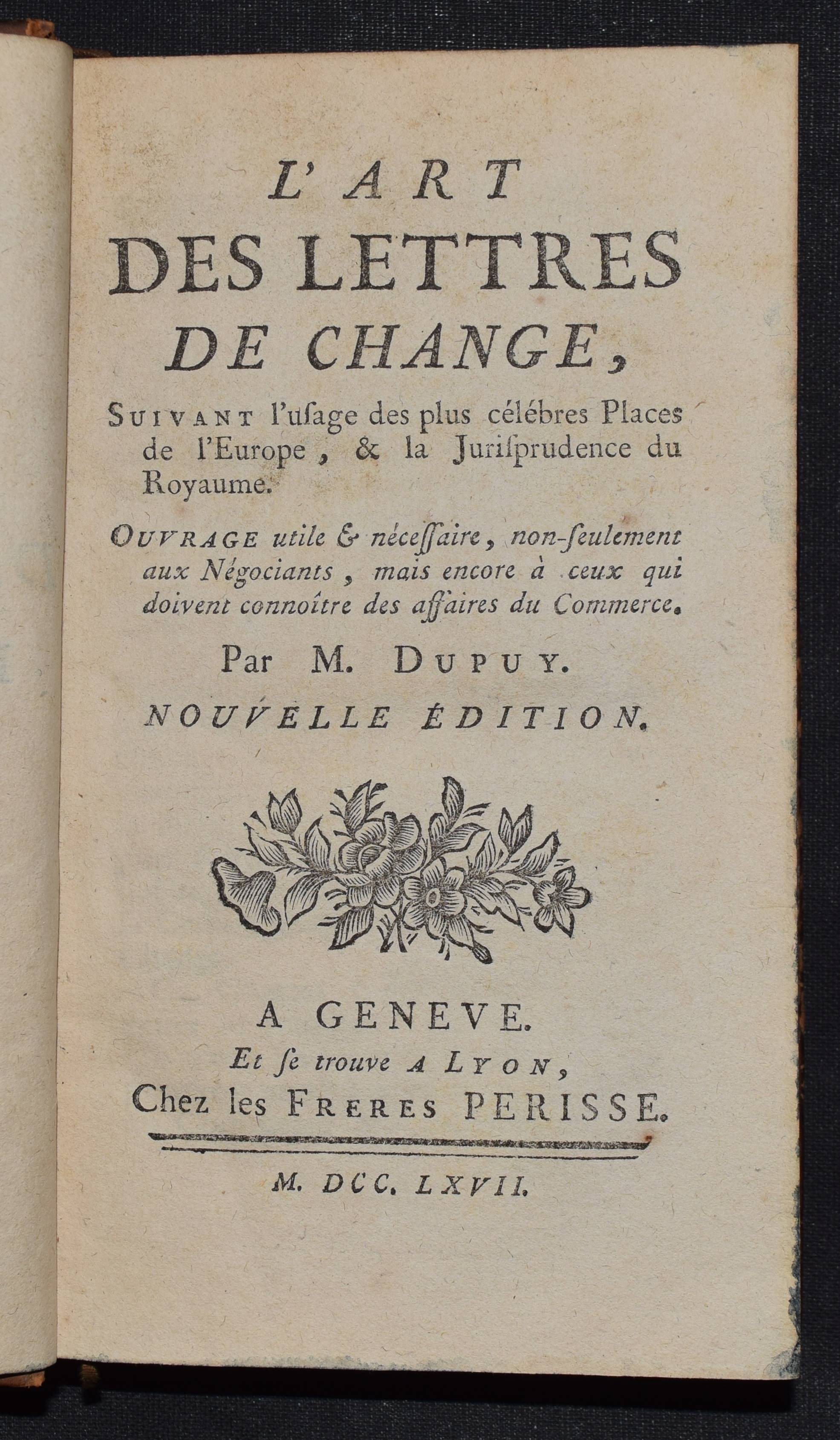 Dupuis (de la Serra, Jacques). L’art des lettres de change. Suivant l’usage des plus célébres places de l’Europe, & la jurisprudence du royaume. Ouvrage utile & nécessaire, non-seulement aux négociants, mais encore à ceux qui doivent connoitre des affaires du commerce. Nouvelle édition. Geneve et se trouve à Lyon, Chez les freres Perisse 1767. 8°. XXXIJ, 400 S. Ldr. d. Zt. mit goldgepr. Rückensch. u. reicher floraler Rückenverg. Sehr gutes dekorativ gebundenes Exemplar des erfolgreichen Handbuchs für Kaufleute.