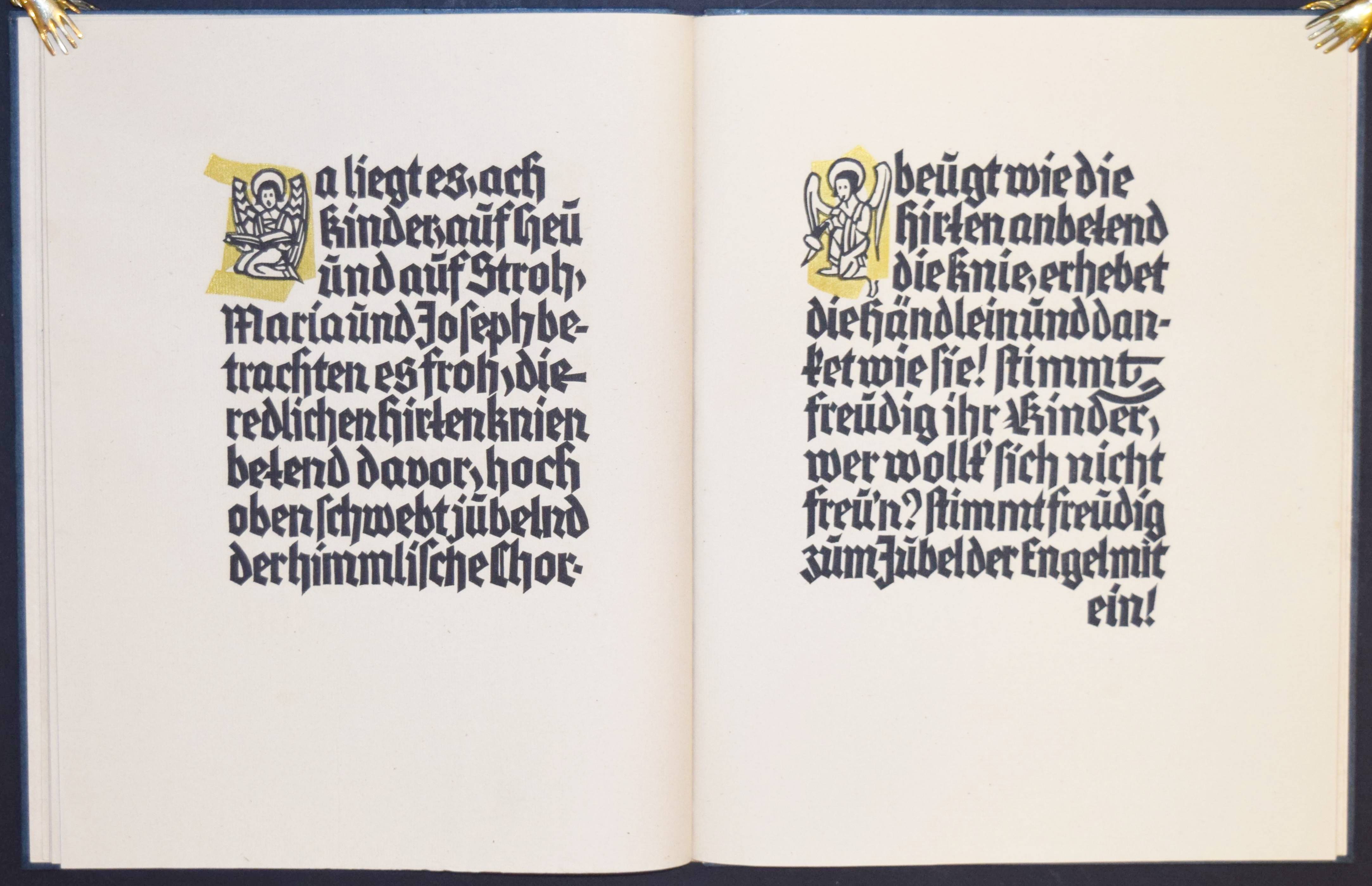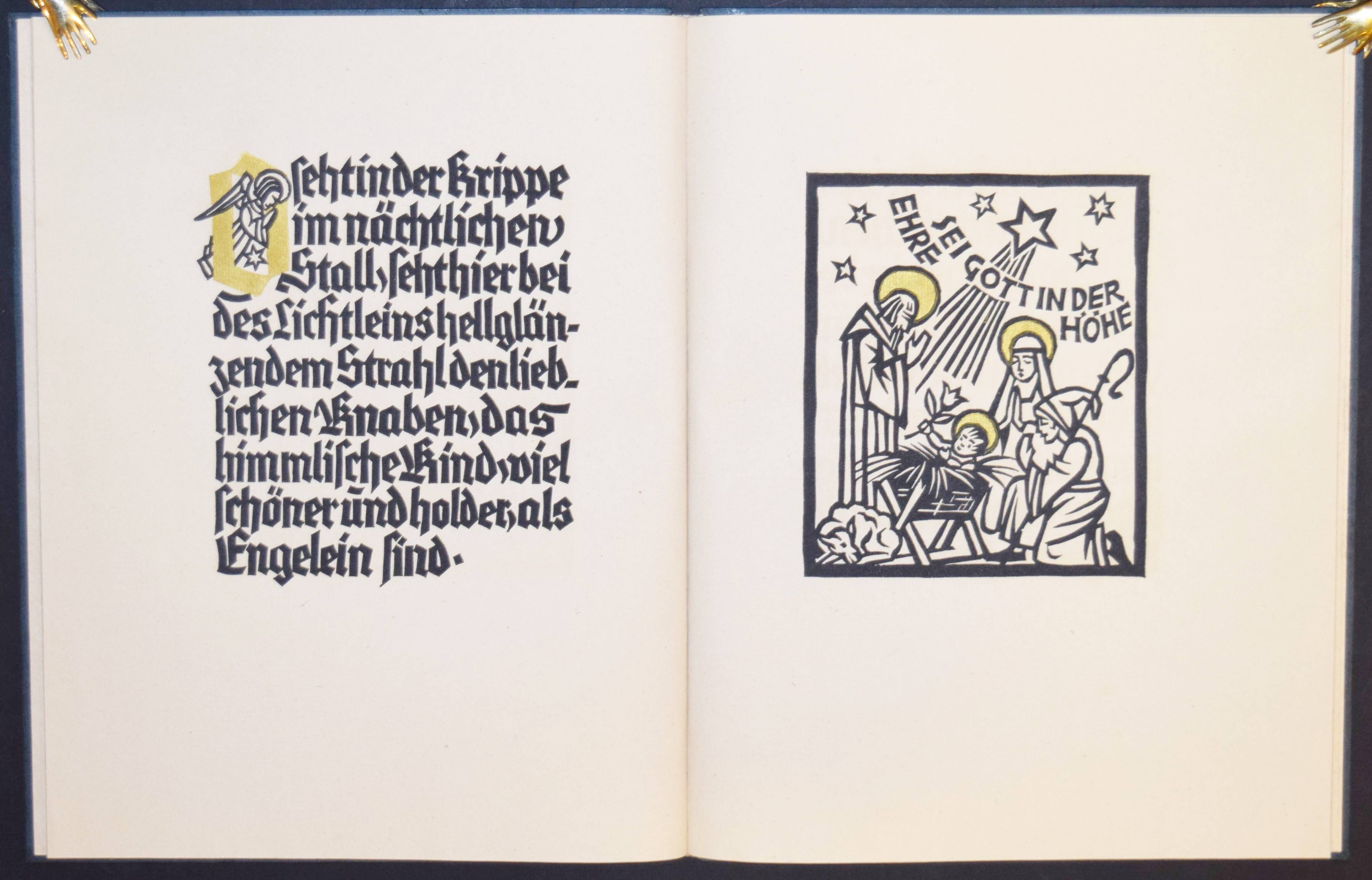 (Schmid, Christoph v.). Ihr Kinderlein kommet. O. O., Dr. u. J. (Leipzig, Staatliche Akademie für graphische Künste und Buchgewerbe um 1926). Folio. 5 Bl. (das letzte weiß) mit Text, Initialen und ganzseit. Illustration in Linolschnitt von Anton Lenhardt und Fritz Richter. Orig.-Blockbuch mit Pergamentrücken und reliefierten Pappdeckeln in priv. Halbleinenkassette. Nicht im Handel erschienener Privatdruck in kleiner Auflage. Halbleinenkassette am vorderen Gelenk angeplatzt, sonst sehr gutes Exemplar.