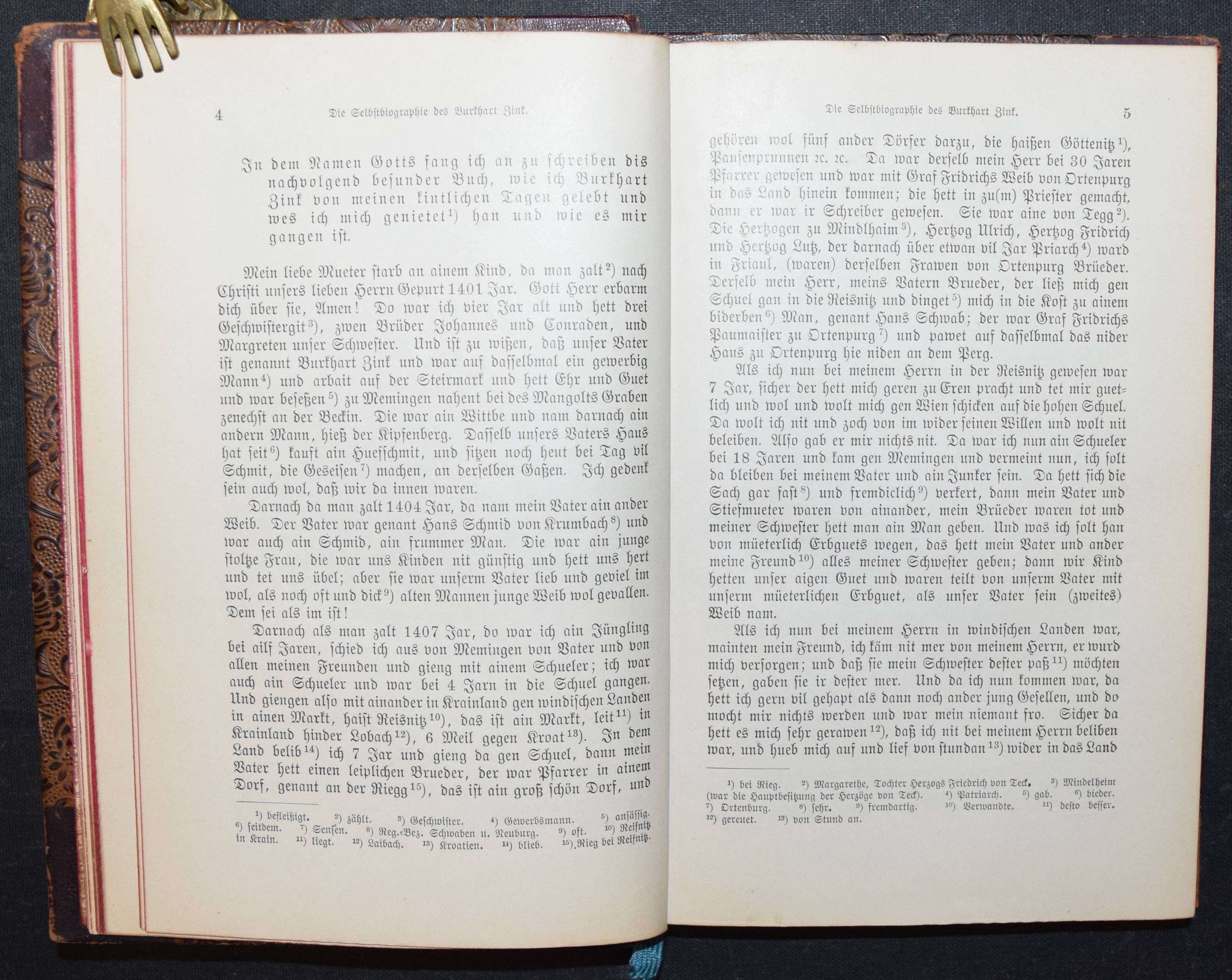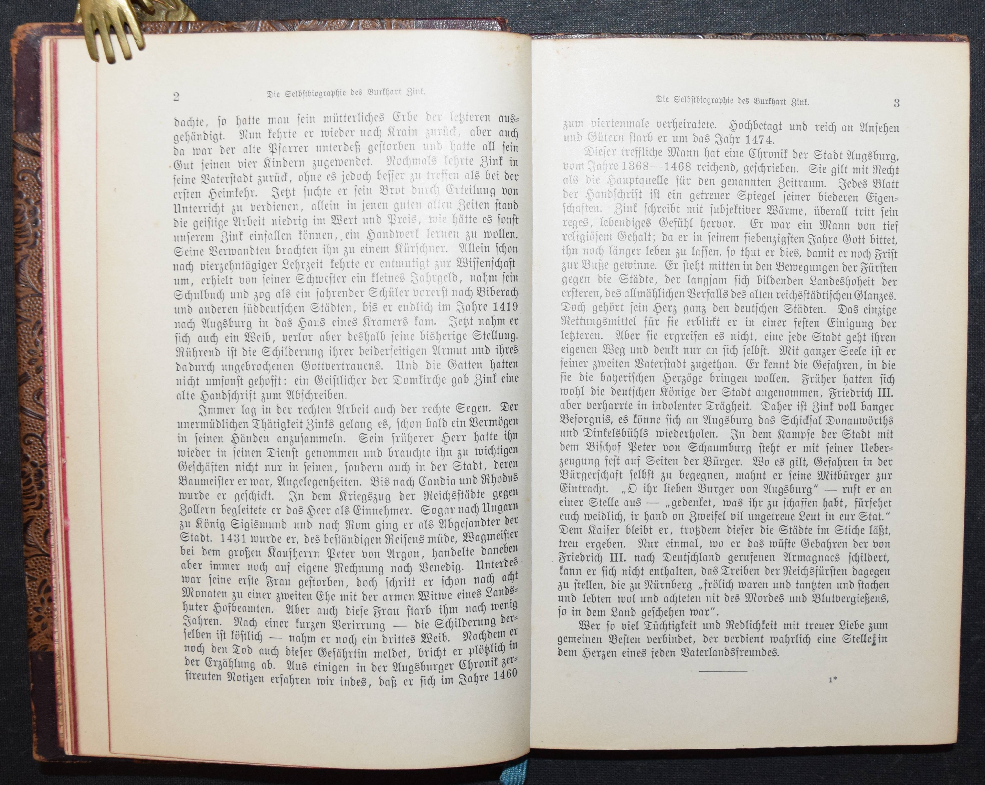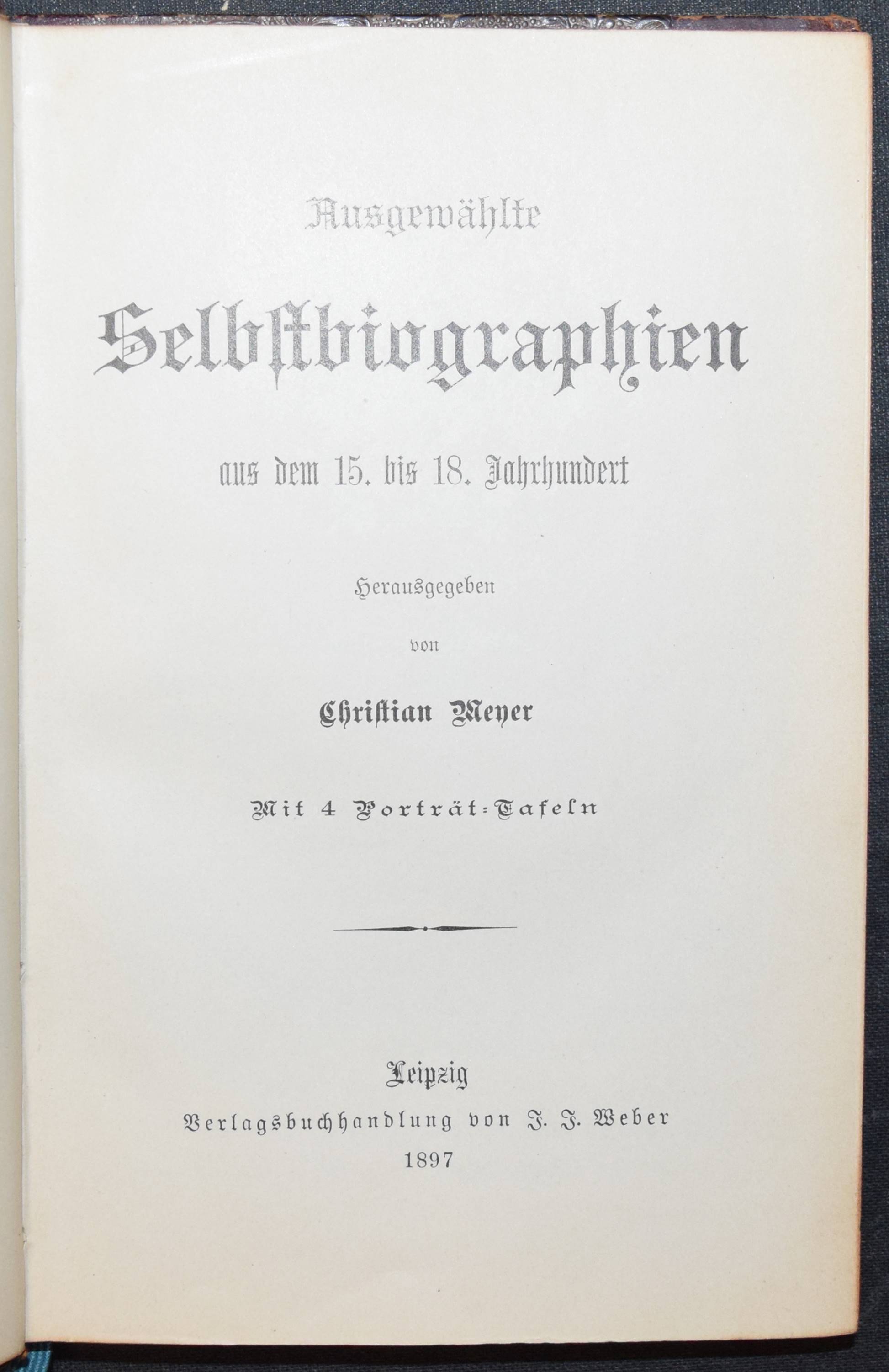 Meyer, Christian (Hrsg.). Ausgewählte Selbstbiographien aus dem XV. bis XVIII. Jahrhundert. Leipzig, Verlagsbuchhandlung von J. J. Weber 1897. 8°. XII, 248 S. mit 4 Porträt-Tafeln. HLdr. d. Zt. Einband etwas berieben, Rücken am gelenk angeplatzt, sonst gutes Exemplar.