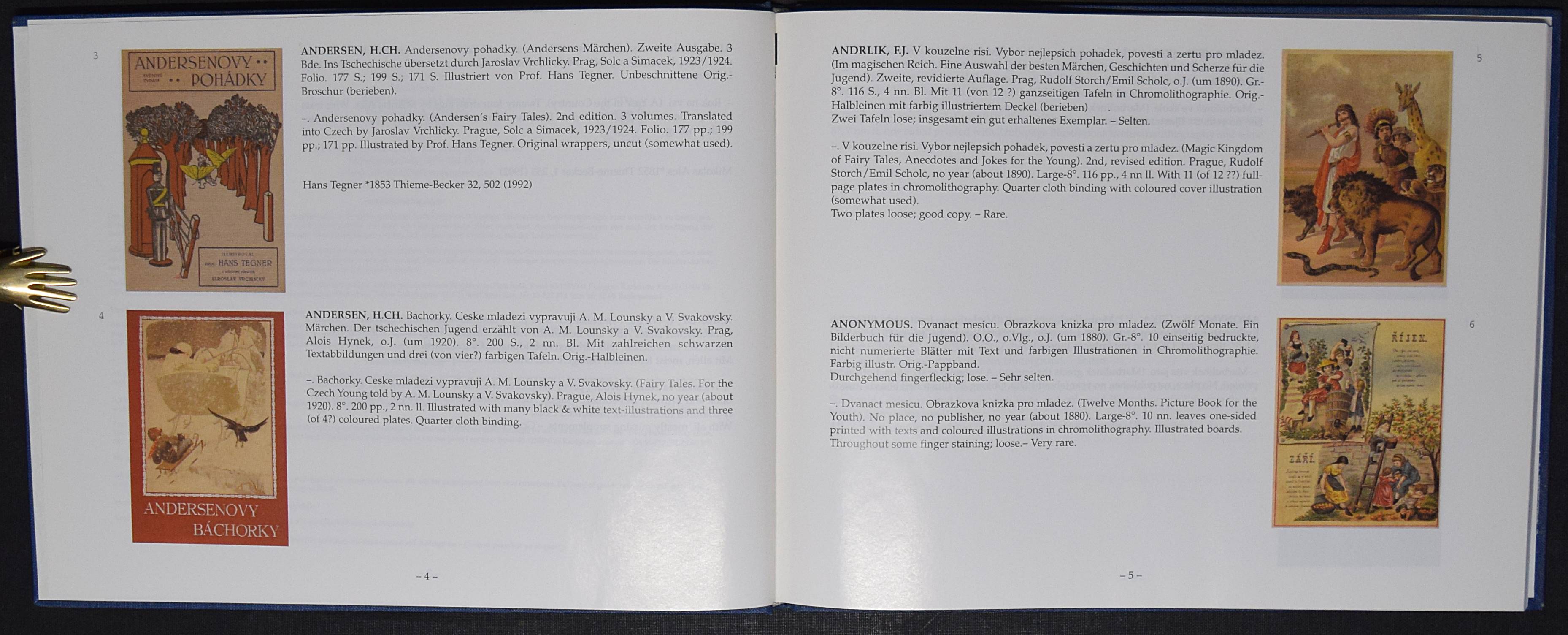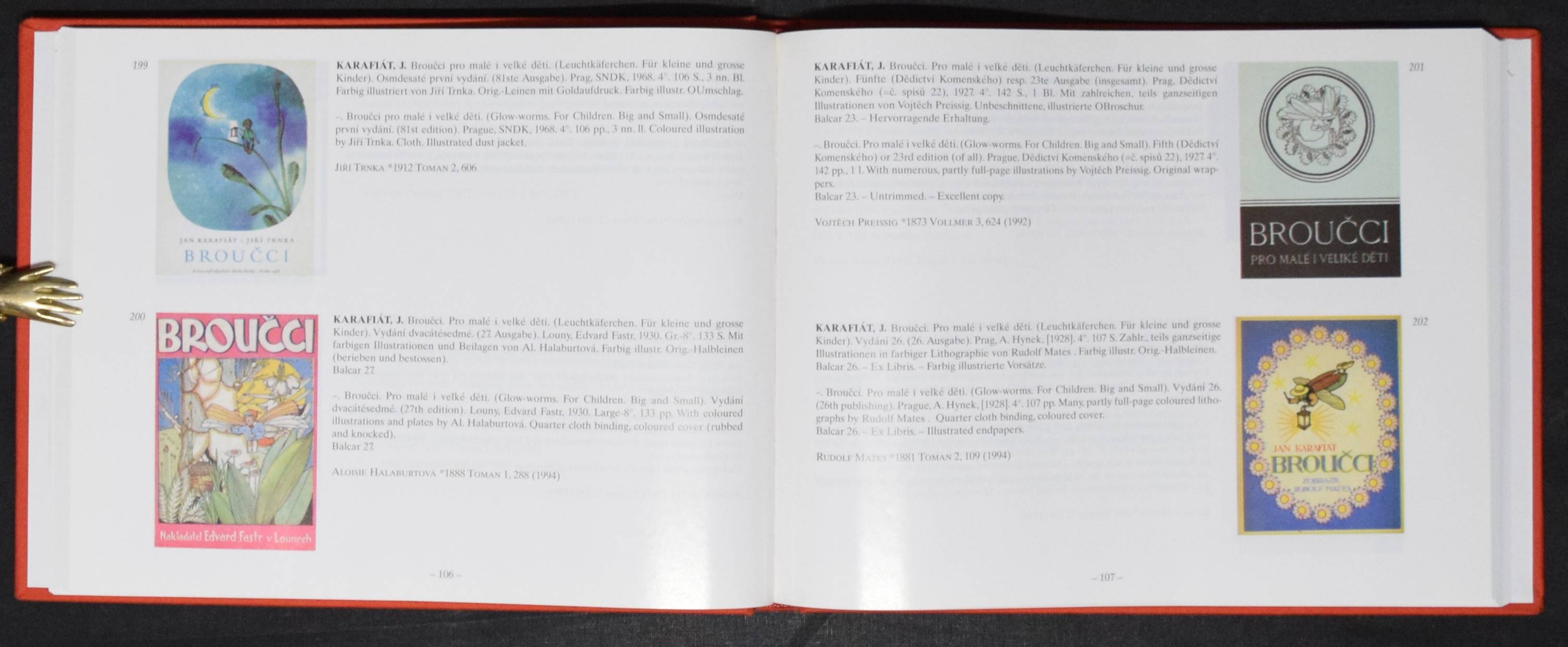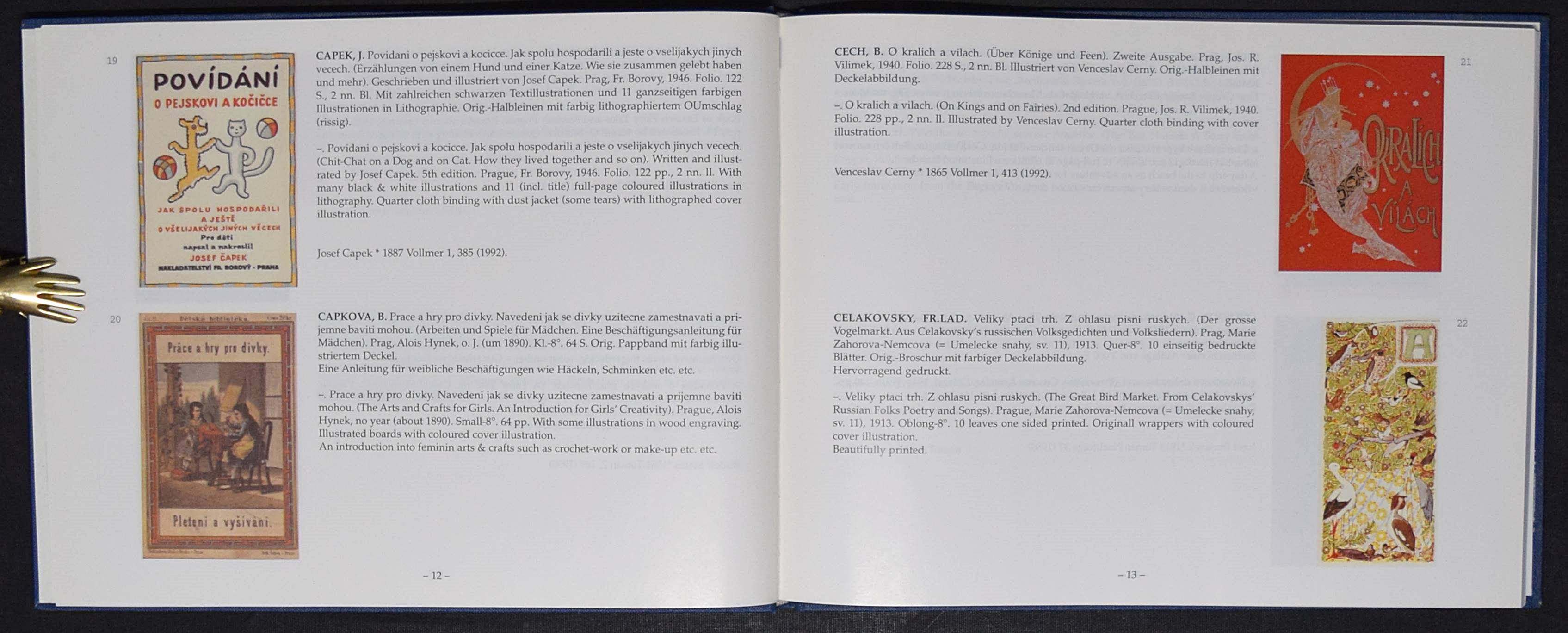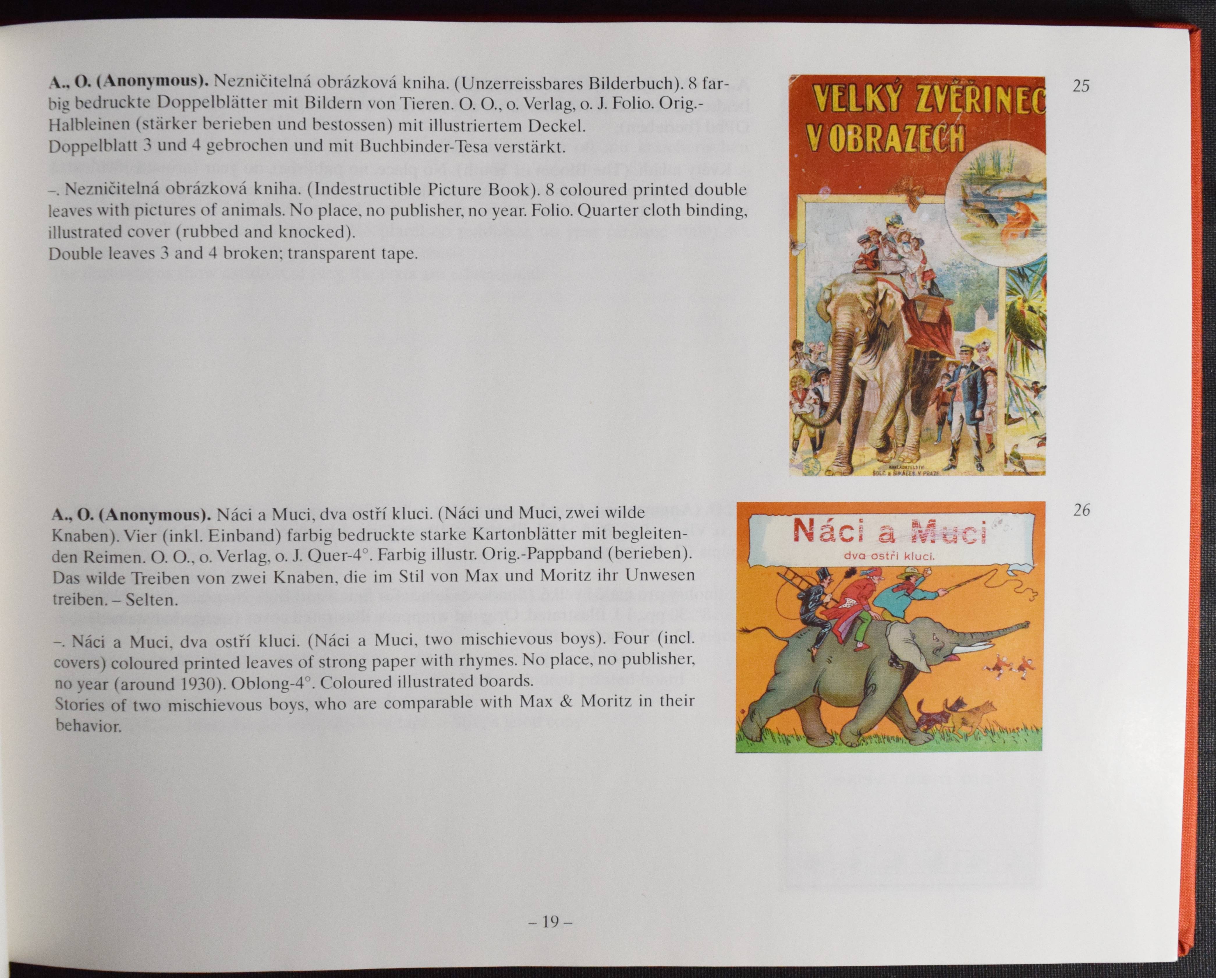 Beran, Regina u. Georg J. Tschechische Kinderbücher I. u. II. Czech children’s books. (Antiquariatskataloge). 2 Bände. Basel, Buchantiquariat „Am Rhein“ (1996-1997). Quer-8°. 126 S., 1 Bl.; 275 S., 6 Bl. mit zahlr. farb. Abb. OLn. mit farb. Deckelbildern. Sehr gute Exemplare.