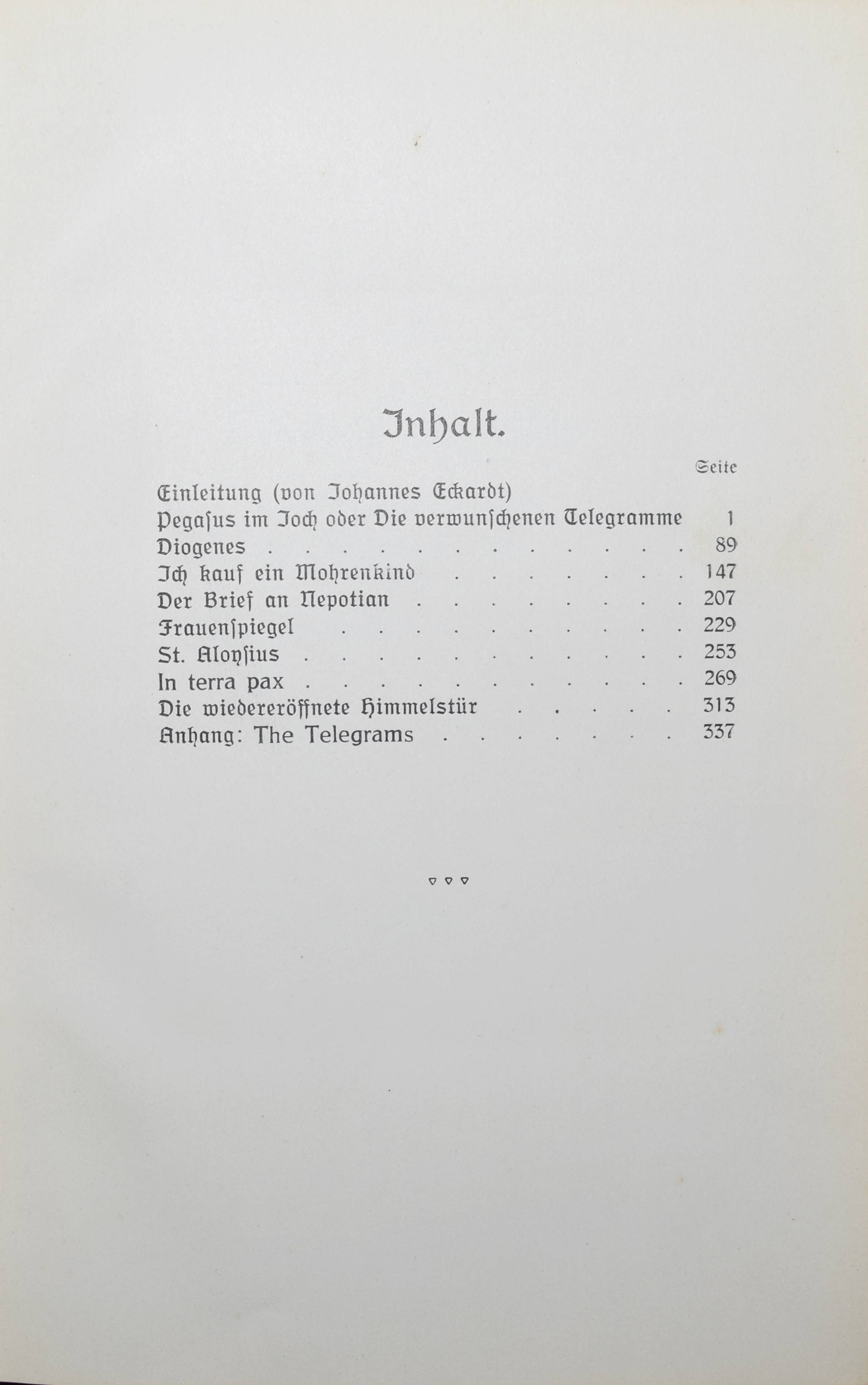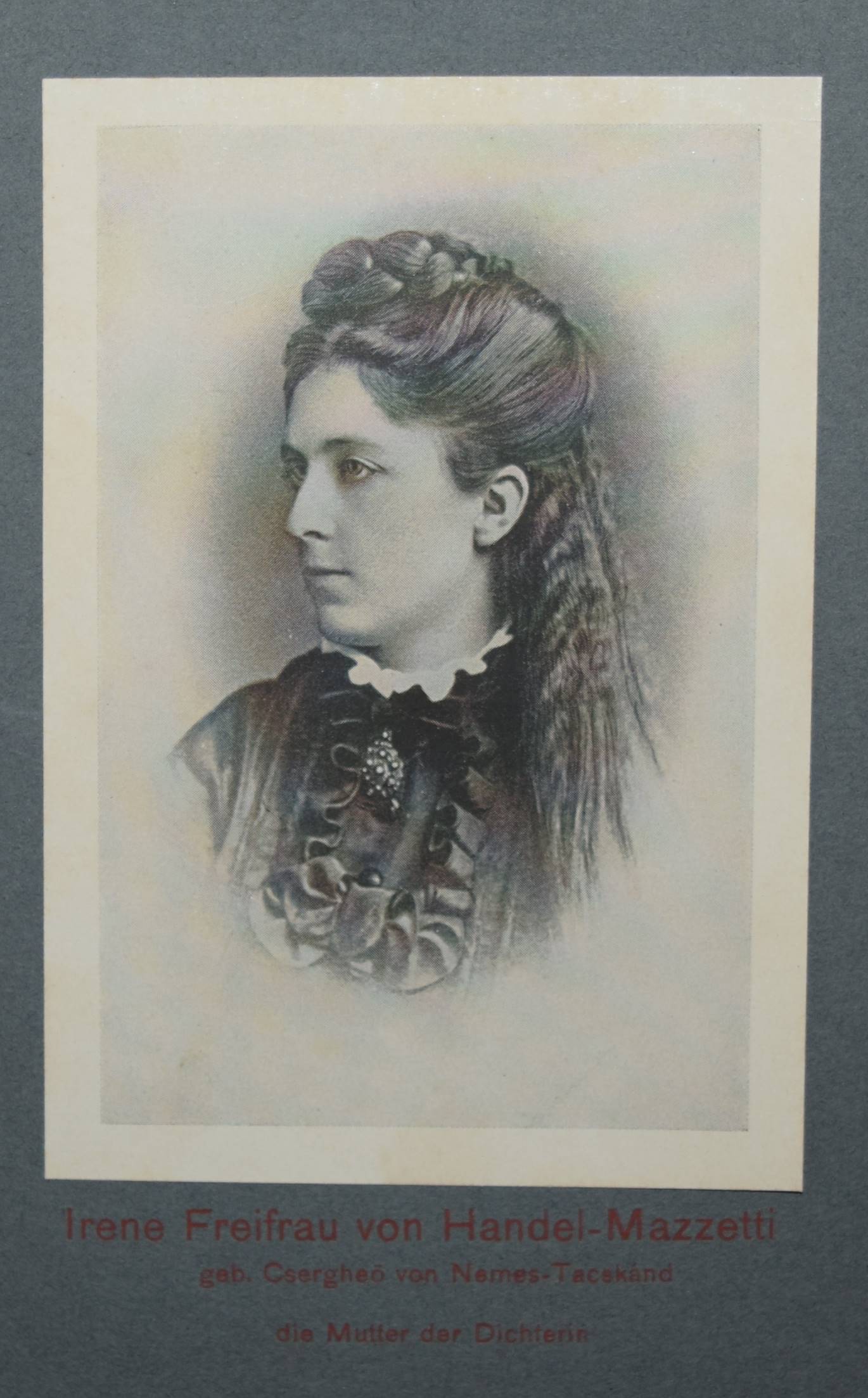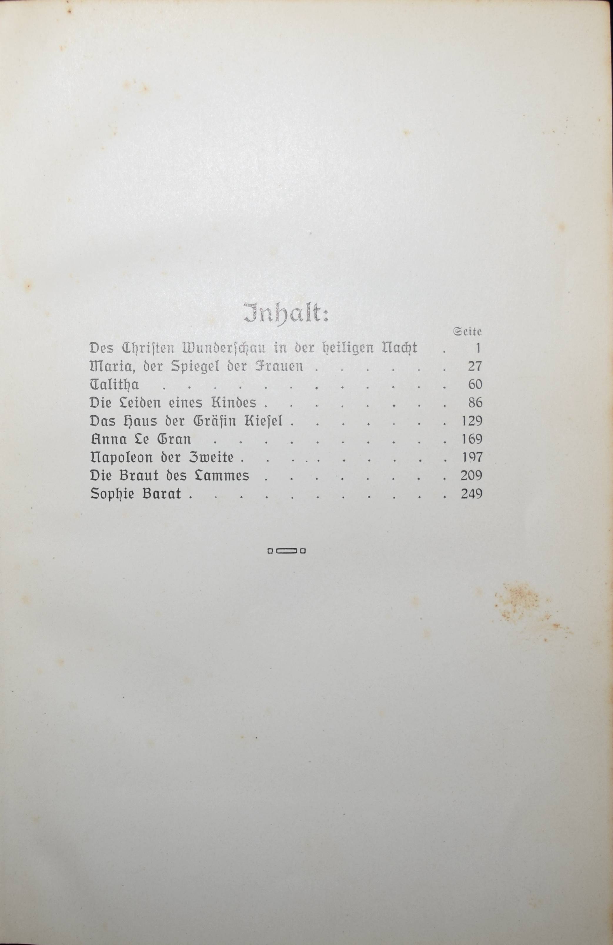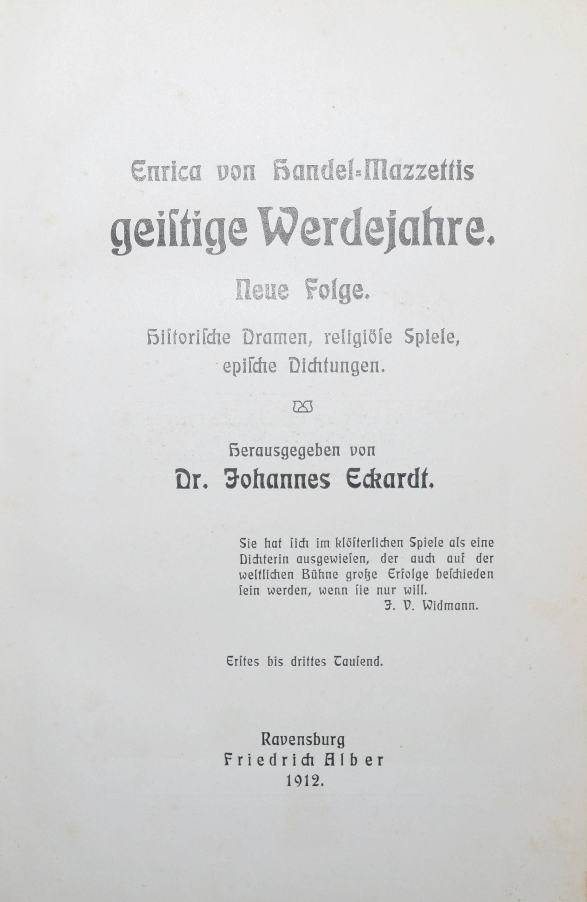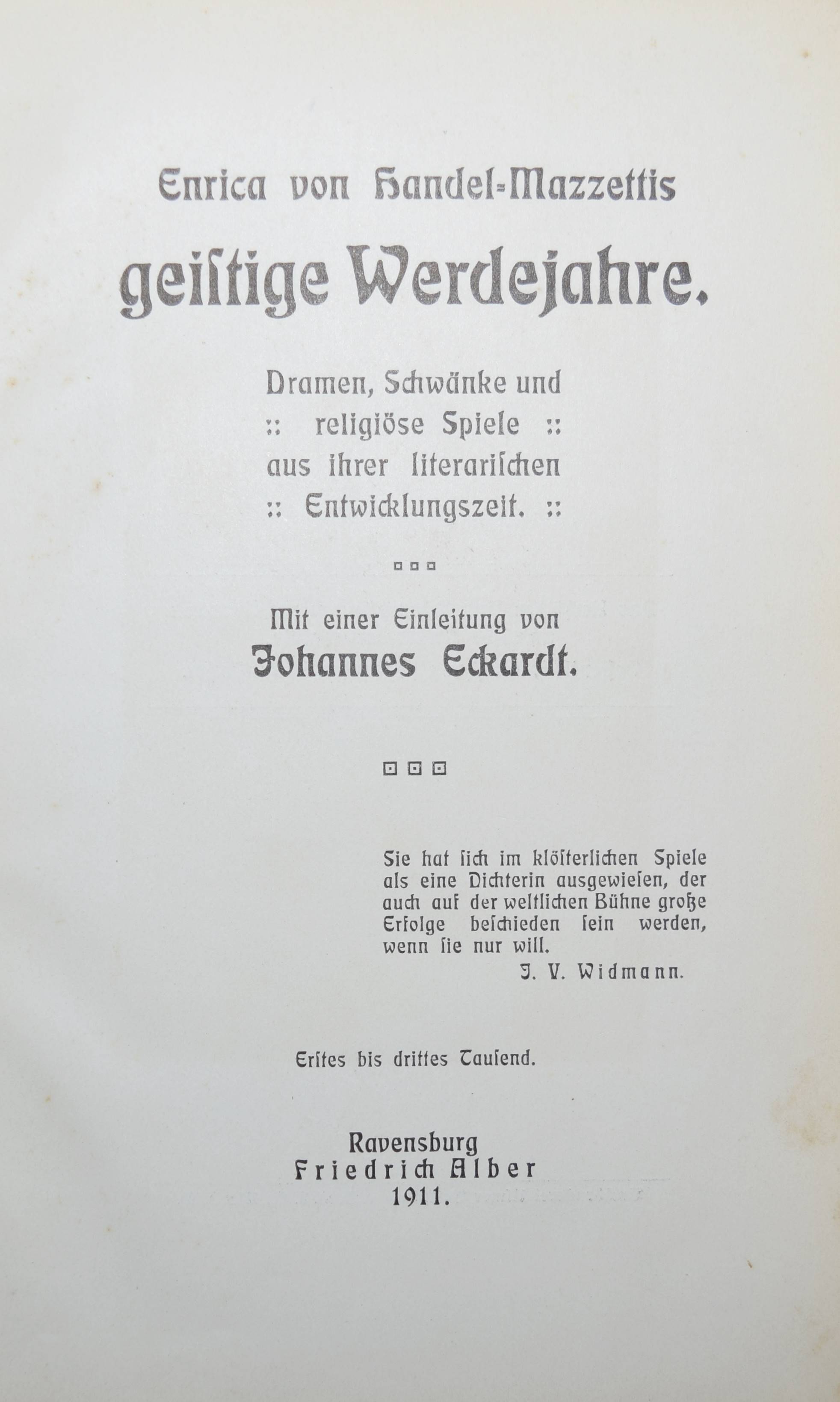 Handel-Mazzetti, Enrica von. 1. Geistige Werdejahre Dramen, Schwänke und religiöse Spiele aus ihrer literarischen Entwicklungszeit. 2. Geistige Werdejahre. Neue Folge. Historische Dramen, religiöse Spiele, epische Dichtungen. 1.-3. Tausend. 2 Bände. Ravensburg, Friedrich Alber 1911-1912 8°. XVI, 376 S.; 311 S. mit 4 montiert. Abb. OLn. mit goldgepr. Rücken- u. Deckeltitel. Etwas stockfl., sonst gute Exemplare.