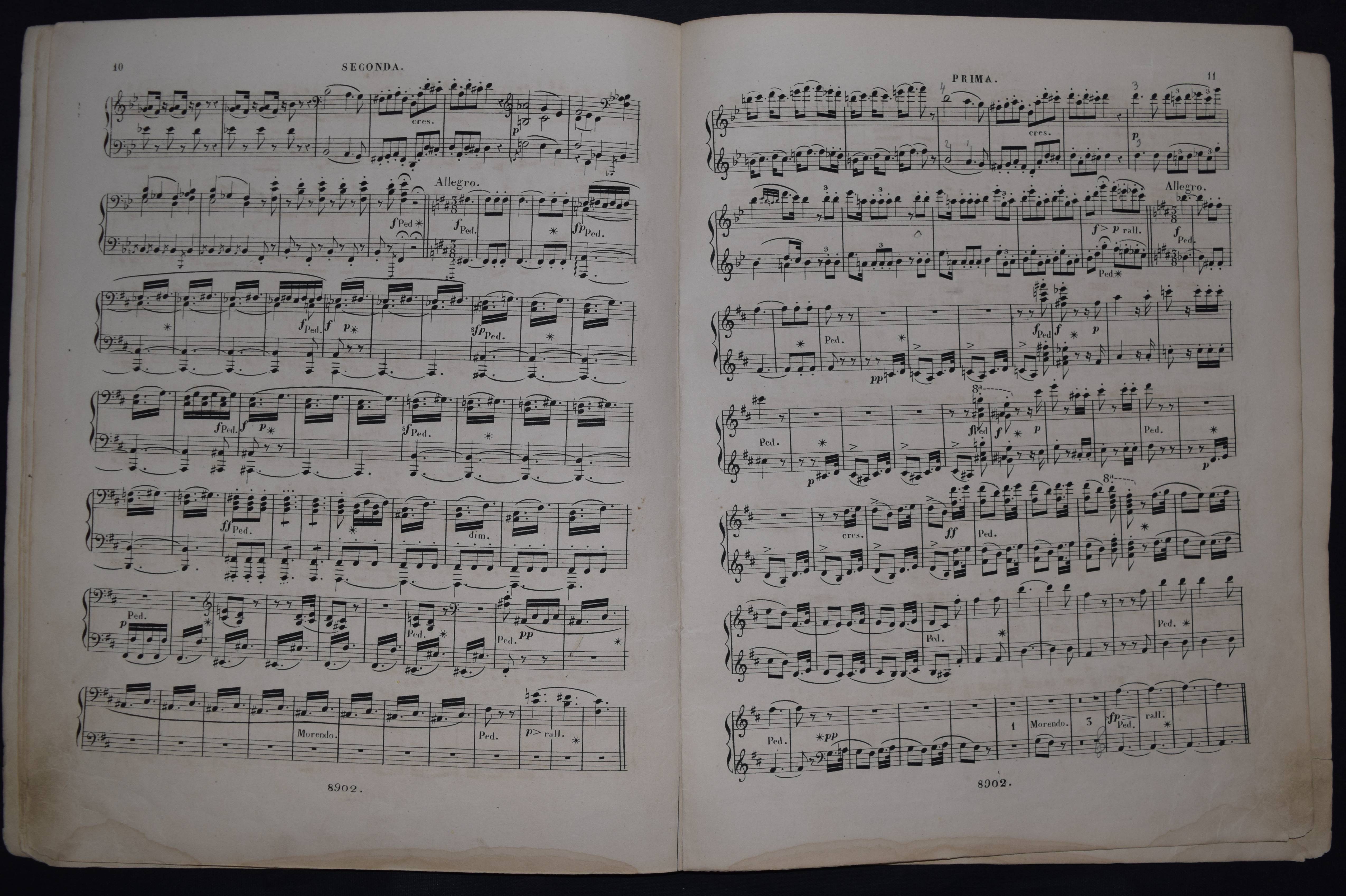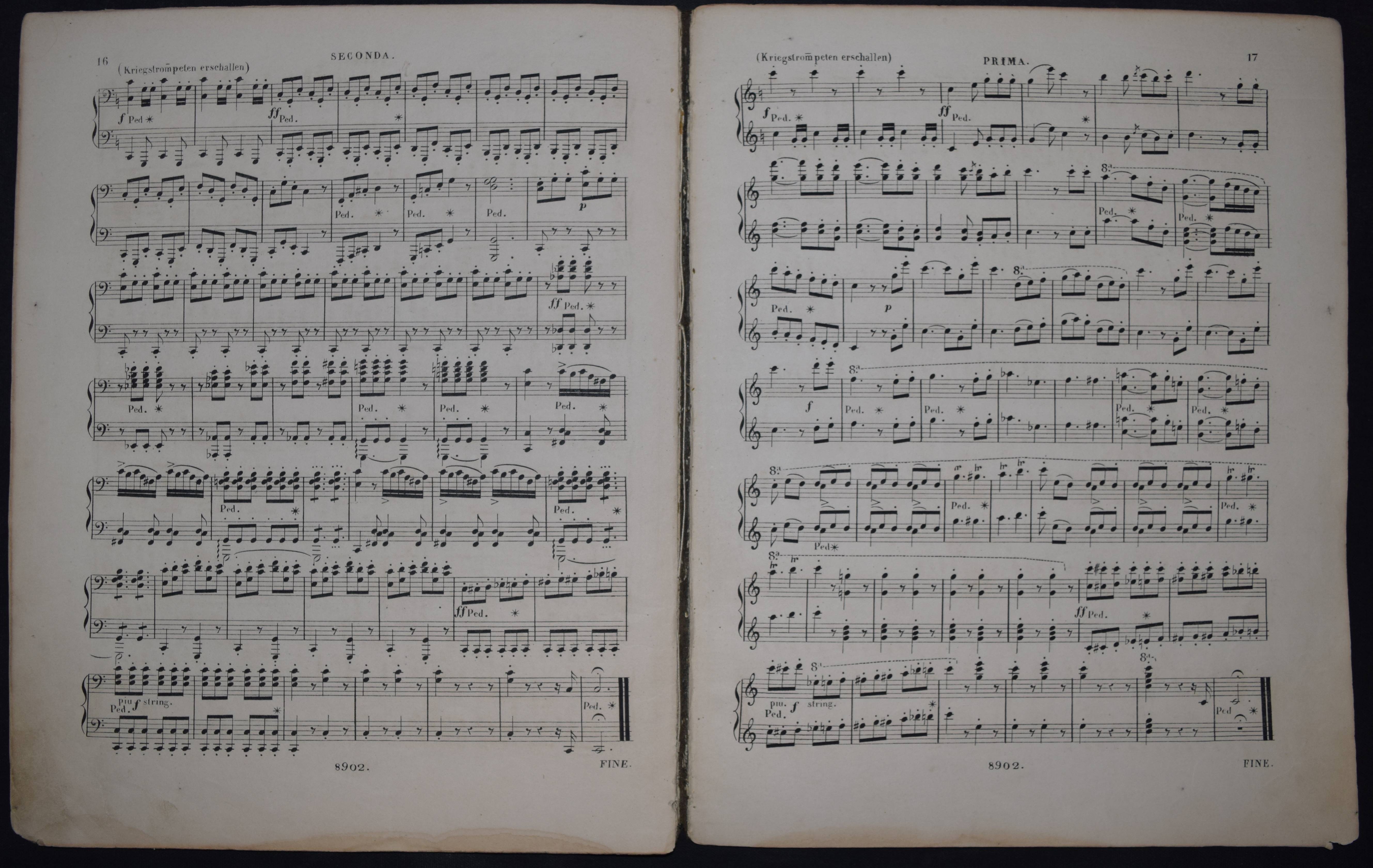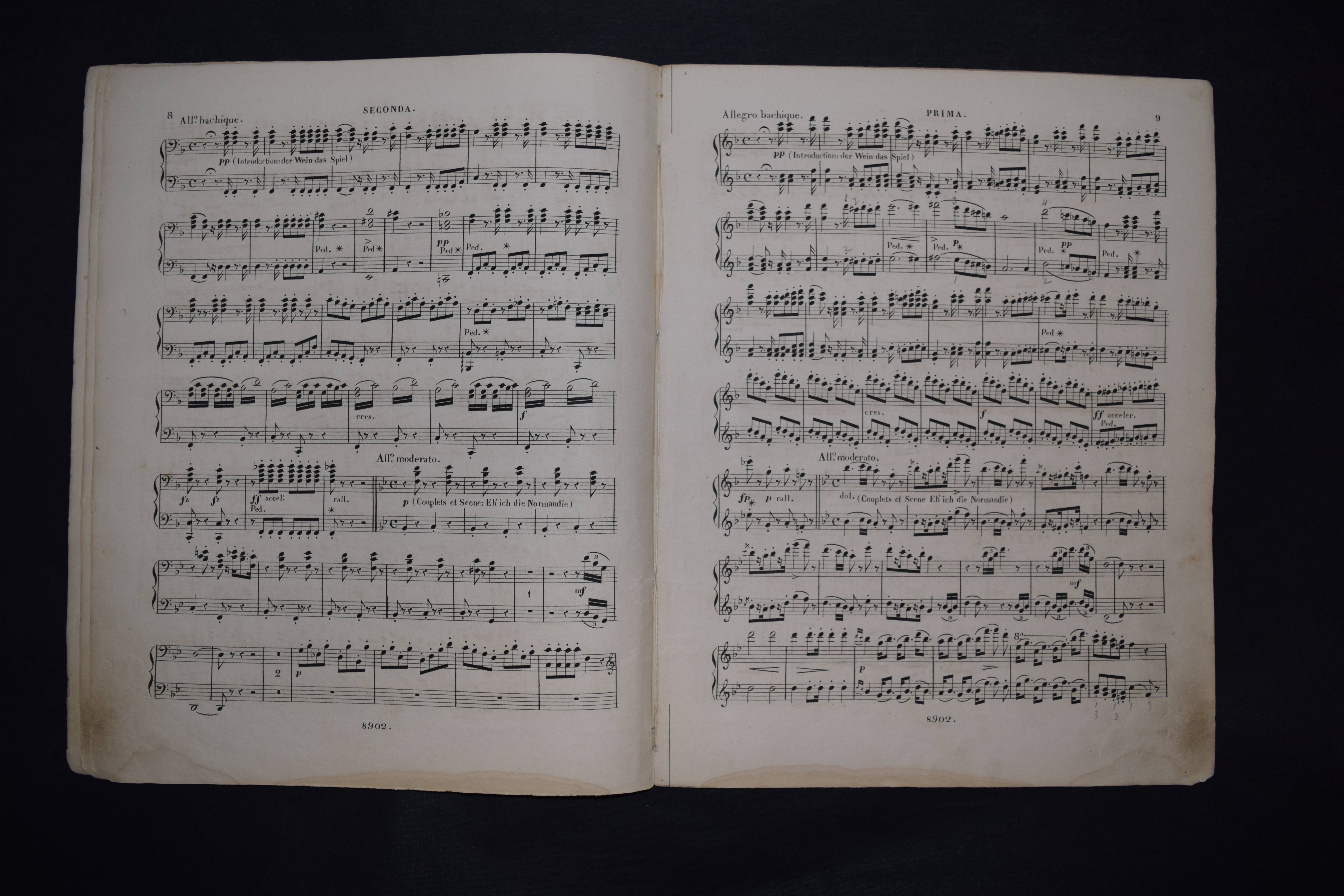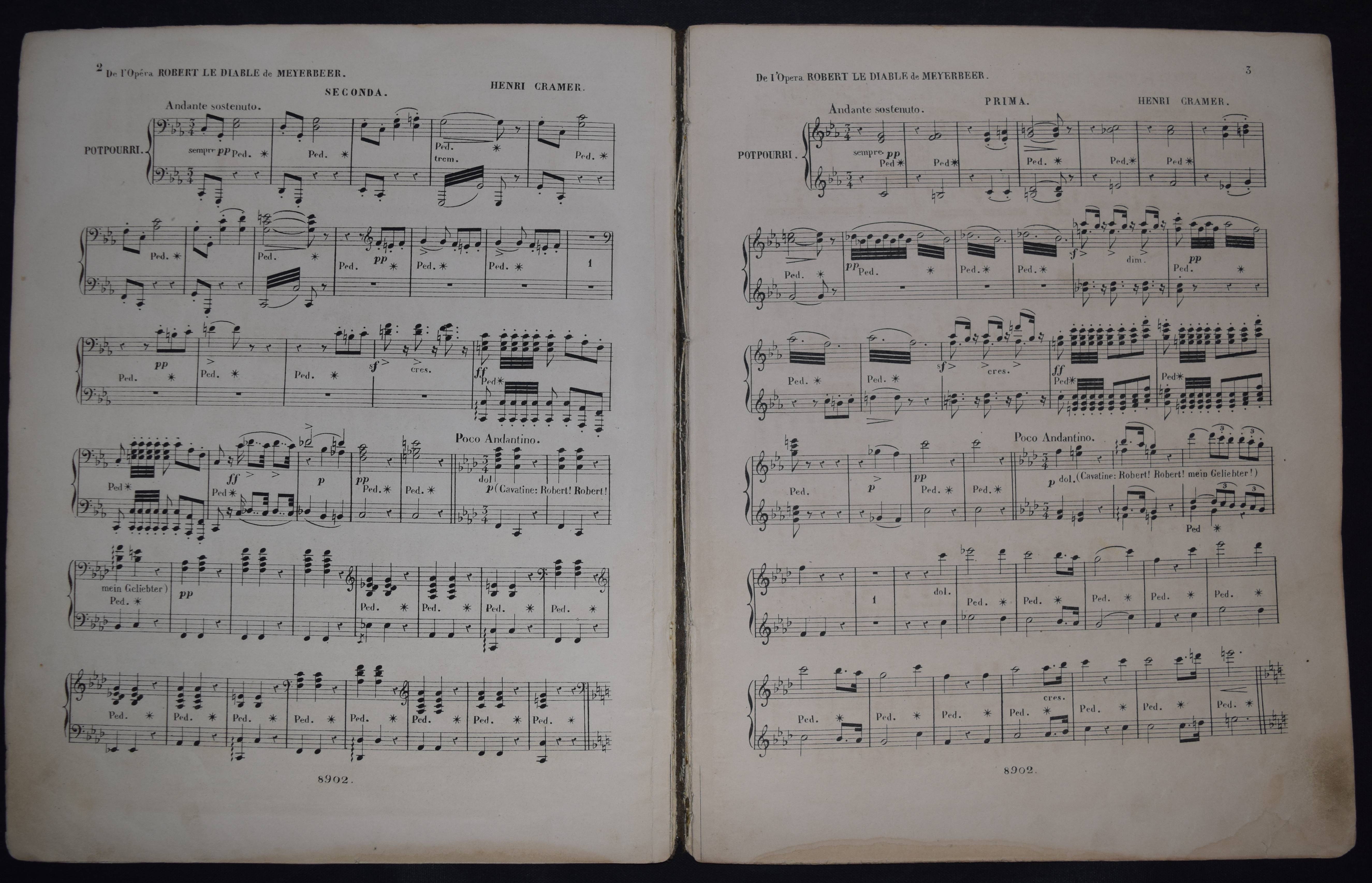 Cramer, Henri. Potpourries sur des motifs d’Operas favoris pour le piano. Mainz, Schott o. J. (um 1850). 4°. 17 S. mit lithogr. illustr. Titel (Lyra) u. lithogr. Noten. Kart. d. Zt. mit Leinenrücken. Mit Potpourris aus bekannten Opern von Mozart, Beethoven, Rossini, Verdi, Wagner, Weber u.v.a. – Laut Handlexikon der Tonkunst handelt es sich beim Herausgeber entweder um den Frankfurter Komponisten Heinrich Cramer (1818-1877) oder ein von mehreren Personen in Paris verwendetes Pseudonym. – Umschlag angestaubt u. etwas fleckig, N.a.V., Innengelenk nach S. 2 angebrochen, stellenweise etwas fingerfleckig.