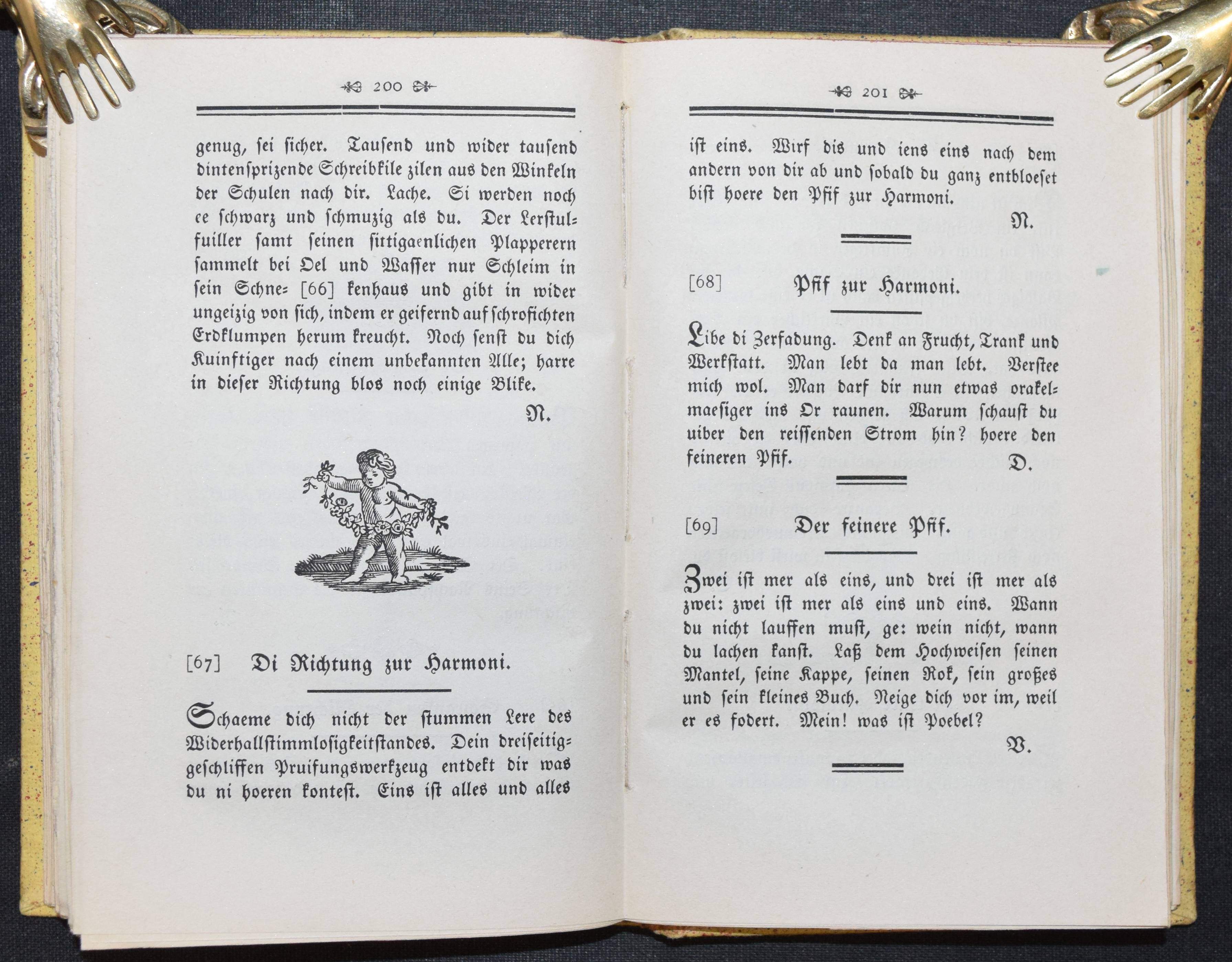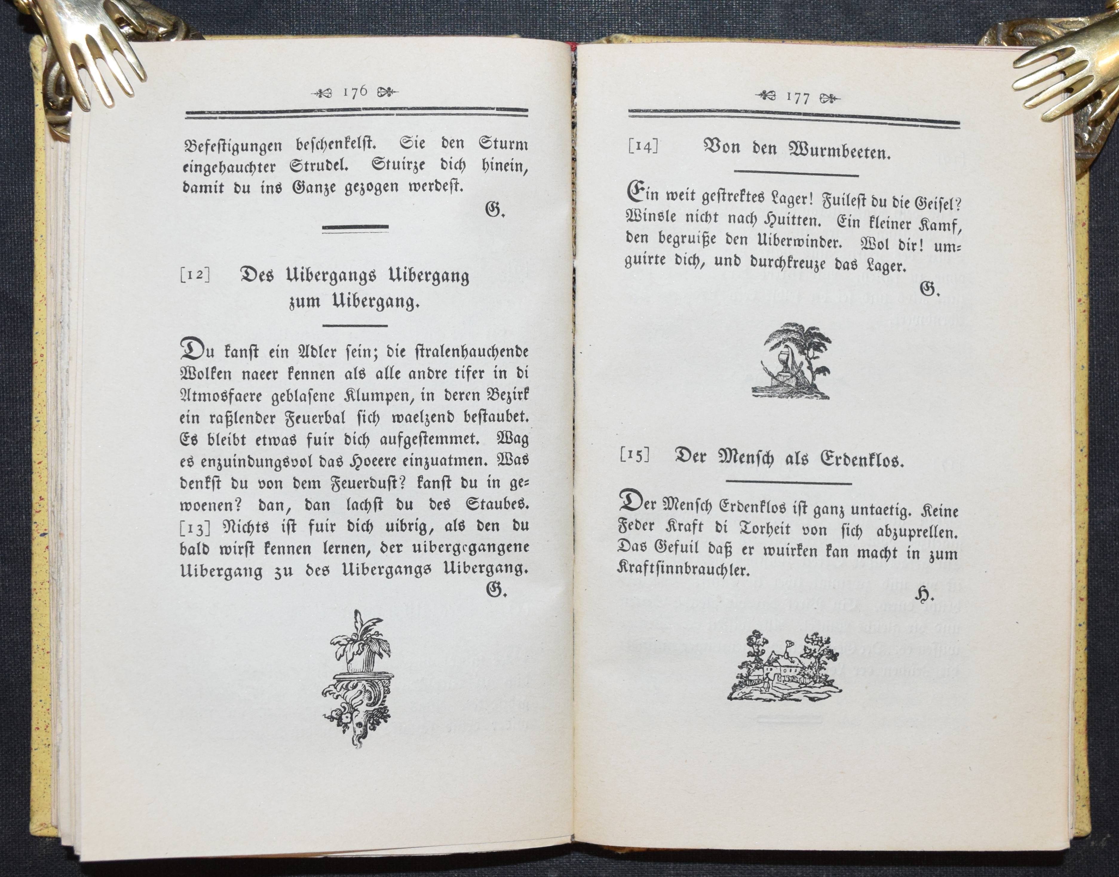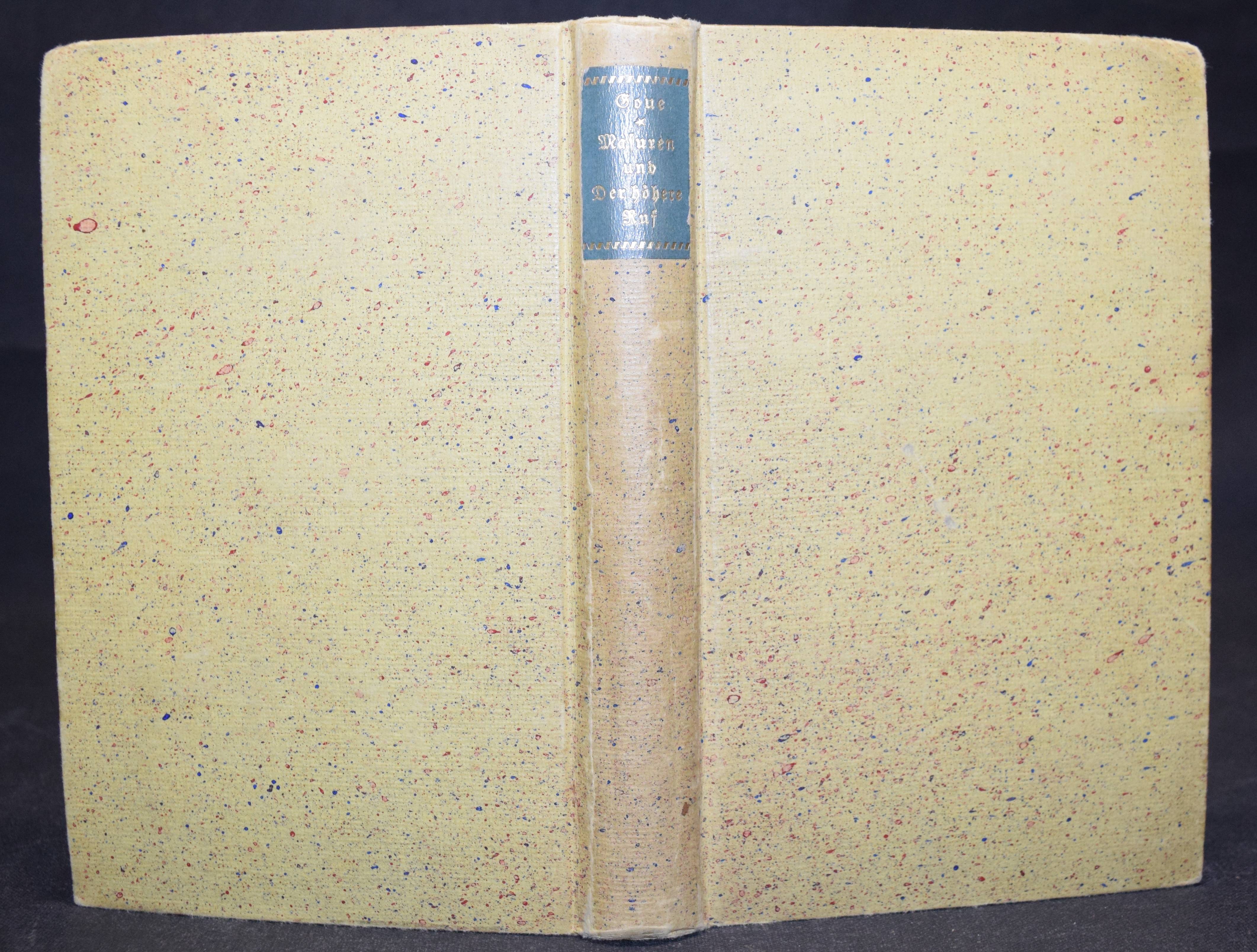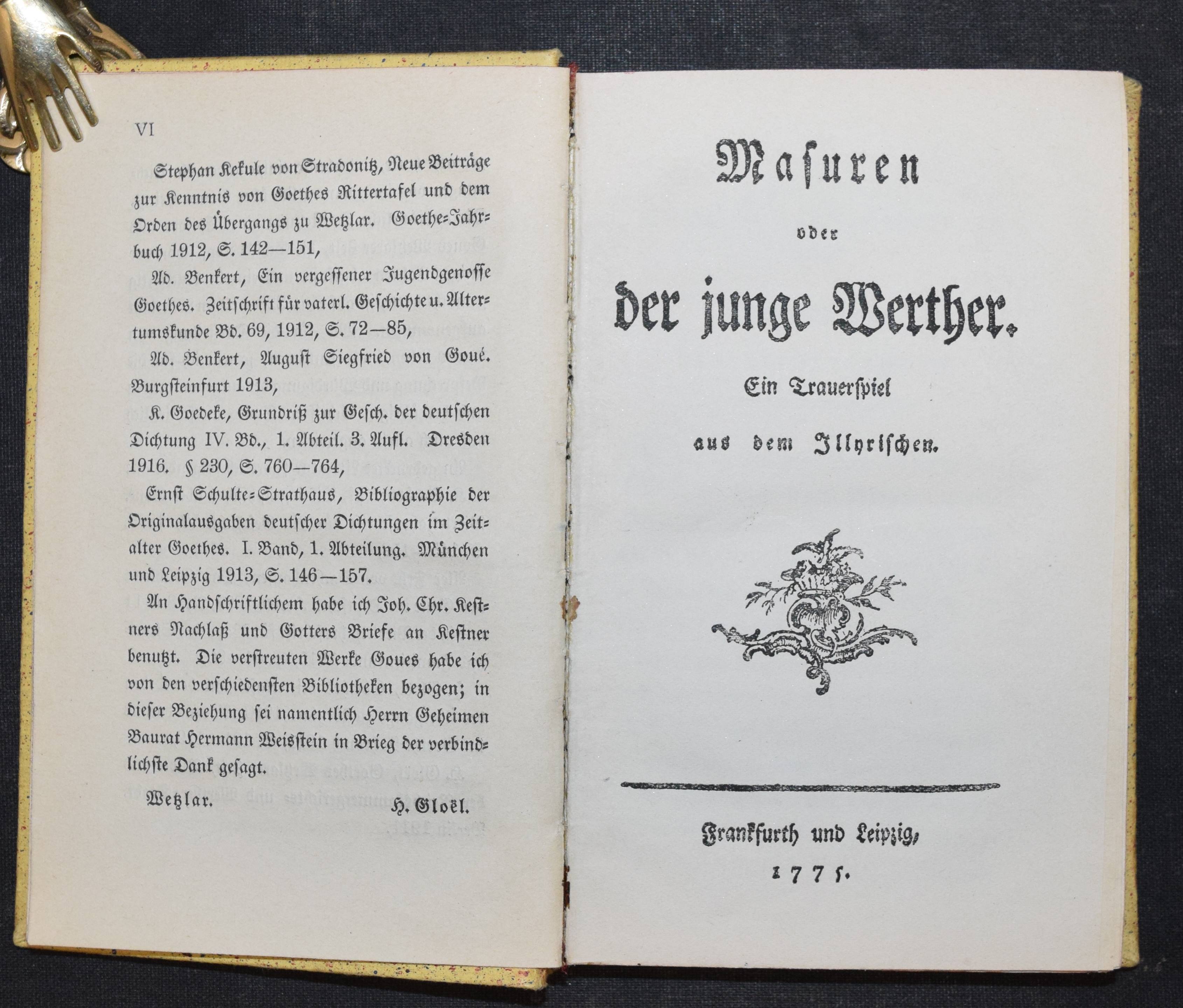 Goue, August Siegfried v. (Werke). Auswahl von Karl Schüddekopf. Einführung von Heinrich Gloël. Weimar, Gesellschaft der Bibliophilen 1917. Kl.-8°. 281 S. mit Frontispiz. OPbd. mit goldgepr. Rückenschild. (Veröffenlichung der Gesellschaft der Bibliophien, Band 27). Enthält: Masuren oder der junge Werther. Ein Trauerspiel aus dem Illyrischen; Der hoeere Ruf; Der feinere Pfif. – Der Jurist, Schriftsteller und FreimaurerAugust Siegfried v. Goué (1743- 1789), lernte nach seiner Entlassung am Reichskammergericht 1771 in Wetzlar Goethe kennen, der dort im Mai 1772 Rechtspraktikant wurde. Goué war eine treibende Kraft im theatralischen und geselligen Leben der jüngeren Juristen in Wetzlar. Er schrieb Theaterstücke u. Gelegenheitsgedichte, gab eine Wochenschrift heraus, parodierte den Hofstaat und tat sich mit Mystifikationen hervor. Dem dort gegründeten „Ritterbund“ gehörten u. a. Goethe als „Götz von Berlichingen“ und Karl Wilhelm Jerusalem als „Masuren“ an. Über dieses Treiben berichtet Goethe im 12. Buch von „Dichtung und Wahrheit“. Bekannt wurde Goué durch seine Schriften über die Freimaurerei und sein verwirrendes Spiel mit Geheimorden und ihren Riten. – Gutes Exemplar.