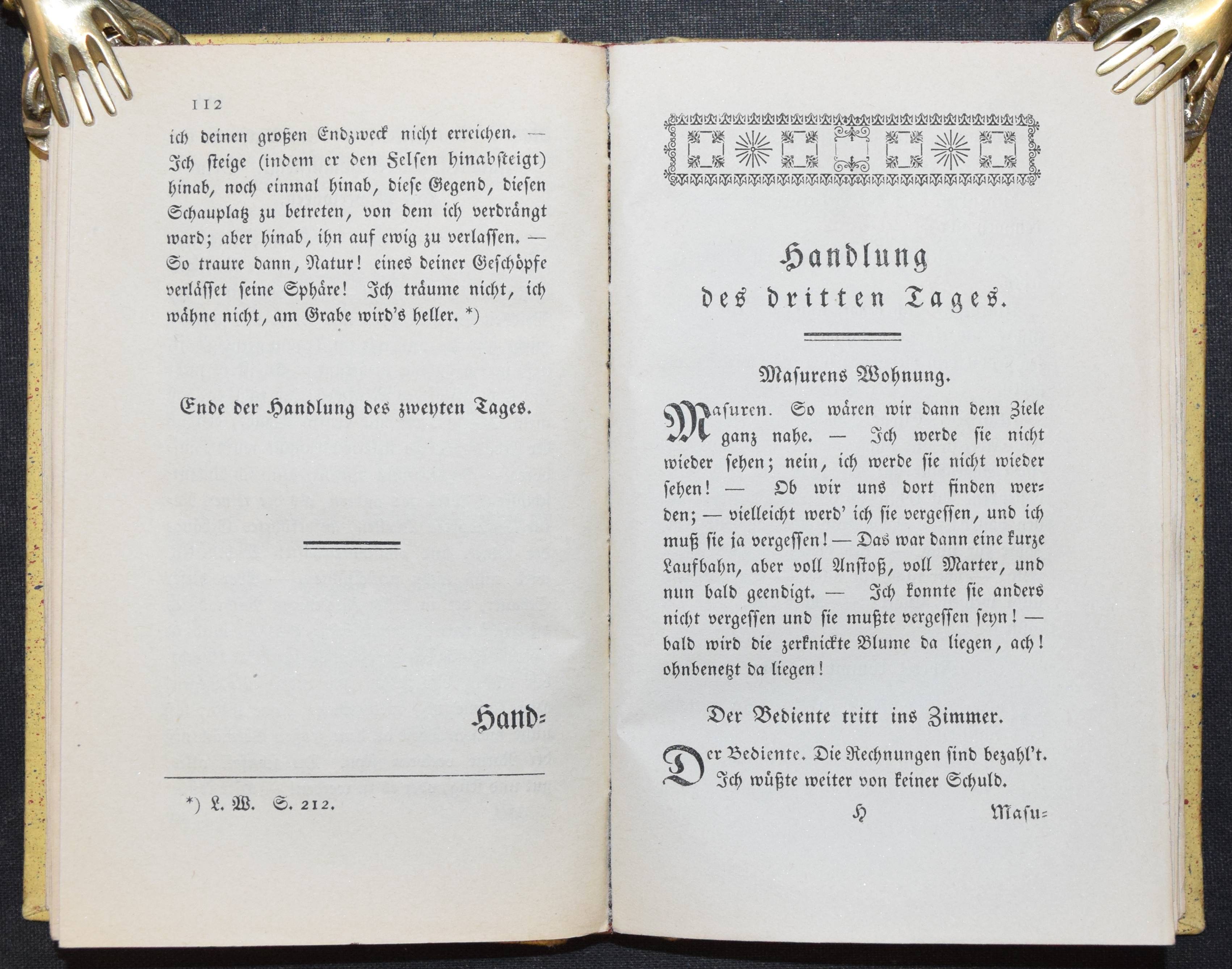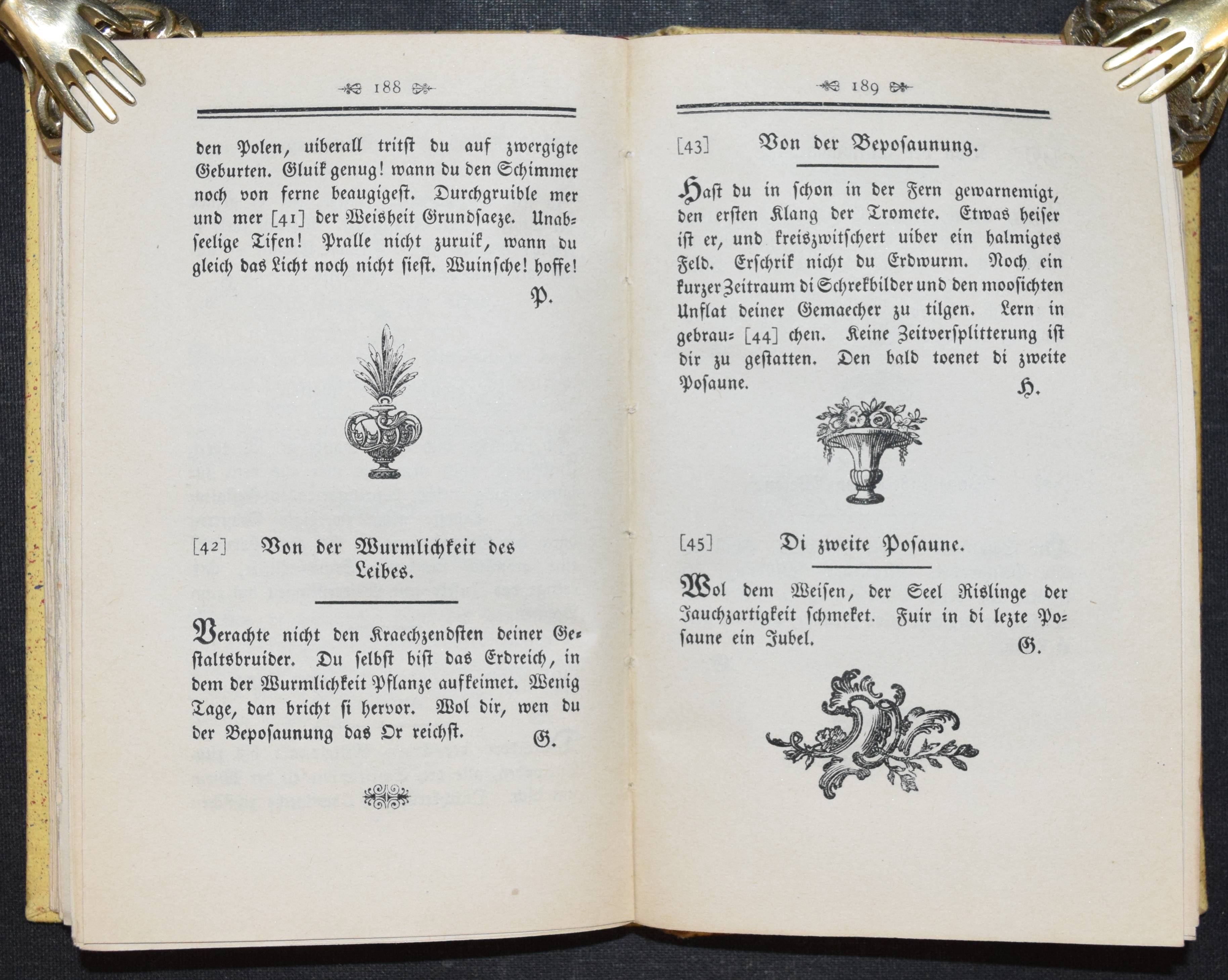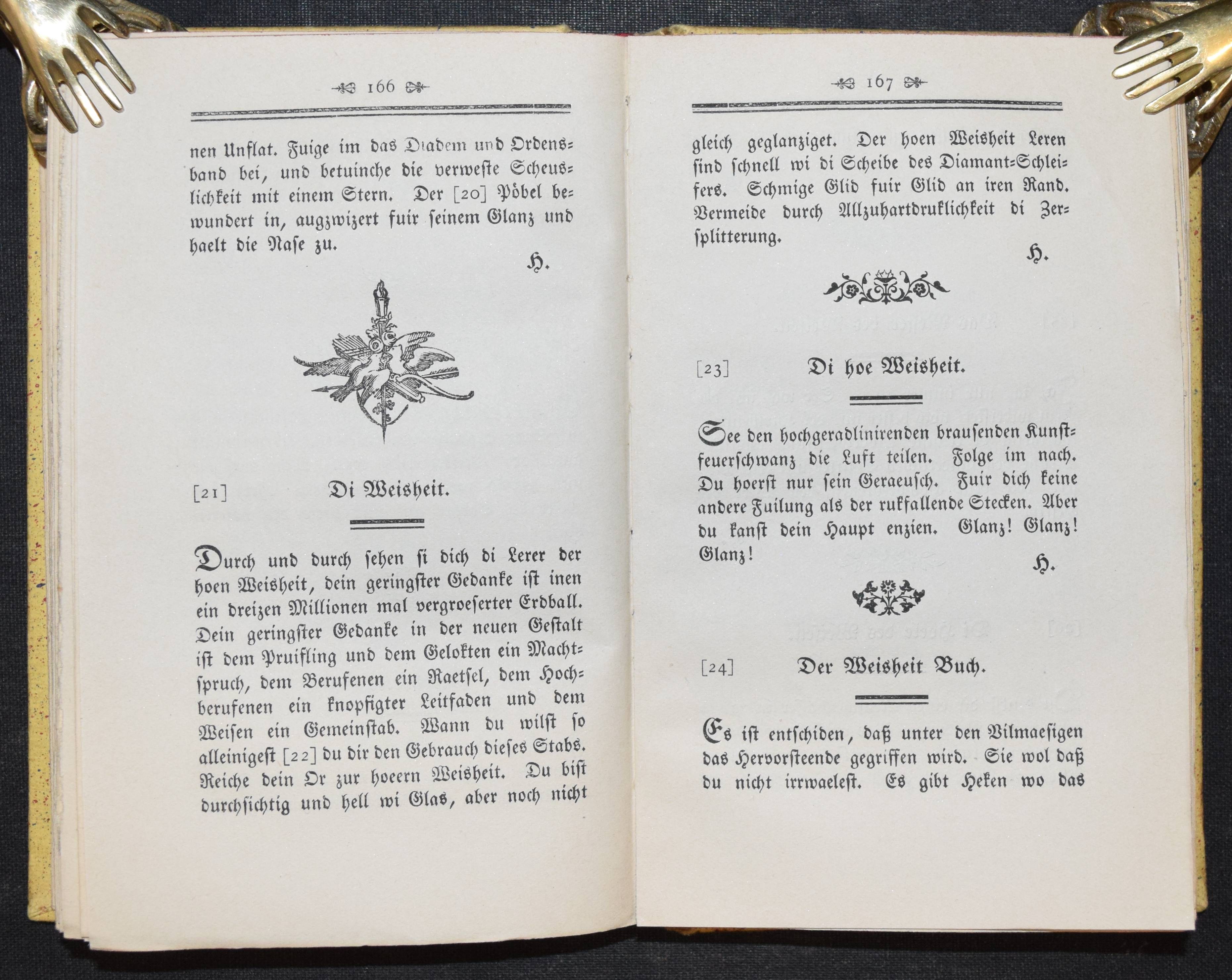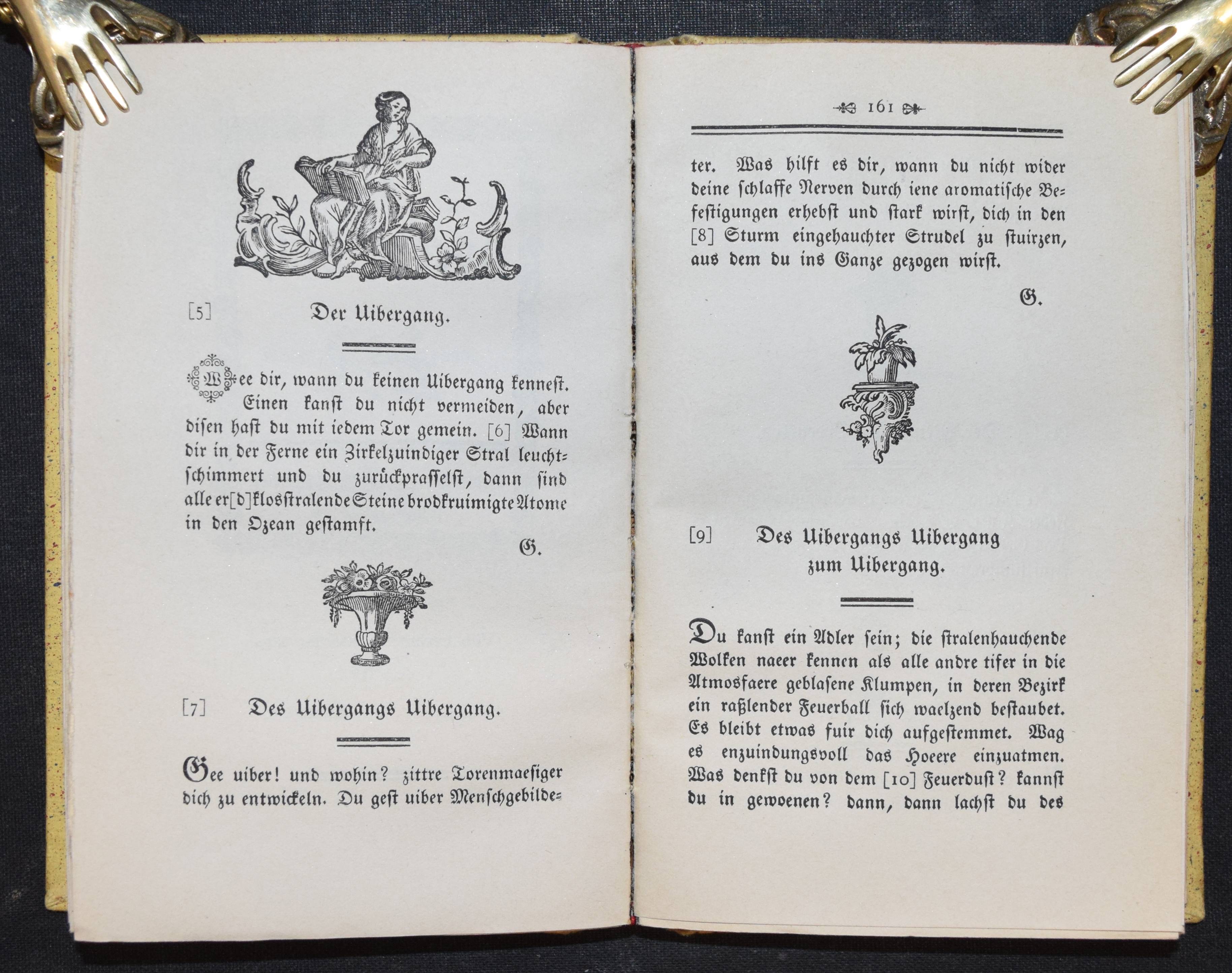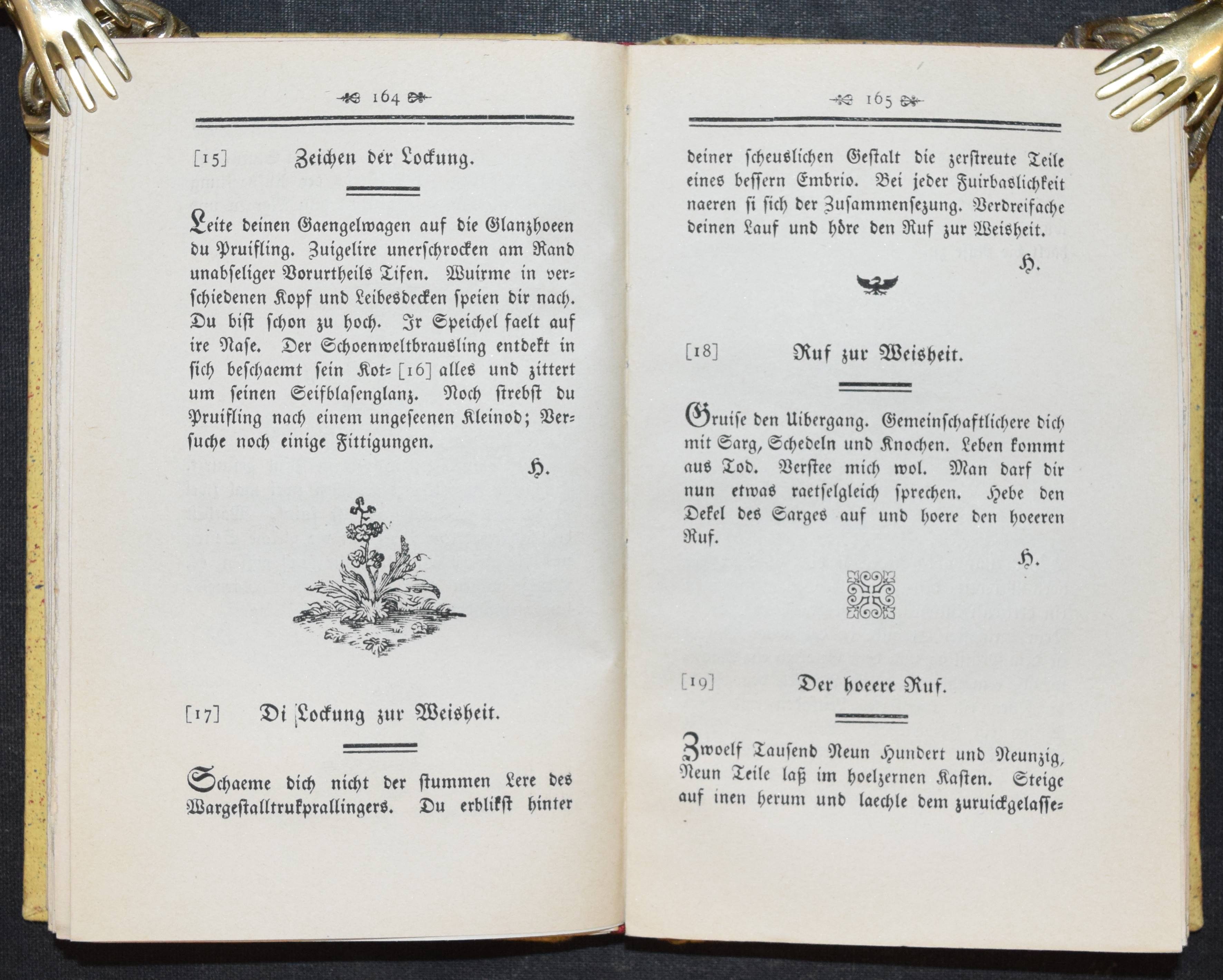 Goue, August Siegfried v. (Werke). Auswahl von Karl Schüddekopf. Einführung von Heinrich Gloël. Weimar, Gesellschaft der Bibliophilen 1917. Kl.-8°. 281 S. mit Frontispiz. OPbd. mit goldgepr. Rückenschild. (Veröffenlichung der Gesellschaft der Bibliophien, Band 27). Enthält: Masuren oder der junge Werther. Ein Trauerspiel aus dem Illyrischen; Der hoeere Ruf; Der feinere Pfif. – Der Jurist, Schriftsteller und FreimaurerAugust Siegfried v. Goué (1743- 1789), lernte nach seiner Entlassung am Reichskammergericht 1771 in Wetzlar Goethe kennen, der dort im Mai 1772 Rechtspraktikant wurde. Goué war eine treibende Kraft im theatralischen und geselligen Leben der jüngeren Juristen in Wetzlar. Er schrieb Theaterstücke u. Gelegenheitsgedichte, gab eine Wochenschrift heraus, parodierte den Hofstaat und tat sich mit Mystifikationen hervor. Dem dort gegründeten „Ritterbund“ gehörten u. a. Goethe als „Götz von Berlichingen“ und Karl Wilhelm Jerusalem als „Masuren“ an. Über dieses Treiben berichtet Goethe im 12. Buch von „Dichtung und Wahrheit“. Bekannt wurde Goué durch seine Schriften über die Freimaurerei und sein verwirrendes Spiel mit Geheimorden und ihren Riten. – Gutes Exemplar.
