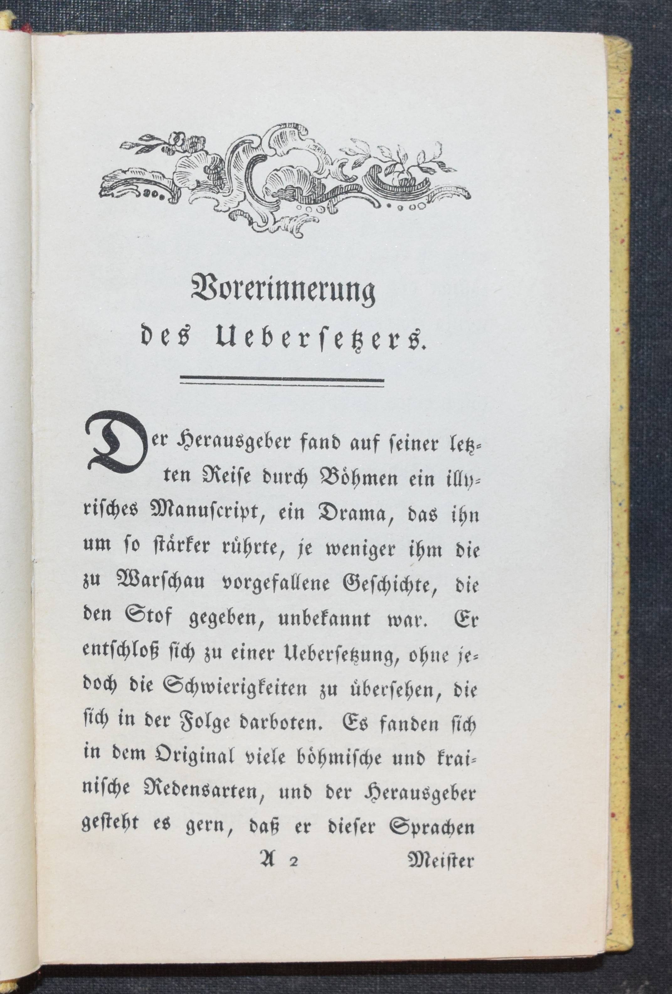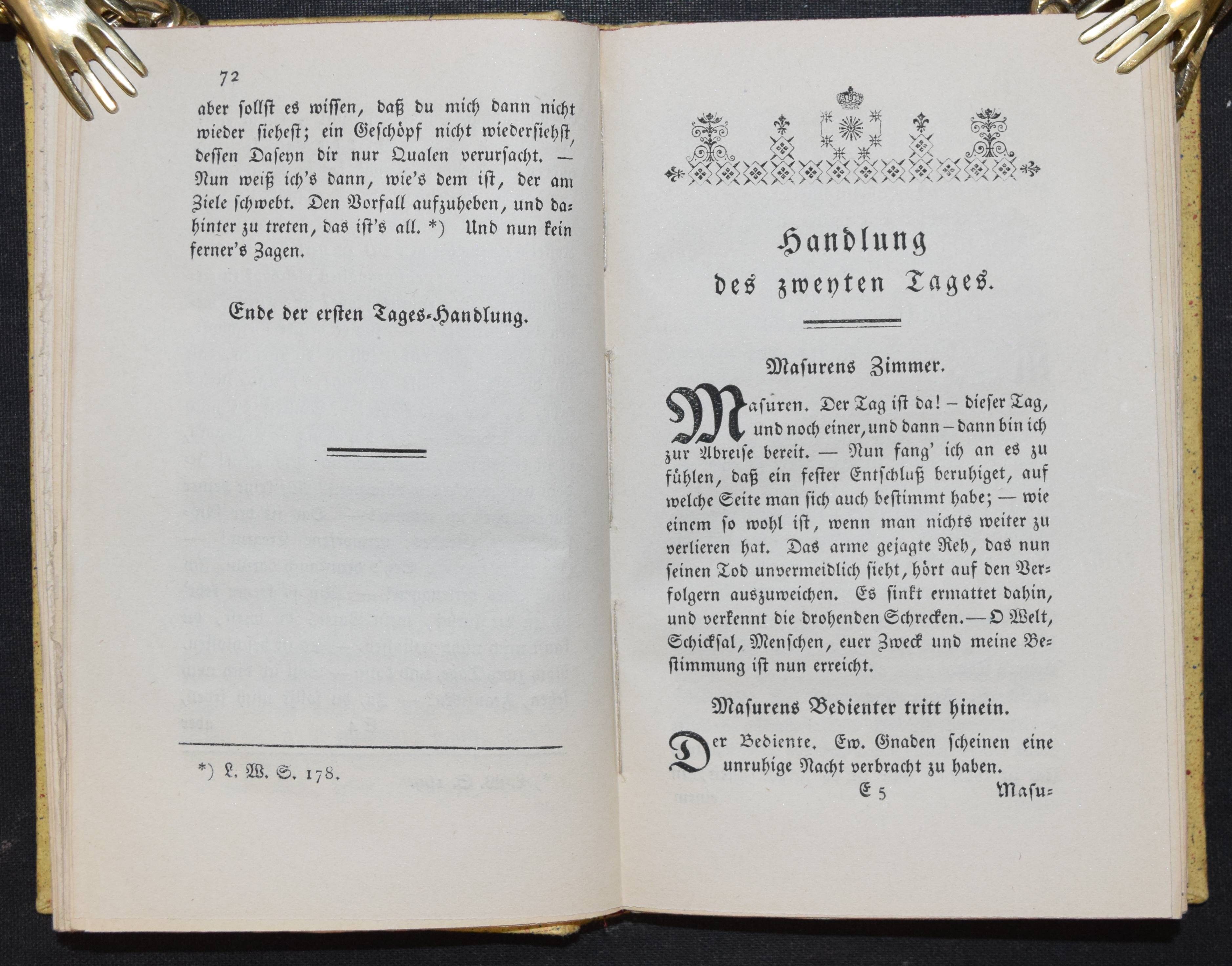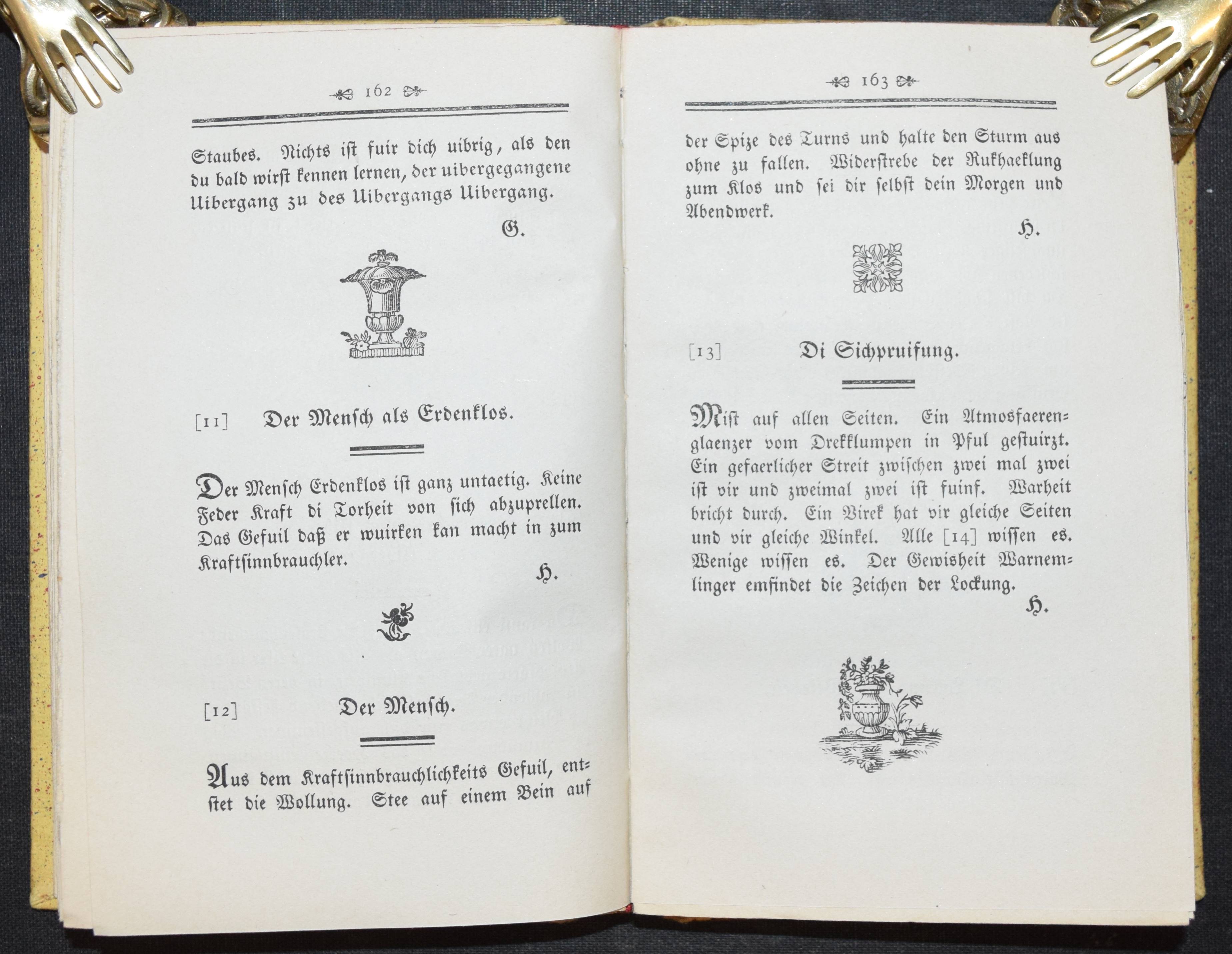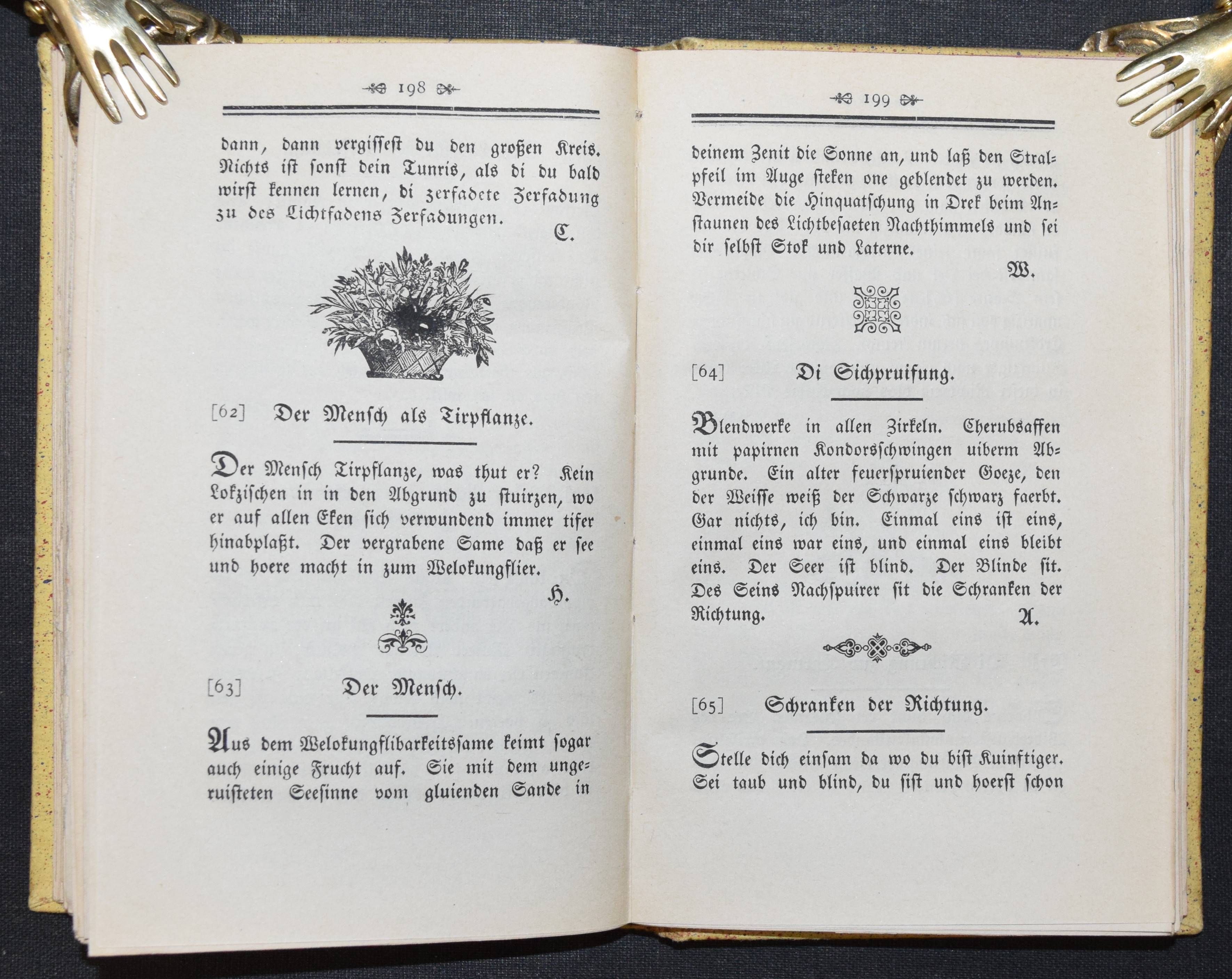 Goue, August Siegfried v. (Werke). Auswahl von Karl Schüddekopf. Einführung von Heinrich Gloël. Weimar, Gesellschaft der Bibliophilen 1917. Kl.-8°. 281 S. mit Frontispiz. OPbd. mit goldgepr. Rückenschild. (Veröffenlichung der Gesellschaft der Bibliophien, Band 27). Enthält: Masuren oder der junge Werther. Ein Trauerspiel aus dem Illyrischen; Der hoeere Ruf; Der feinere Pfif. – Der Jurist, Schriftsteller und FreimaurerAugust Siegfried v. Goué (1743- 1789), lernte nach seiner Entlassung am Reichskammergericht 1771 in Wetzlar Goethe kennen, der dort im Mai 1772 Rechtspraktikant wurde. Goué war eine treibende Kraft im theatralischen und geselligen Leben der jüngeren Juristen in Wetzlar. Er schrieb Theaterstücke u. Gelegenheitsgedichte, gab eine Wochenschrift heraus, parodierte den Hofstaat und tat sich mit Mystifikationen hervor. Dem dort gegründeten „Ritterbund“ gehörten u. a. Goethe als „Götz von Berlichingen“ und Karl Wilhelm Jerusalem als „Masuren“ an. Über dieses Treiben berichtet Goethe im 12. Buch von „Dichtung und Wahrheit“. Bekannt wurde Goué durch seine Schriften über die Freimaurerei und sein verwirrendes Spiel mit Geheimorden und ihren Riten. – Gutes Exemplar.