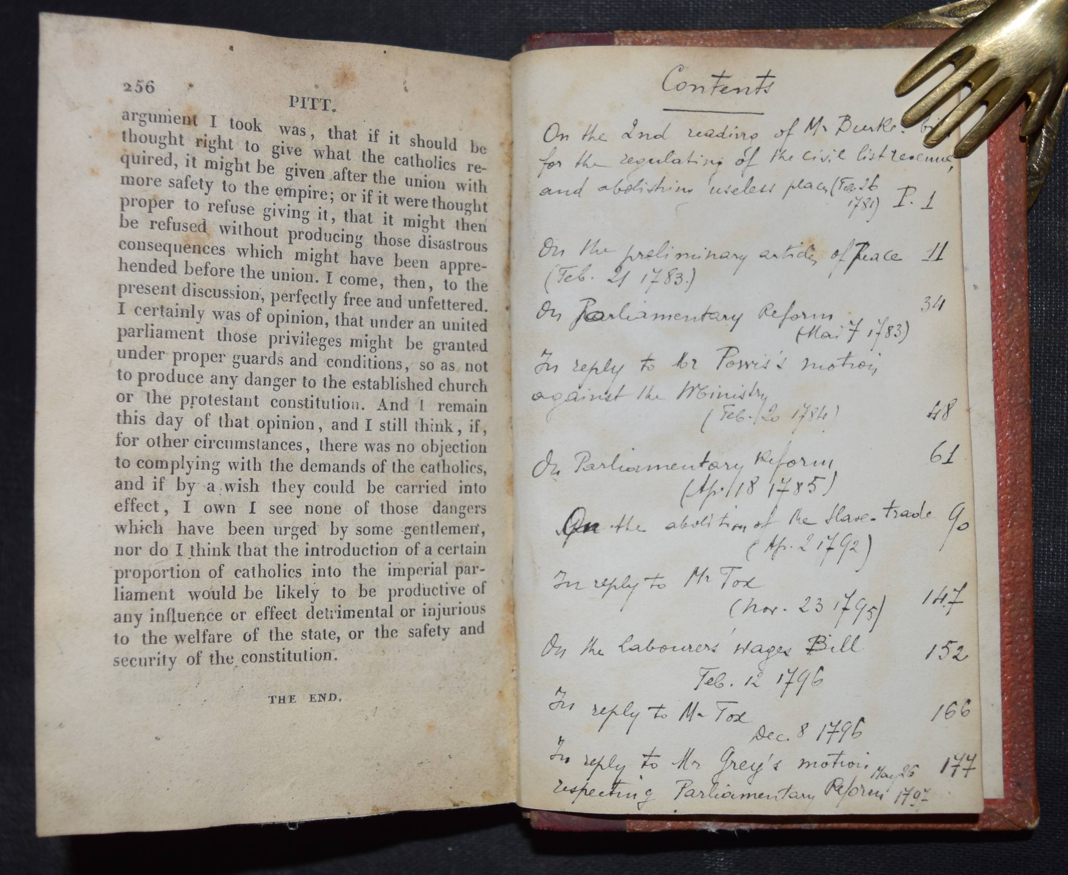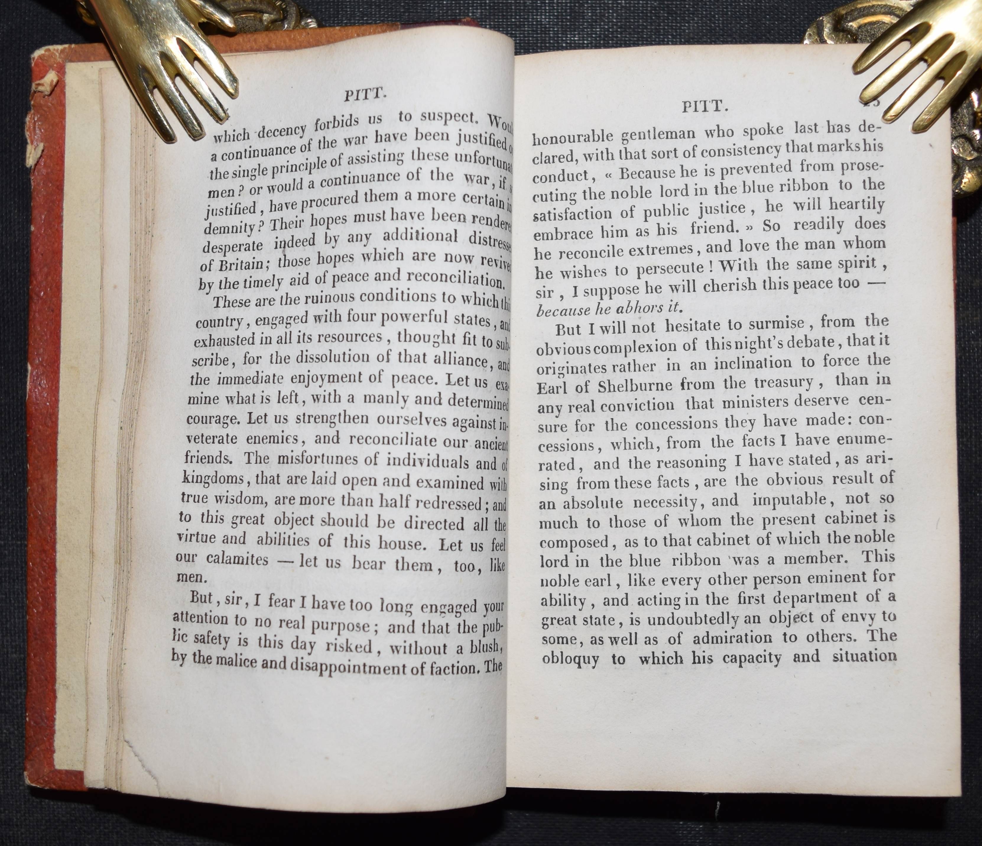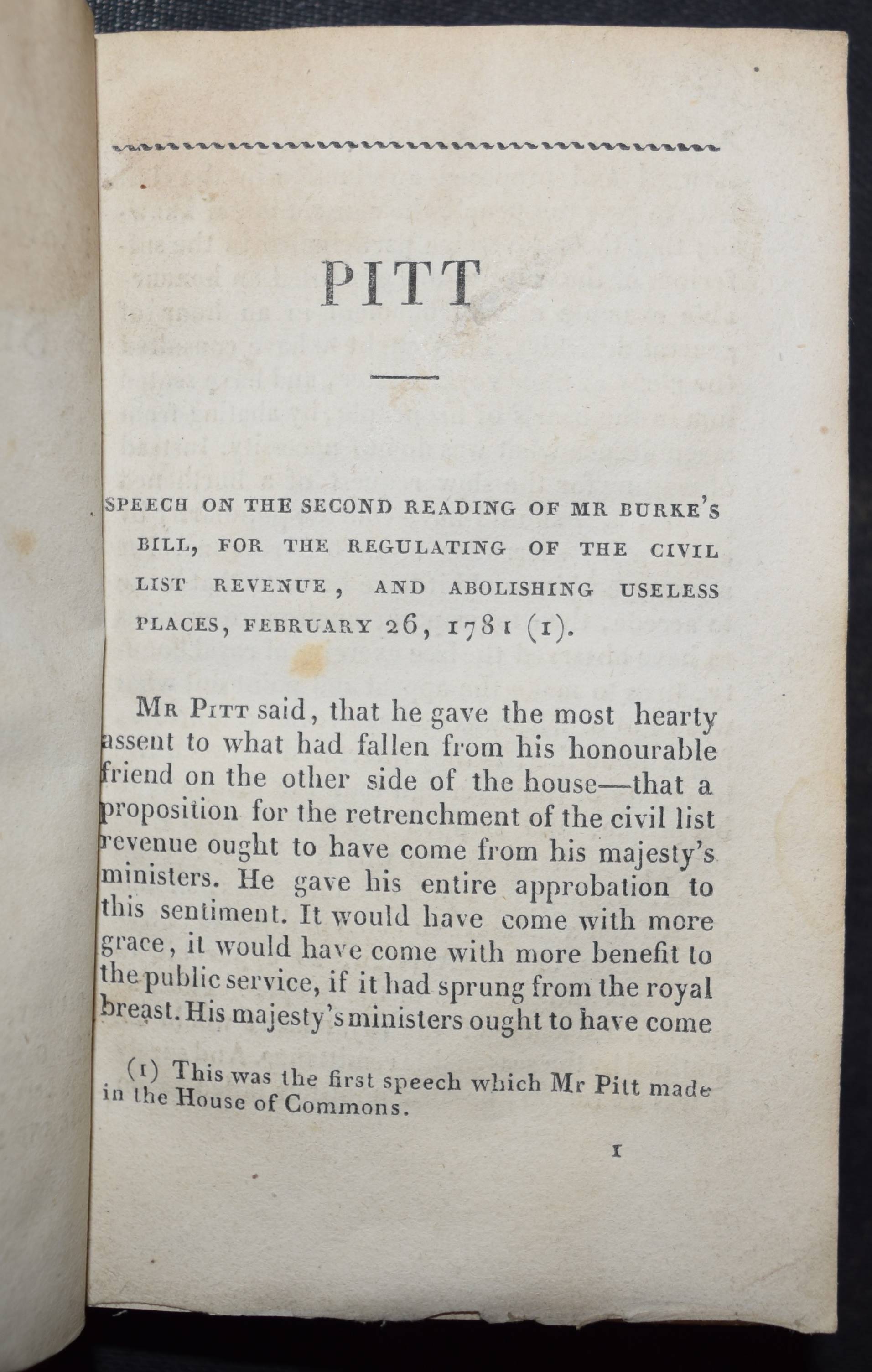 Pitt, William. Select parliamentary speeches. Paris, Baudry, Bobée & Hingray 1829. 12º. 256 p. Hldr. d. Zt. mit goldgepr. Rückentitel. Einband etwas berieben, vorderer freier Vorsatz u. das Porträt fehlen, vereinzelt leicht braunfleckig.
