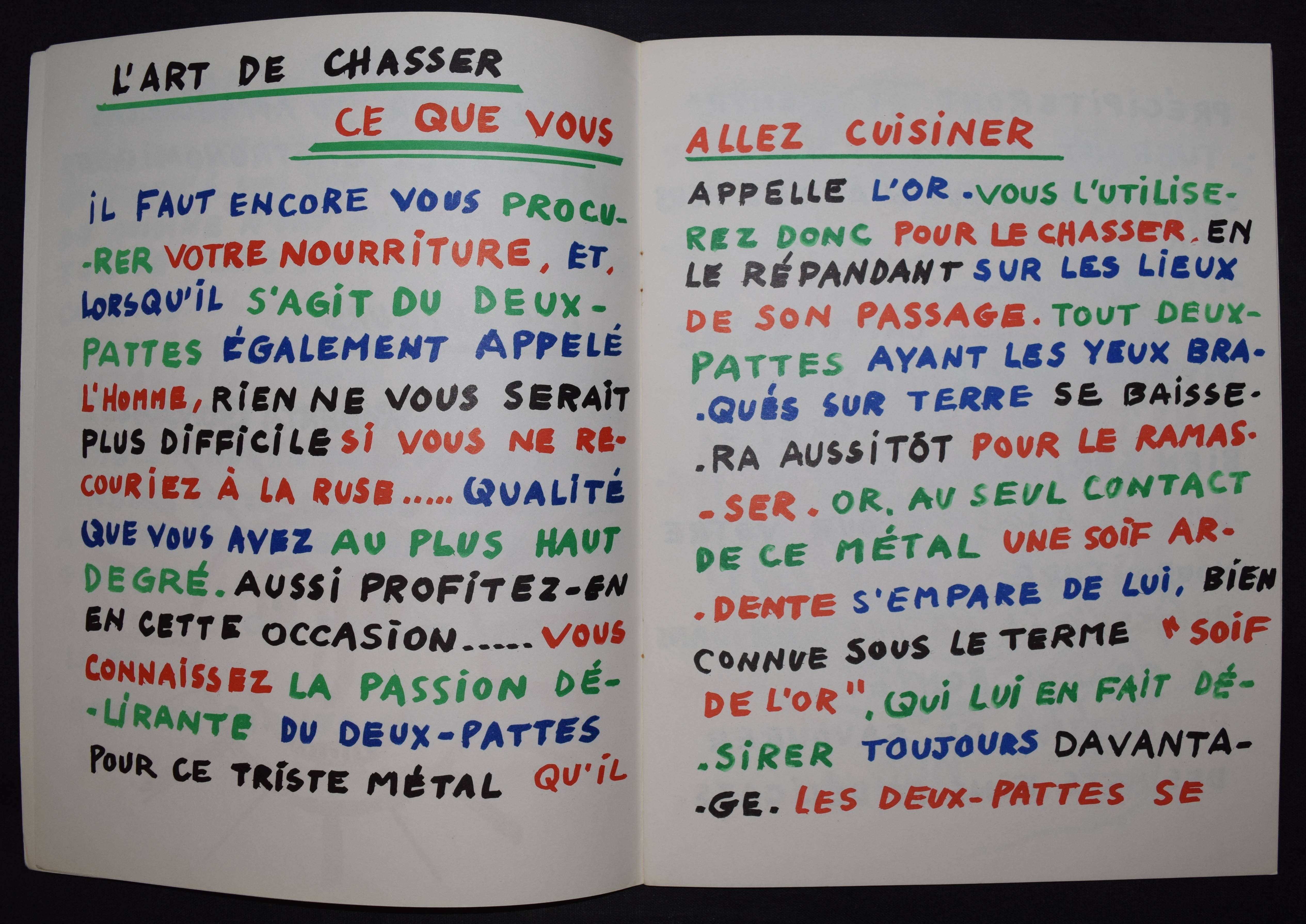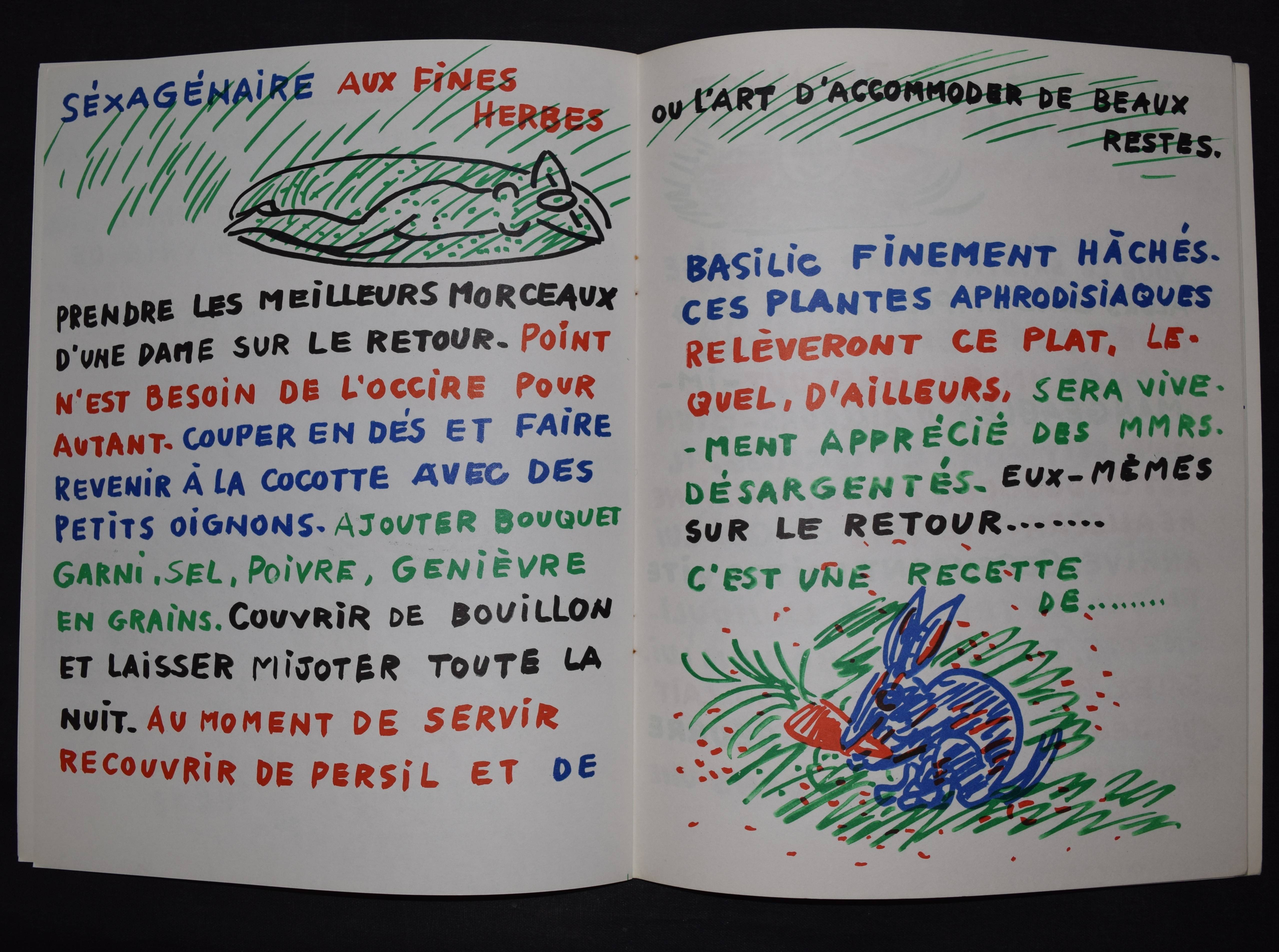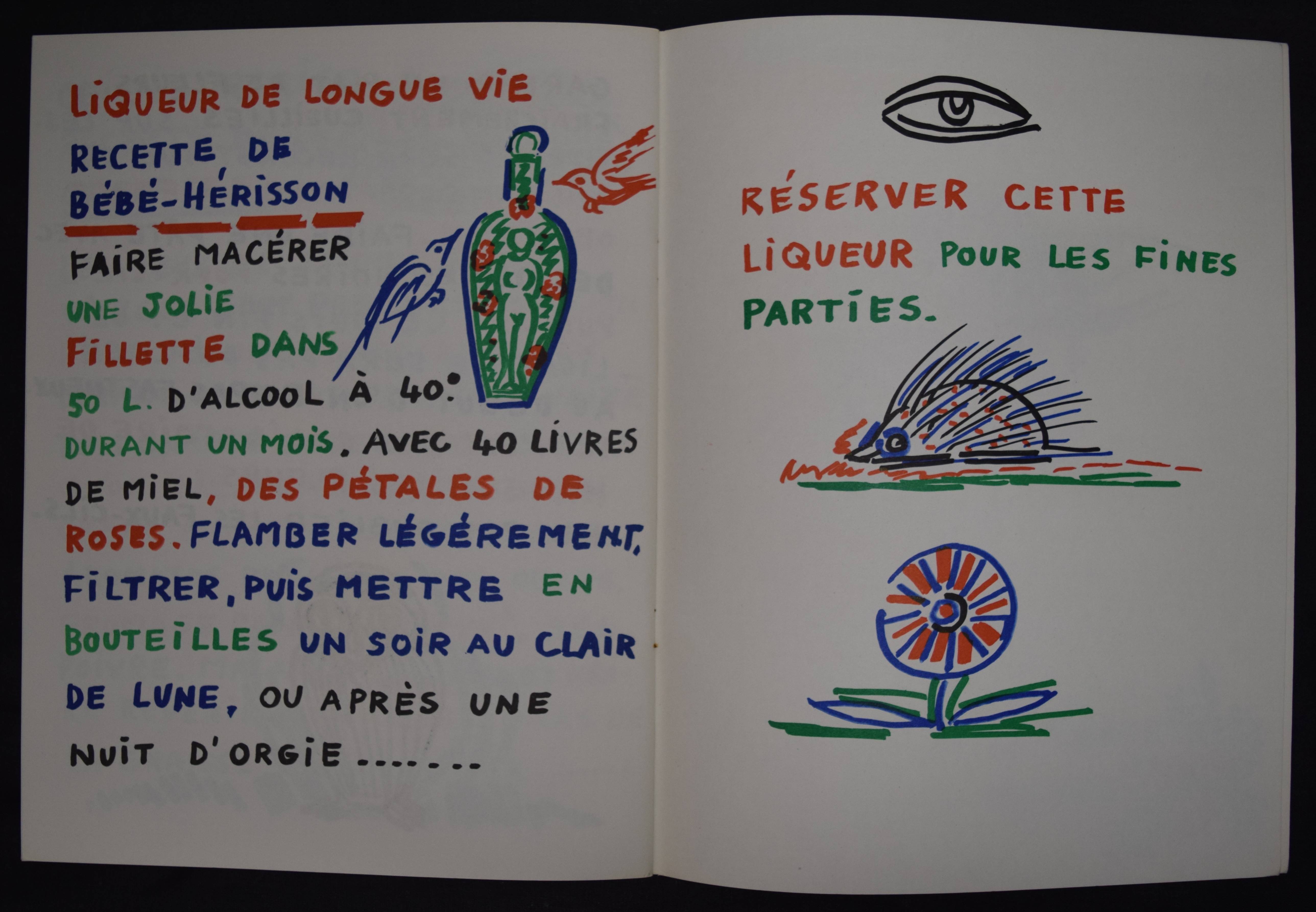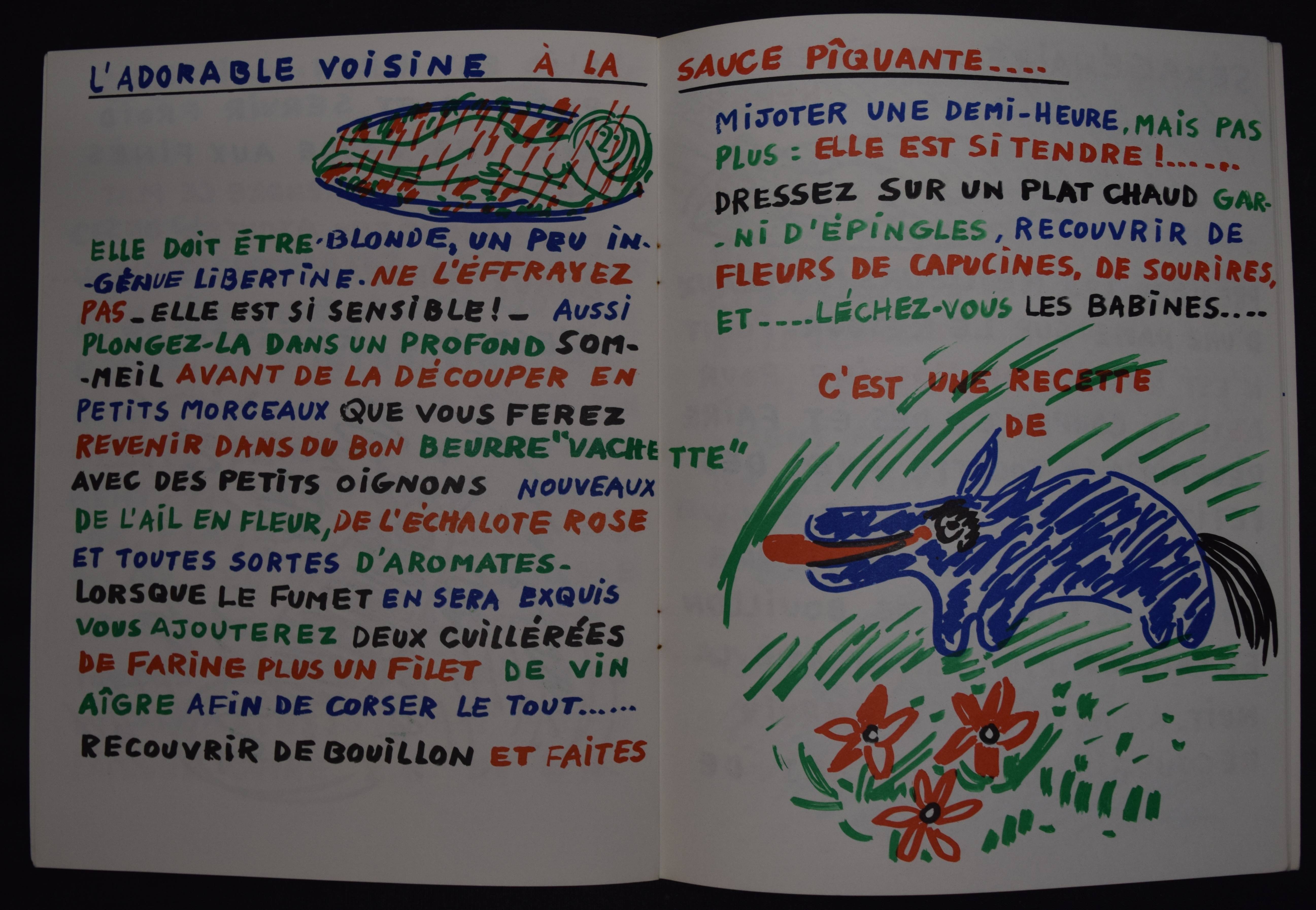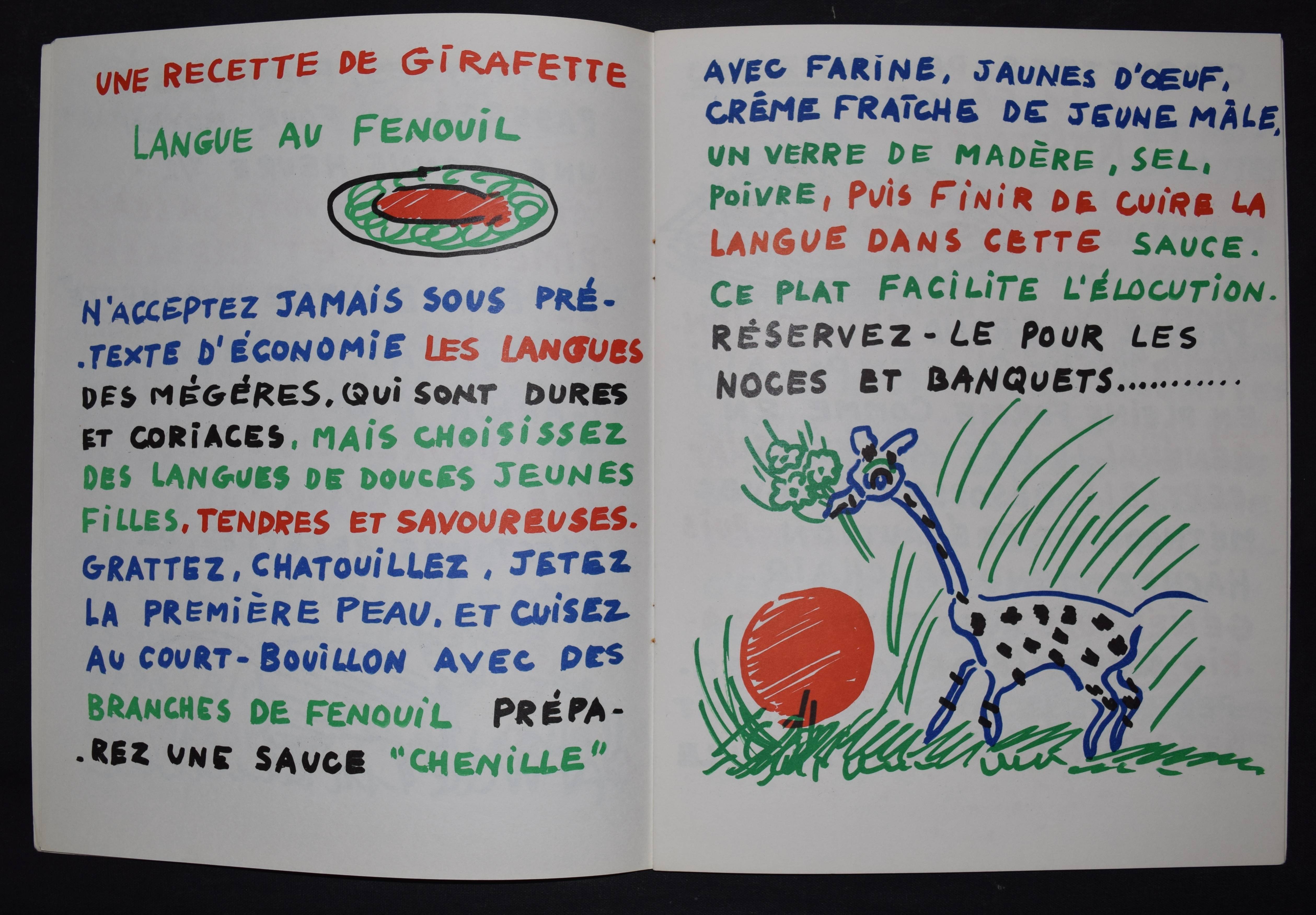 Gonzalez, Roberta. Quelques fameuses recettes de cuisine internationale. L’ Hay-les Les éditions la Chouette s. d. (1965). 4°. [16] Bl. (inkl. Umschlag) mit farblithogr. Illustrationen und handschr. Text in Farblithographie. Farbig illustr. OKart. In kleiner Auflage erschienenes Künstlerbuch. – Die spanisch-französische Künstlerin Roberta Gonzalez (1909-1976), eine Tochter des bedeutenden spanischen Bildhauers Julio Gonzalez, war mit Hans Hartung verheiratet. Sie arbeitete nach dem Krieg u.a. mit A. Calder in Paris zusammen. – Umschlag im Rand leicht angestaubt, sonst gut erhalten.
